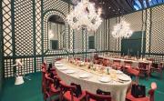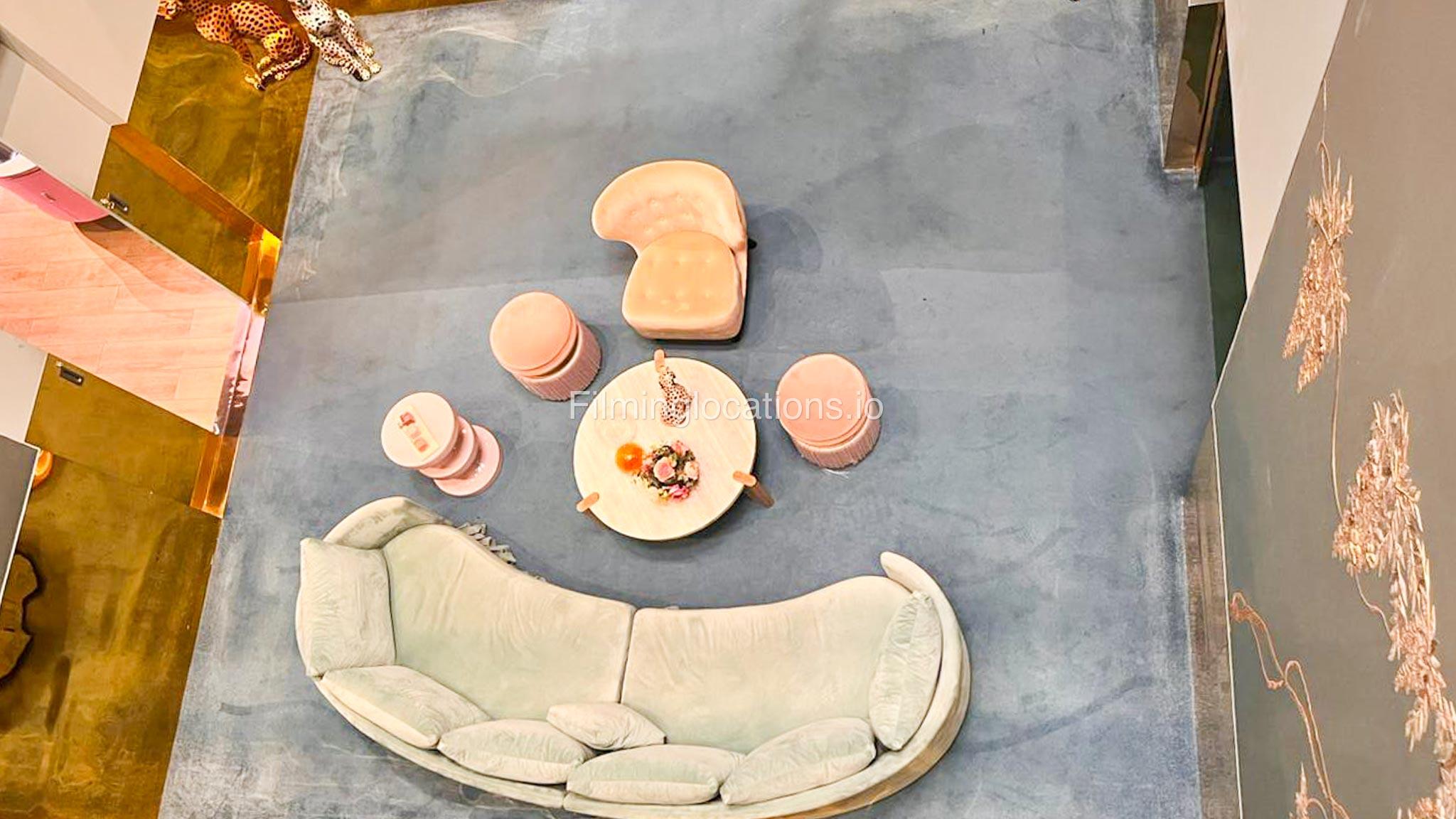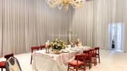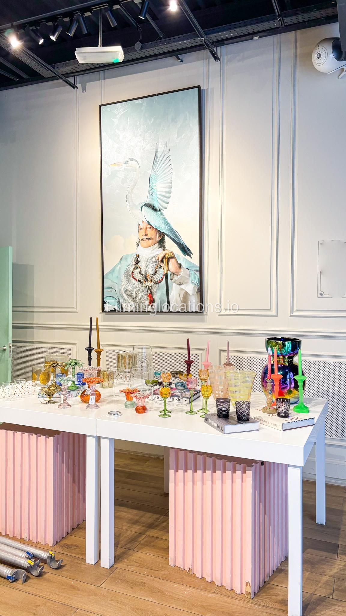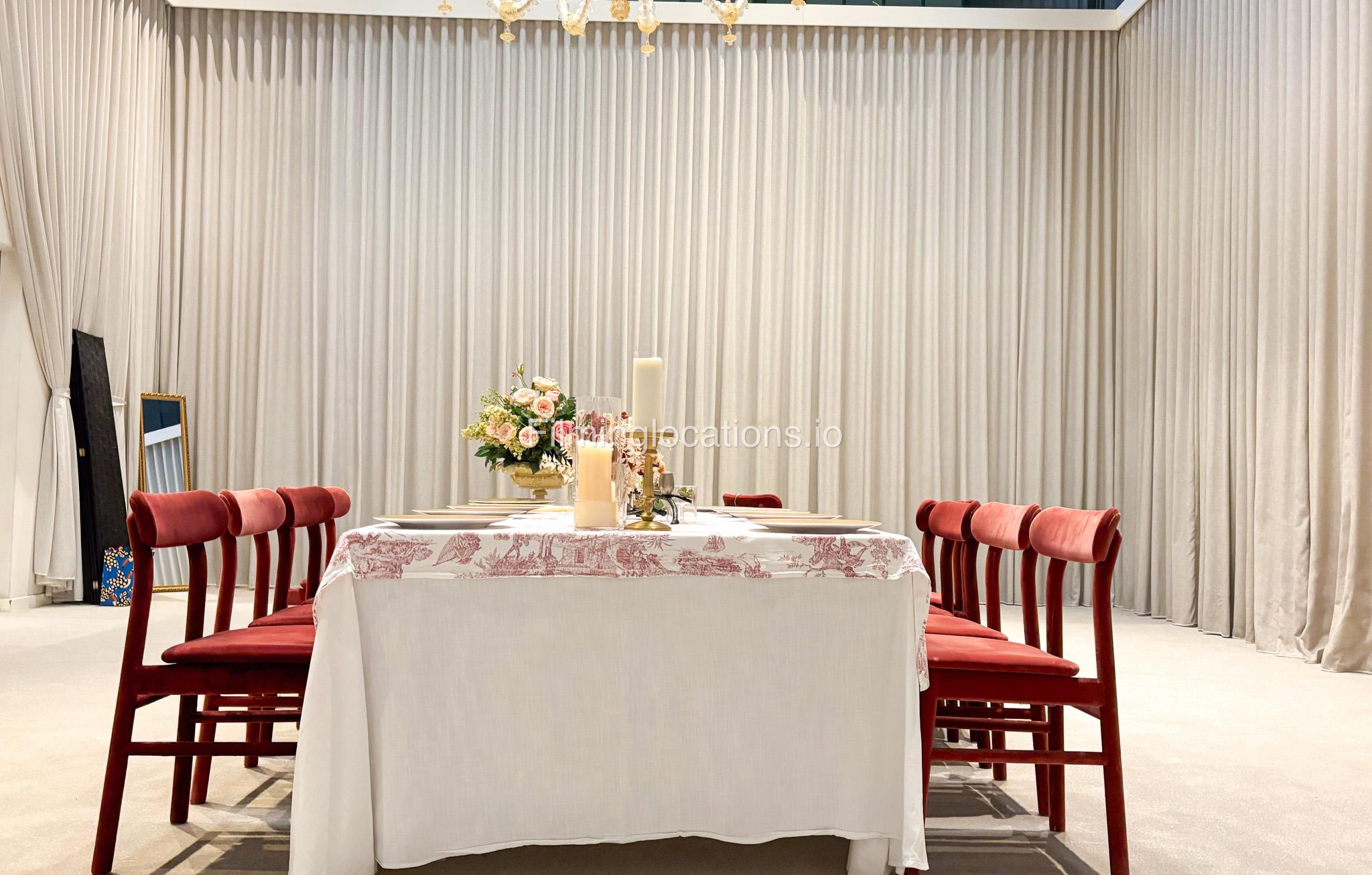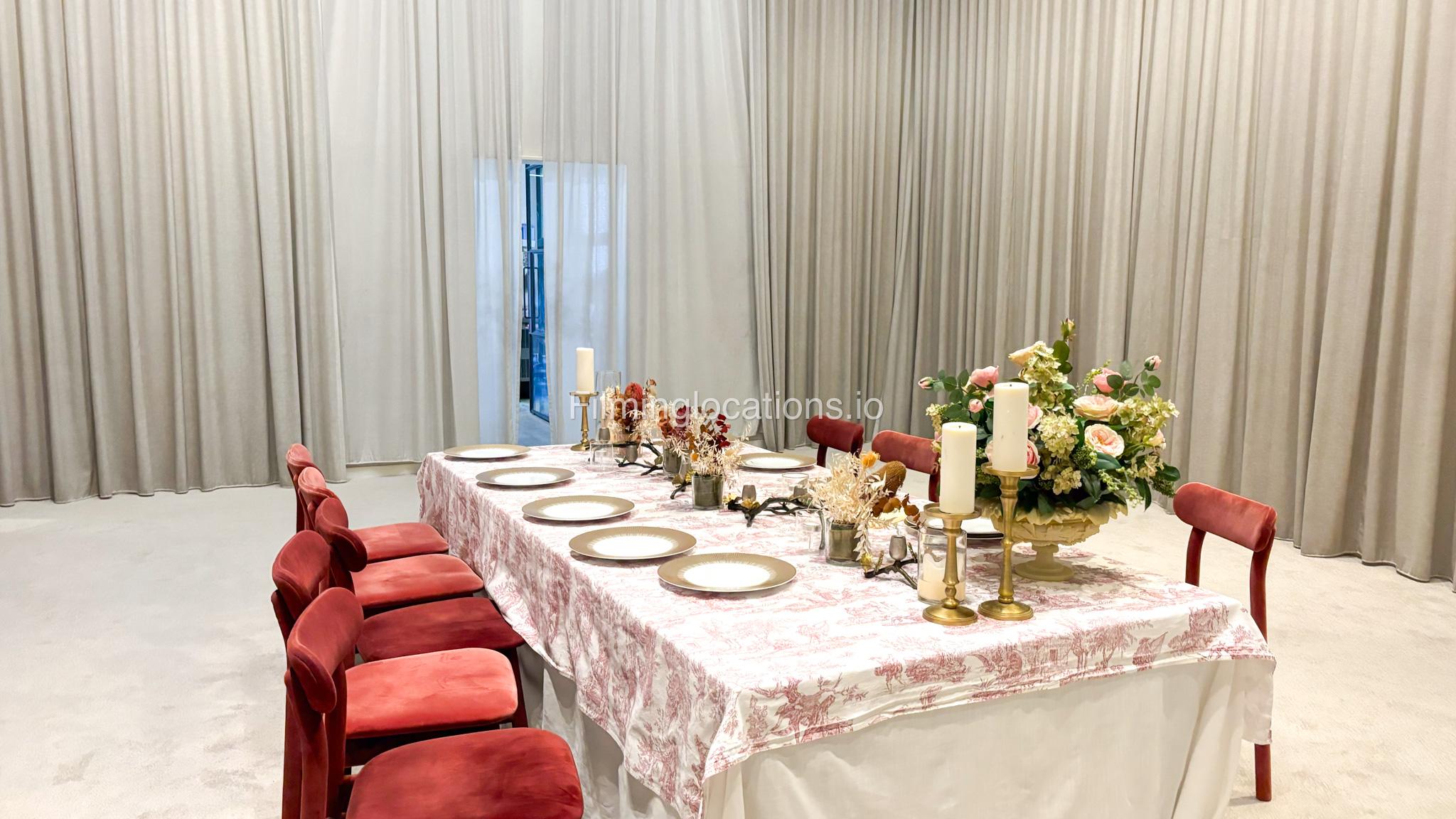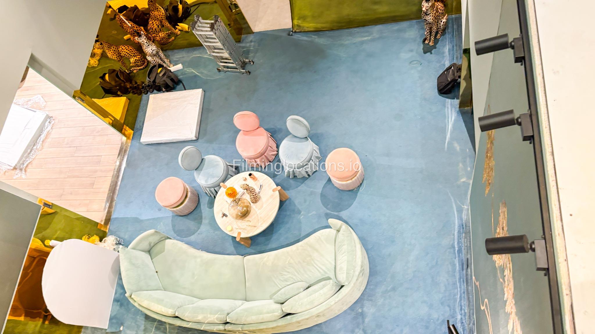 Our space offers a vibrant and artistic setting ideal for creative productions. As you enter, you're welcomed by a cozy seating area and an in-house café, setting a warm and inviting tone. The venue features 3 distinct event rooms, each with its own unique character. One space showcases soft pastel interiors. Another room is designed with classic green walls, a striking mirror, vibrant red chair seating, and ornate chandeliers—offering a bold and dramatic backdrop. The third is a spacious room with grand, elegant seating, perfect for larger setups or more formal scenes.