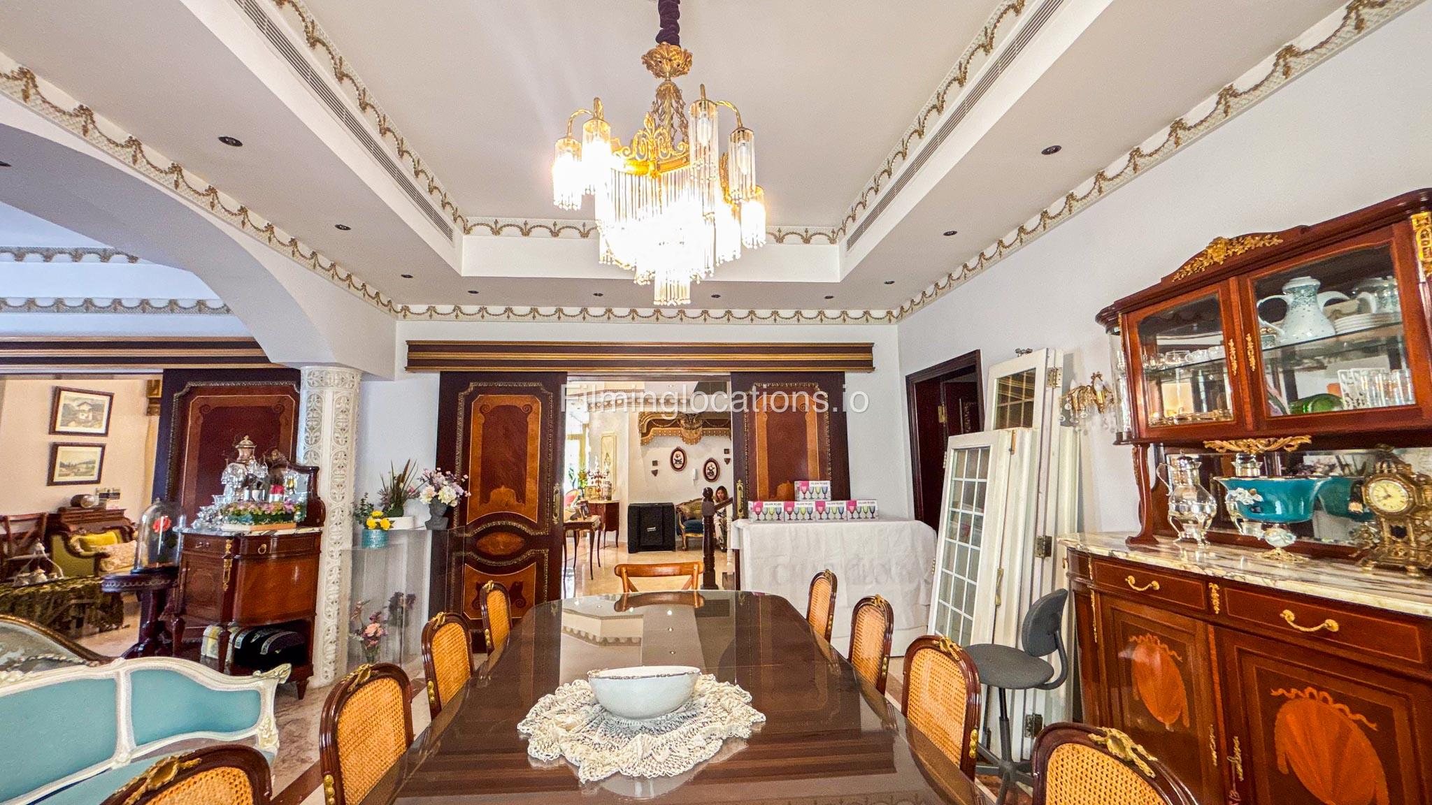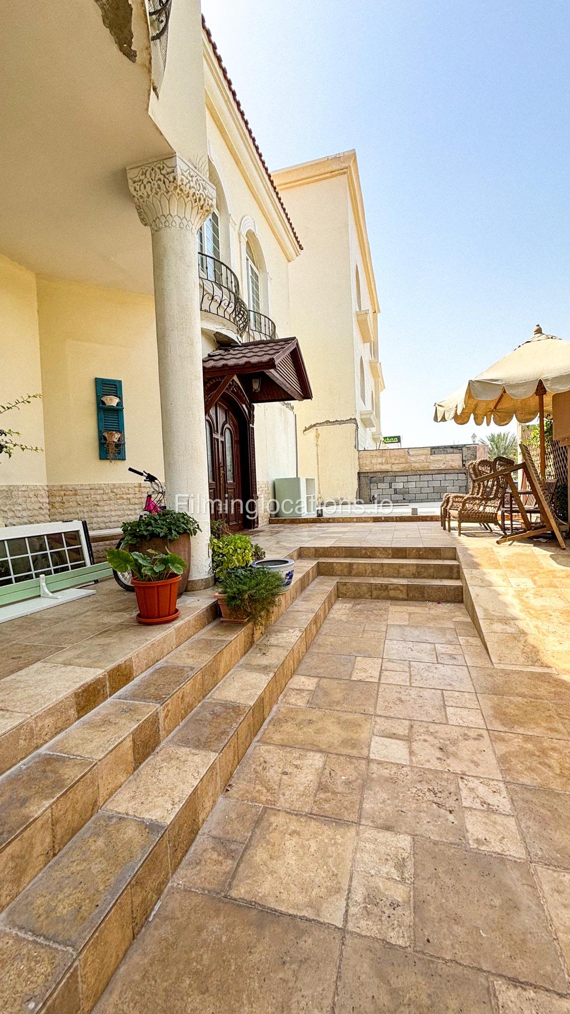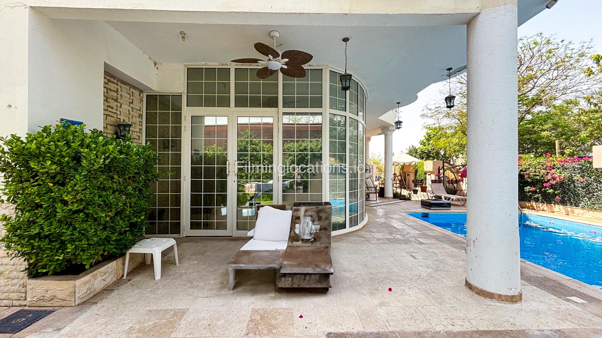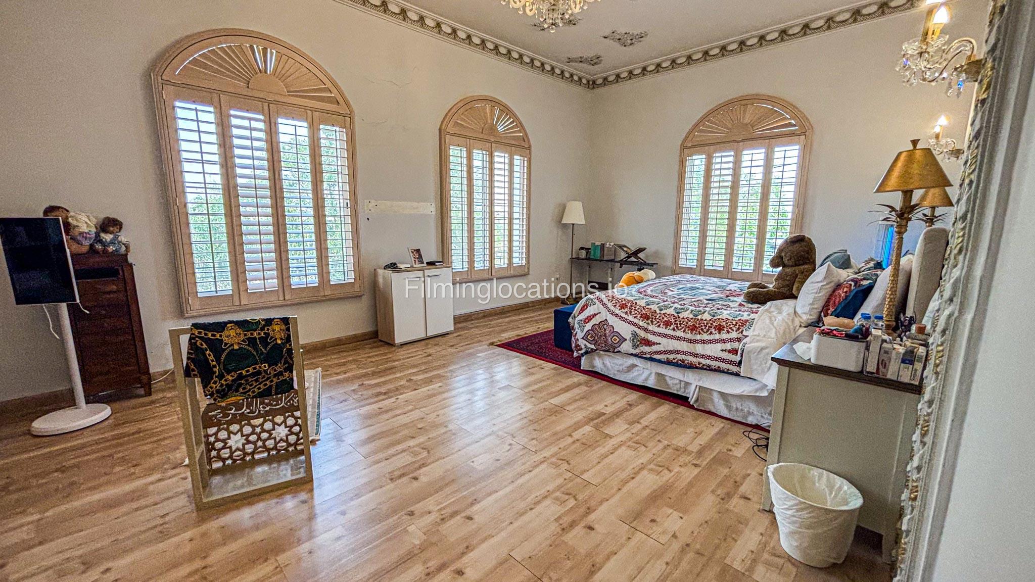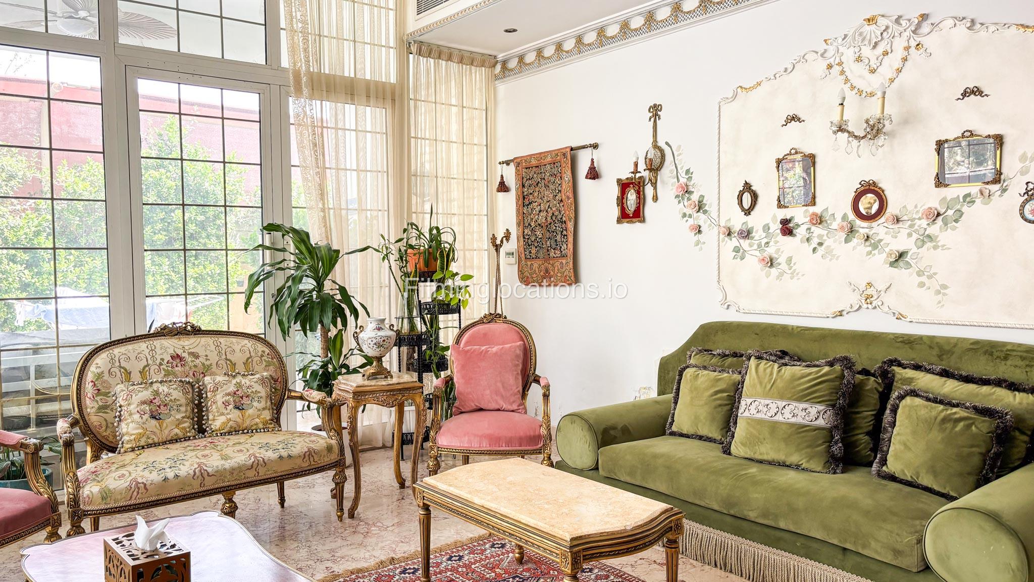 Our 3-bedroom Arabian villa offers a rich blend of traditional charm and versatile filming potential. It features 2 living rooms—the main one located on the ground floor, designed with panoramic window walls, Arabian-style chandeliers, and classic themed seating, all surrounded by carefully curated antique décor. A sliding wooden door connects this space to a dining room styled with matching chandeliers, rich curtains, and antique accents. The spacious kitchen includes a central kitchen island and opens to the garden through elegant glass doors, offering a bright backdrop. A spiral staircase leads to the 2nd living room upstairs, featuring slightly modern sofa seating facing a TV, large windows, a small dining area, and chandeliers that maintain the villa’s authentic touch. Continuing upstairs, the 3 bedrooms include a master bedroom with an attached bathroom, glass-door balcony, full-length mirror, and a small dressing area; a 2nd bedroom with windows and a dedicated dressing space; and a 3rd bedroom with minimal furnishings and a large window. The exterior offers a swimming pool with a cozy seating area, a garden with a children’s play zone, and a private garage—making this villa a well-rounded, atmospheric location ideal for a wide range of productions.