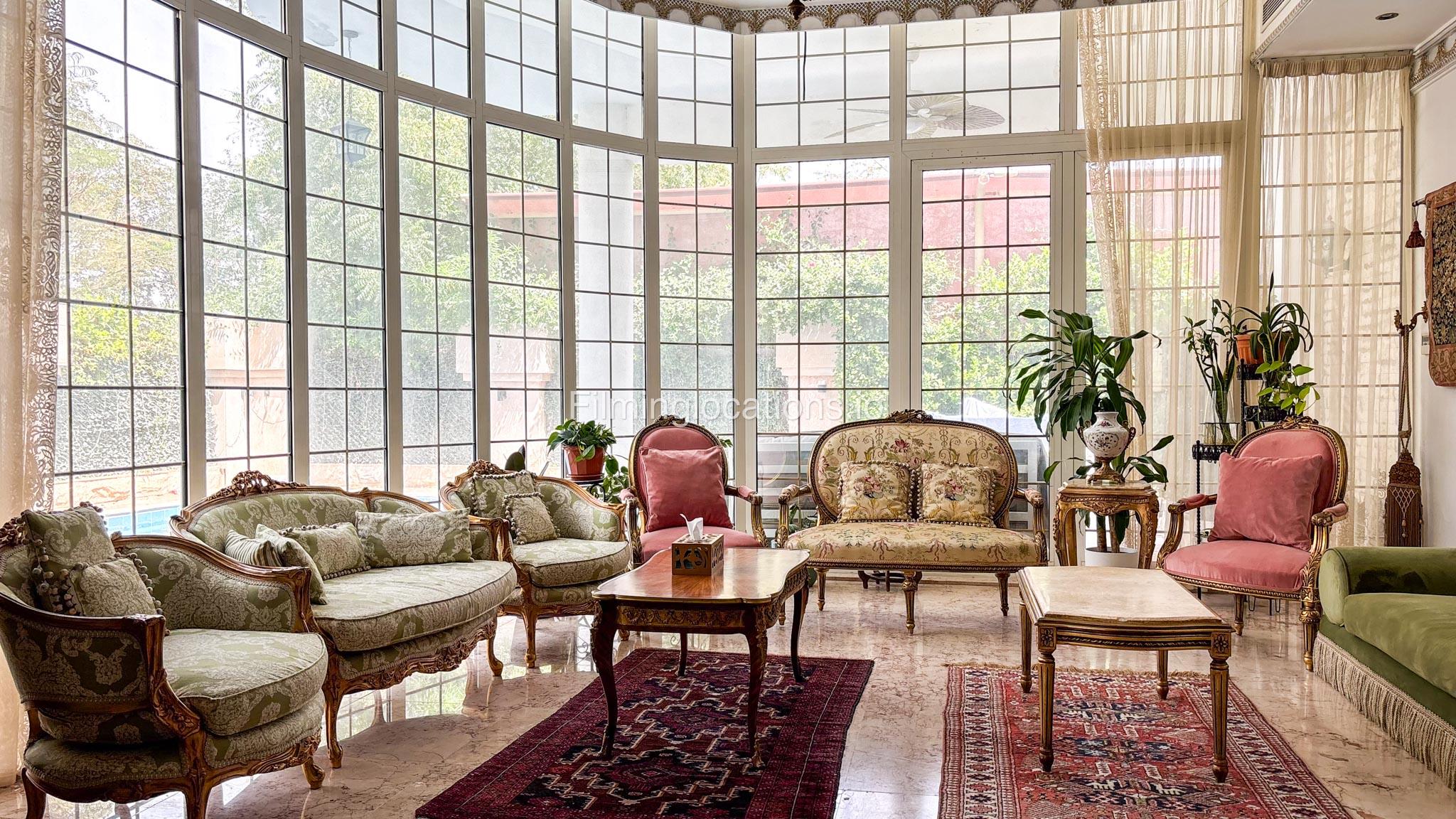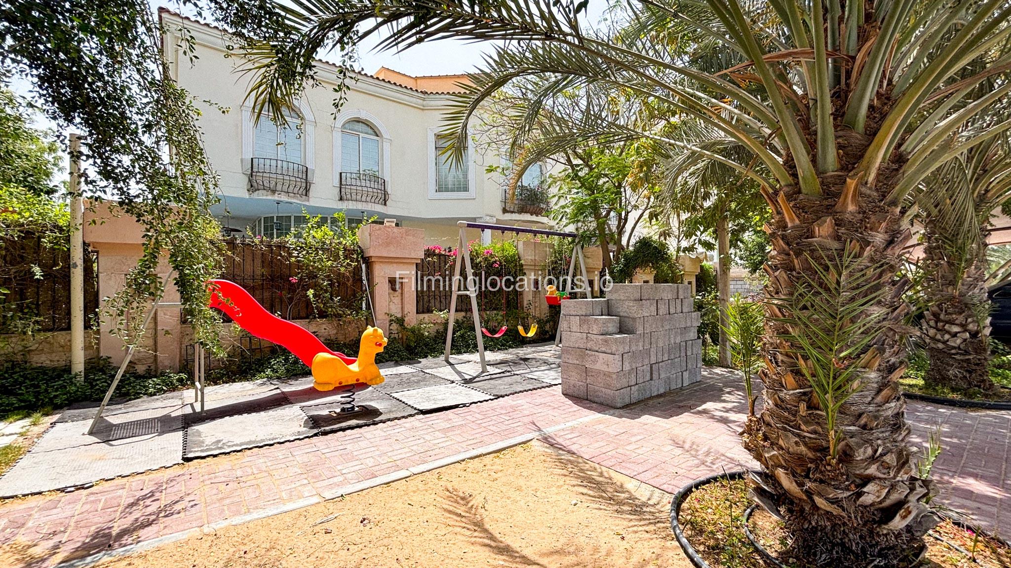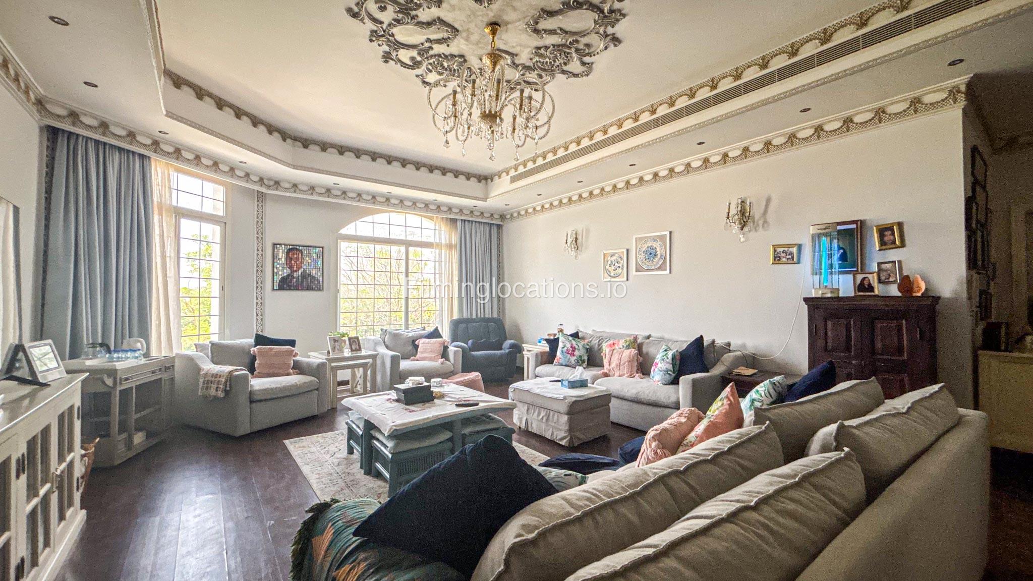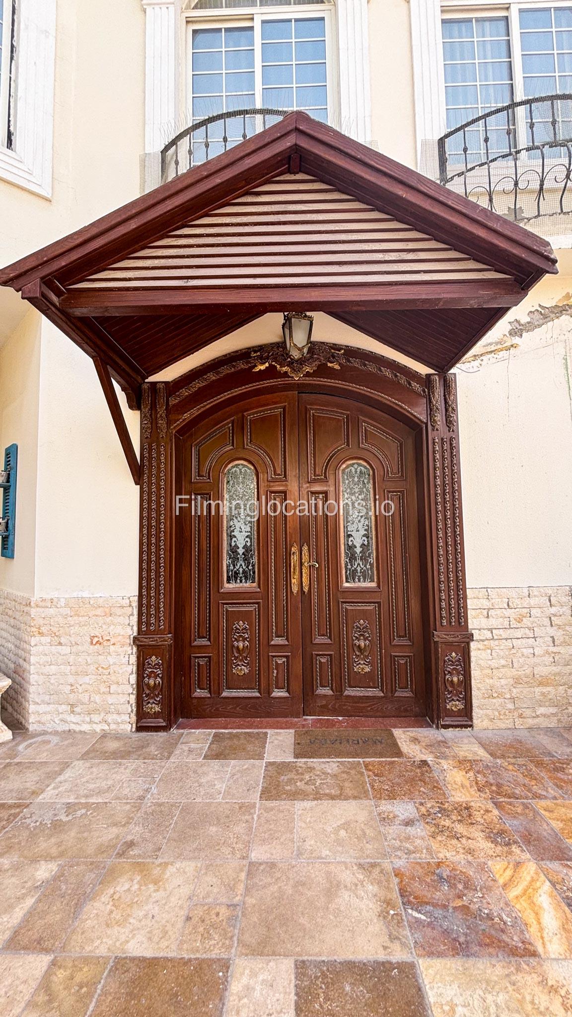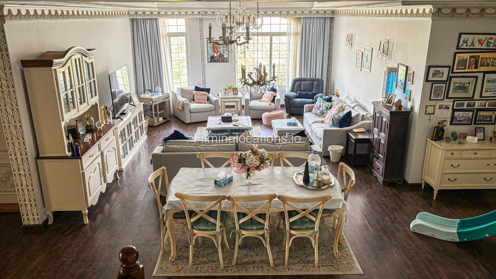 Our 3-bedroom Arabian villa offers a rich blend of traditional charm and versatile filming potential. It features 2 living rooms—the main one located on the ground floor, designed with panoramic window walls, Arabian-style chandeliers, and classic themed seating, all surrounded by carefully curated antique décor. A sliding wooden door connects this space to a dining room styled with matching chandeliers, rich curtains, and antique accents. The spacious kitchen includes a central kitchen island and opens to the garden through elegant glass doors, offering a bright backdrop. A spiral staircase leads to the 2nd living room upstairs, featuring slightly modern sofa seating facing a TV, large windows, a small dining area, and chandeliers that maintain the villa’s authentic touch. Continuing upstairs, the 3 bedrooms include a master bedroom with an attached bathroom, glass-door balcony, full-length mirror, and a small dressing area; a 2nd bedroom with windows and a dedicated dressing space; and a 3rd bedroom with minimal furnishings and a large window. The exterior offers a swimming pool with a cozy seating area, a garden with a children’s play zone, and a private garage—making this villa a well-rounded, atmospheric location ideal for a wide range of productions.