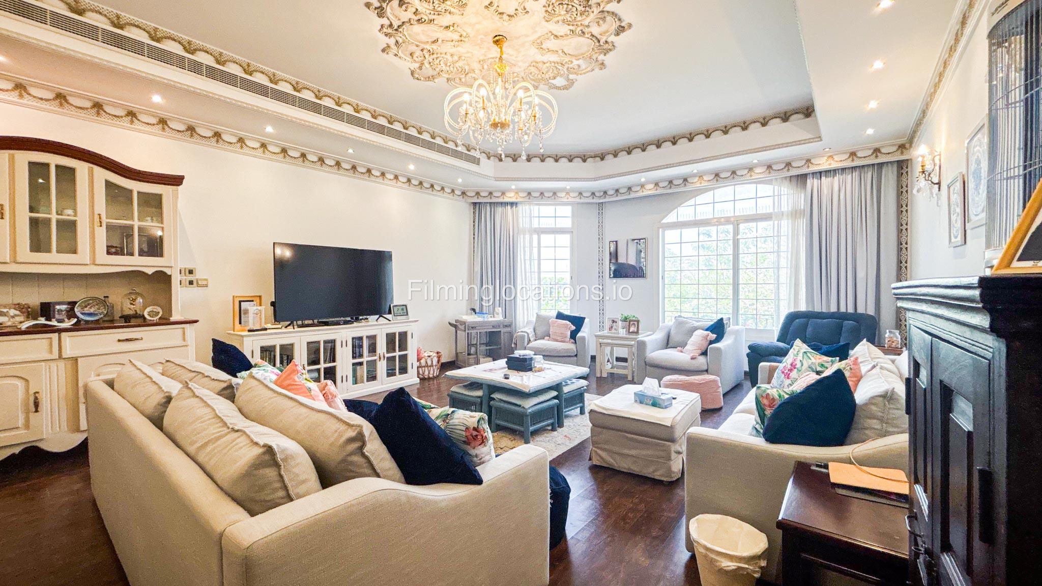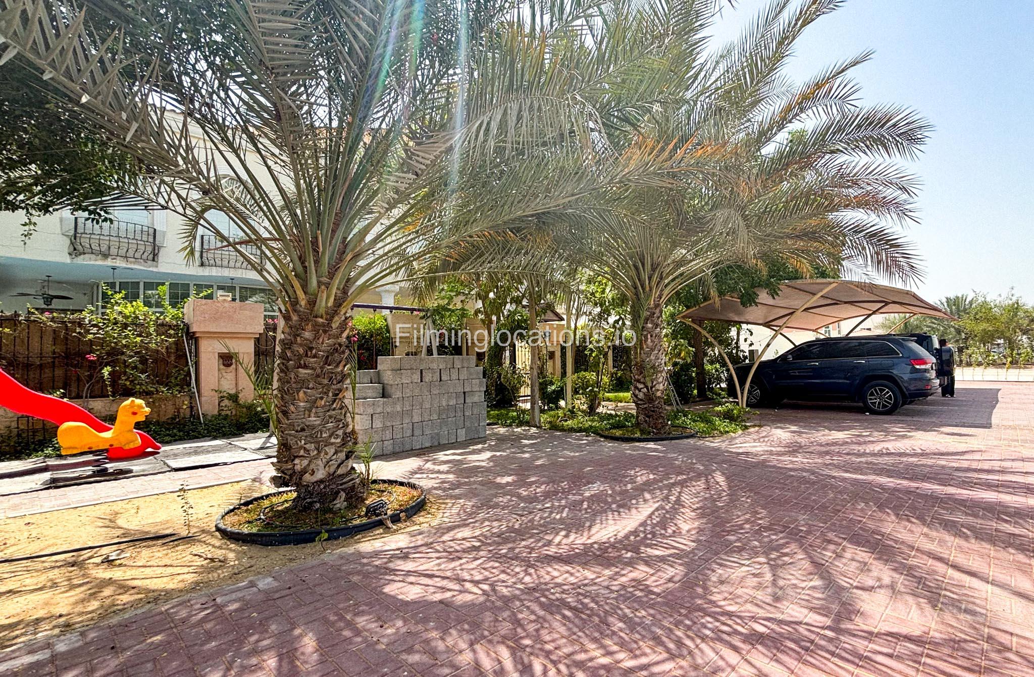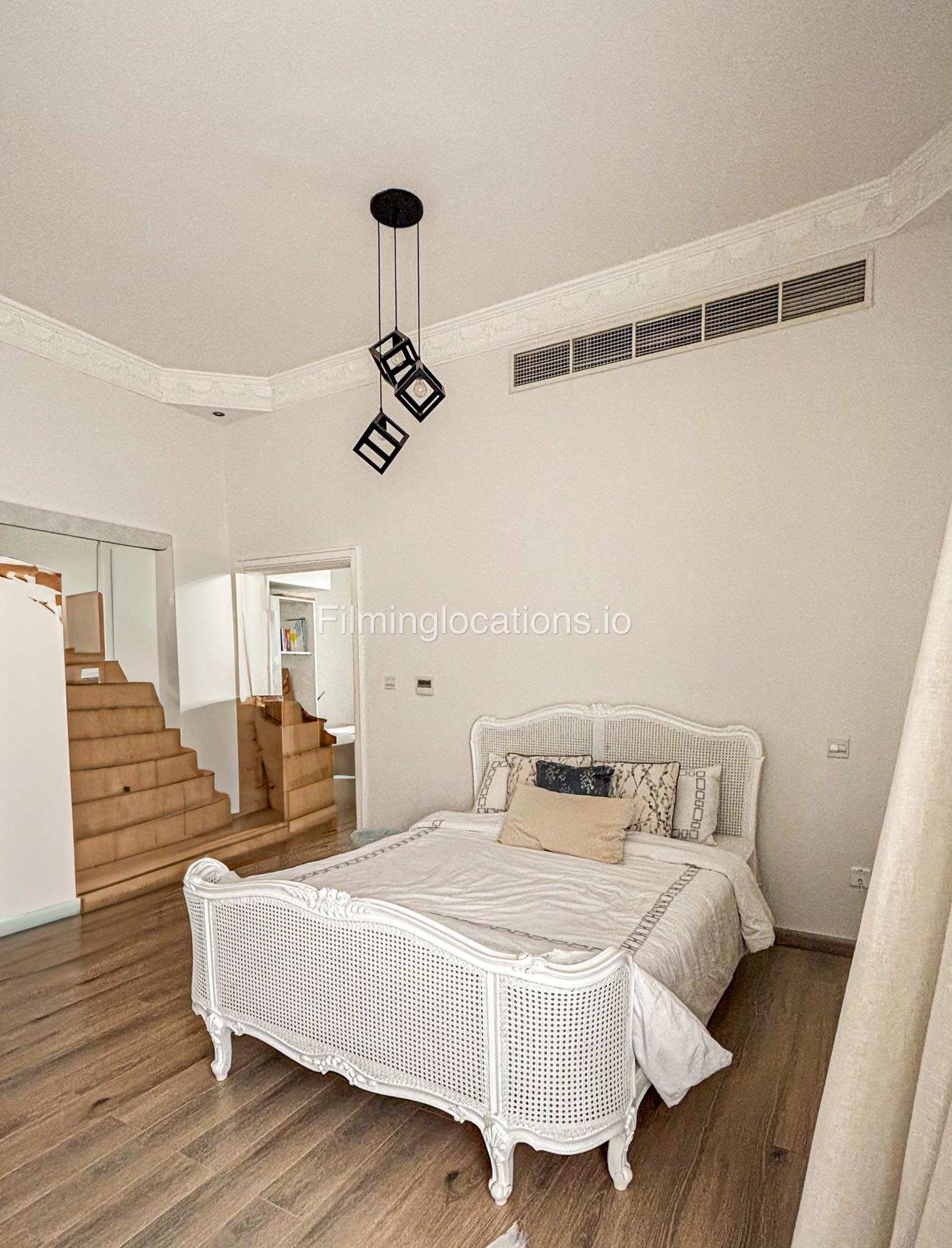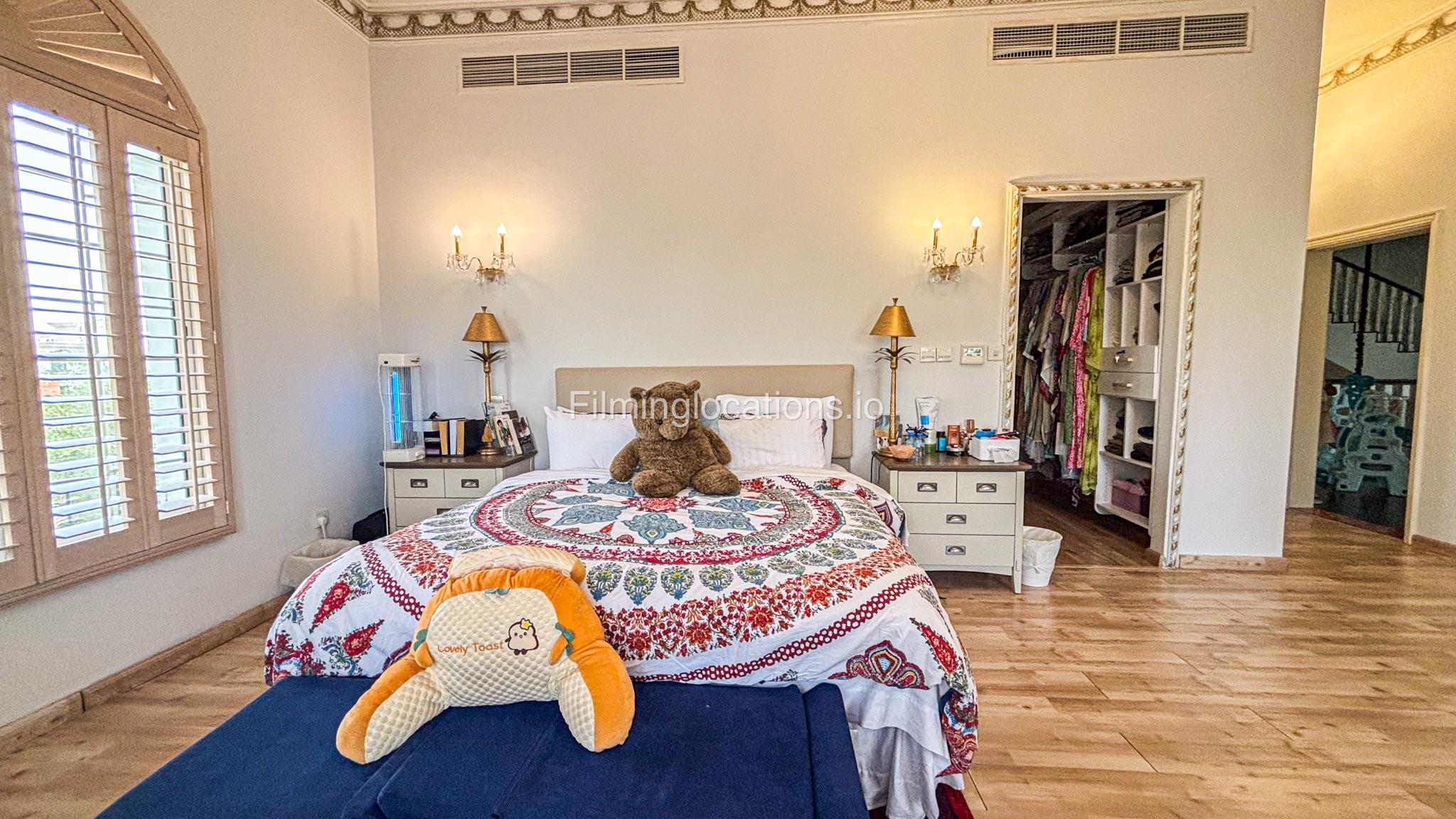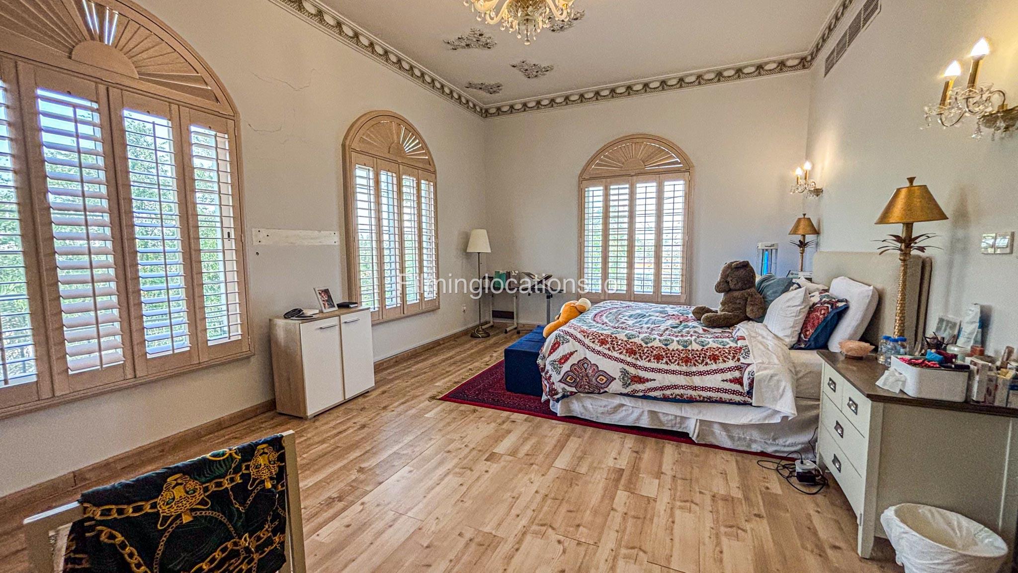 Our 3-bedroom Arabian villa offers a rich blend of traditional charm and versatile filming potential. It features 2 living rooms—the main one located on the ground floor, designed with panoramic window walls, Arabian-style chandeliers, and classic themed seating, all surrounded by carefully curated antique décor. A sliding wooden door connects this space to a dining room styled with matching chandeliers, rich curtains, and antique accents. The spacious kitchen includes a central kitchen island and opens to the garden through elegant glass doors, offering a bright backdrop. A spiral staircase leads to the 2nd living room upstairs, featuring slightly modern sofa seating facing a TV, large windows, a small dining area, and chandeliers that maintain the villa’s authentic touch. Continuing upstairs, the 3 bedrooms include a master bedroom with an attached bathroom, glass-door balcony, full-length mirror, and a small dressing area; a 2nd bedroom with windows and a dedicated dressing space; and a 3rd bedroom with minimal furnishings and a large window. The exterior offers a swimming pool with a cozy seating area, a garden with a children’s play zone, and a private garage—making this villa a well-rounded, atmospheric location ideal for a wide range of productions.