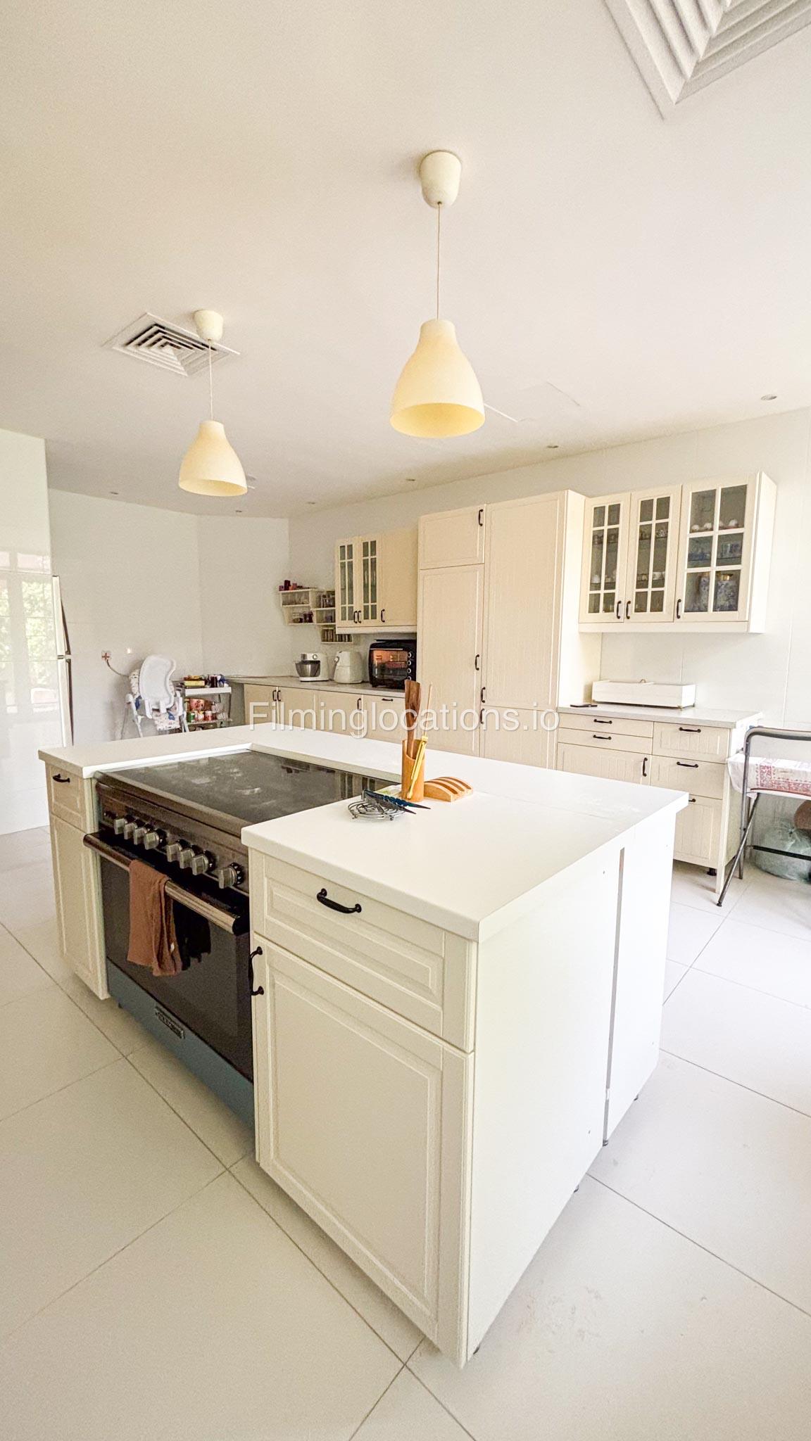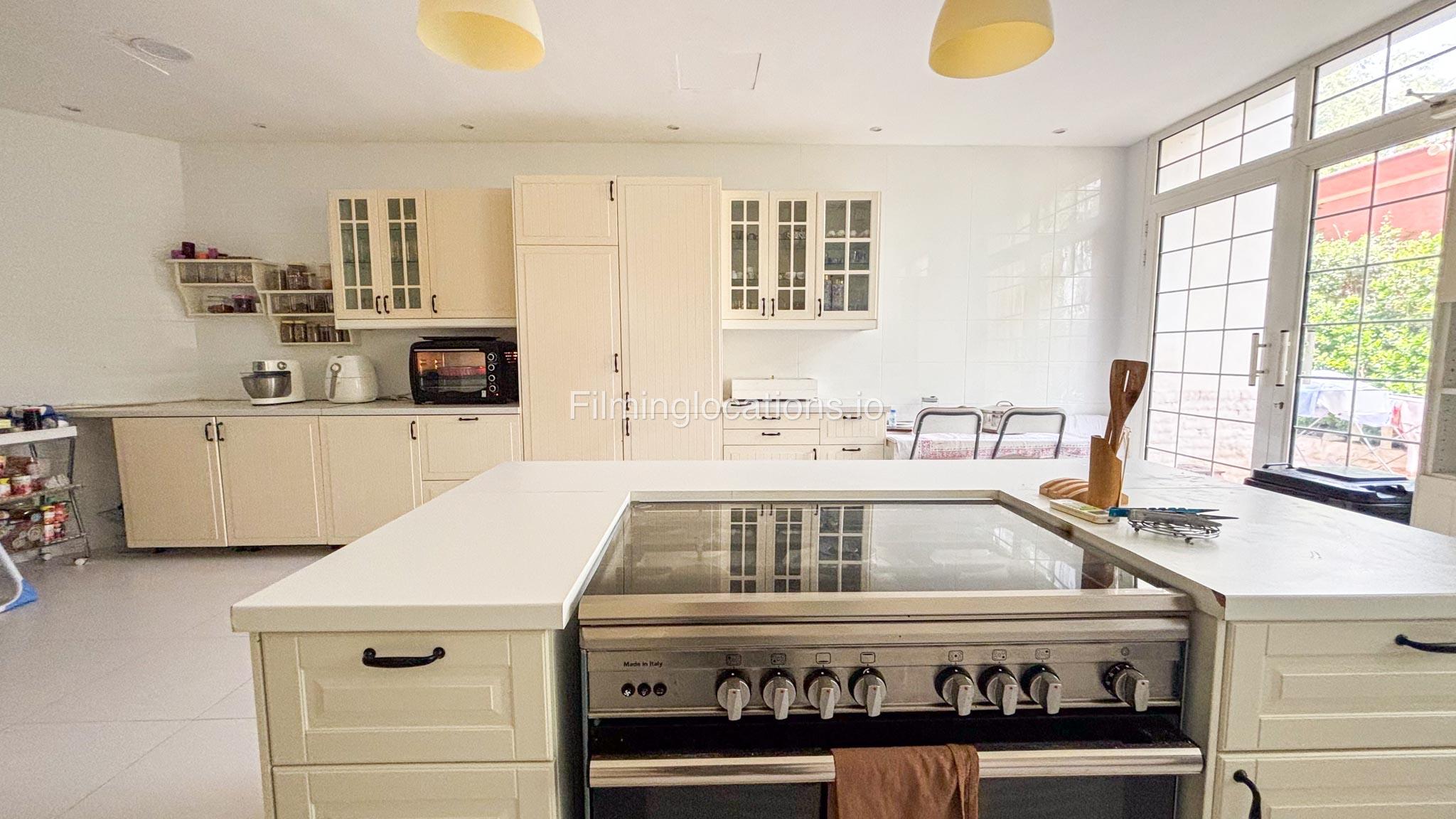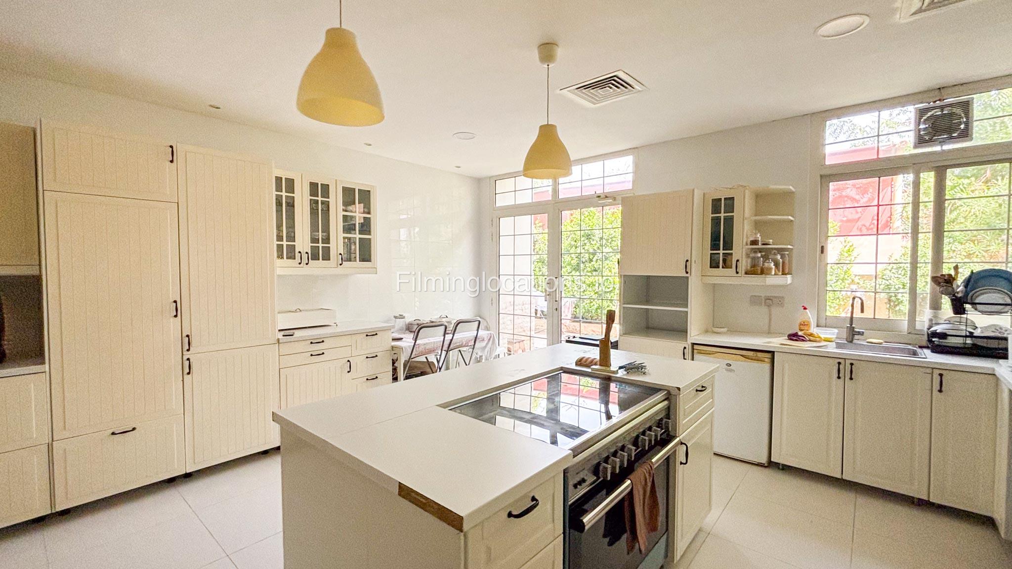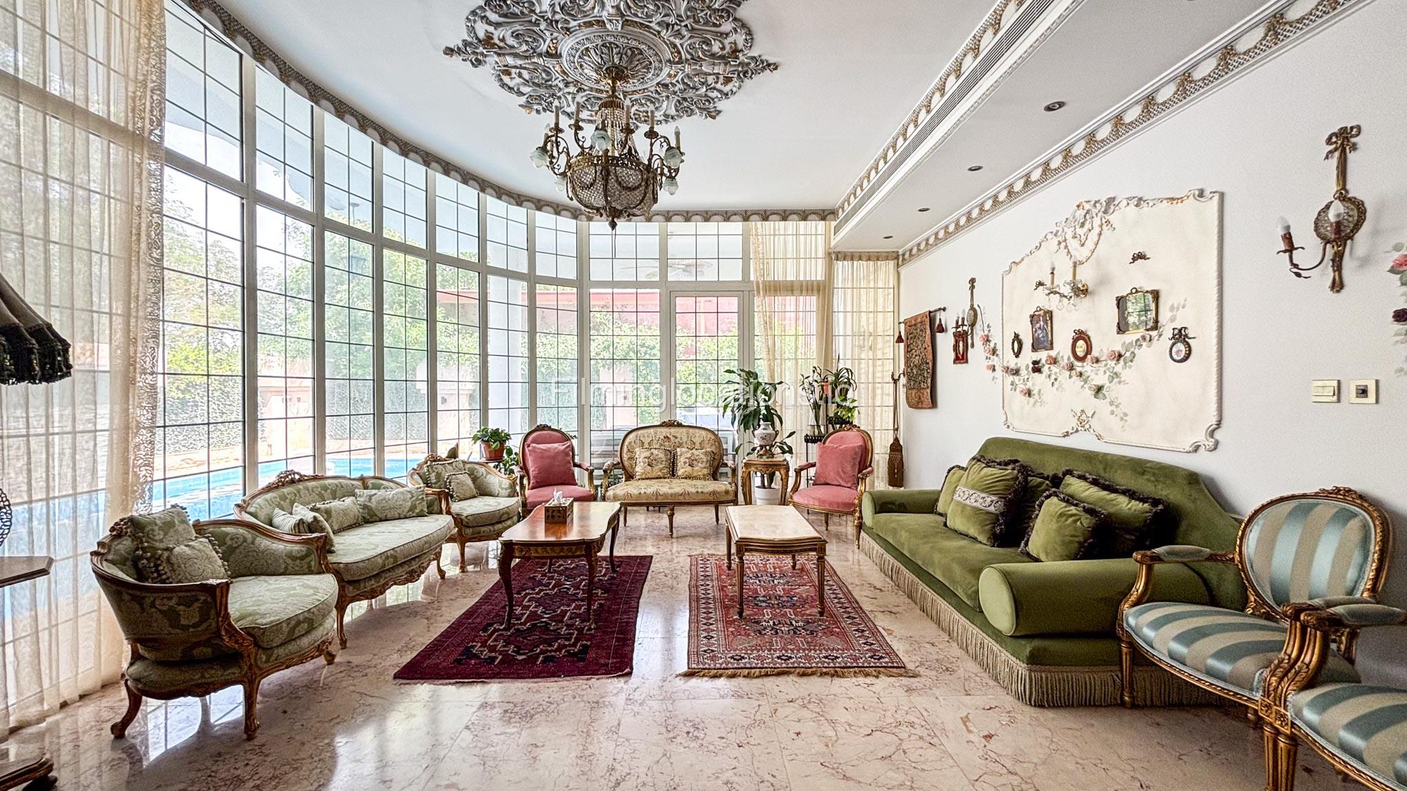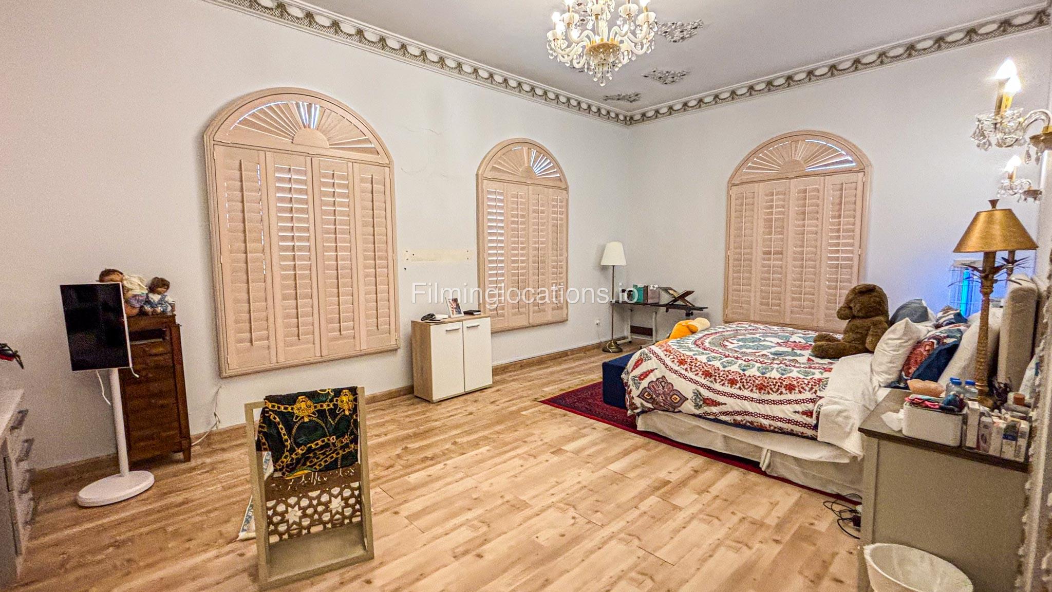 Our 3-bedroom Arabian villa offers a rich blend of traditional charm and versatile filming potential. It features 2 living rooms—the main one located on the ground floor, designed with panoramic window walls, Arabian-style chandeliers, and classic themed seating, all surrounded by carefully curated antique décor. A sliding wooden door connects this space to a dining room styled with matching chandeliers, rich curtains, and antique accents. The spacious kitchen includes a central kitchen island and opens to the garden through elegant glass doors, offering a bright backdrop. A spiral staircase leads to the 2nd living room upstairs, featuring slightly modern sofa seating facing a TV, large windows, a small dining area, and chandeliers that maintain the villa’s authentic touch. Continuing upstairs, the 3 bedrooms include a master bedroom with an attached bathroom, glass-door balcony, full-length mirror, and a small dressing area; a 2nd bedroom with windows and a dedicated dressing space; and a 3rd bedroom with minimal furnishings and a large window. The exterior offers a swimming pool with a cozy seating area, a garden with a children’s play zone, and a private garage—making this villa a well-rounded, atmospheric location ideal for a wide range of productions.