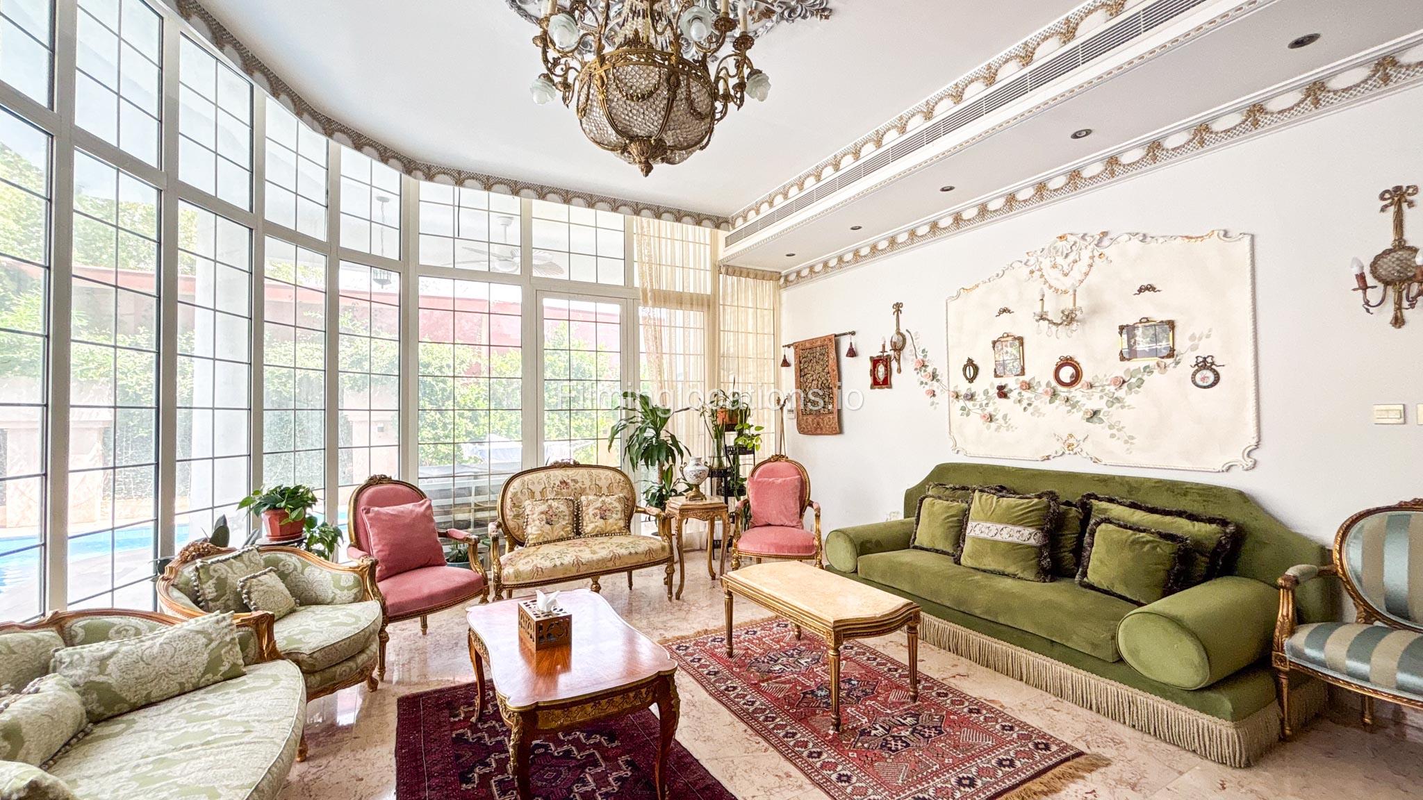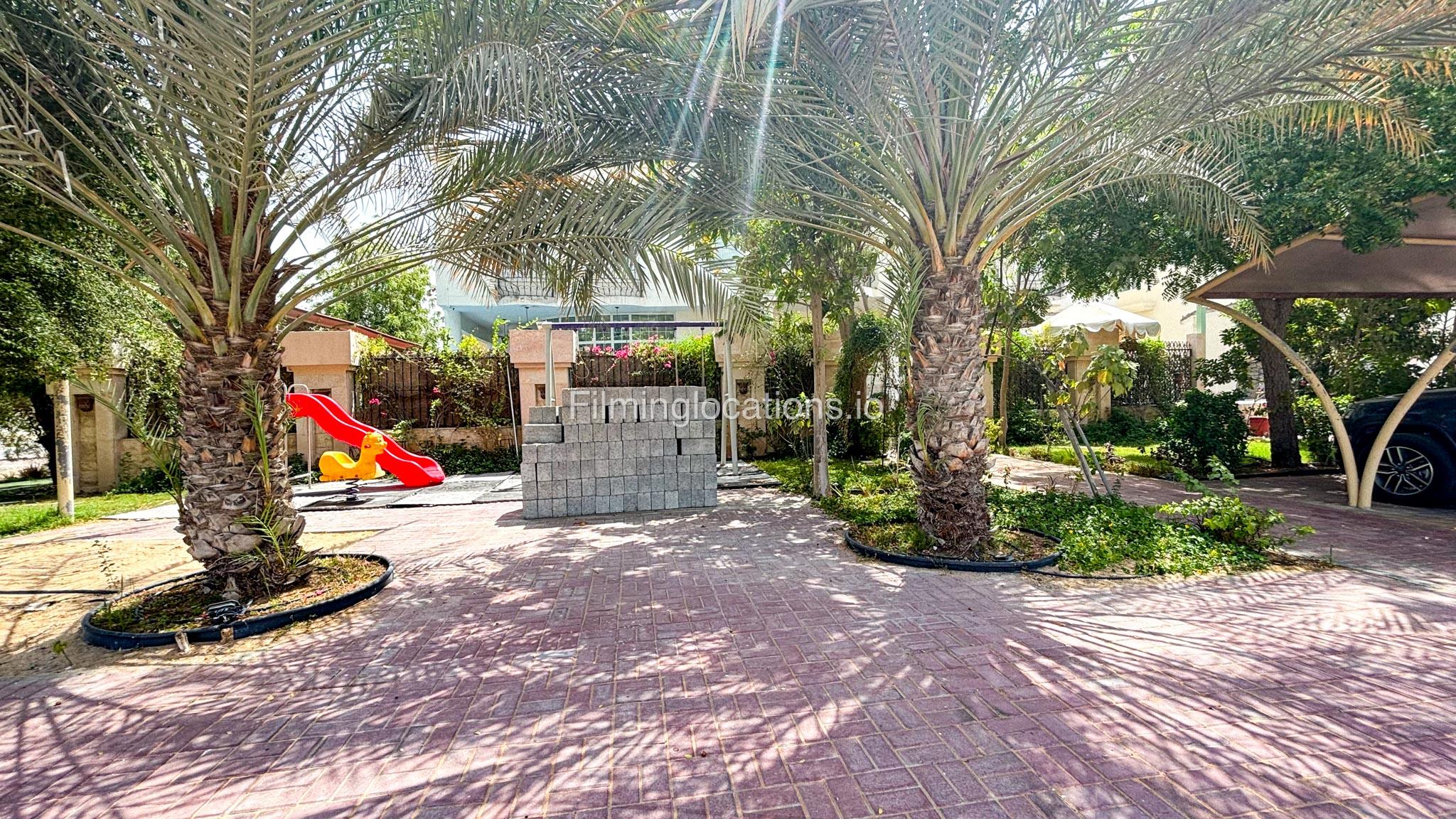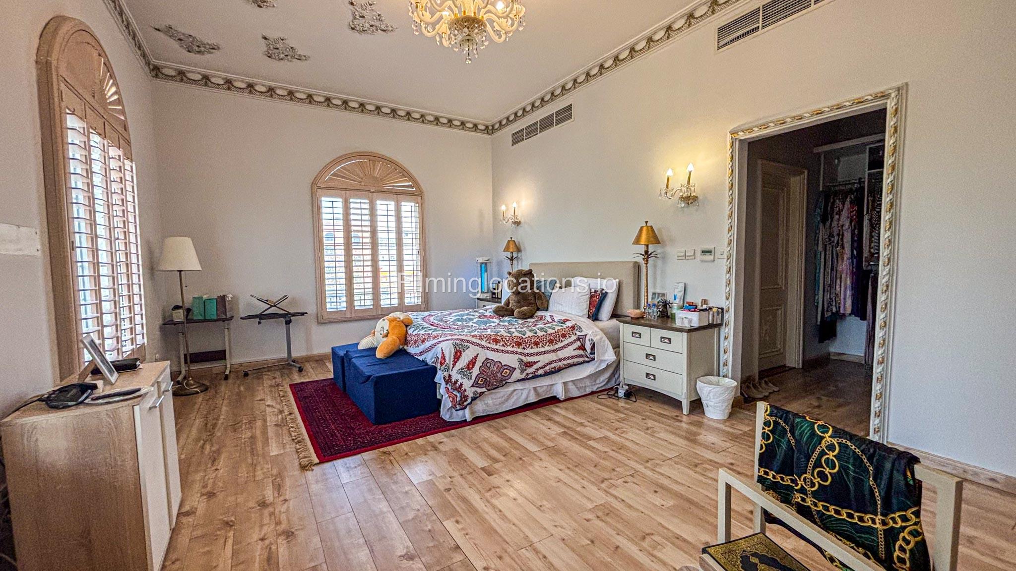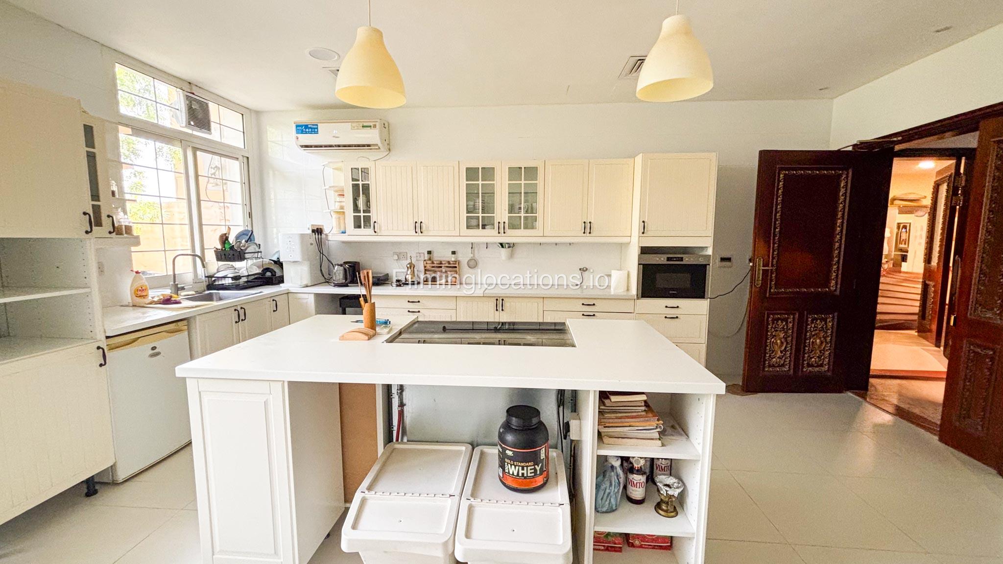 Our 3-bedroom Arabian villa offers a rich blend of traditional charm and versatile filming potential. It features 2 living rooms—the main one located on the ground floor, designed with panoramic window walls, Arabian-style chandeliers, and classic themed seating, all surrounded by carefully curated antique décor. A sliding wooden door connects this space to a dining room styled with matching chandeliers, rich curtains, and antique accents. The spacious kitchen includes a central kitchen island and opens to the garden through elegant glass doors, offering a bright backdrop. A spiral staircase leads to the 2nd living room upstairs, featuring slightly modern sofa seating facing a TV, large windows, a small dining area, and chandeliers that maintain the villa’s authentic touch. Continuing upstairs, the 3 bedrooms include a master bedroom with an attached bathroom, glass-door balcony, full-length mirror, and a small dressing area; a 2nd bedroom with windows and a dedicated dressing space; and a 3rd bedroom with minimal furnishings and a large window. The exterior offers a swimming pool with a cozy seating area, a garden with a children’s play zone, and a private garage—making this villa a well-rounded, atmospheric location ideal for a wide range of productions.