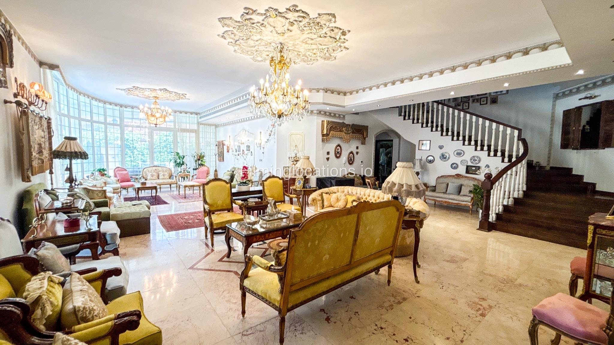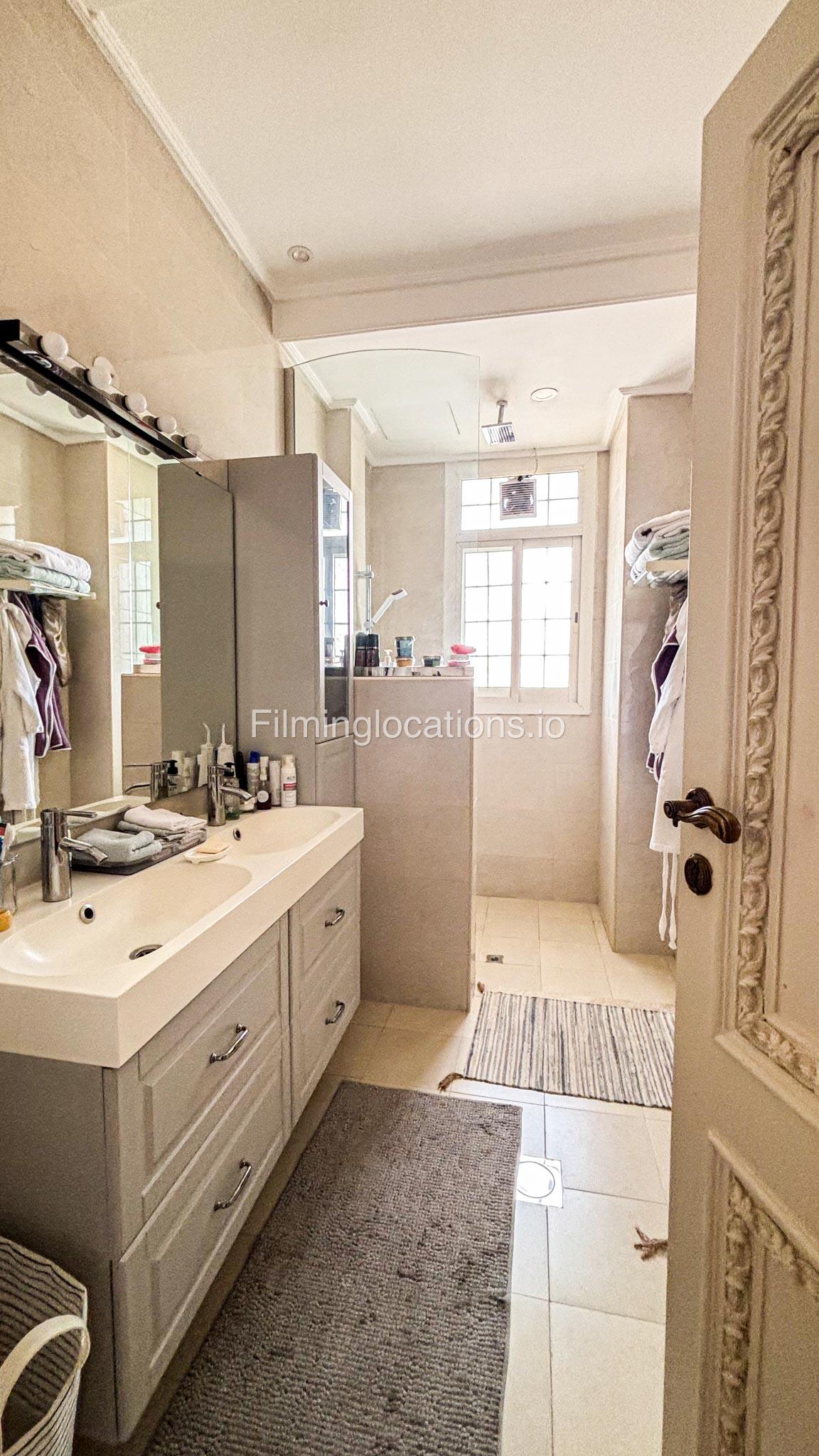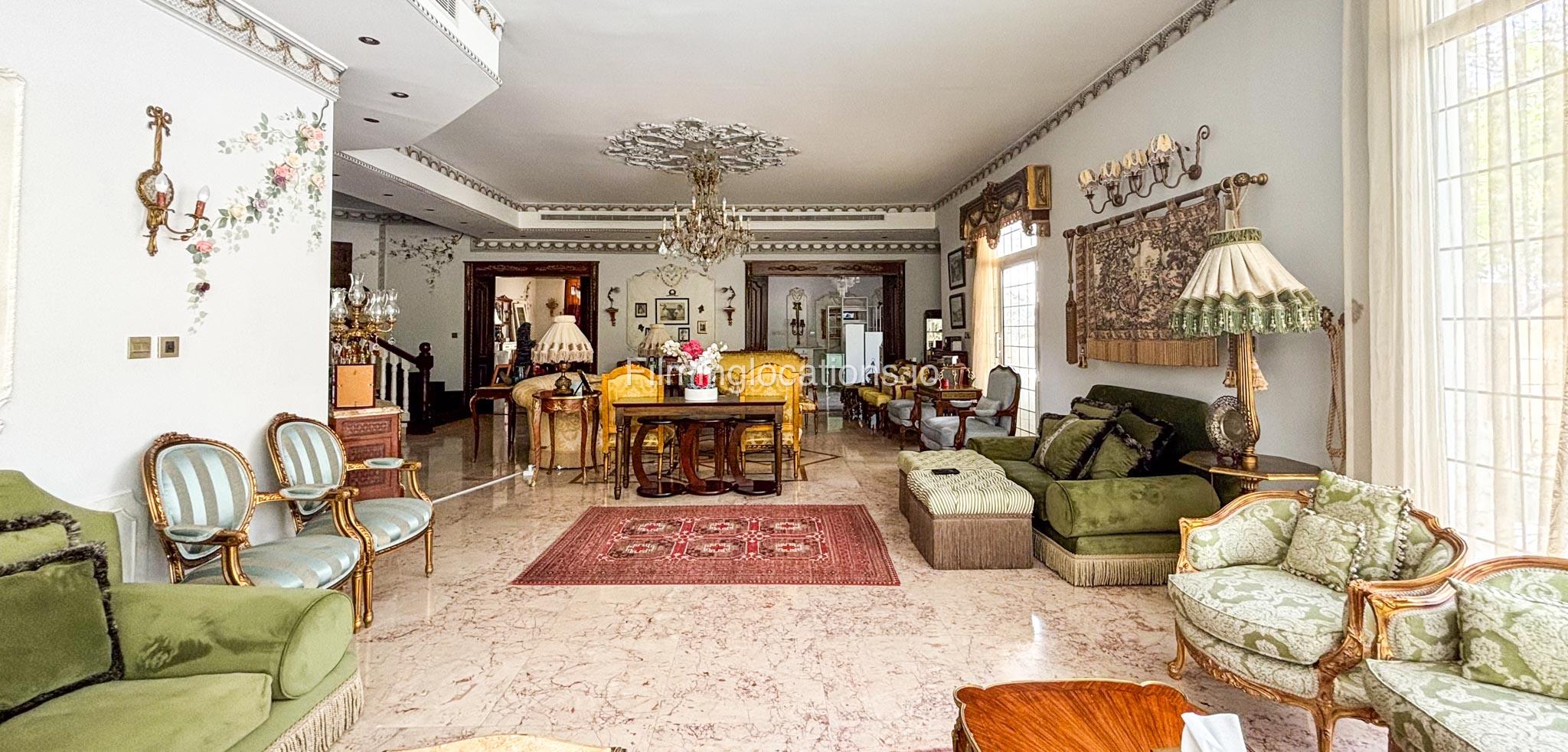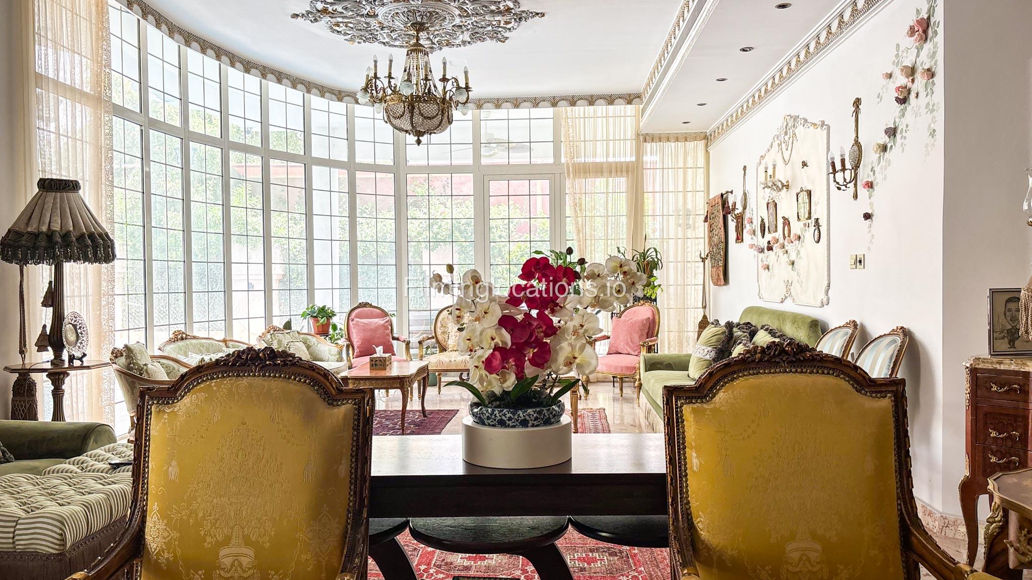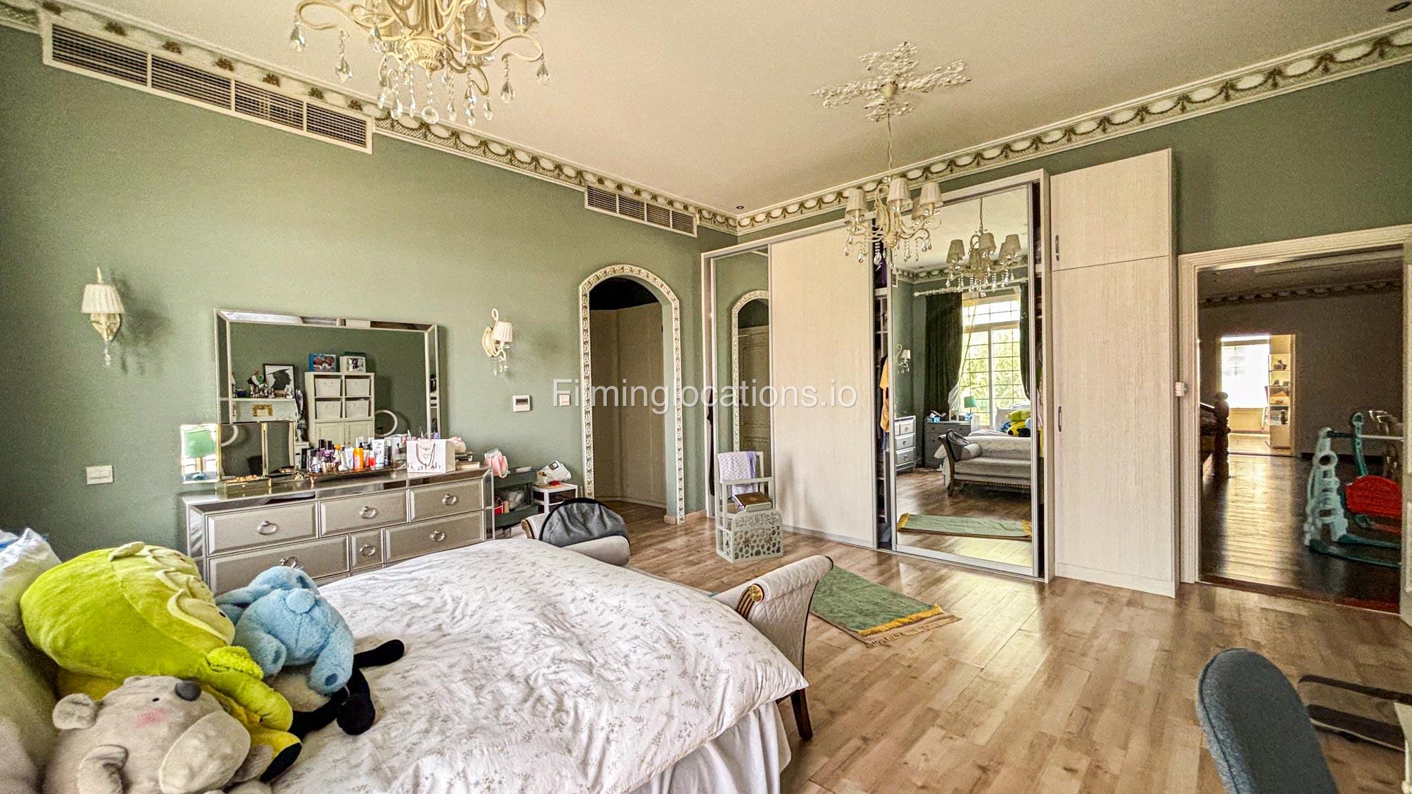 Our 3-bedroom Arabian villa offers a rich blend of traditional charm and versatile filming potential. It features 2 living rooms—the main one located on the ground floor, designed with panoramic window walls, Arabian-style chandeliers, and classic themed seating, all surrounded by carefully curated antique décor. A sliding wooden door connects this space to a dining room styled with matching chandeliers, rich curtains, and antique accents. The spacious kitchen includes a central kitchen island and opens to the garden through elegant glass doors, offering a bright backdrop. A spiral staircase leads to the 2nd living room upstairs, featuring slightly modern sofa seating facing a TV, large windows, a small dining area, and chandeliers that maintain the villa’s authentic touch. Continuing upstairs, the 3 bedrooms include a master bedroom with an attached bathroom, glass-door balcony, full-length mirror, and a small dressing area; a 2nd bedroom with windows and a dedicated dressing space; and a 3rd bedroom with minimal furnishings and a large window. The exterior offers a swimming pool with a cozy seating area, a garden with a children’s play zone, and a private garage—making this villa a well-rounded, atmospheric location ideal for a wide range of productions.
