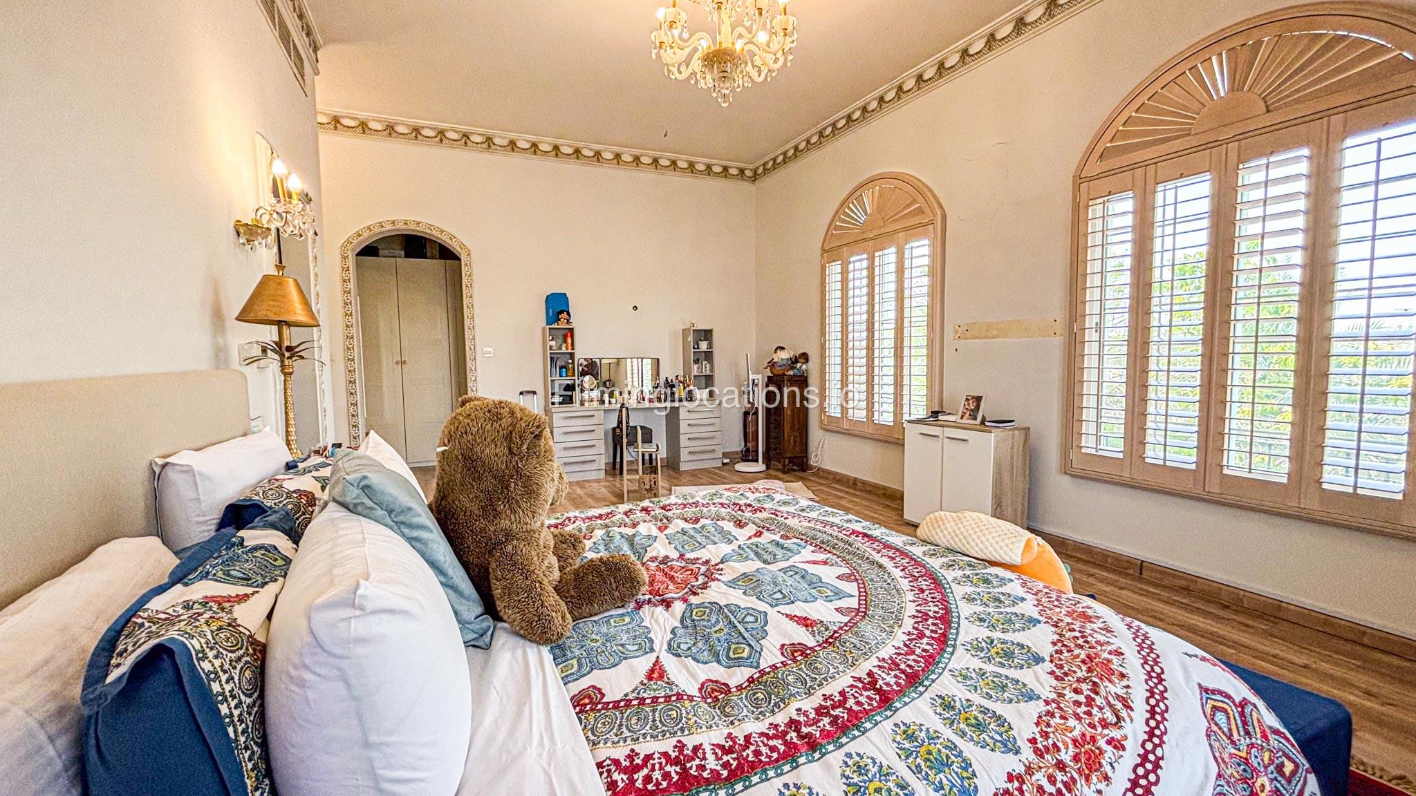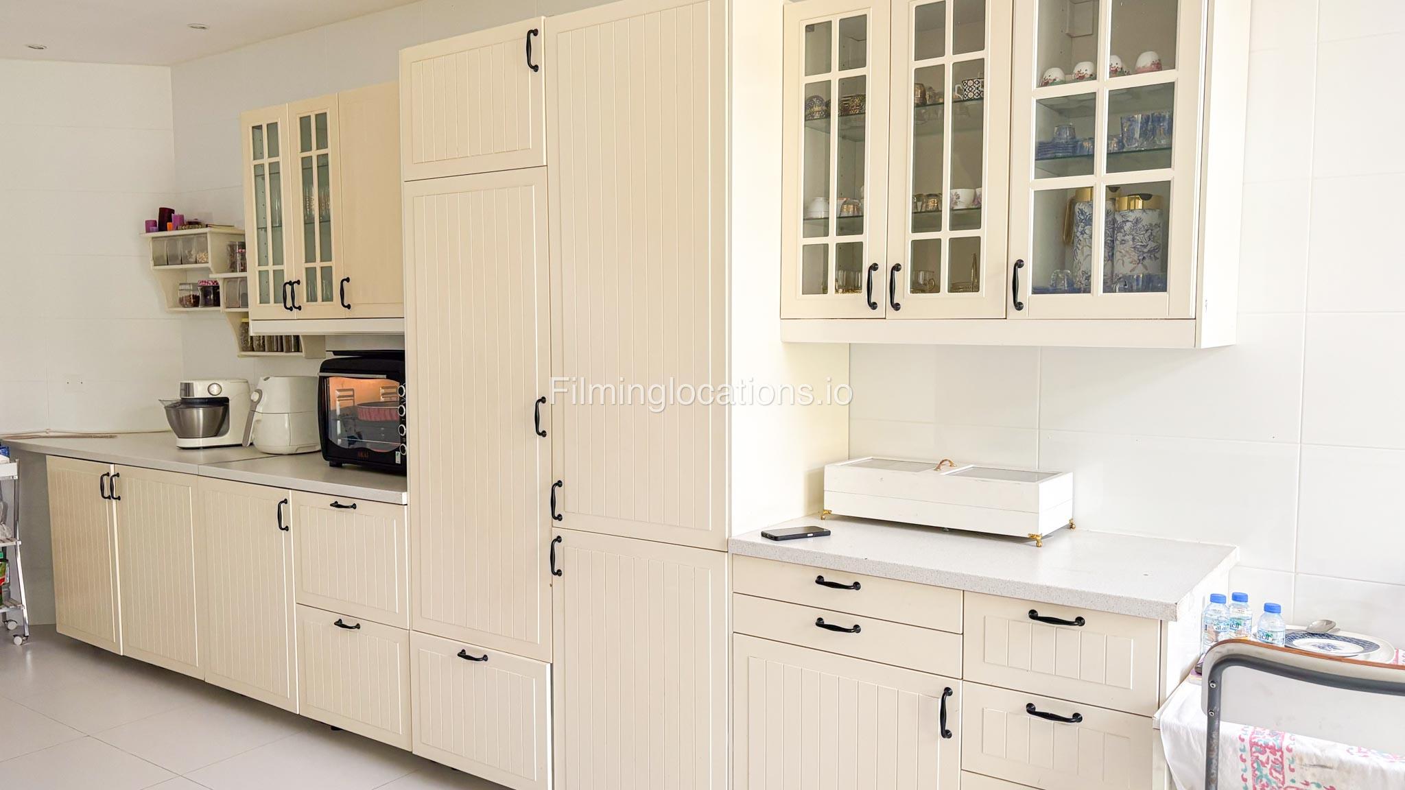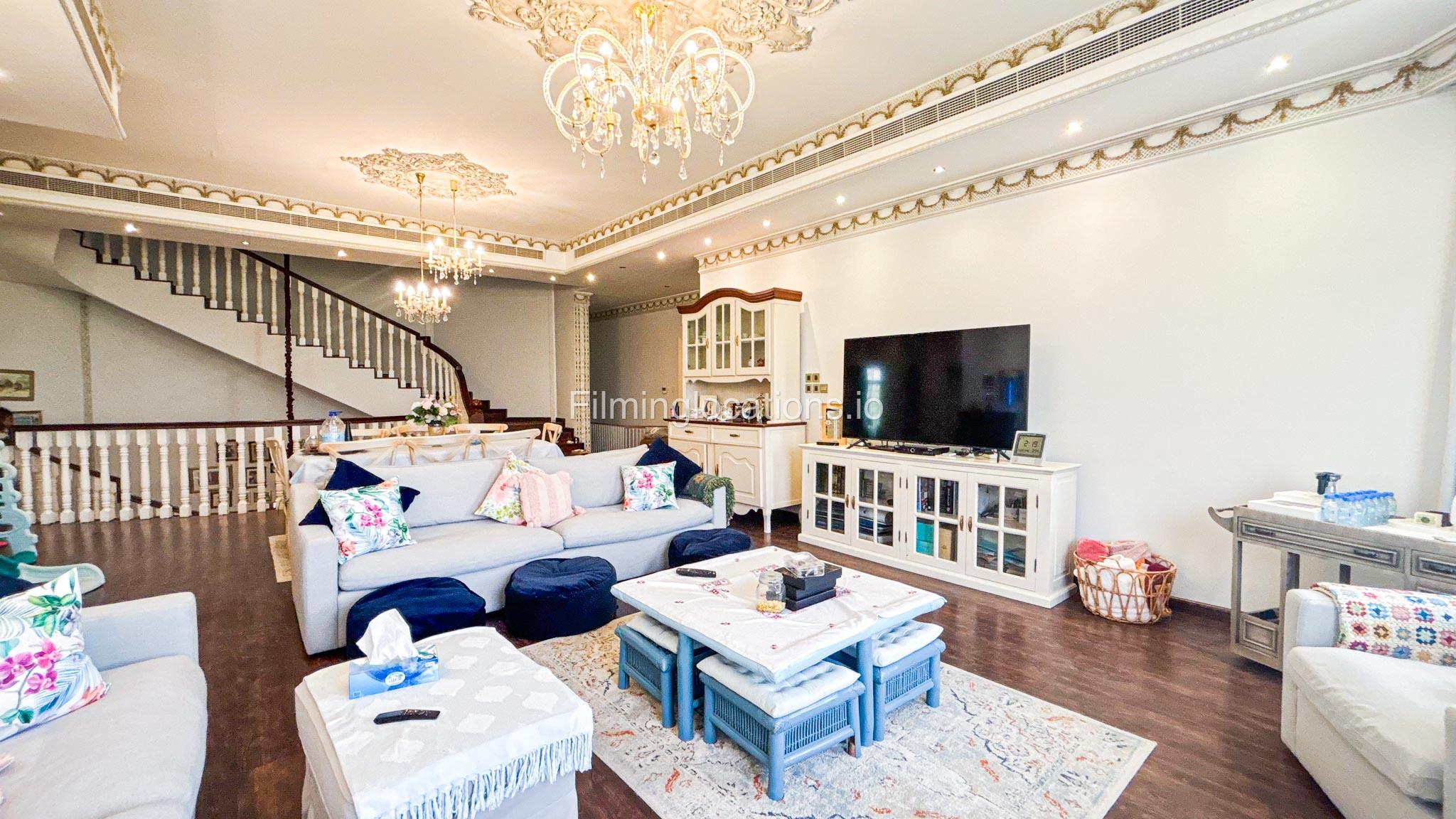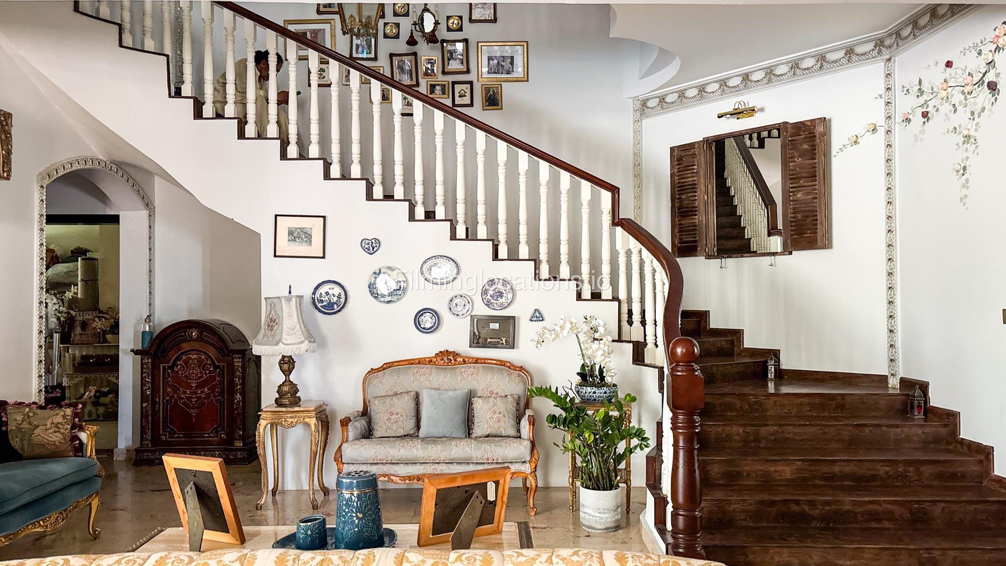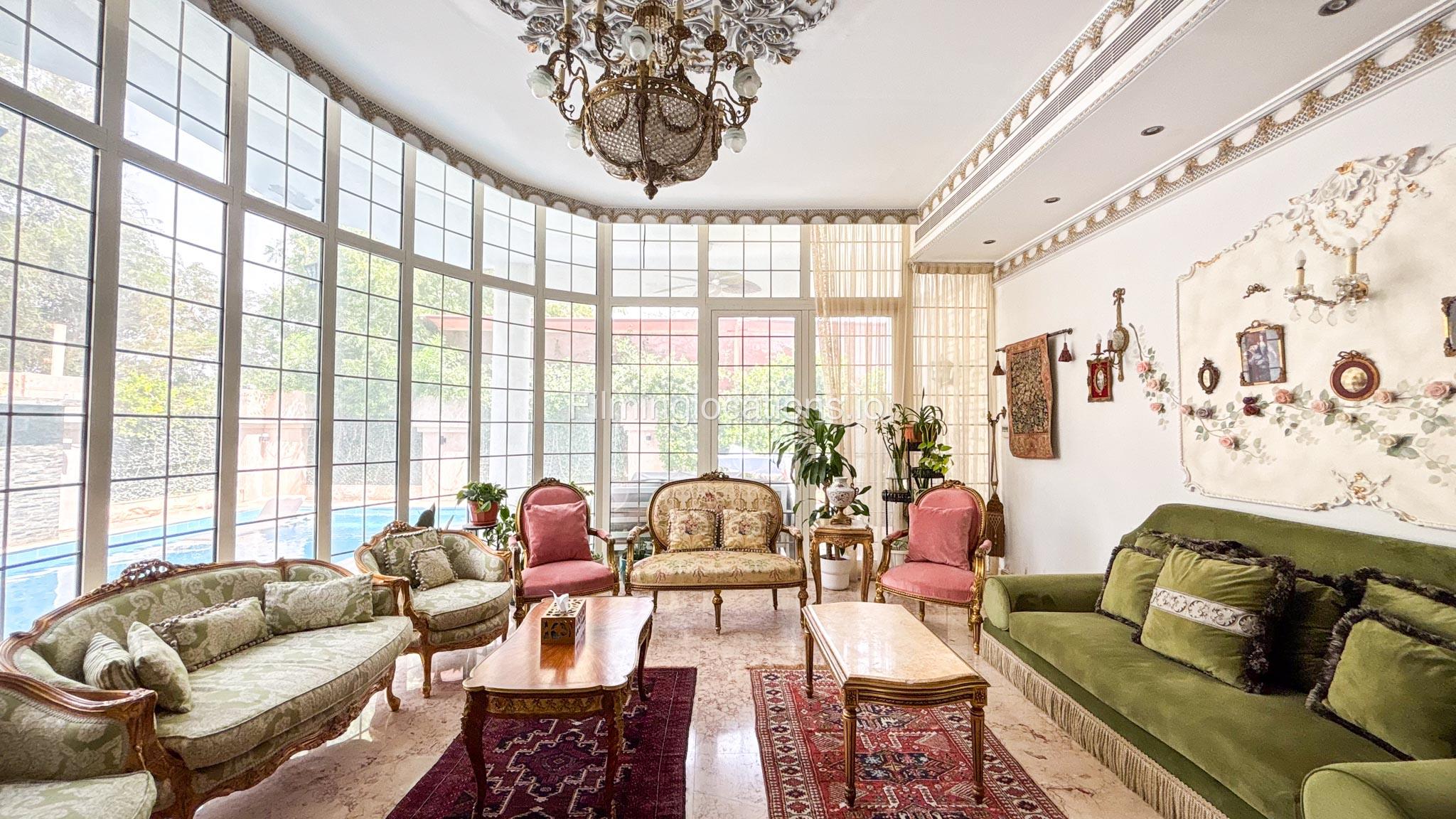 Our 3-bedroom Arabian villa offers a rich blend of traditional charm and versatile filming potential. It features 2 living rooms—the main one located on the ground floor, designed with panoramic window walls, Arabian-style chandeliers, and classic themed seating, all surrounded by carefully curated antique décor. A sliding wooden door connects this space to a dining room styled with matching chandeliers, rich curtains, and antique accents. The spacious kitchen includes a central kitchen island and opens to the garden through elegant glass doors, offering a bright backdrop. A spiral staircase leads to the 2nd living room upstairs, featuring slightly modern sofa seating facing a TV, large windows, a small dining area, and chandeliers that maintain the villa’s authentic touch. Continuing upstairs, the 3 bedrooms include a master bedroom with an attached bathroom, glass-door balcony, full-length mirror, and a small dressing area; a 2nd bedroom with windows and a dedicated dressing space; and a 3rd bedroom with minimal furnishings and a large window. The exterior offers a swimming pool with a cozy seating area, a garden with a children’s play zone, and a private garage—making this villa a well-rounded, atmospheric location ideal for a wide range of productions.