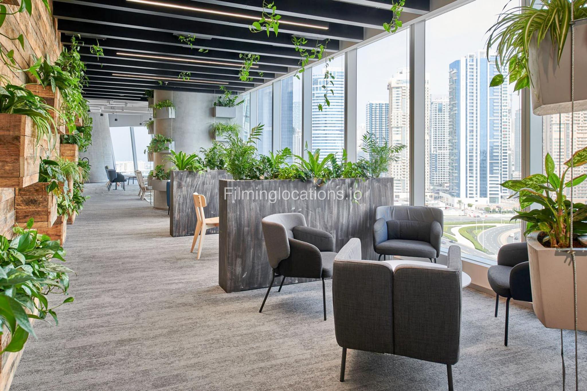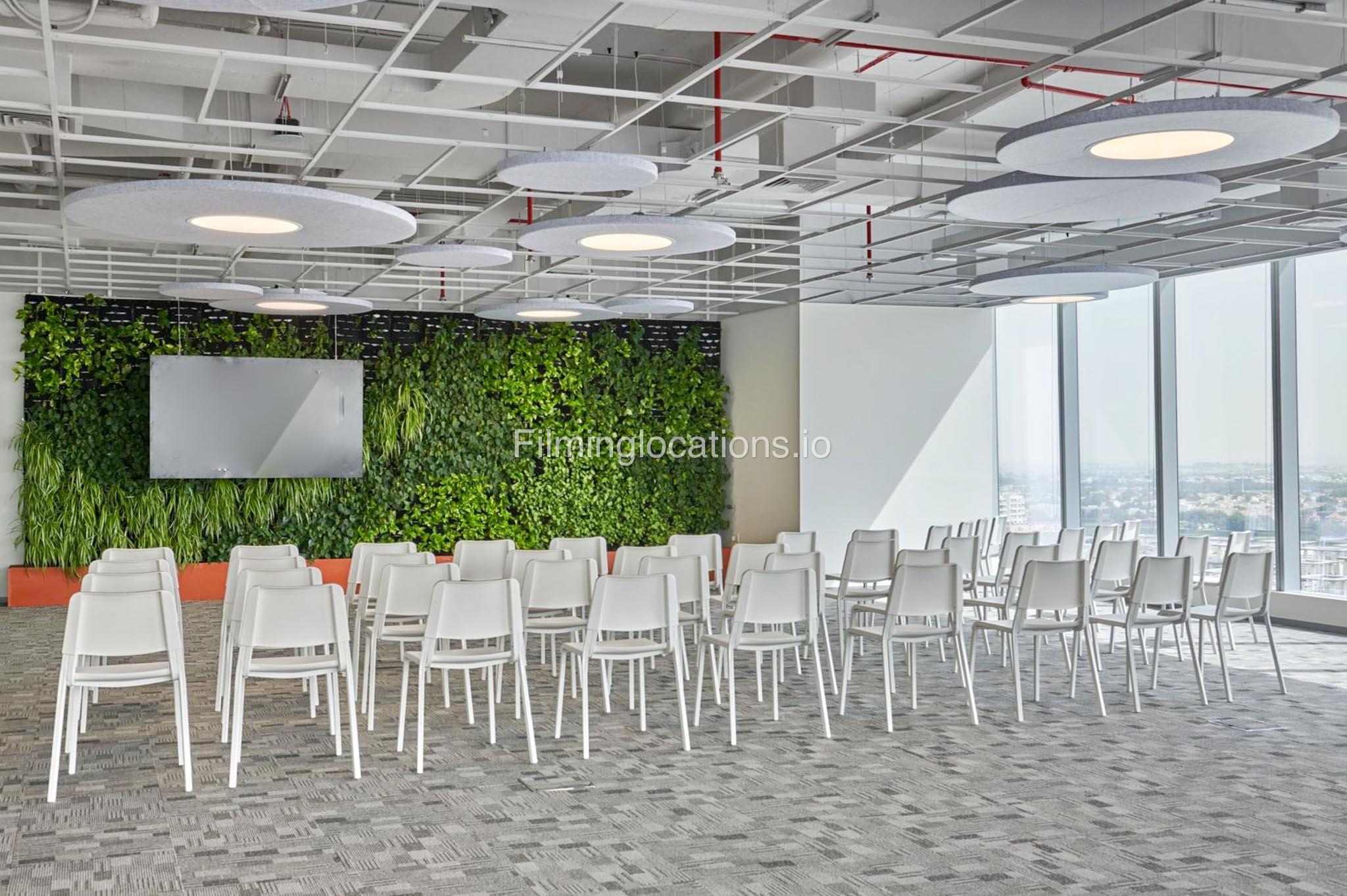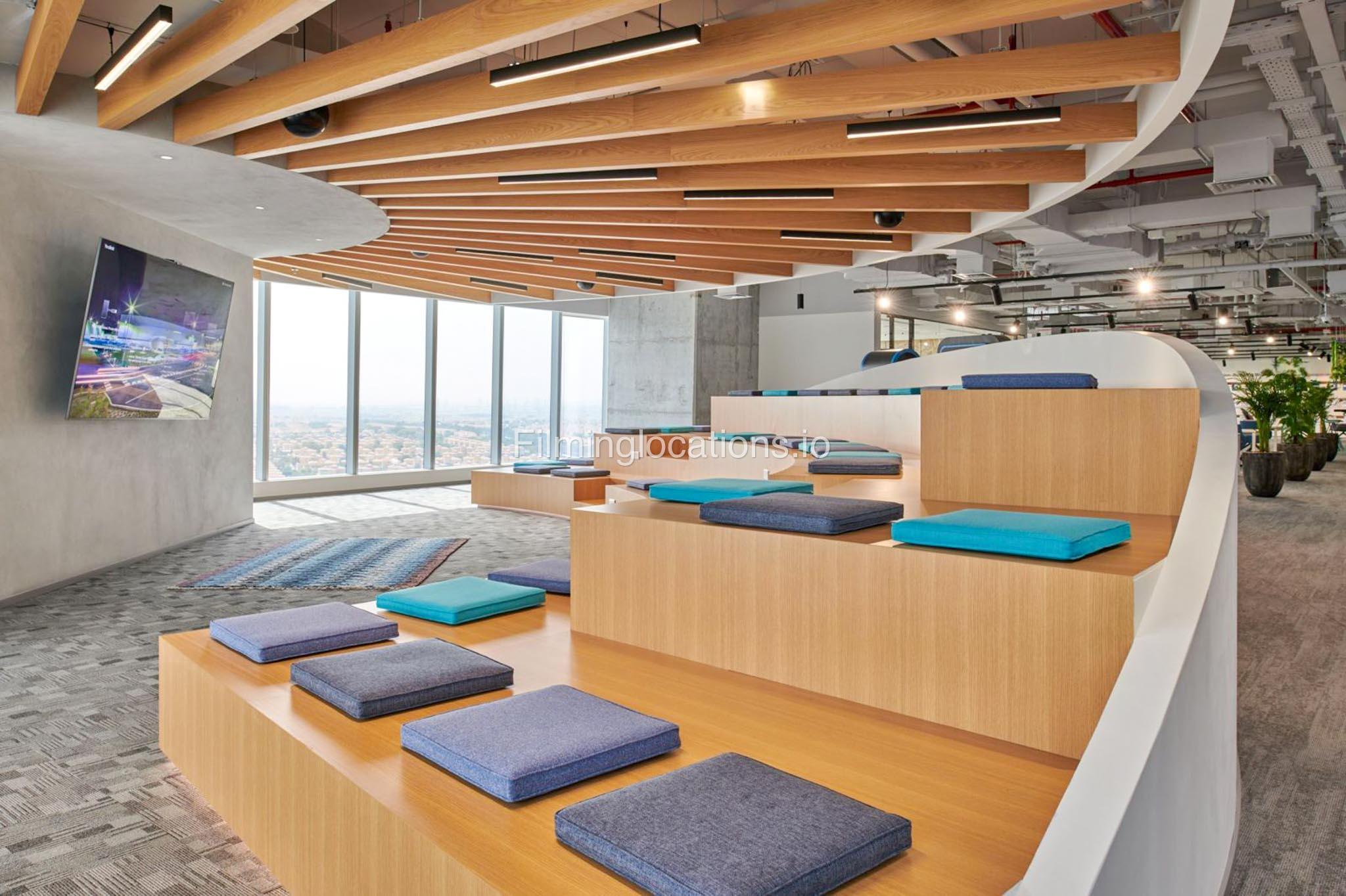 Our stunning office offers a sleek, vibrant and modern backdrop. The space features a contemporary open-plan layout with sophisticated lighting fixtures, clean architectural lines, and floor-to-ceiling window walls that flood the space with natural light while showcasing skyline views. A standout feature is the unique staircase-style seating area. The location also includes a conference room and a separate meeting room, both with window views. The location also includes a small indoor cafe.