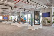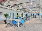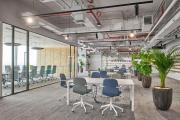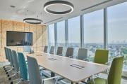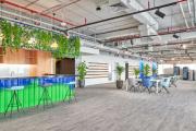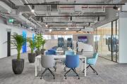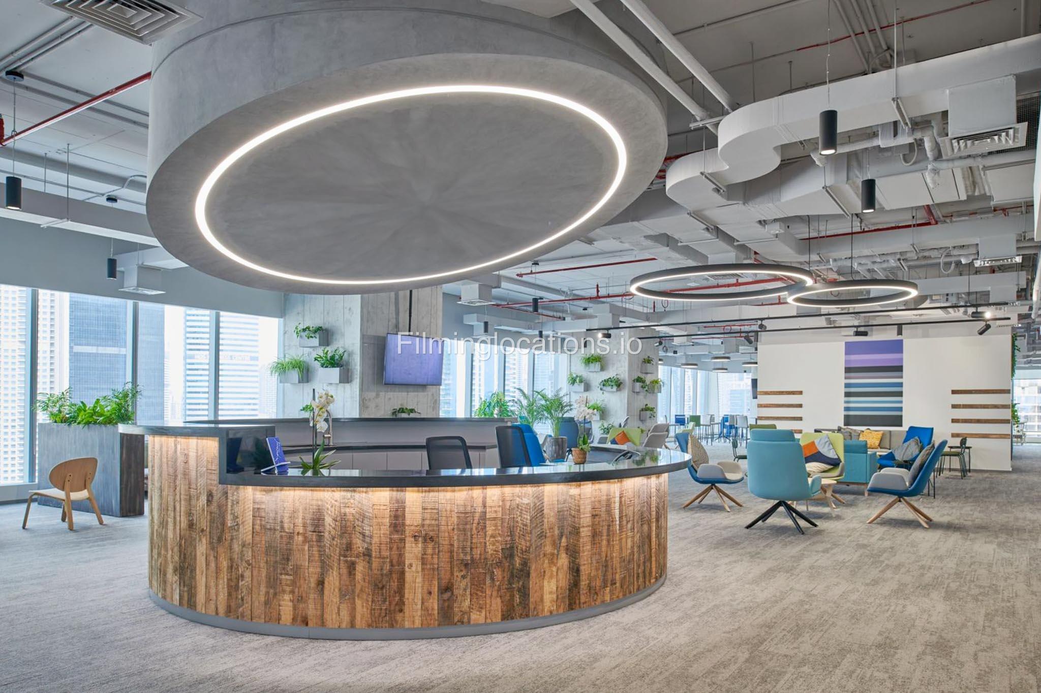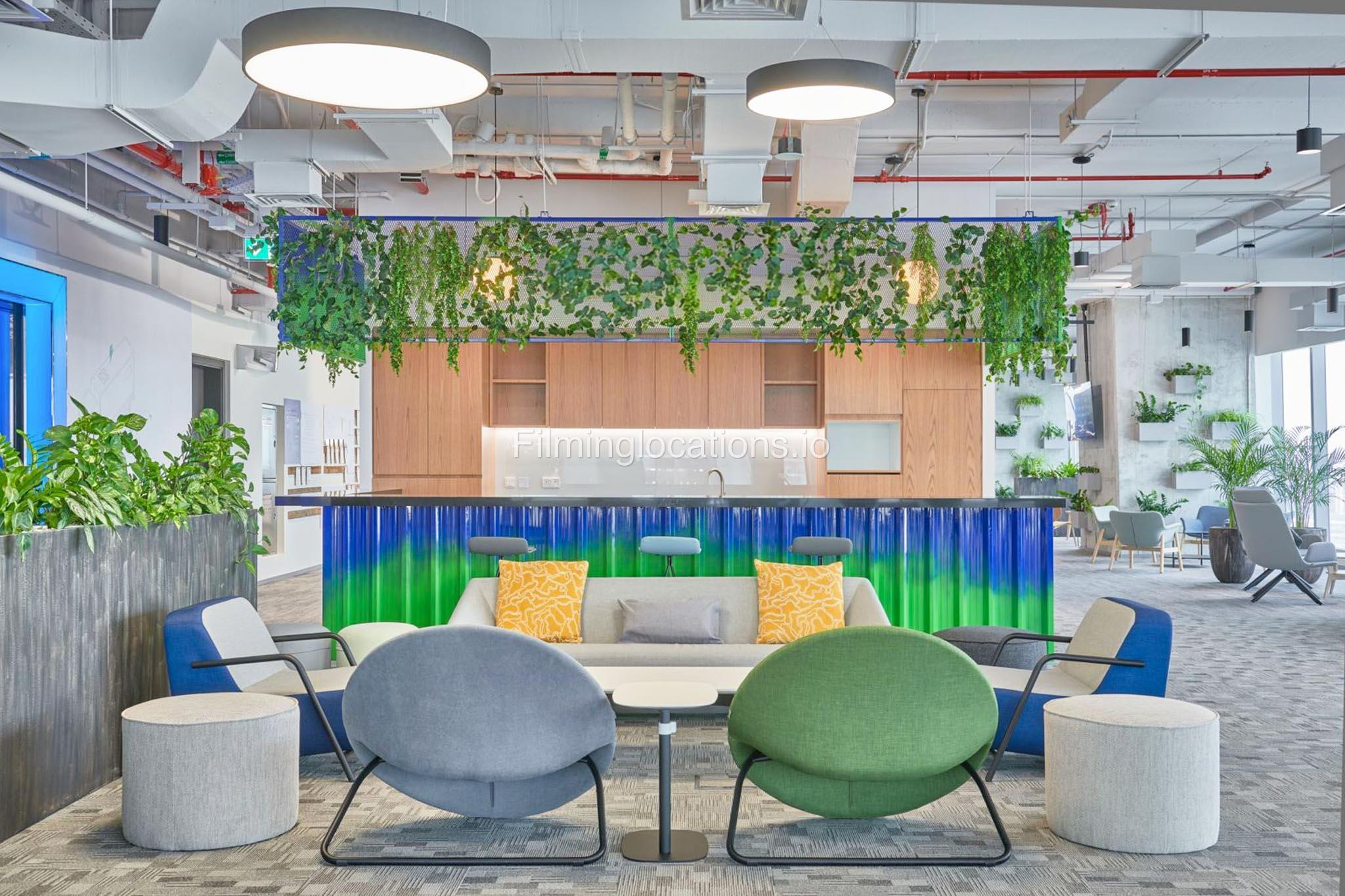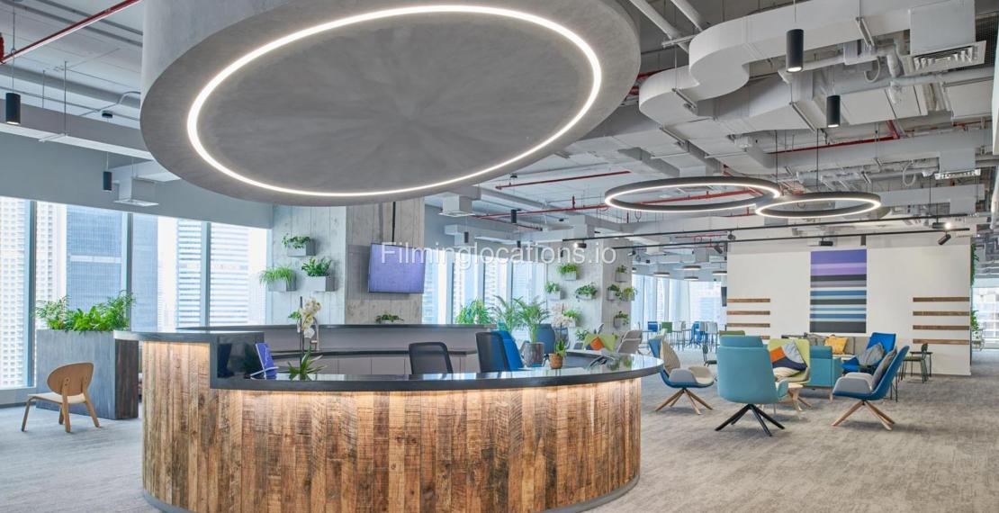 Our stunning office offers a sleek, vibrant and modern backdrop. The space features a contemporary open-plan layout with sophisticated lighting fixtures, clean architectural lines, and floor-to-ceiling window walls that flood the space with natural light while showcasing skyline views. A standout feature is the unique staircase-style seating area. The location also includes a conference room and a separate meeting room, both with window views. The location also includes a small indoor cafe.