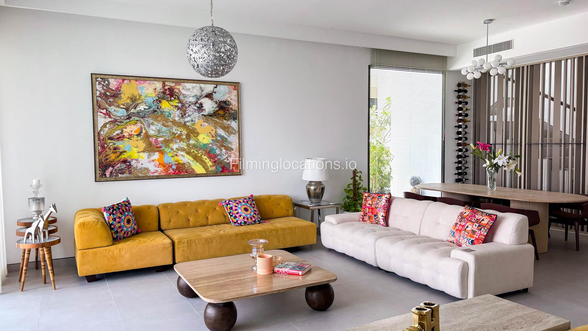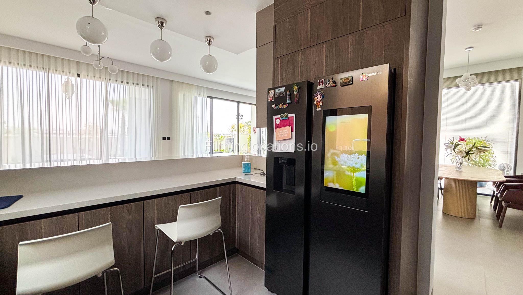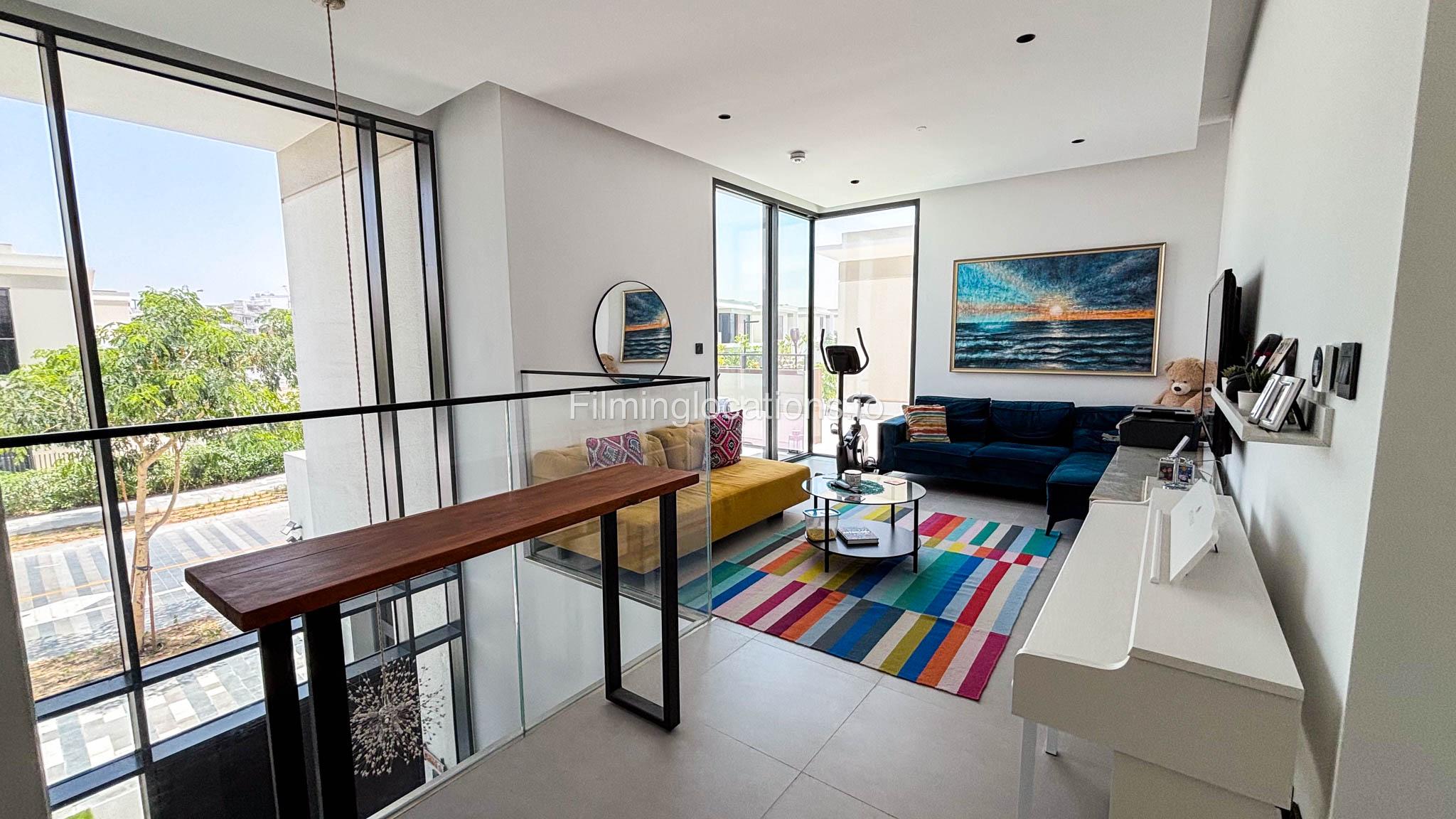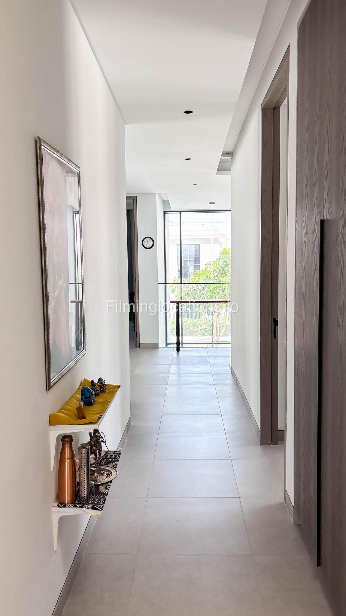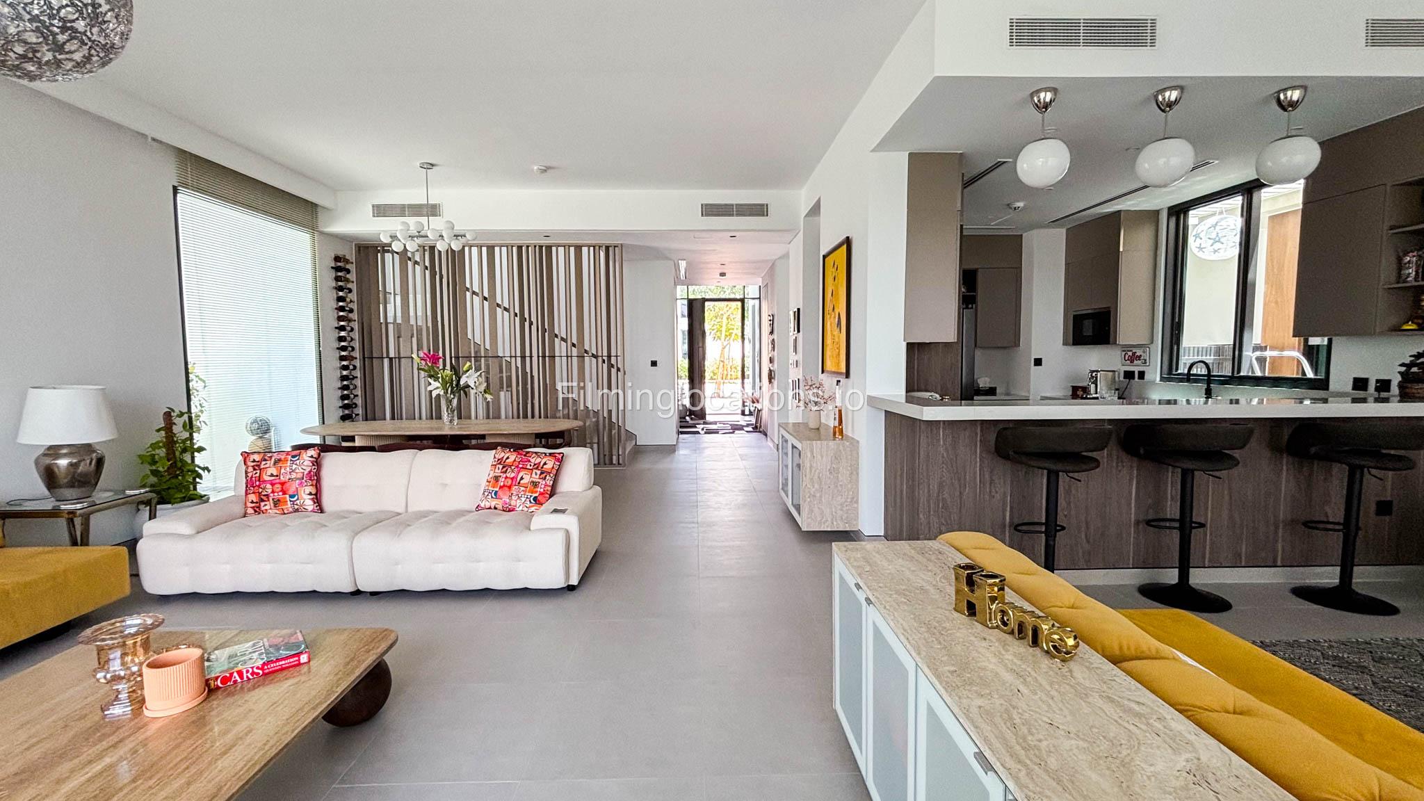 Our stylish 4-bedroom villa offers a versatile setting ideal for filming. The main living room is a spacious, well-lit area featuring modern ceiling lights, colorful seating arranged around a TV, striking wall paintings, and large window walls. A cozy dining area and an open kitchen are seamlessly integrated into the space. The hallway boasts tall ceilings and artistic wall décor, leading to the downstairs living room, bedroom, and kitchen. A staircase with expansive windows takes you to the upper floor, where a 2nd living room awaits with window walls, a cozy sofa setup, a TV, and a piano, along with a small pantry tucked to the side. The upper floor includes 3 bedrooms—1 with a balcony and another with large windows and a dedicated dressing room—while the 4th bedroom is located downstairs. Outdoors, the villa features a lush garden with a serene white Buddha statue as its centerpiece, complemented by a BBQ corner and cozy seating, offering a perfect backdrop for creative productions.