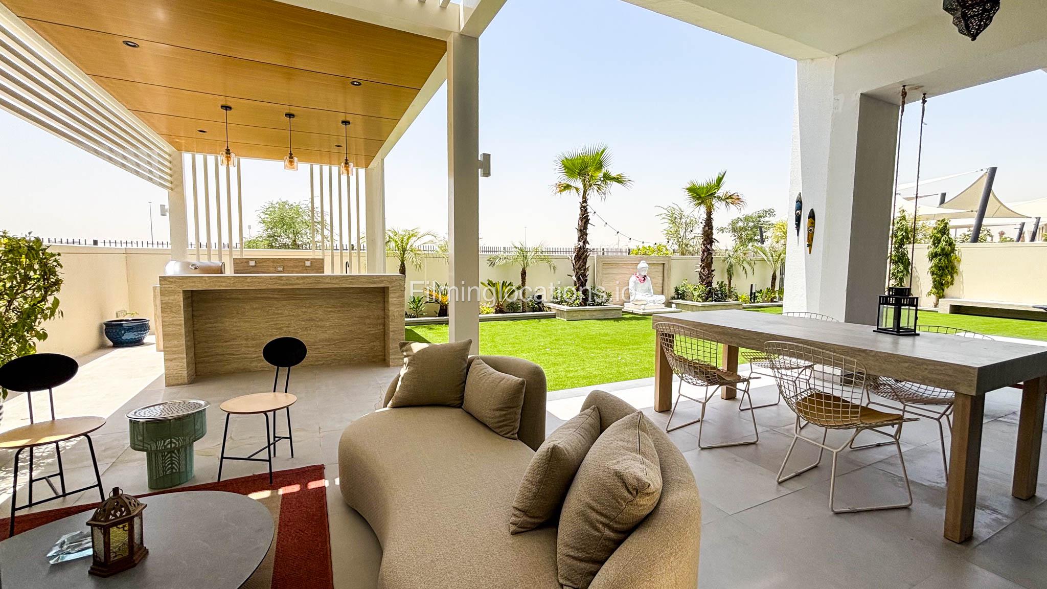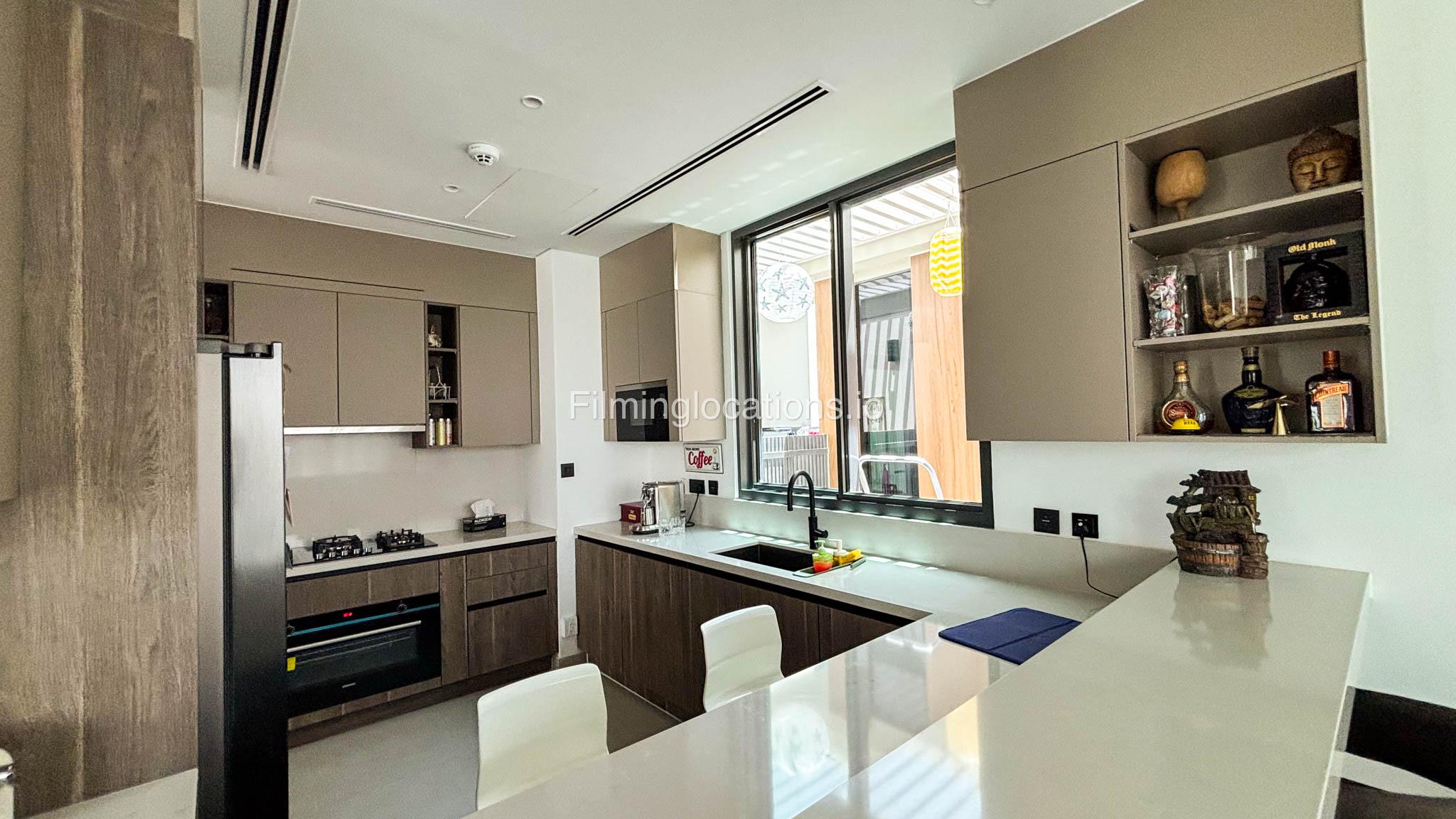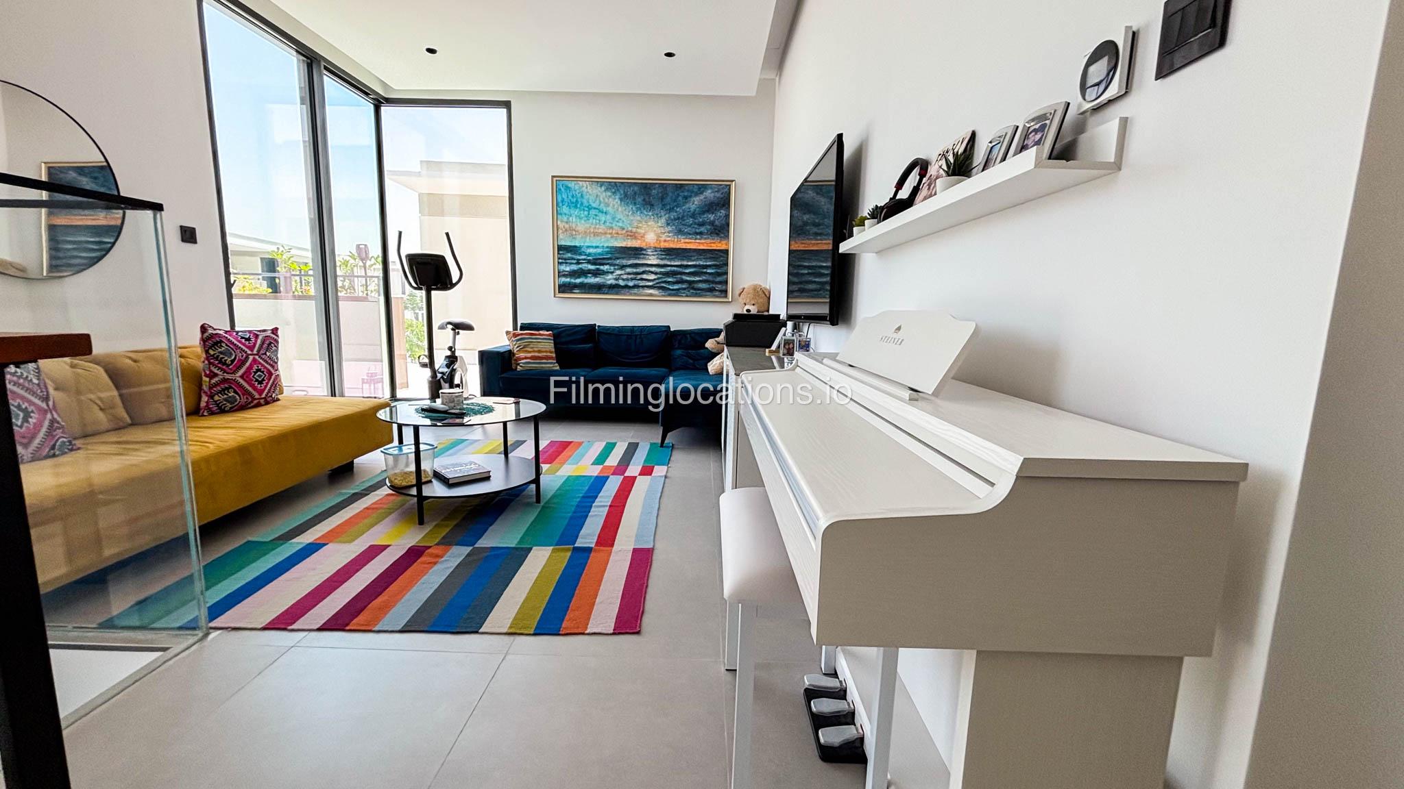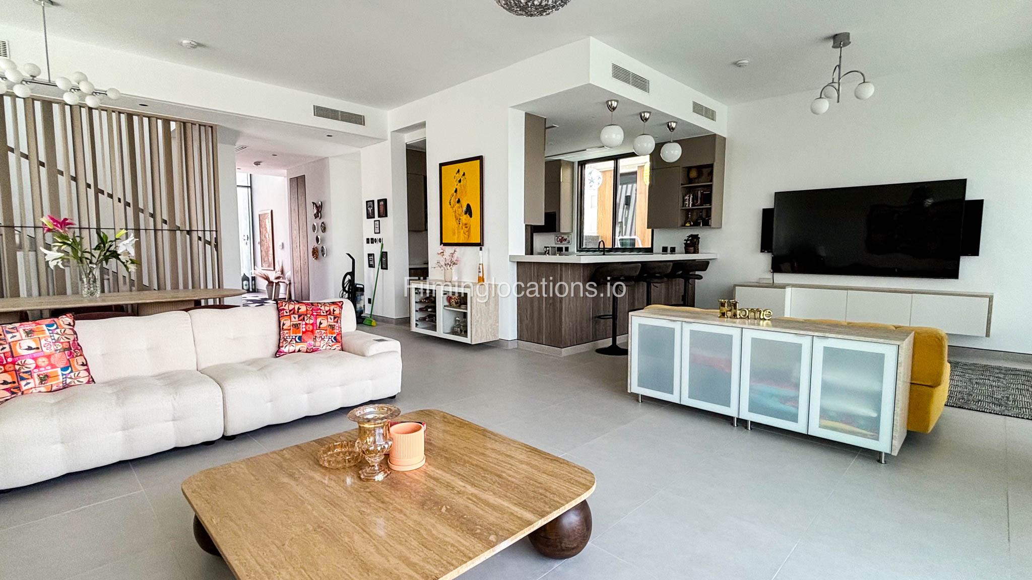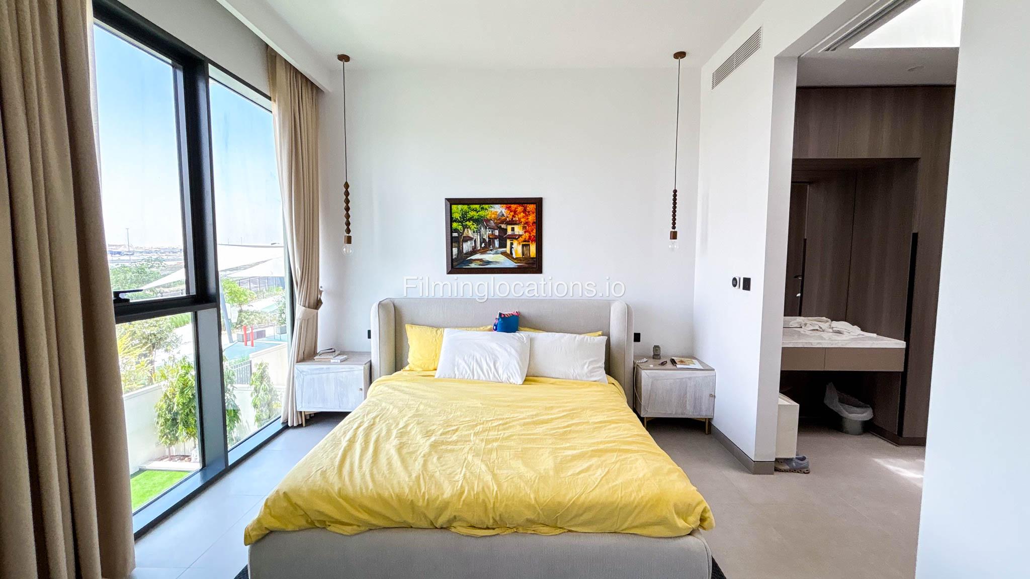Our stylish 4-bedroom villa offers a versatile setting ideal for filming. The main living room is a spacious, well-lit area featuring modern ceiling lights, colorful seating arranged around a TV, striking wall paintings, and large window walls. A cozy dining area and an open kitchen are seamlessly integrated into the space. The hallway boasts tall ceilings and artistic wall décor, leading to the downstairs living room, bedroom, and kitchen. A staircase with expansive windows takes you to the upper floor, where a 2nd living room awaits with window walls, a cozy sofa setup, a TV, and a piano, along with a small pantry tucked to the side. The upper floor includes 3 bedrooms—1 with a balcony and another with large windows and a dedicated dressing room—while the 4th bedroom is located downstairs. Outdoors, the villa features a lush garden with a serene white Buddha statue as its centerpiece, complemented by a BBQ corner and cozy seating, offering a perfect backdrop for creative productions.