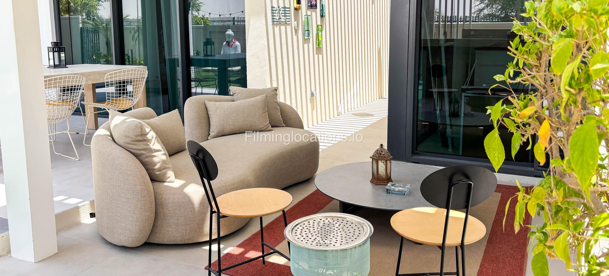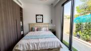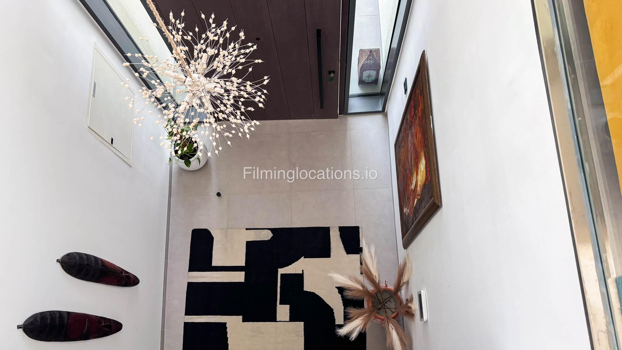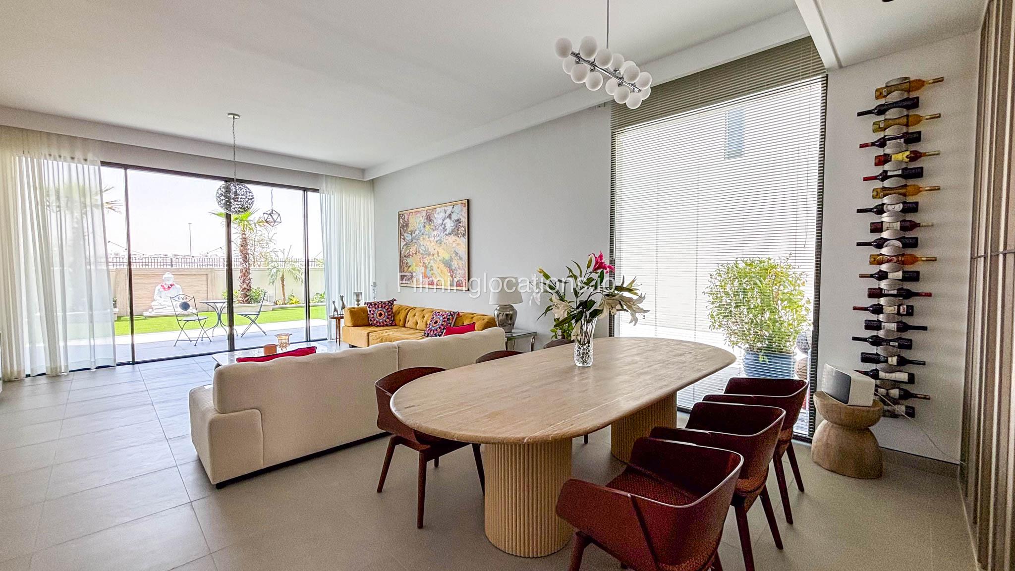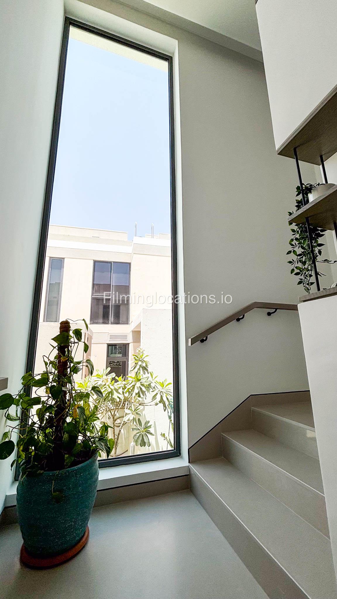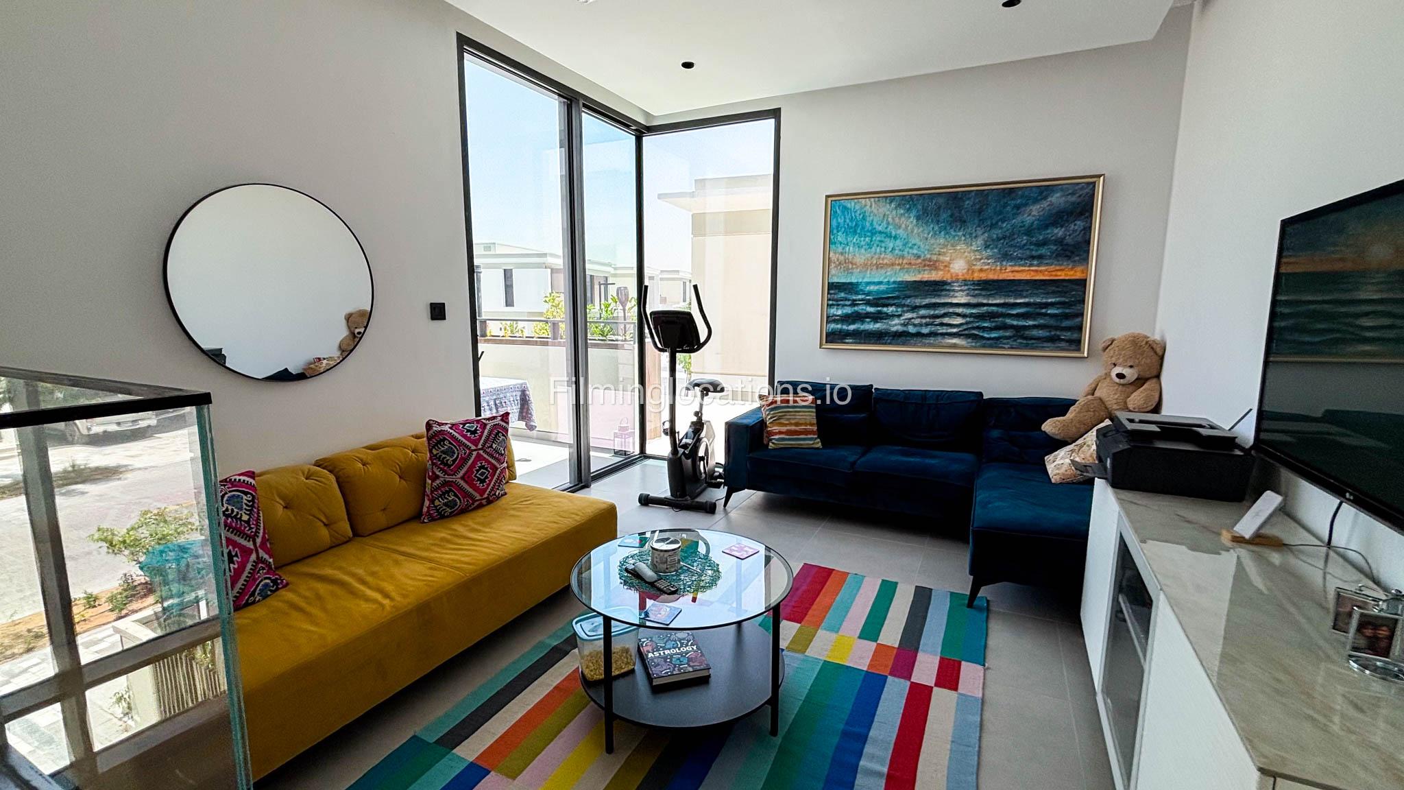 Our stylish 4-bedroom villa offers a versatile setting ideal for filming. The main living room is a spacious, well-lit area featuring modern ceiling lights, colorful seating arranged around a TV, striking wall paintings, and large window walls. A cozy dining area and an open kitchen are seamlessly integrated into the space. The hallway boasts tall ceilings and artistic wall décor, leading to the downstairs living room, bedroom, and kitchen. A staircase with expansive windows takes you to the upper floor, where a 2nd living room awaits with window walls, a cozy sofa setup, a TV, and a piano, along with a small pantry tucked to the side. The upper floor includes 3 bedrooms—1 with a balcony and another with large windows and a dedicated dressing room—while the 4th bedroom is located downstairs. Outdoors, the villa features a lush garden with a serene white Buddha statue as its centerpiece, complemented by a BBQ corner and cozy seating, offering a perfect backdrop for creative productions.