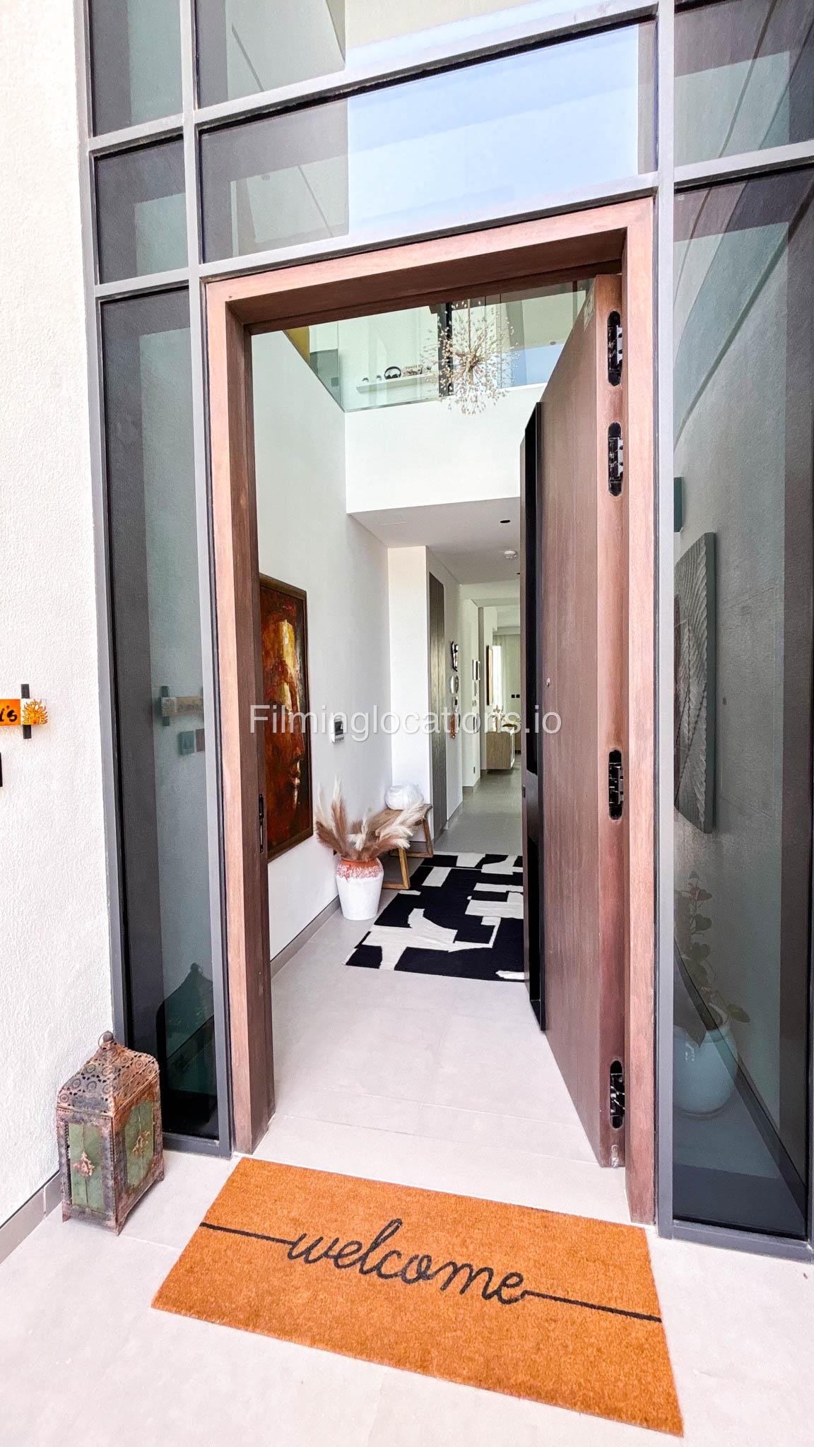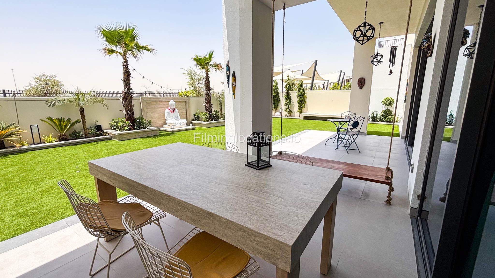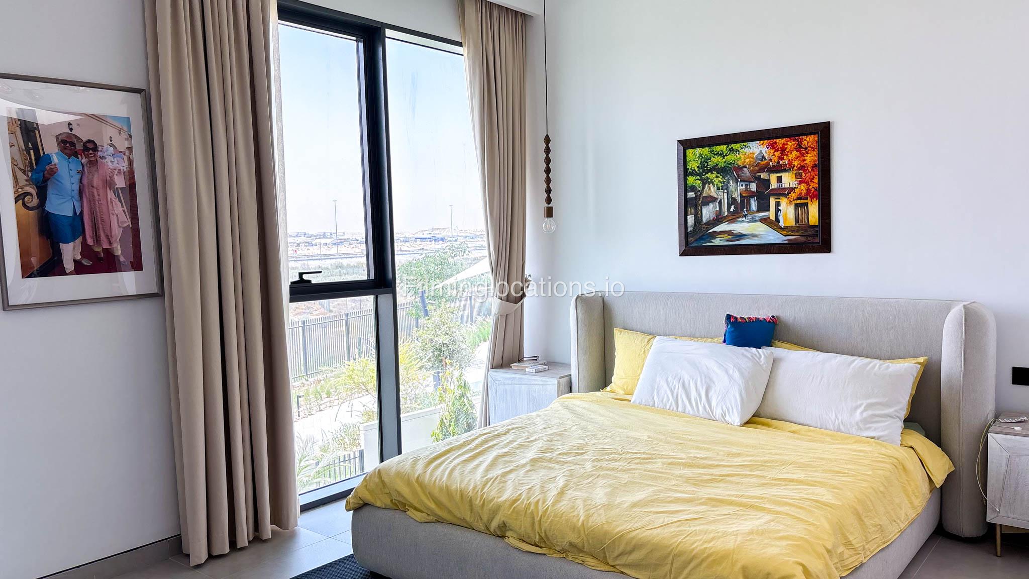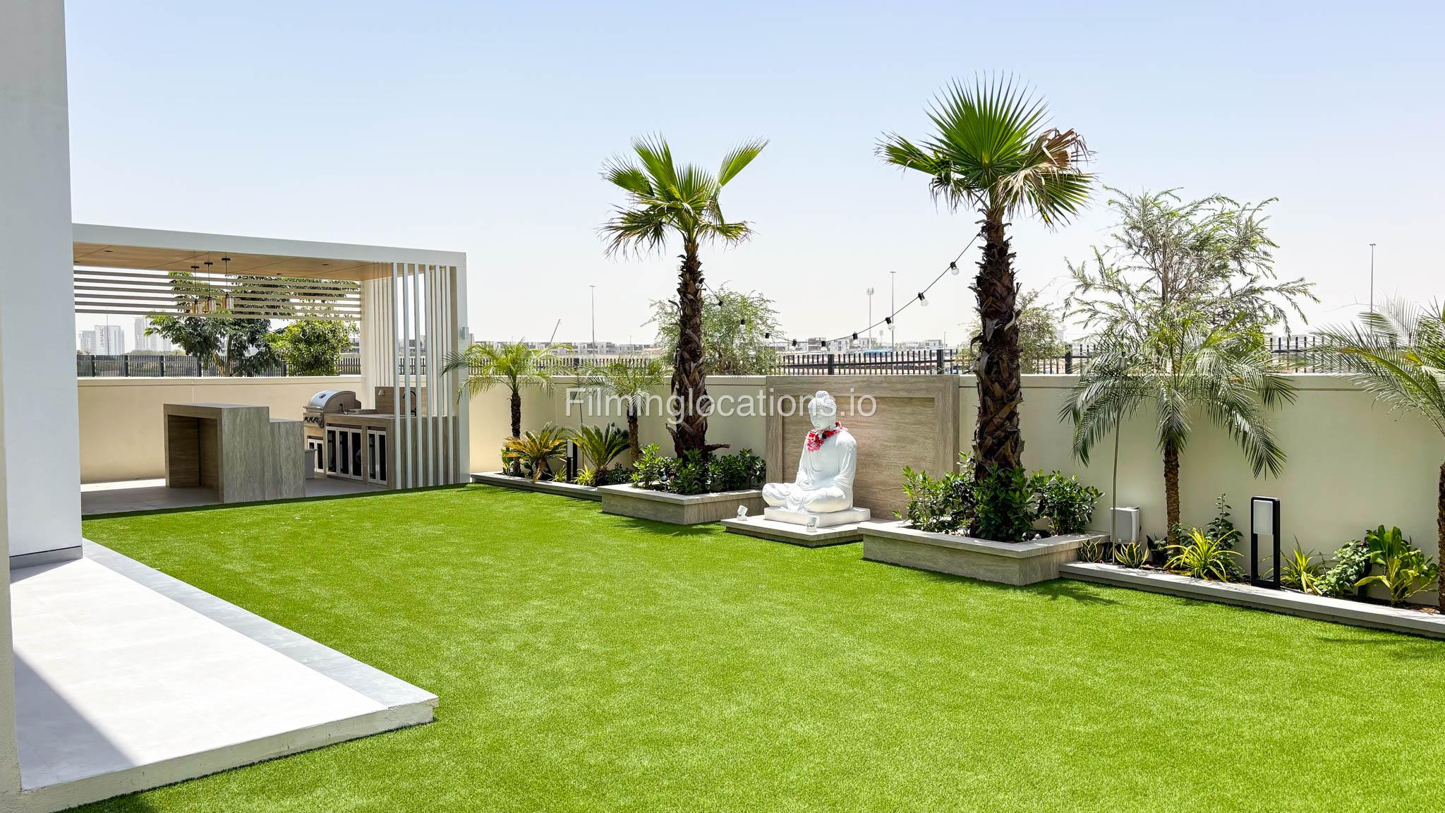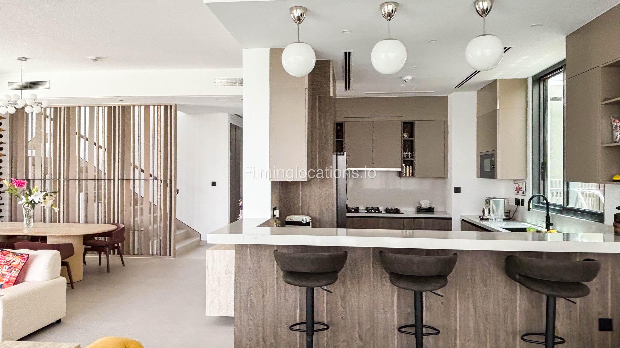 Our stylish 4-bedroom villa offers a versatile setting ideal for filming. The main living room is a spacious, well-lit area featuring modern ceiling lights, colorful seating arranged around a TV, striking wall paintings, and large window walls. A cozy dining area and an open kitchen are seamlessly integrated into the space. The hallway boasts tall ceilings and artistic wall décor, leading to the downstairs living room, bedroom, and kitchen. A staircase with expansive windows takes you to the upper floor, where a 2nd living room awaits with window walls, a cozy sofa setup, a TV, and a piano, along with a small pantry tucked to the side. The upper floor includes 3 bedrooms—1 with a balcony and another with large windows and a dedicated dressing room—while the 4th bedroom is located downstairs. Outdoors, the villa features a lush garden with a serene white Buddha statue as its centerpiece, complemented by a BBQ corner and cozy seating, offering a perfect backdrop for creative productions.