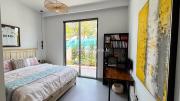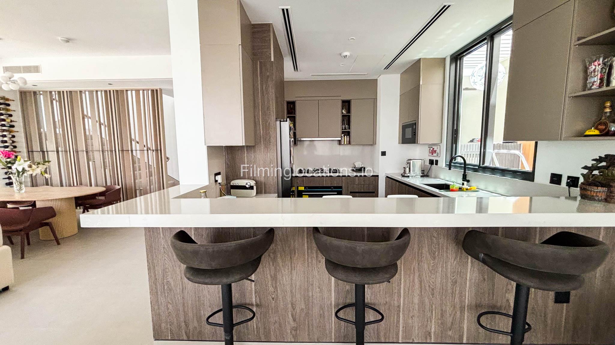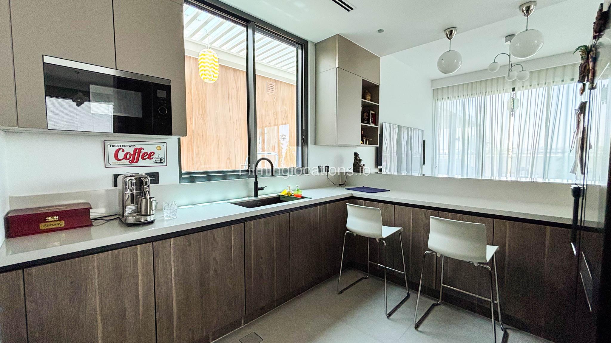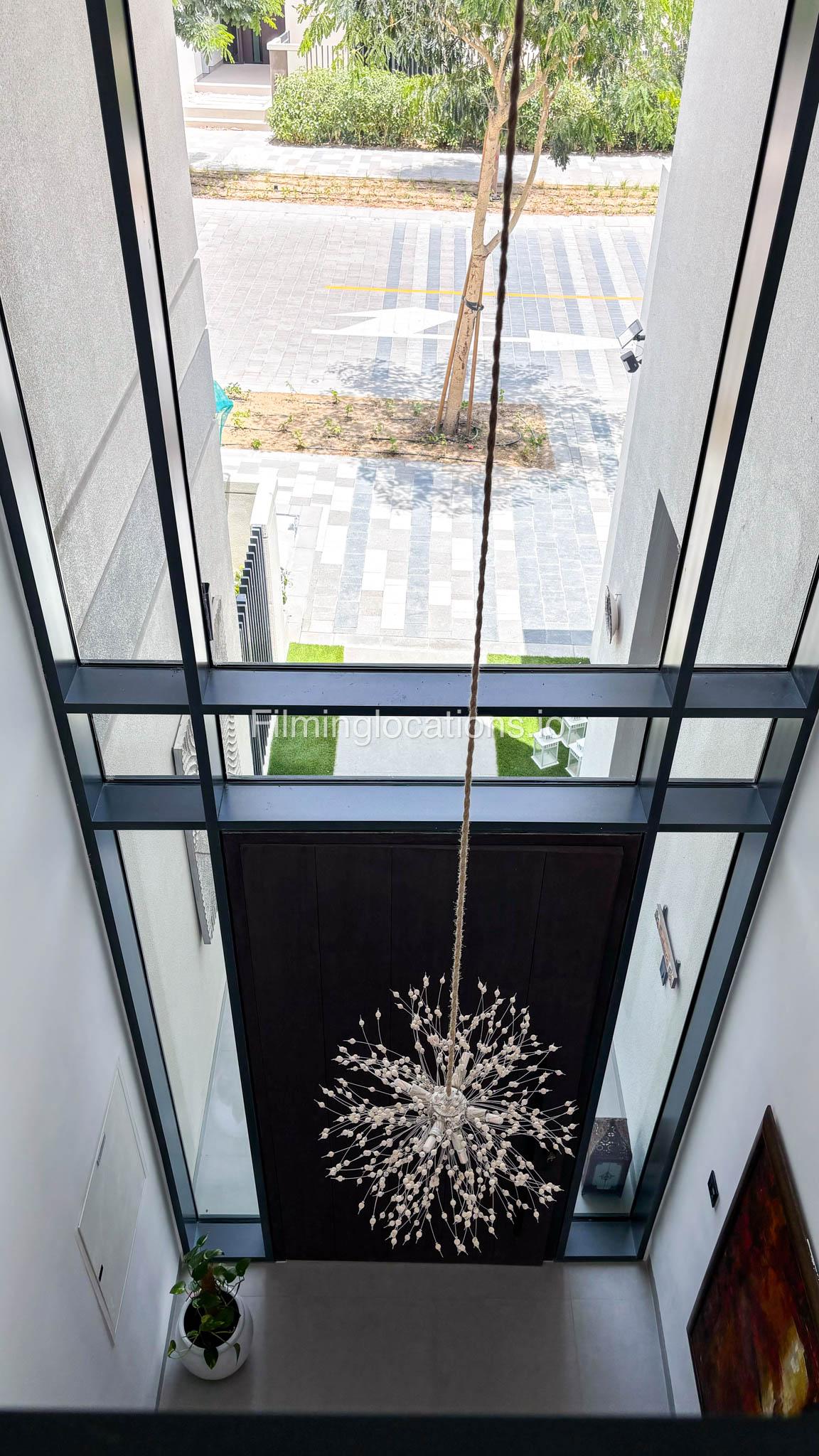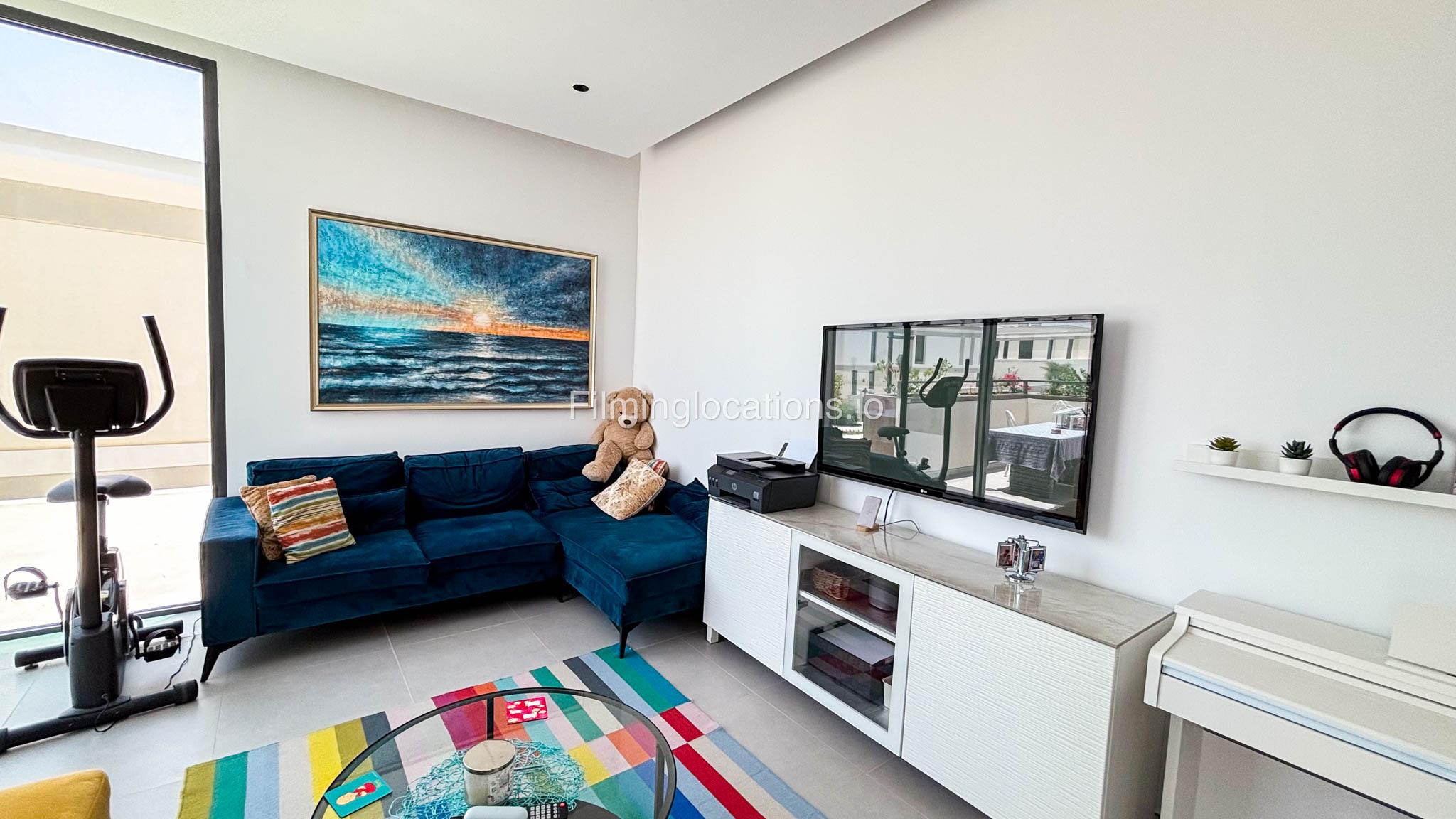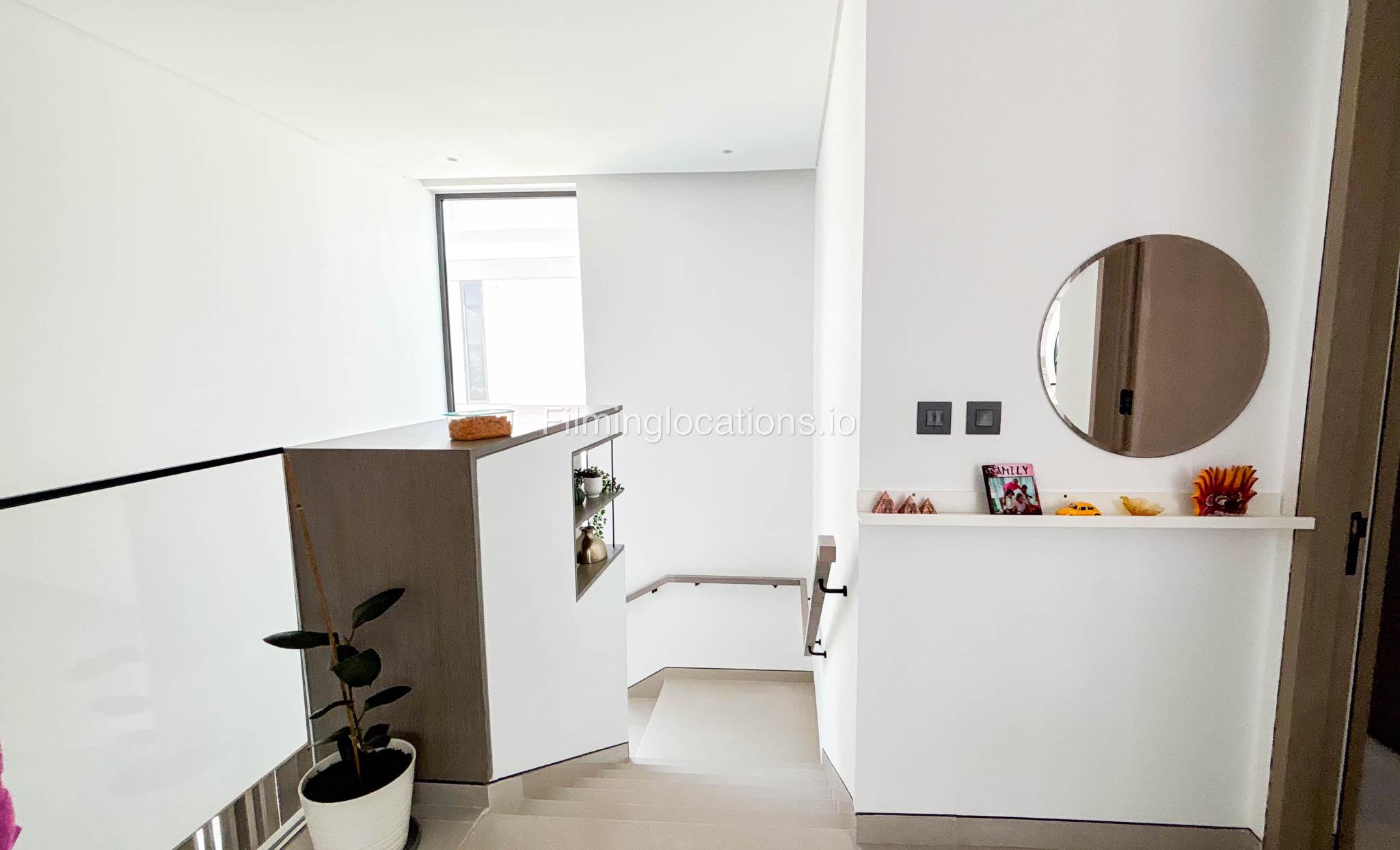 Our stylish 4-bedroom villa offers a versatile setting ideal for filming. The main living room is a spacious, well-lit area featuring modern ceiling lights, colorful seating arranged around a TV, striking wall paintings, and large window walls. A cozy dining area and an open kitchen are seamlessly integrated into the space. The hallway boasts tall ceilings and artistic wall décor, leading to the downstairs living room, bedroom, and kitchen. A staircase with expansive windows takes you to the upper floor, where a 2nd living room awaits with window walls, a cozy sofa setup, a TV, and a piano, along with a small pantry tucked to the side. The upper floor includes 3 bedrooms—1 with a balcony and another with large windows and a dedicated dressing room—while the 4th bedroom is located downstairs. Outdoors, the villa features a lush garden with a serene white Buddha statue as its centerpiece, complemented by a BBQ corner and cozy seating, offering a perfect backdrop for creative productions.