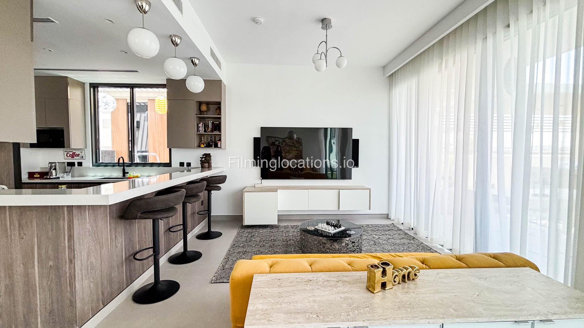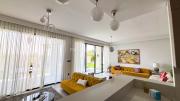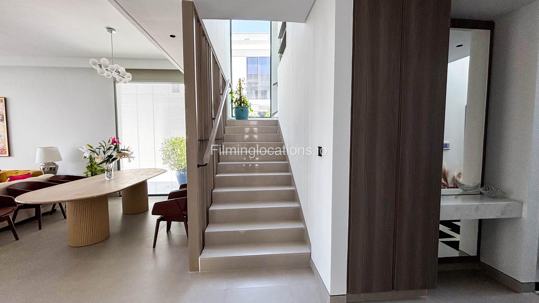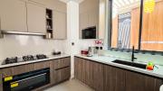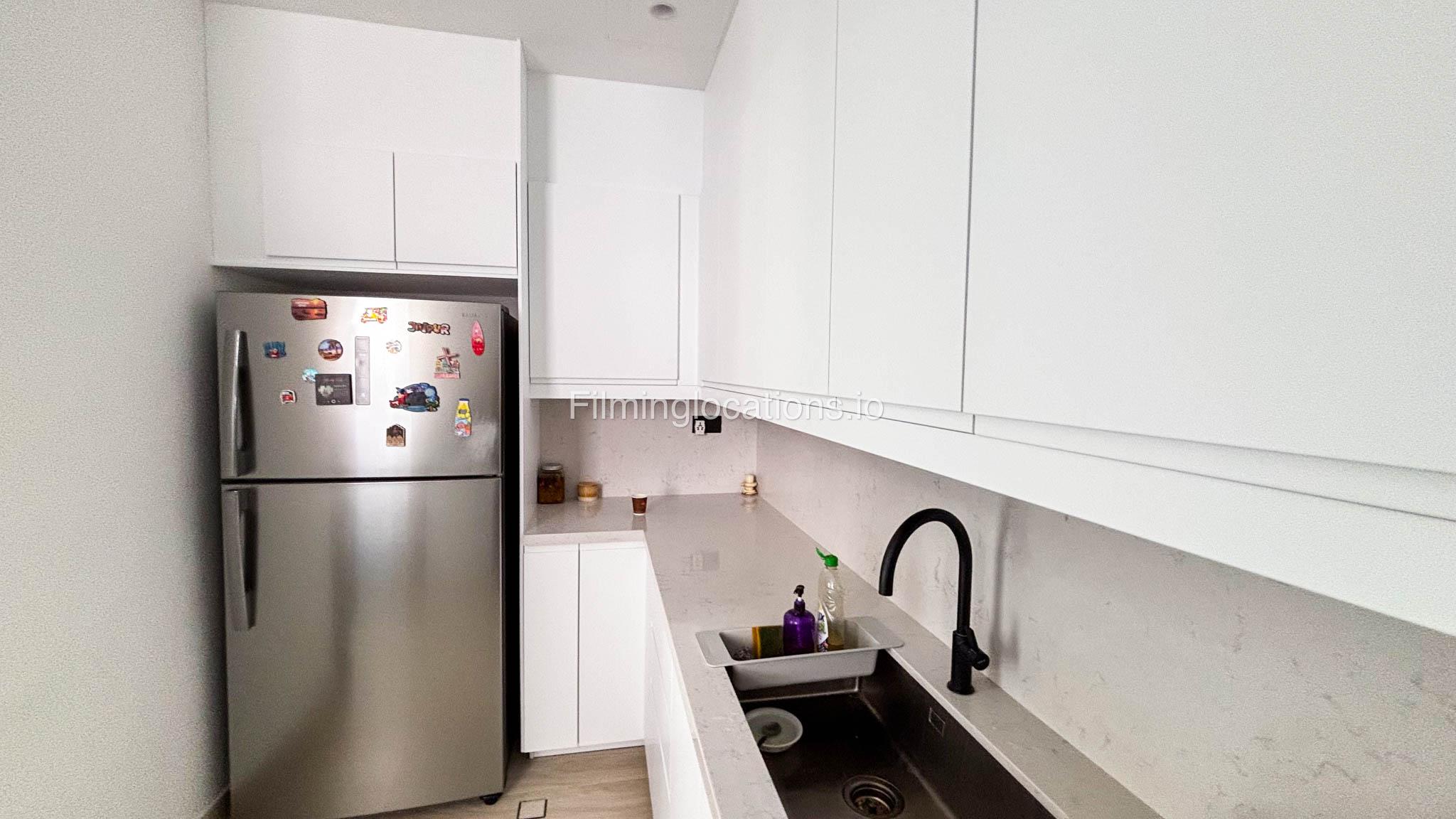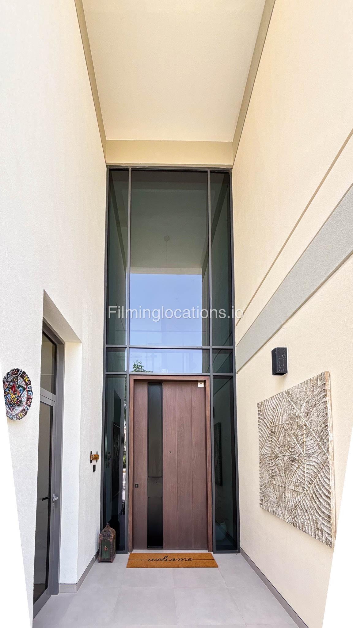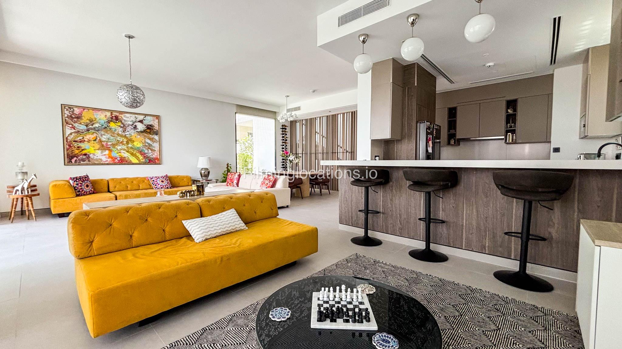 Our stylish 4-bedroom villa offers a versatile setting ideal for filming. The main living room is a spacious, well-lit area featuring modern ceiling lights, colorful seating arranged around a TV, striking wall paintings, and large window walls. A cozy dining area and an open kitchen are seamlessly integrated into the space. The hallway boasts tall ceilings and artistic wall décor, leading to the downstairs living room, bedroom, and kitchen. A staircase with expansive windows takes you to the upper floor, where a 2nd living room awaits with window walls, a cozy sofa setup, a TV, and a piano, along with a small pantry tucked to the side. The upper floor includes 3 bedrooms—1 with a balcony and another with large windows and a dedicated dressing room—while the 4th bedroom is located downstairs. Outdoors, the villa features a lush garden with a serene white Buddha statue as its centerpiece, complemented by a BBQ corner and cozy seating, offering a perfect backdrop for creative productions.