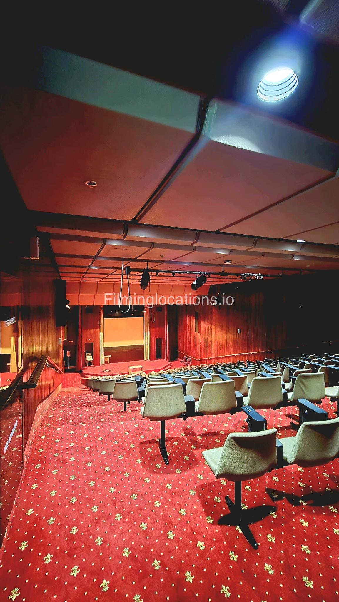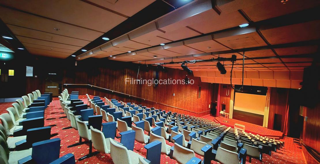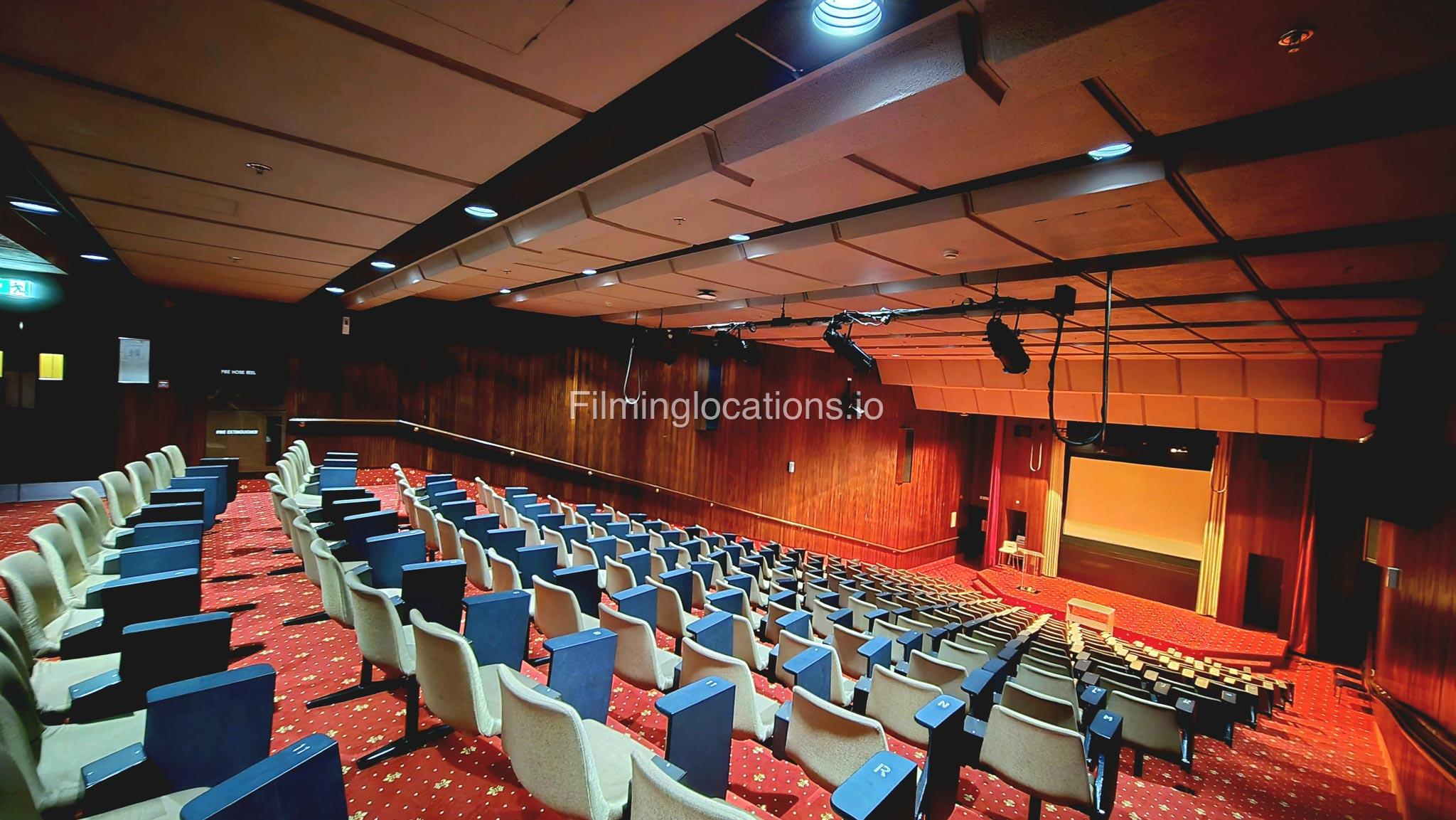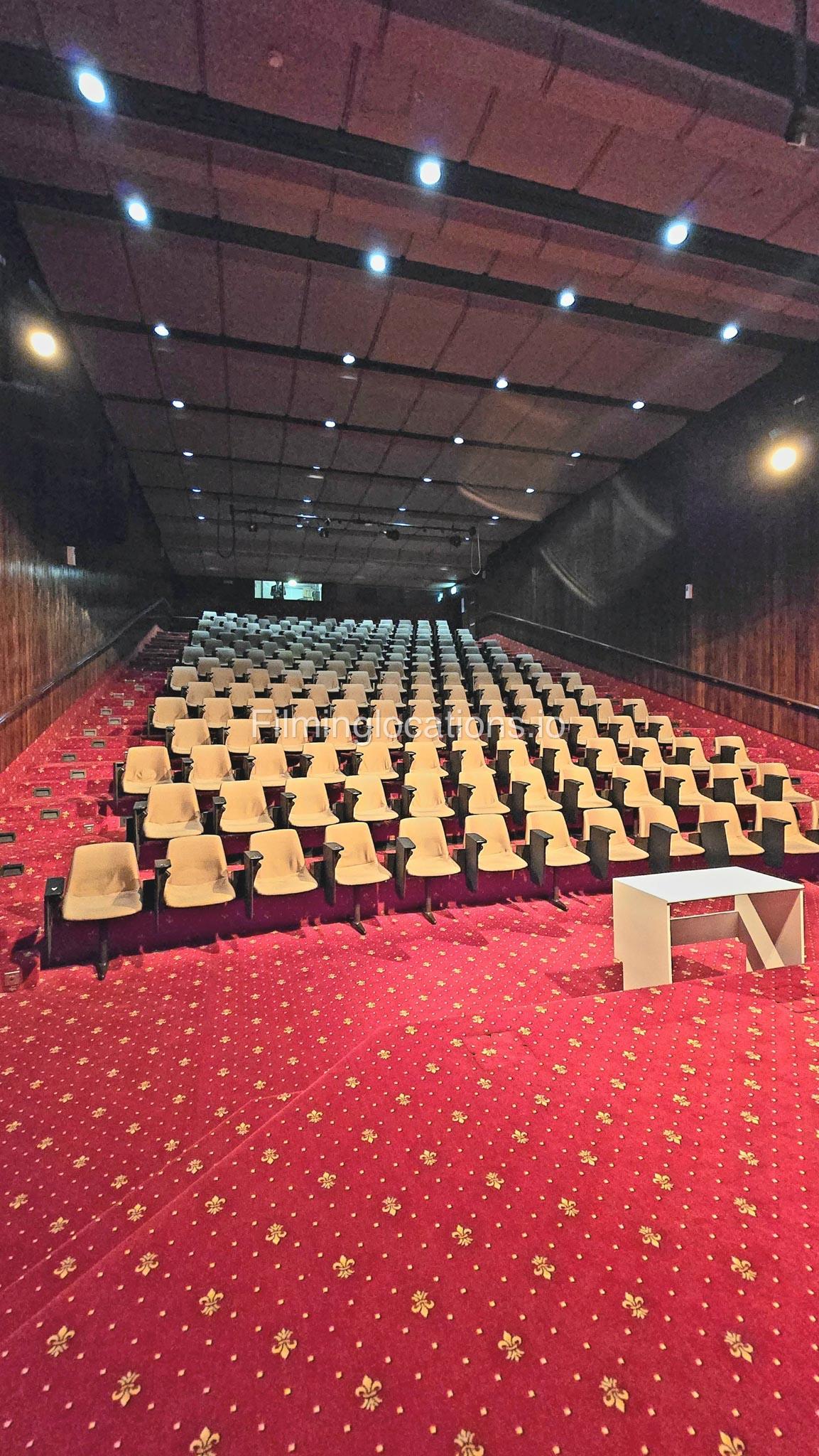 Our vintage-style theatre offers a warm cinematic atmosphere. The space features tiered seating for approximately 200 people with classic fabric-covered chairs, a deep red patterned carpet, and rich wooden wall panels that add depth and character to every frame. A fully equipped stage with professional spotlights and curtains provides an authentic theatrical backdrop, while the soft ambient lighting and acoustically treated ceiling enhance both visuals and sound quality. The intimate layout and nostalgic charm make this venue a versatile and film-ready location for a range of creative productions.