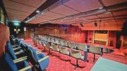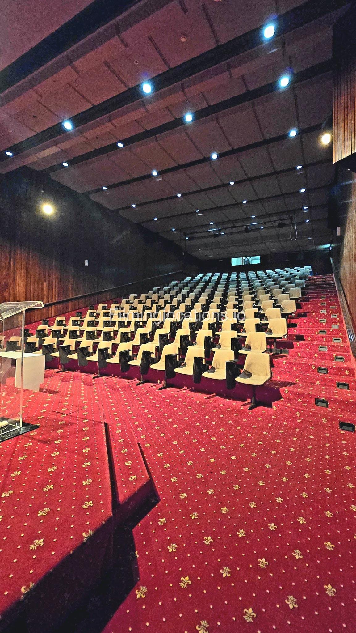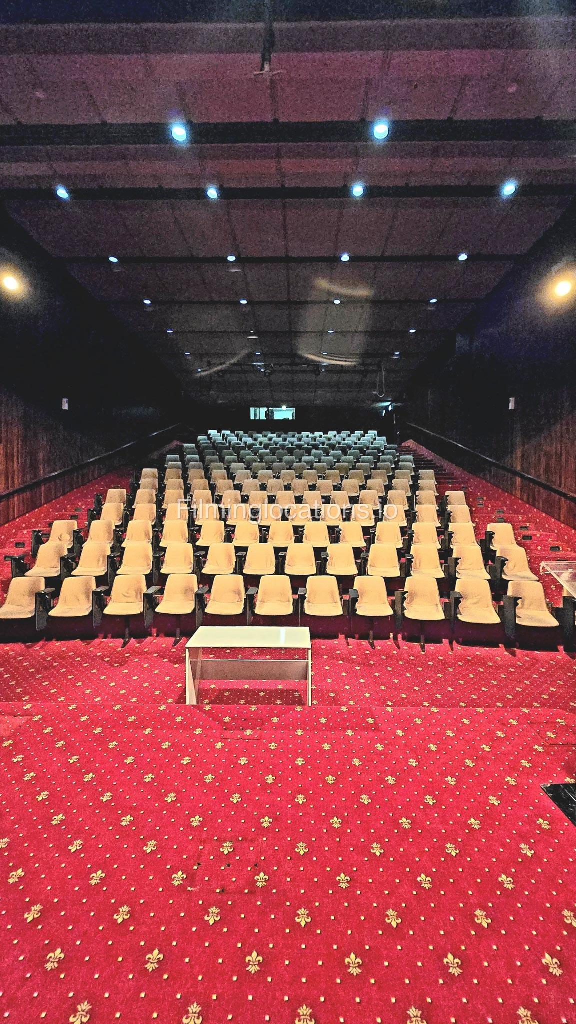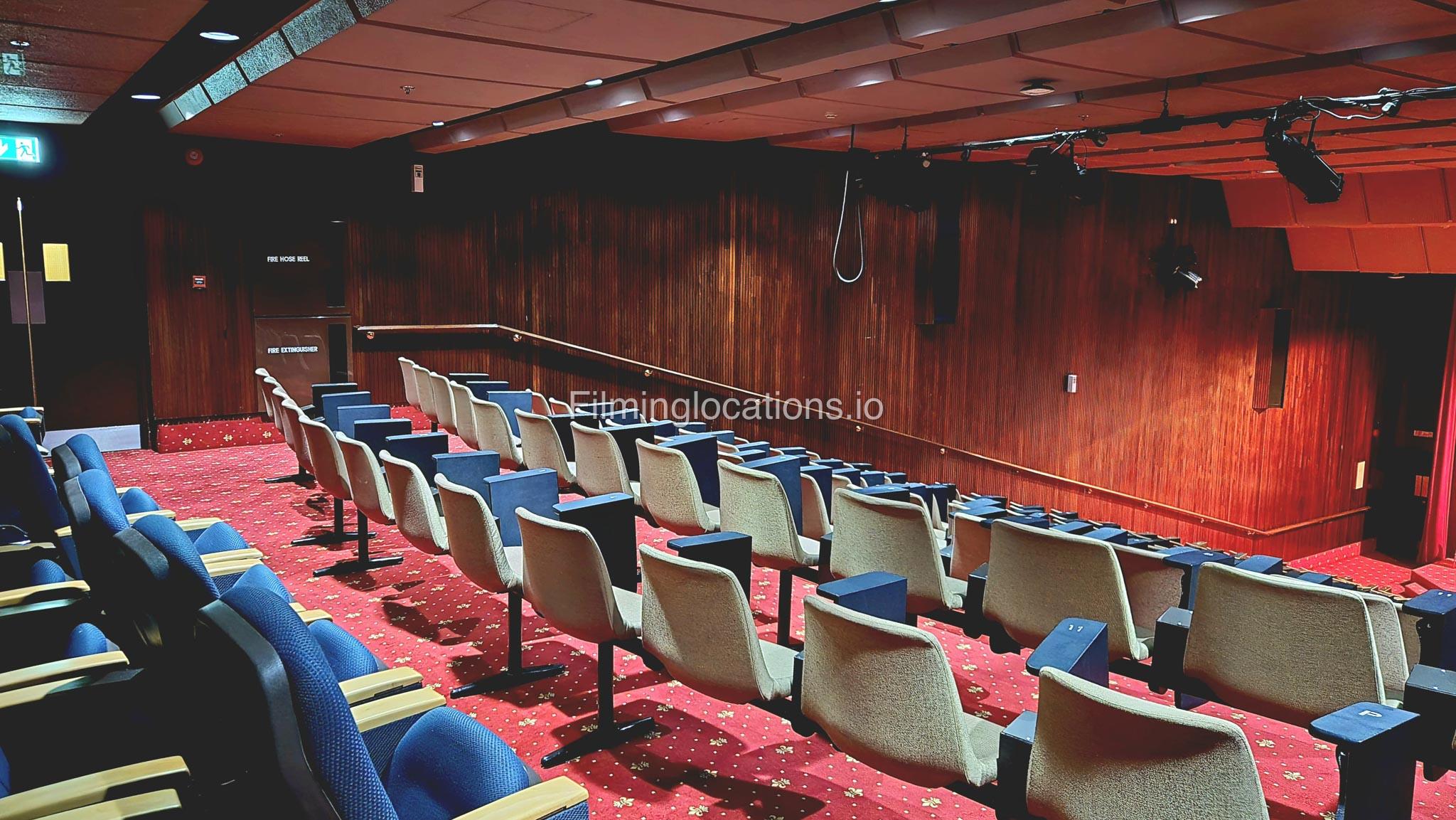Our vintage-style theatre offers a warm cinematic atmosphere. The space features tiered seating for approximately 200 people with classic fabric-covered chairs, a deep red patterned carpet, and rich wooden wall panels that add depth and character to every frame. A fully equipped stage with professional spotlights and curtains provides an authentic theatrical backdrop, while the soft ambient lighting and acoustically treated ceiling enhance both visuals and sound quality. The intimate layout and nostalgic charm make this venue a versatile and film-ready location for a range of creative productions.