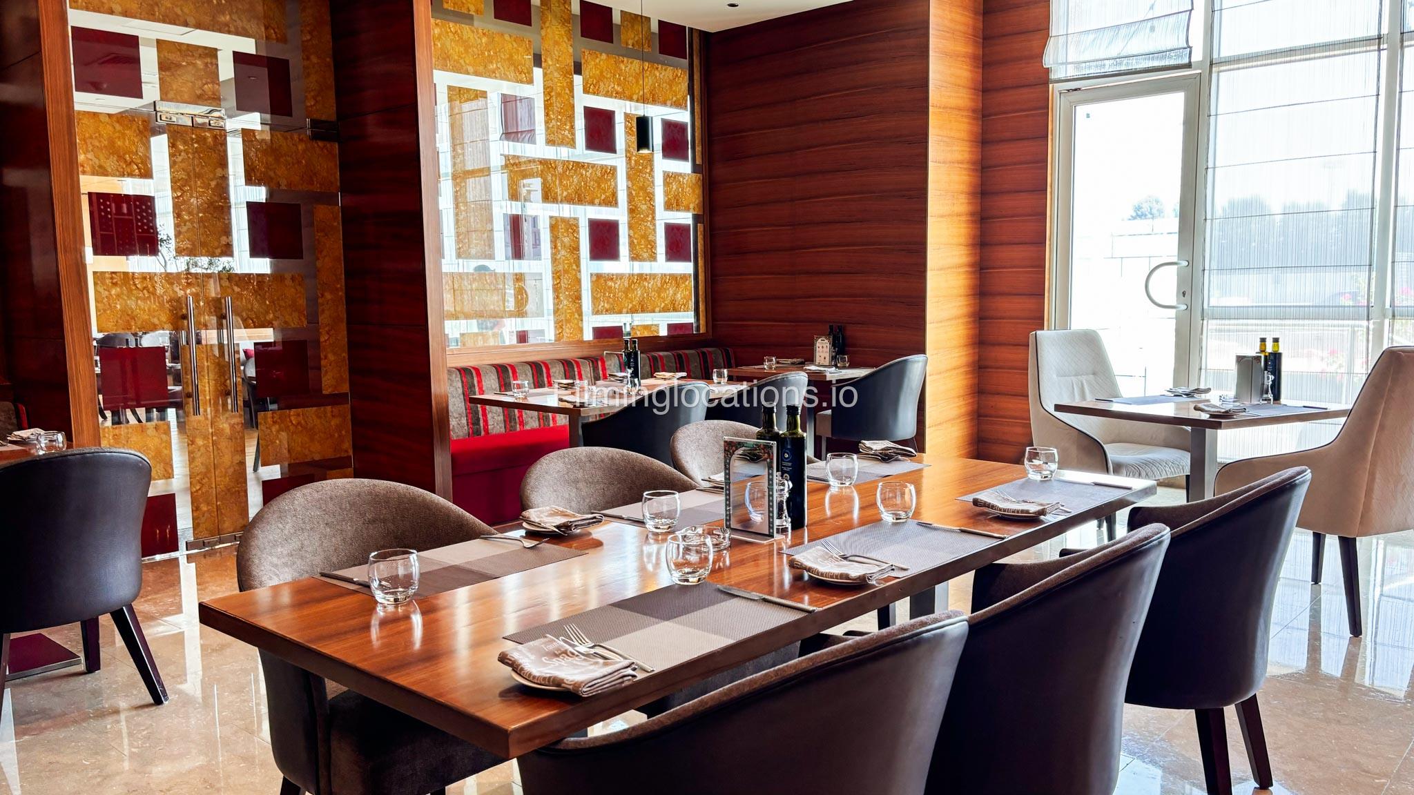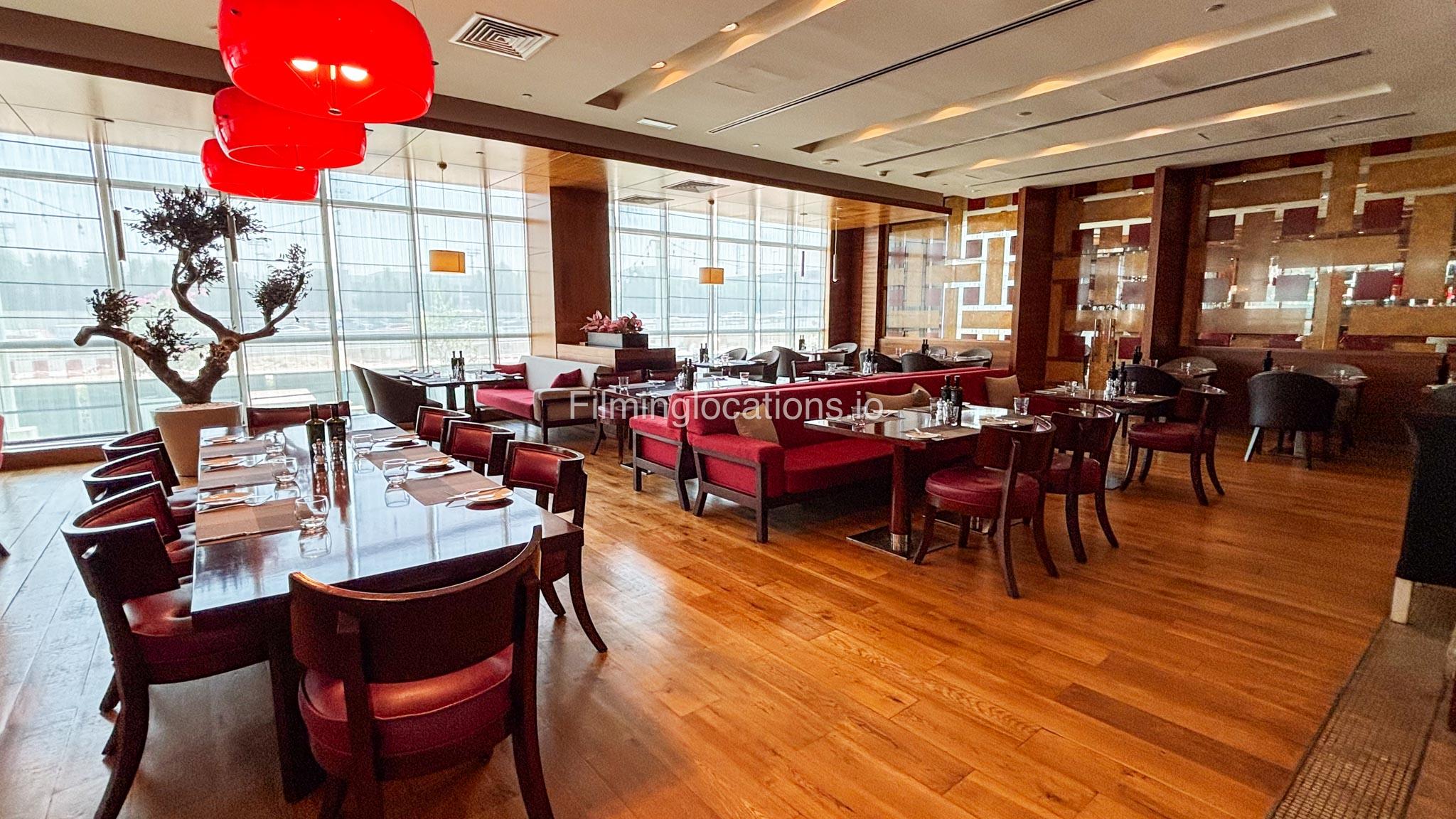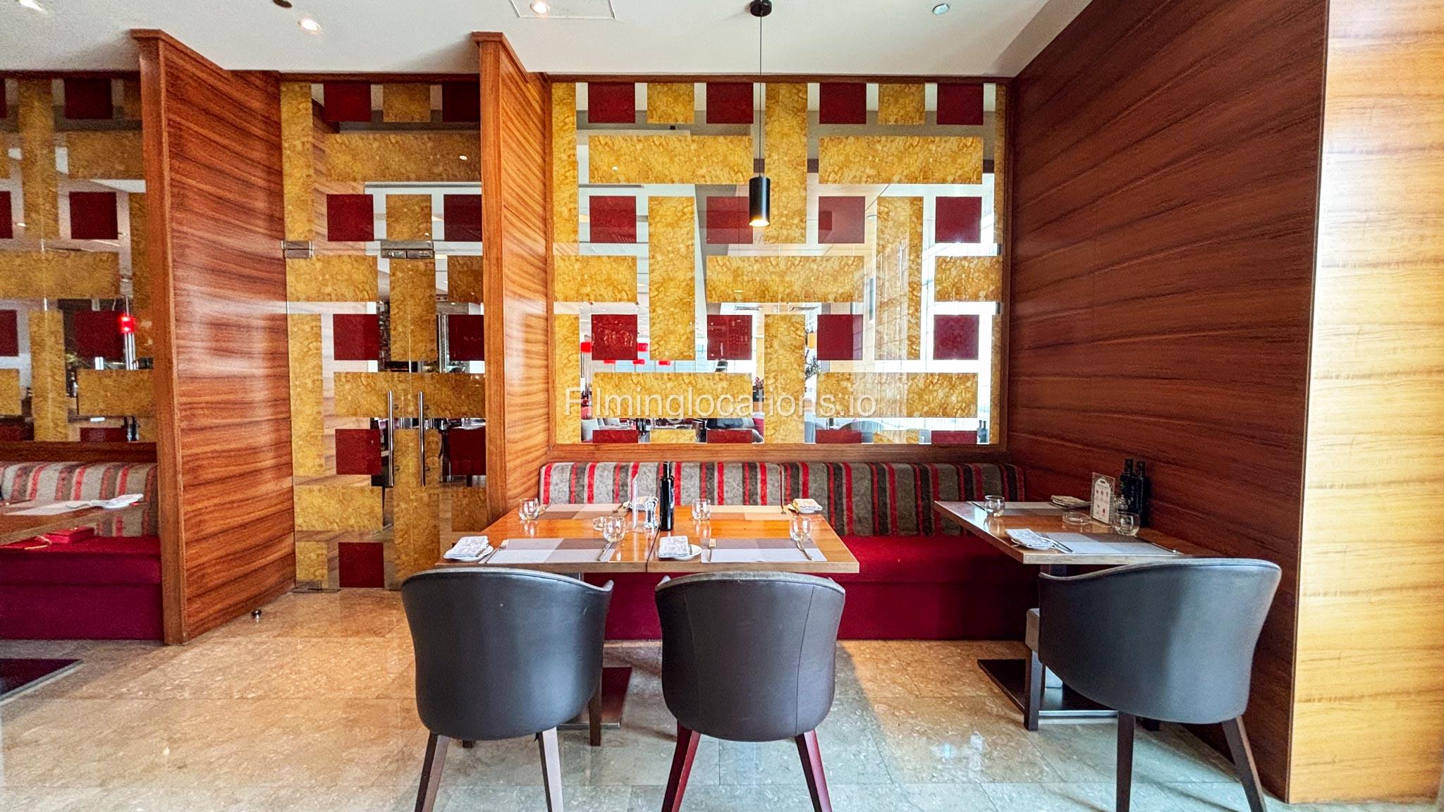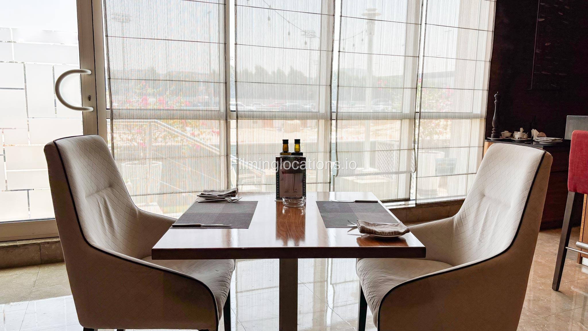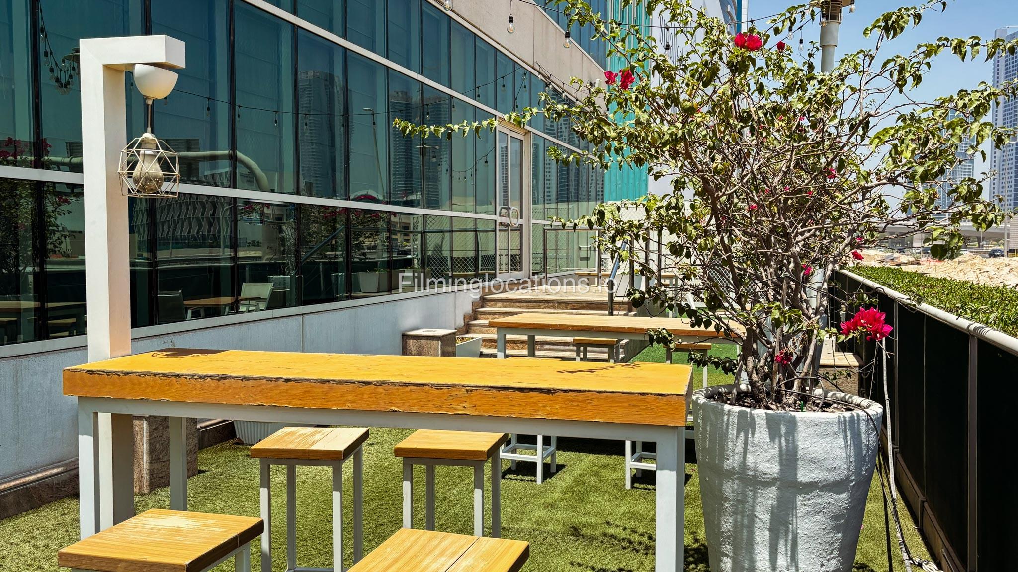 Our classic-style restaurant features an expansive, elegant seating area framed by floor-to-ceiling window walls, allowing for beautiful natural light—ideal for filming. The space includes a sleek modern bar and comfortable booth seating. Outdoors, the venue extends into a charming open-terrace area adorned with lush greenery and vibrant floral accents.