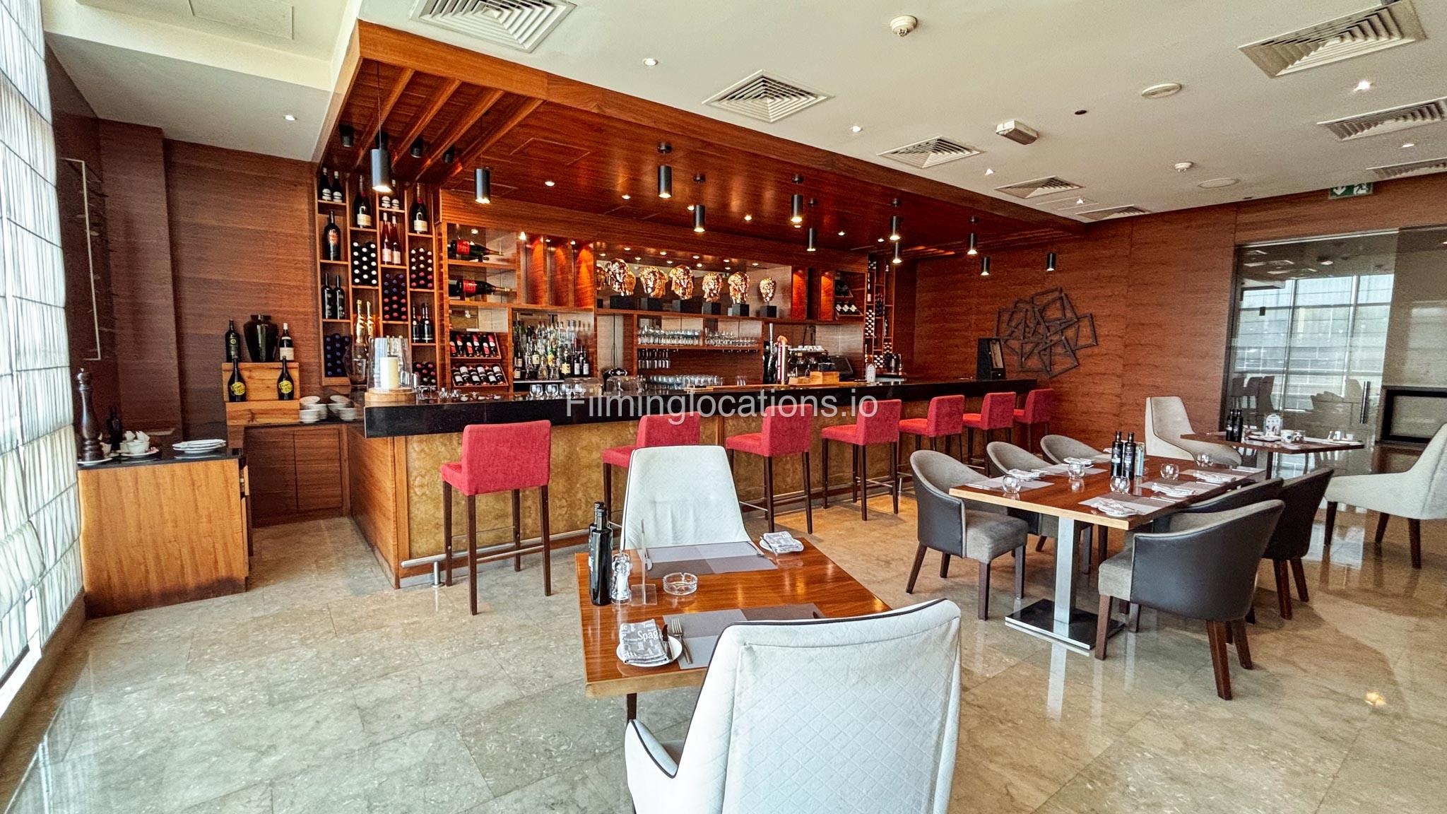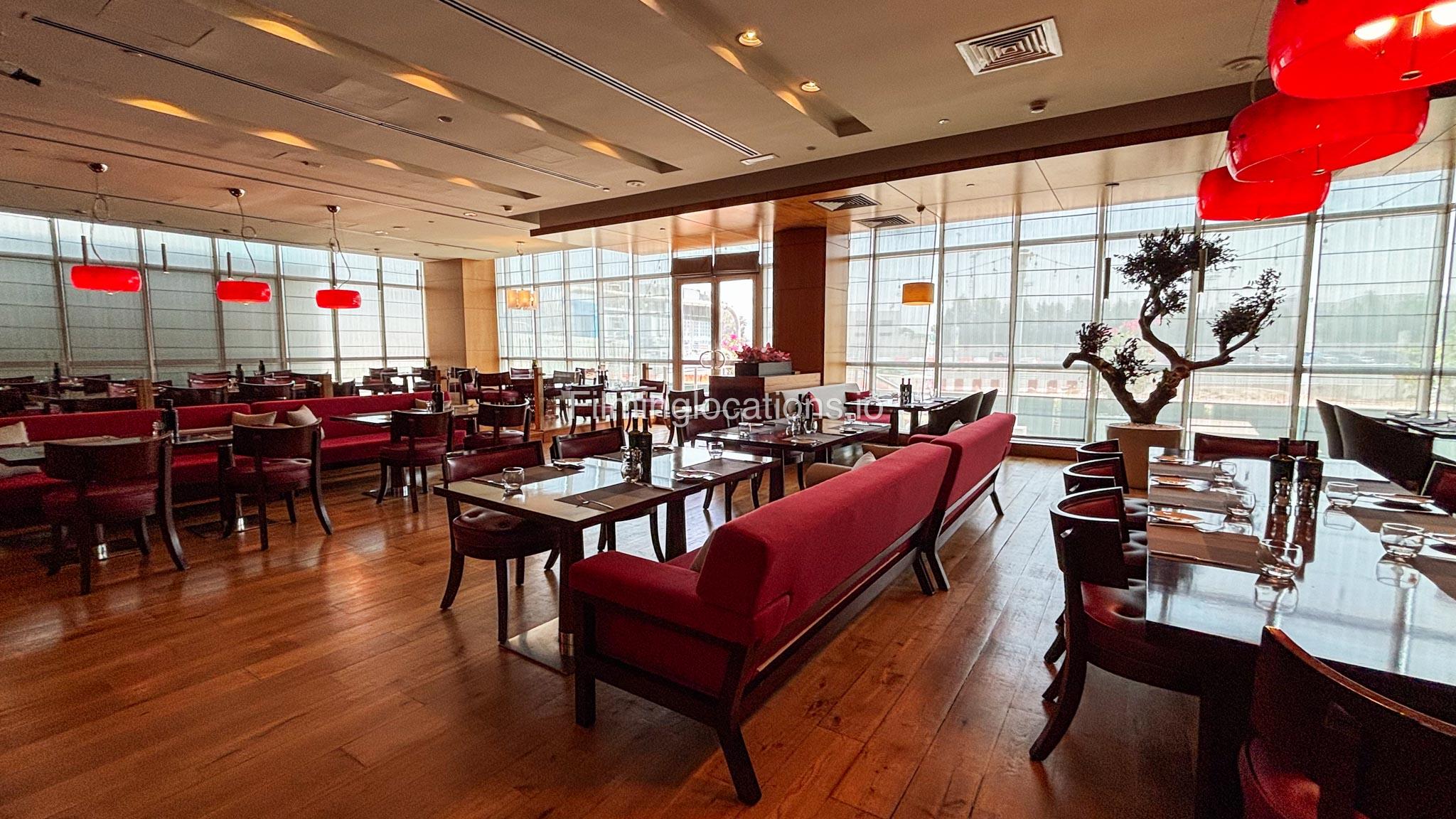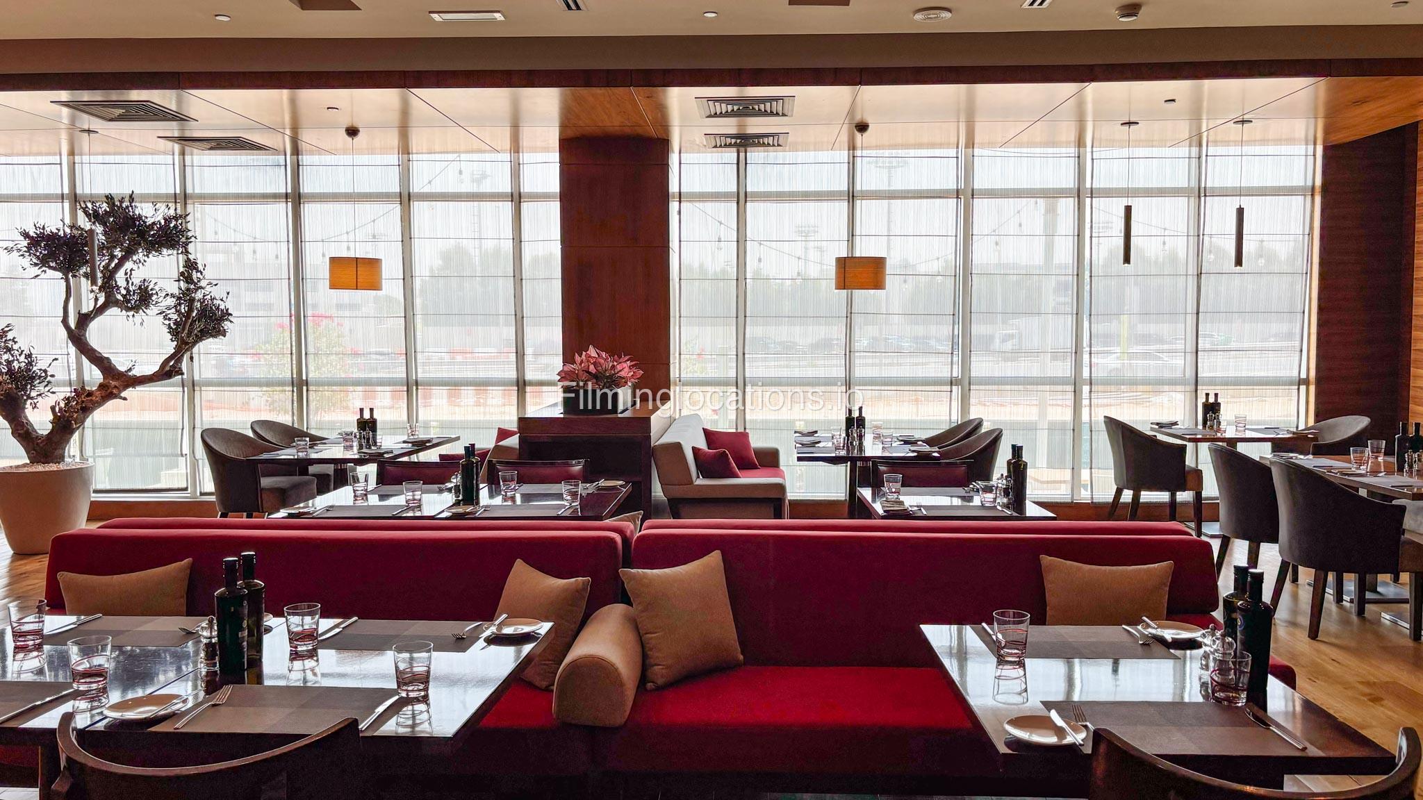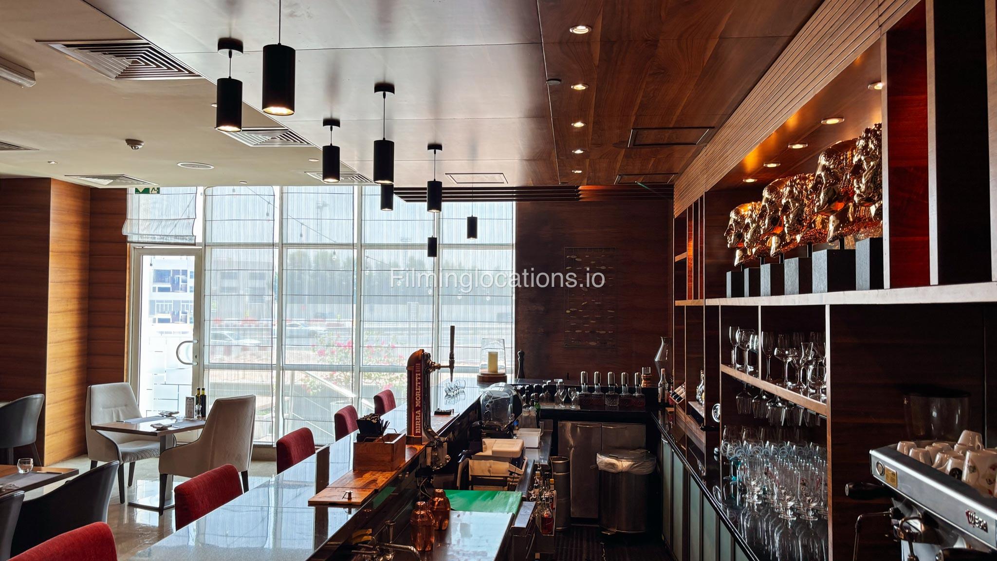 Our classic-style restaurant features an expansive, elegant seating area framed by floor-to-ceiling window walls, allowing for beautiful natural light—ideal for filming. The space includes a sleek modern bar and comfortable booth seating. Outdoors, the venue extends into a charming open-terrace area adorned with lush greenery and vibrant floral accents.