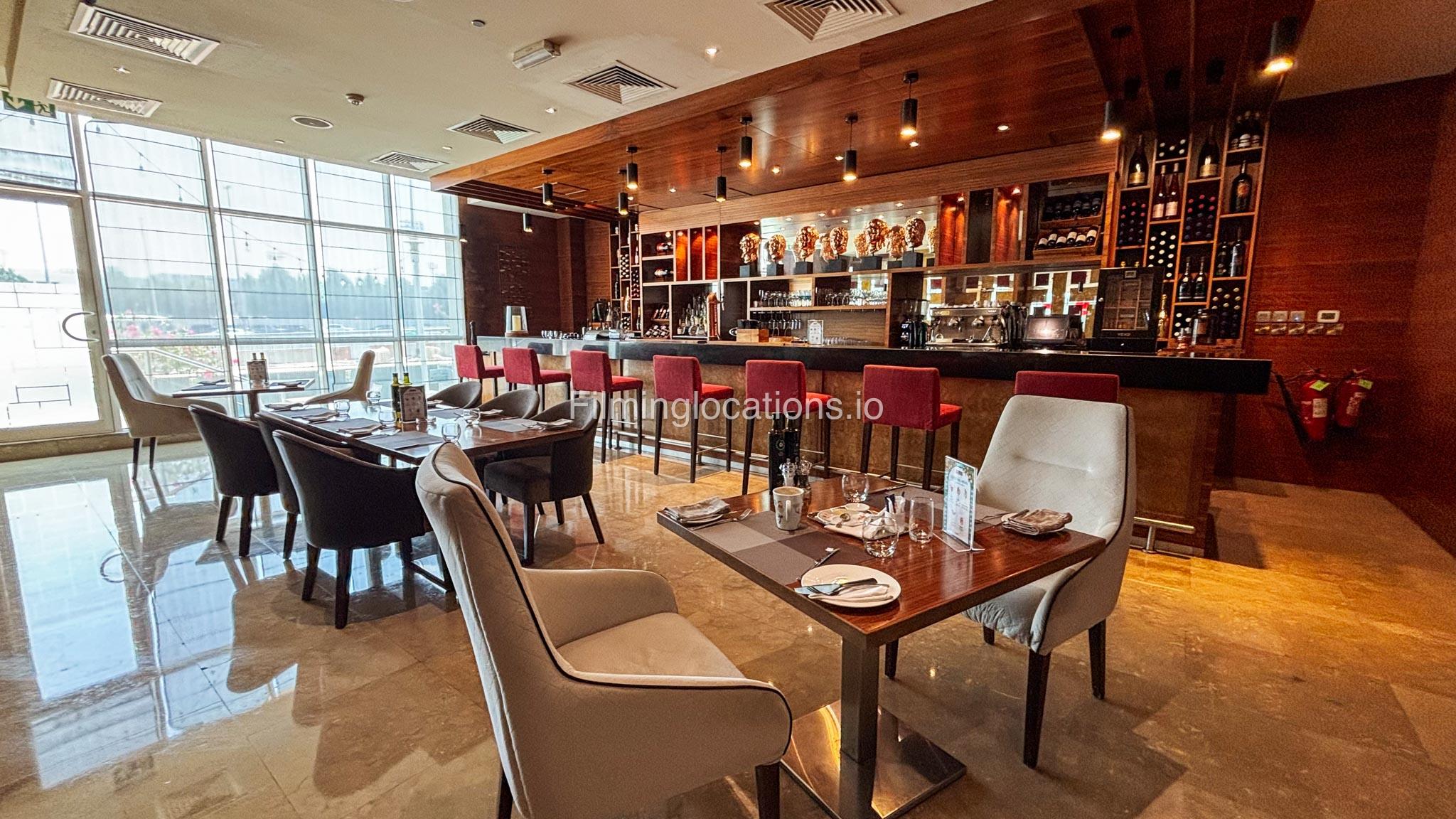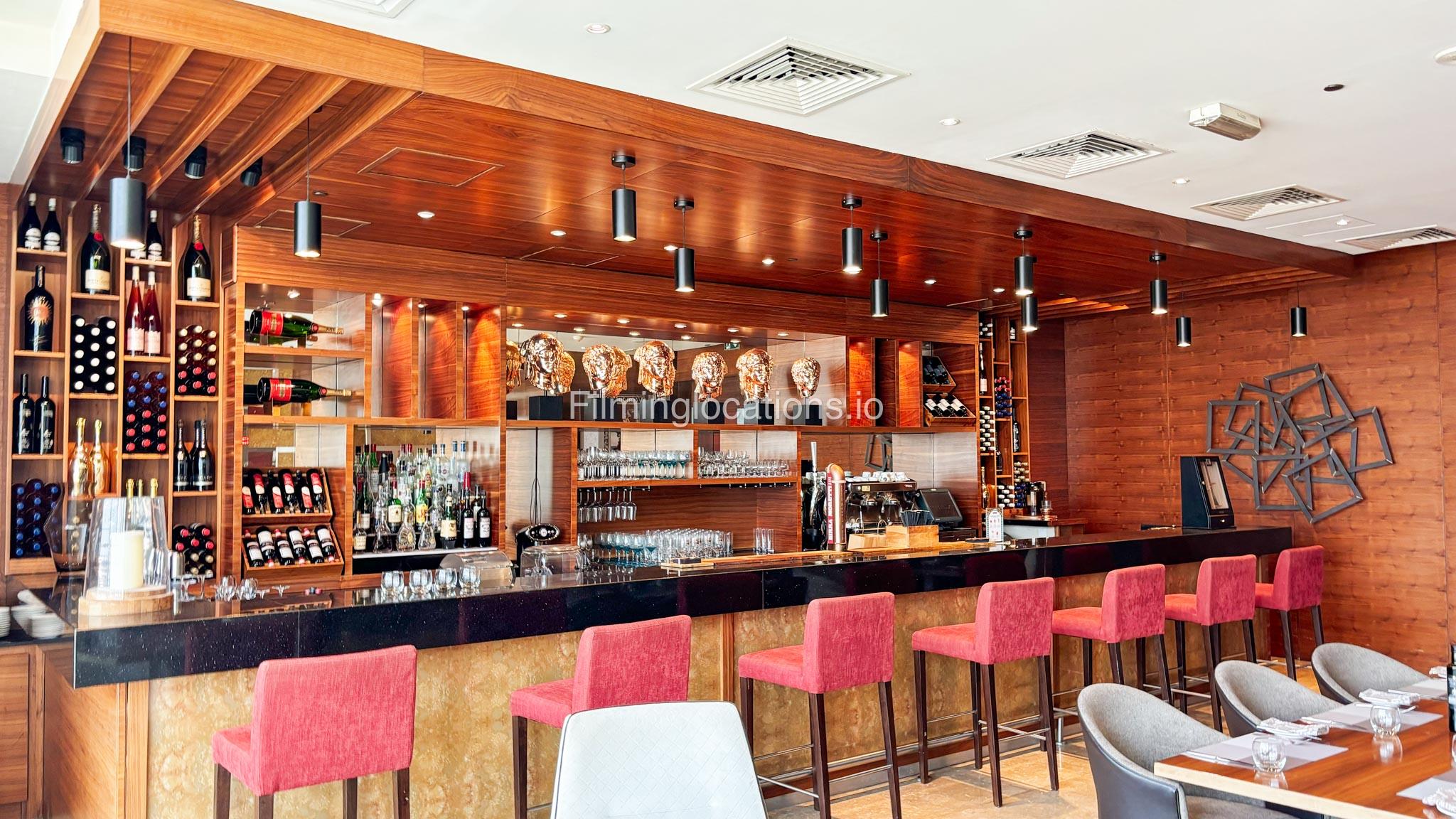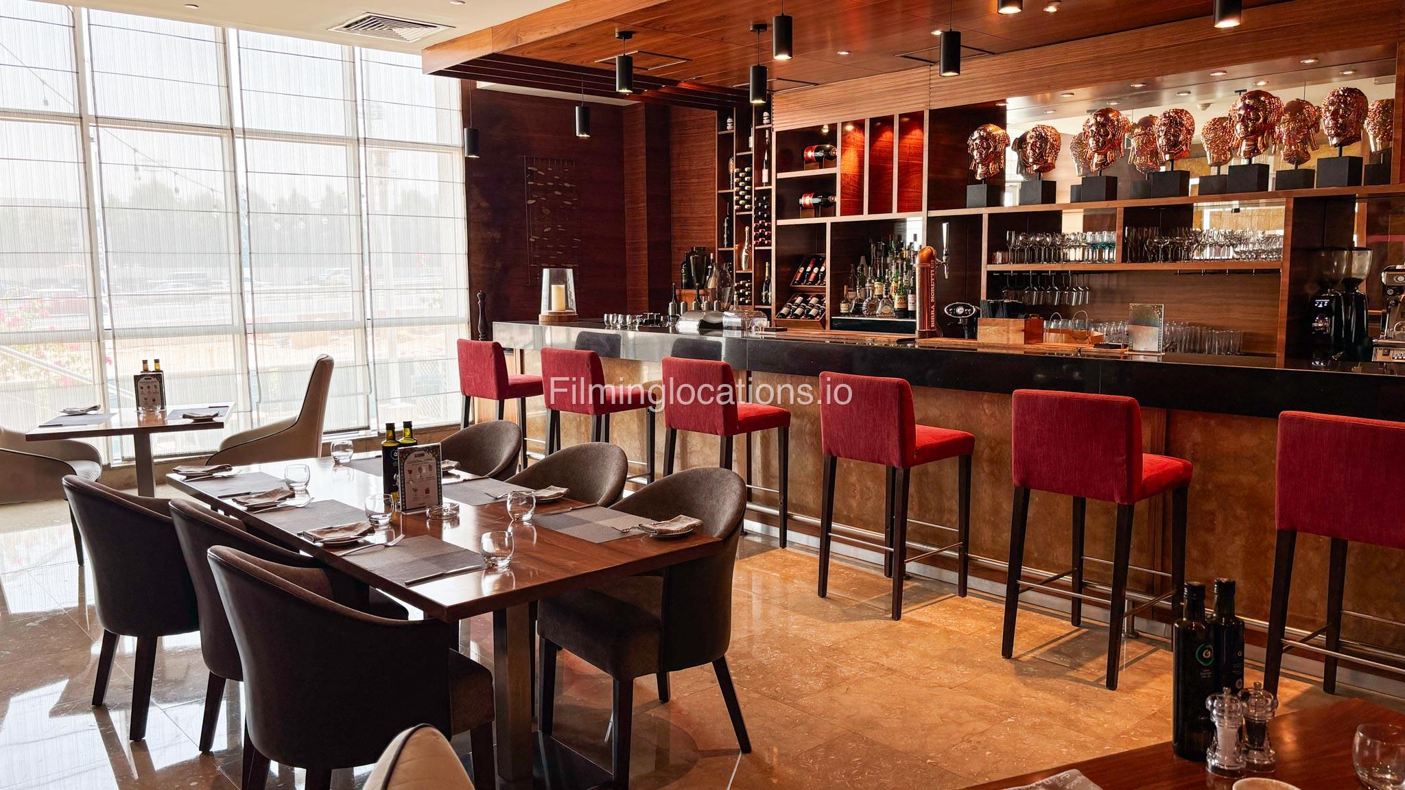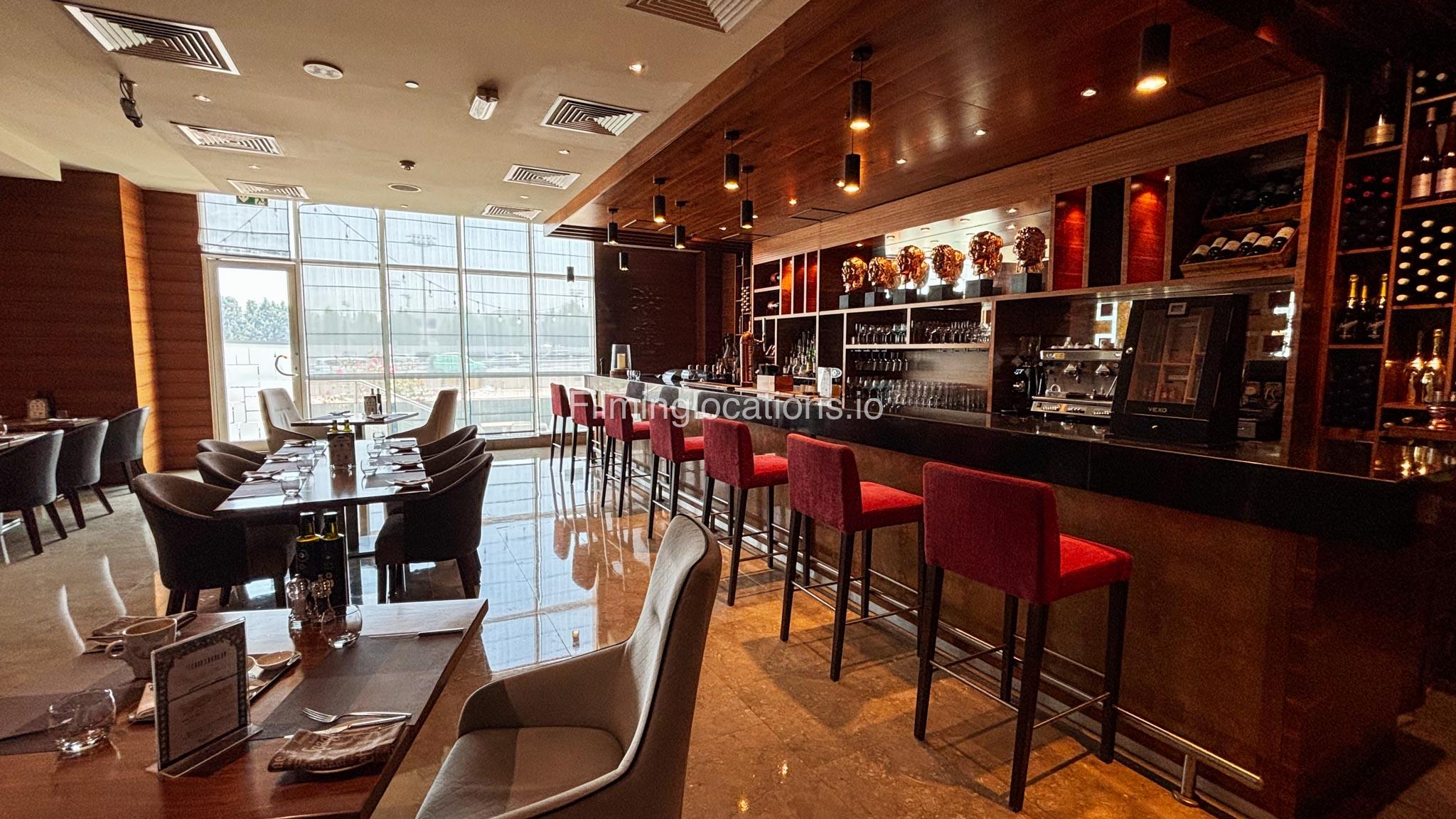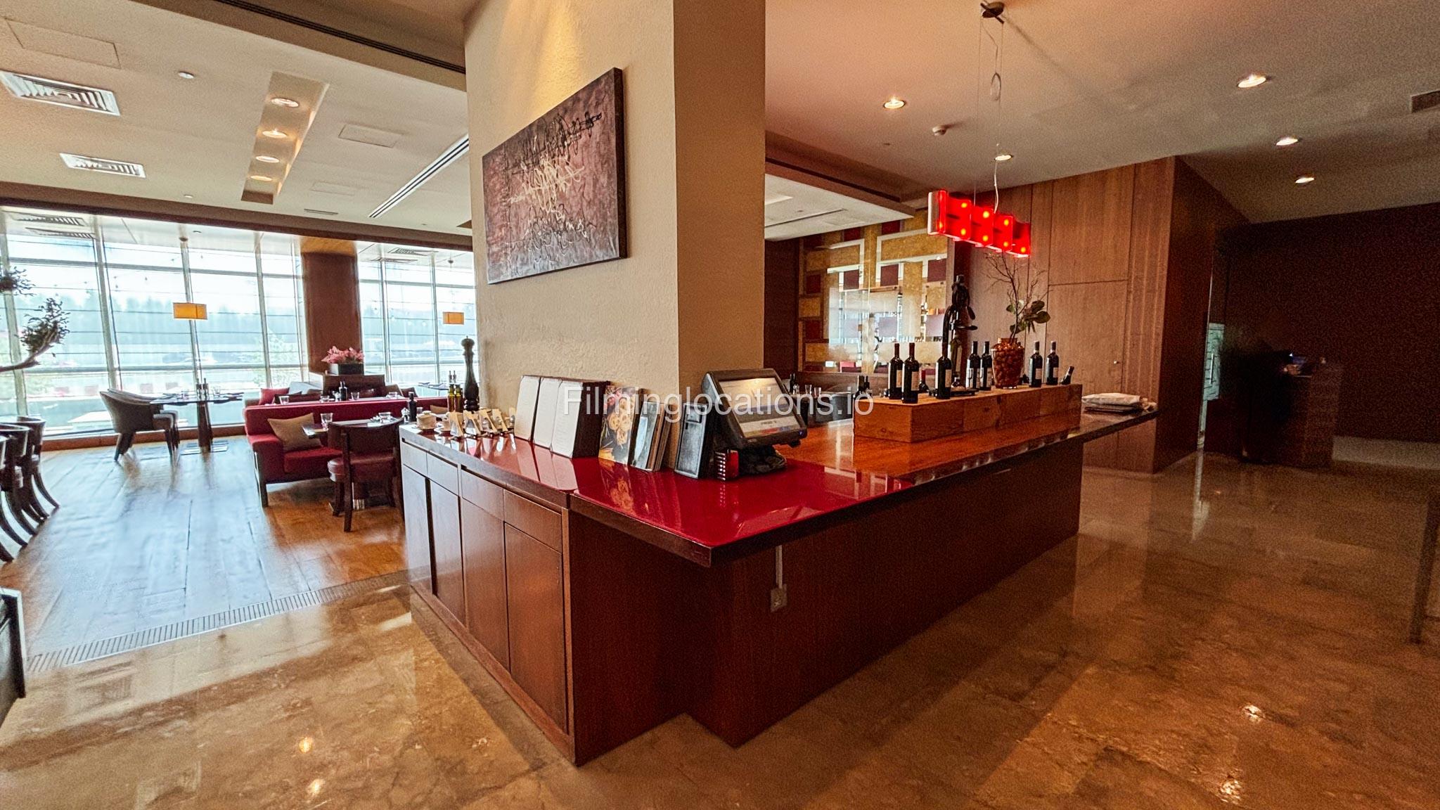 Our classic-style restaurant features an expansive, elegant seating area framed by floor-to-ceiling window walls, allowing for beautiful natural light—ideal for filming. The space includes a sleek modern bar and comfortable booth seating. Outdoors, the venue extends into a charming open-terrace area adorned with lush greenery and vibrant floral accents.