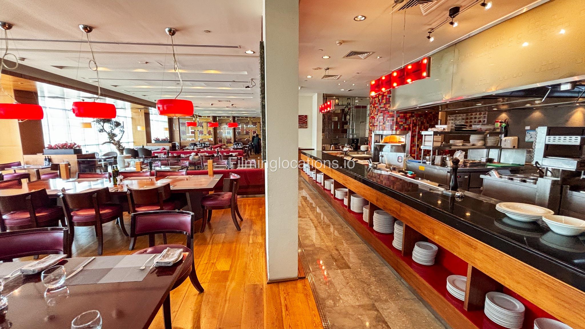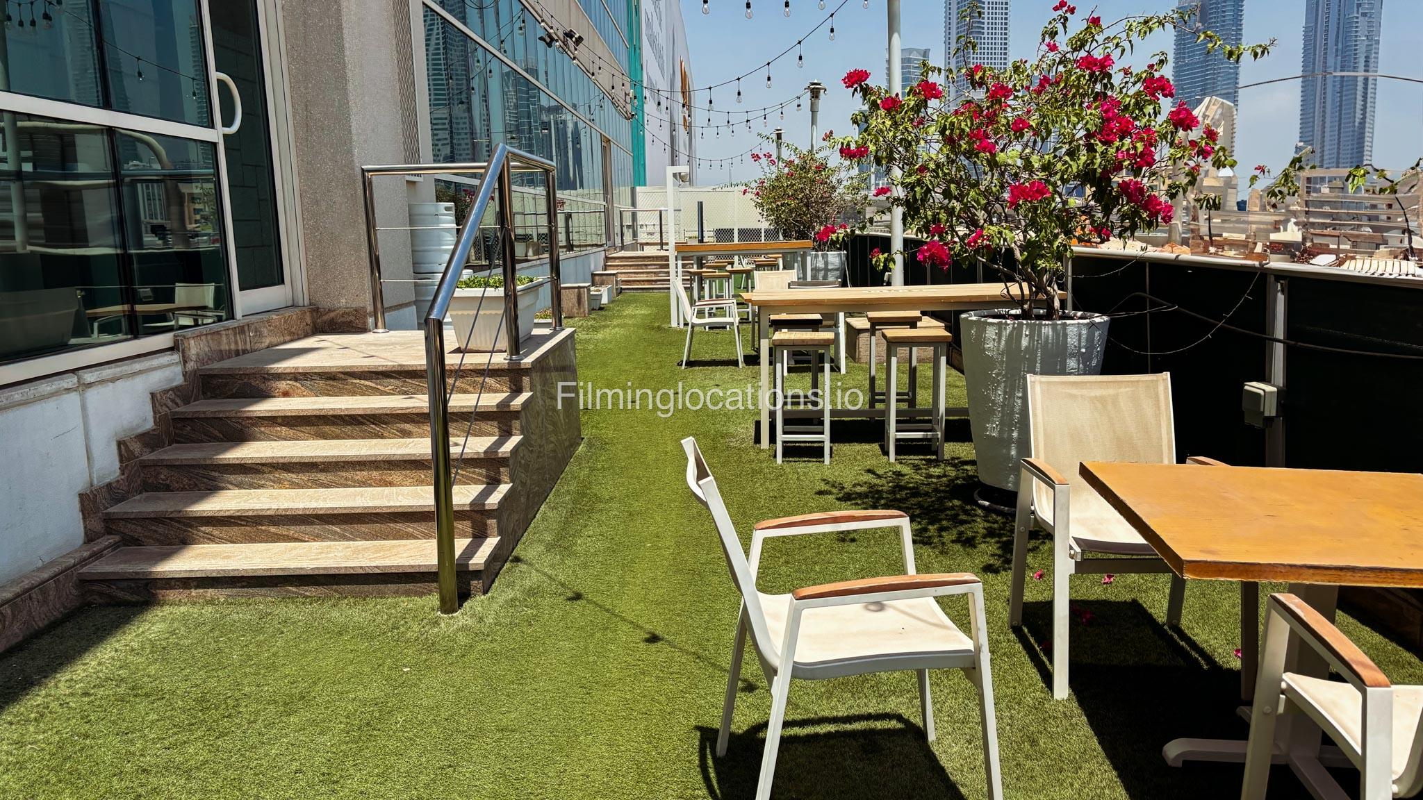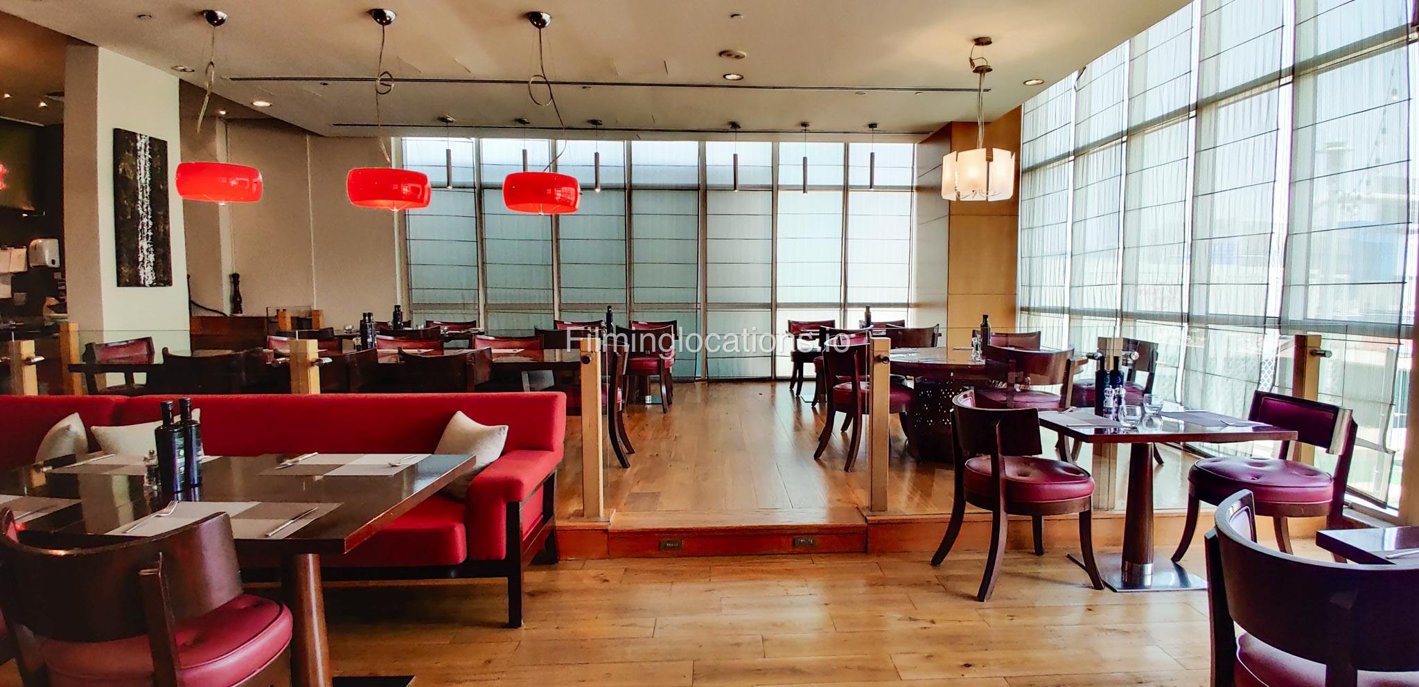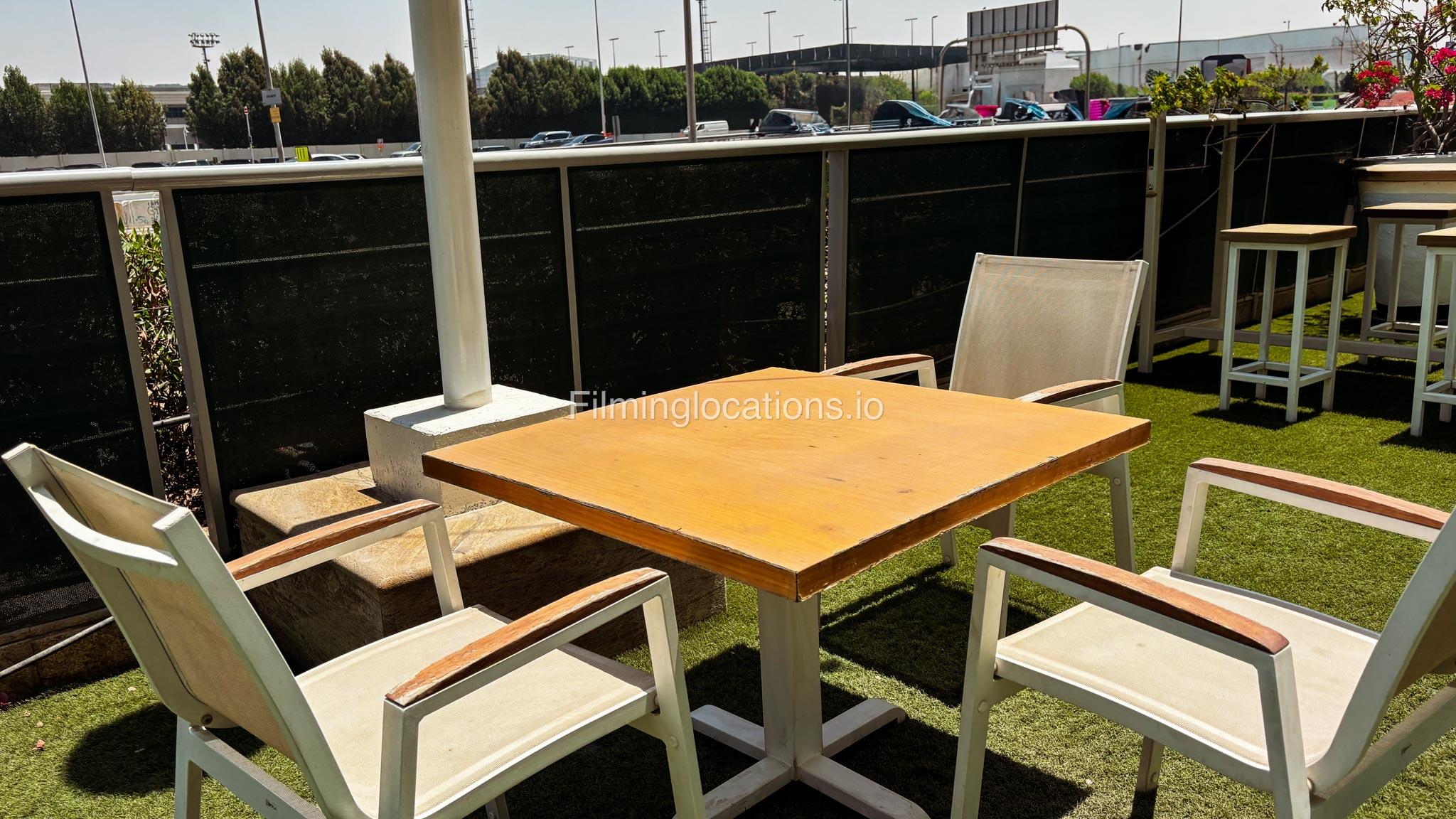 Our classic-style restaurant features an expansive, elegant seating area framed by floor-to-ceiling window walls, allowing for beautiful natural light—ideal for filming. The space includes a sleek modern bar and comfortable booth seating. Outdoors, the venue extends into a charming open-terrace area adorned with lush greenery and vibrant floral accents.