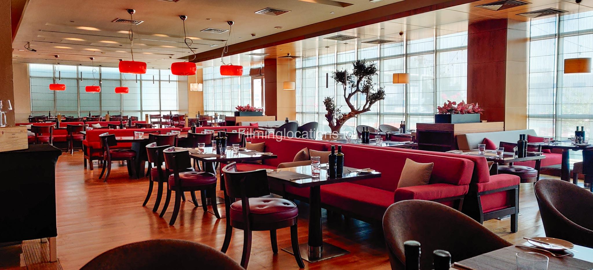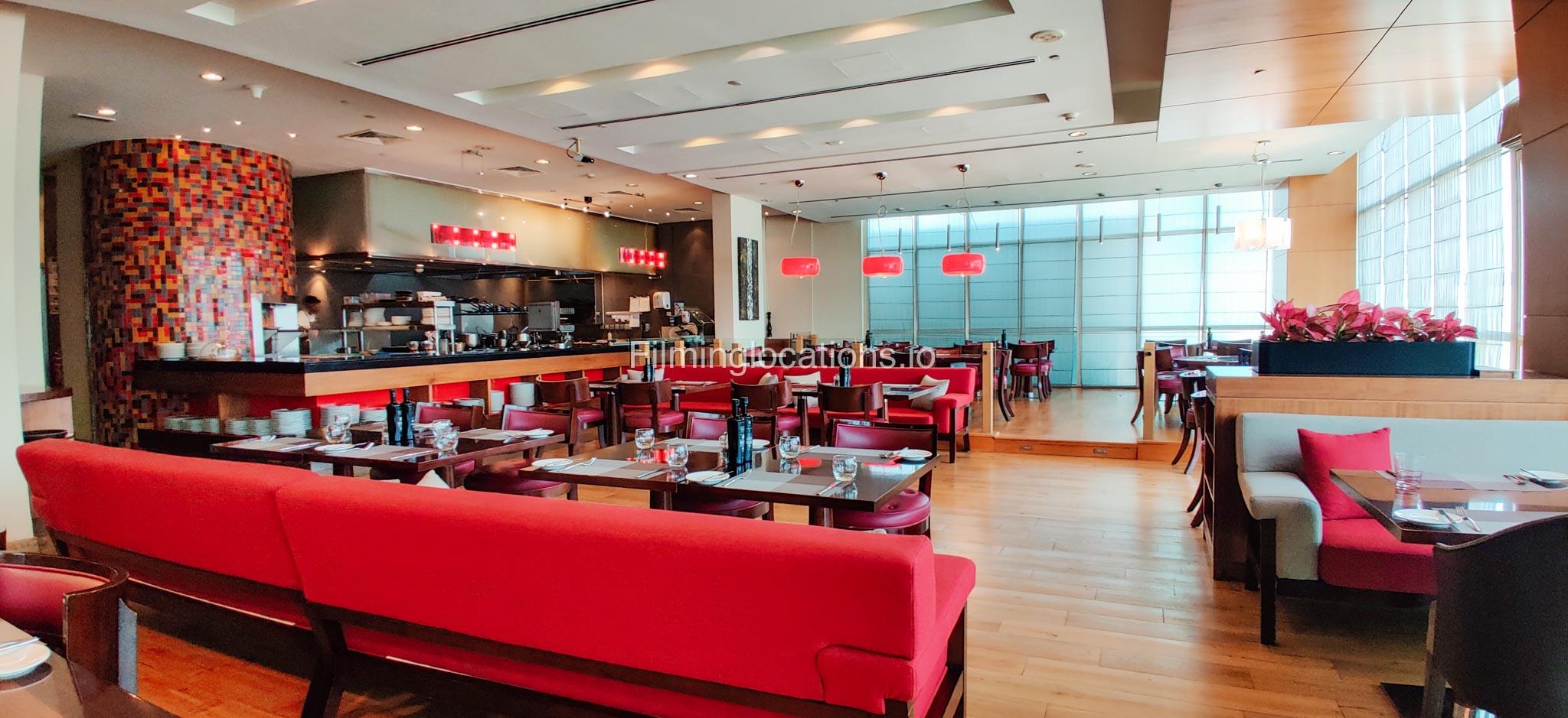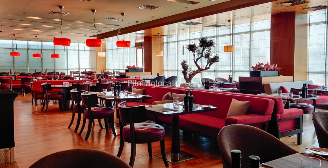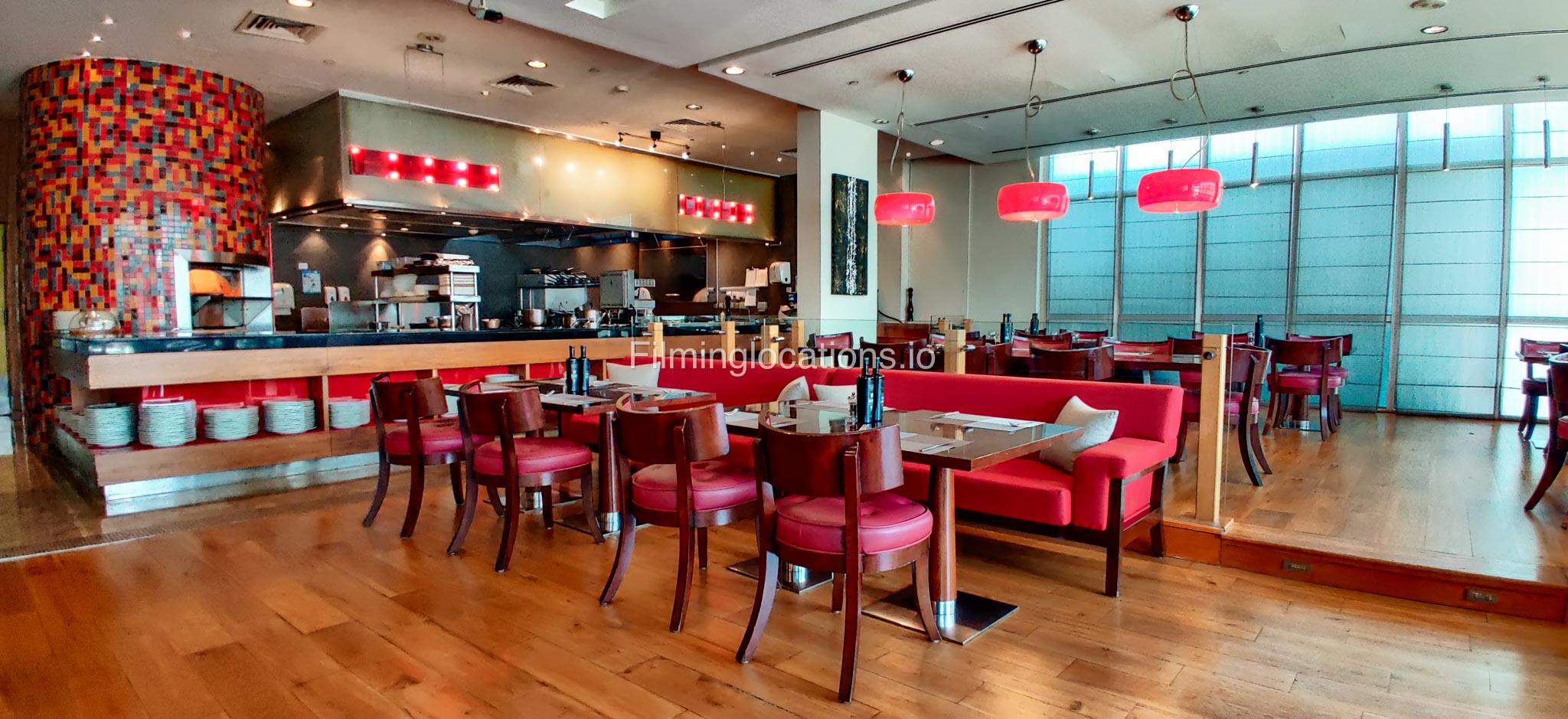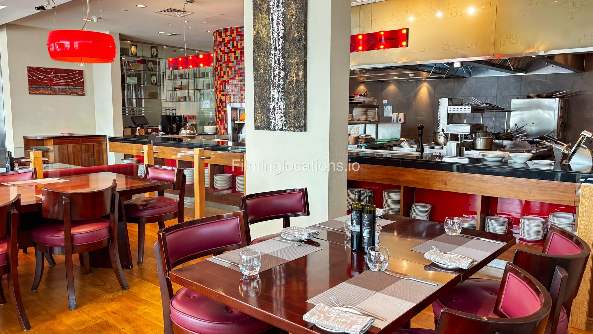 Our classic-style restaurant features an expansive, elegant seating area framed by floor-to-ceiling window walls, allowing for beautiful natural light—ideal for filming. The space includes a sleek modern bar and comfortable booth seating. Outdoors, the venue extends into a charming open-terrace area adorned with lush greenery and vibrant floral accents.