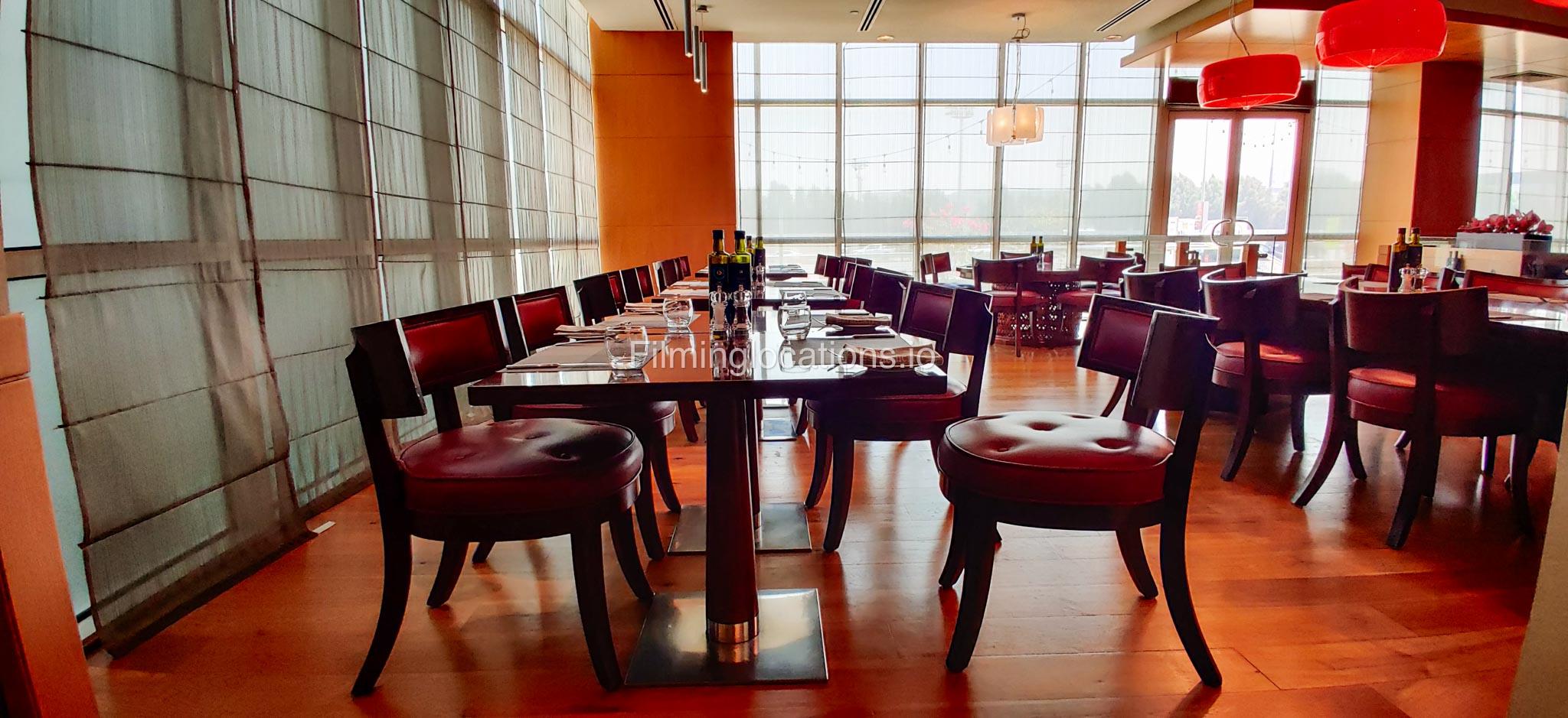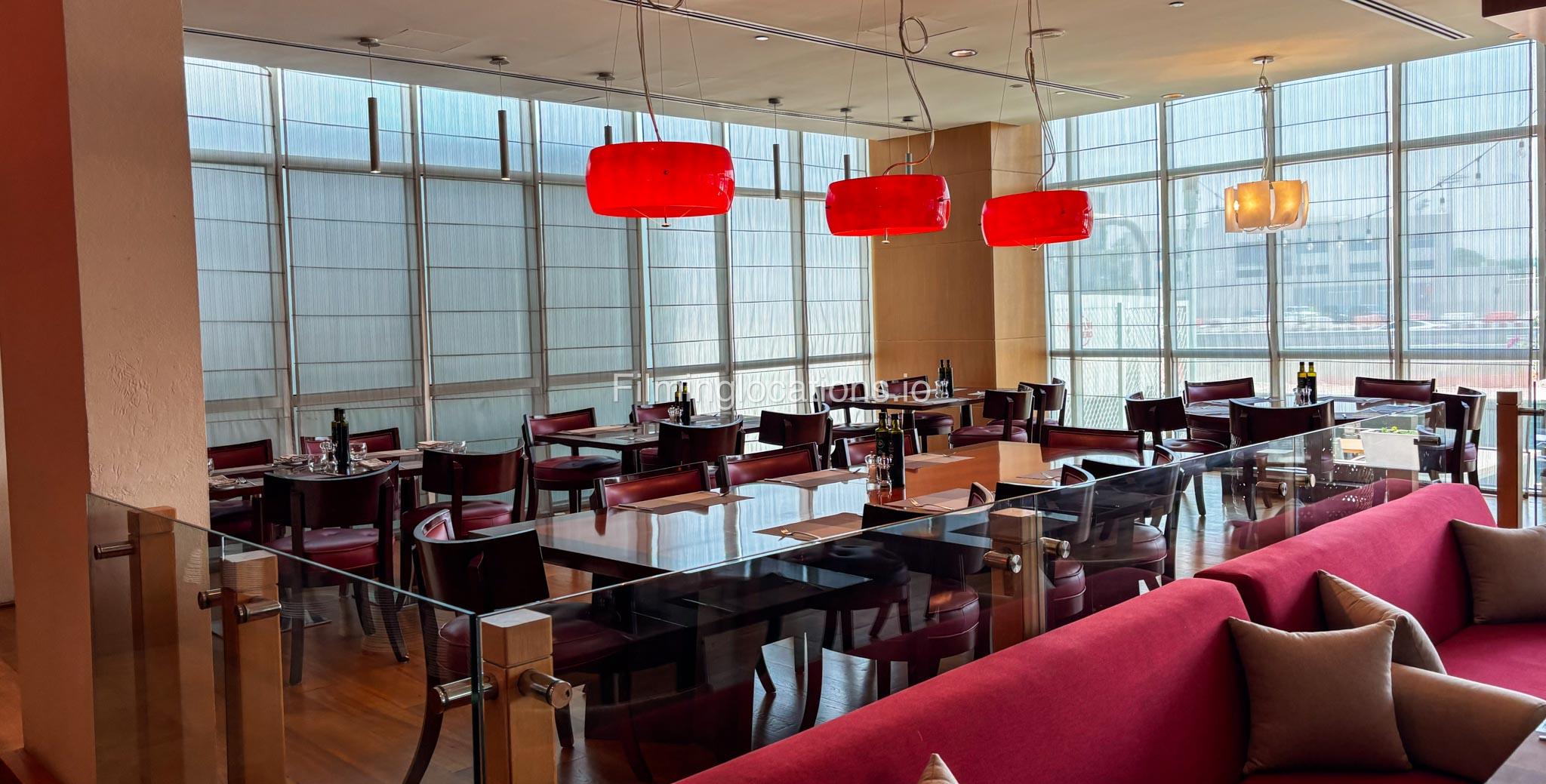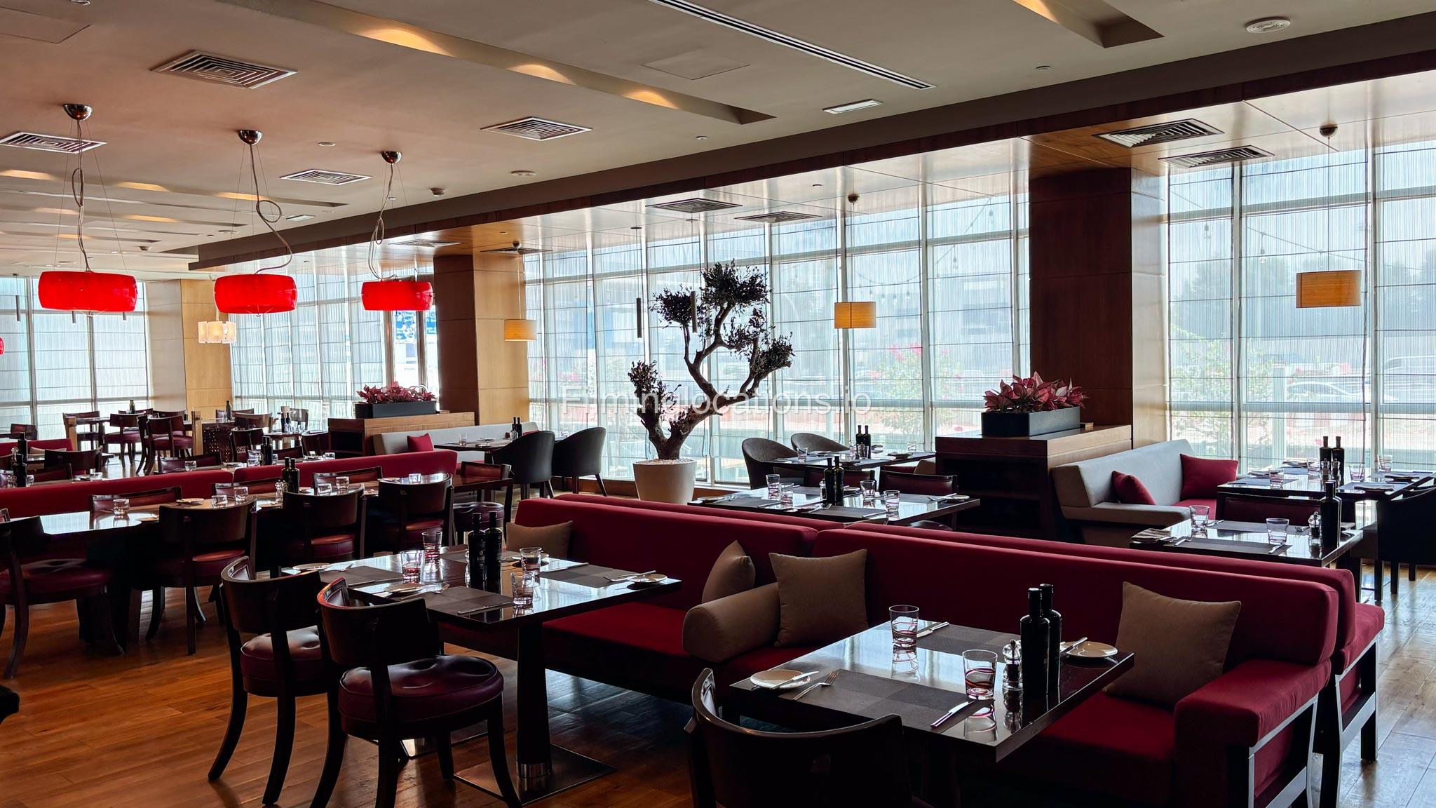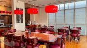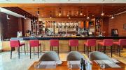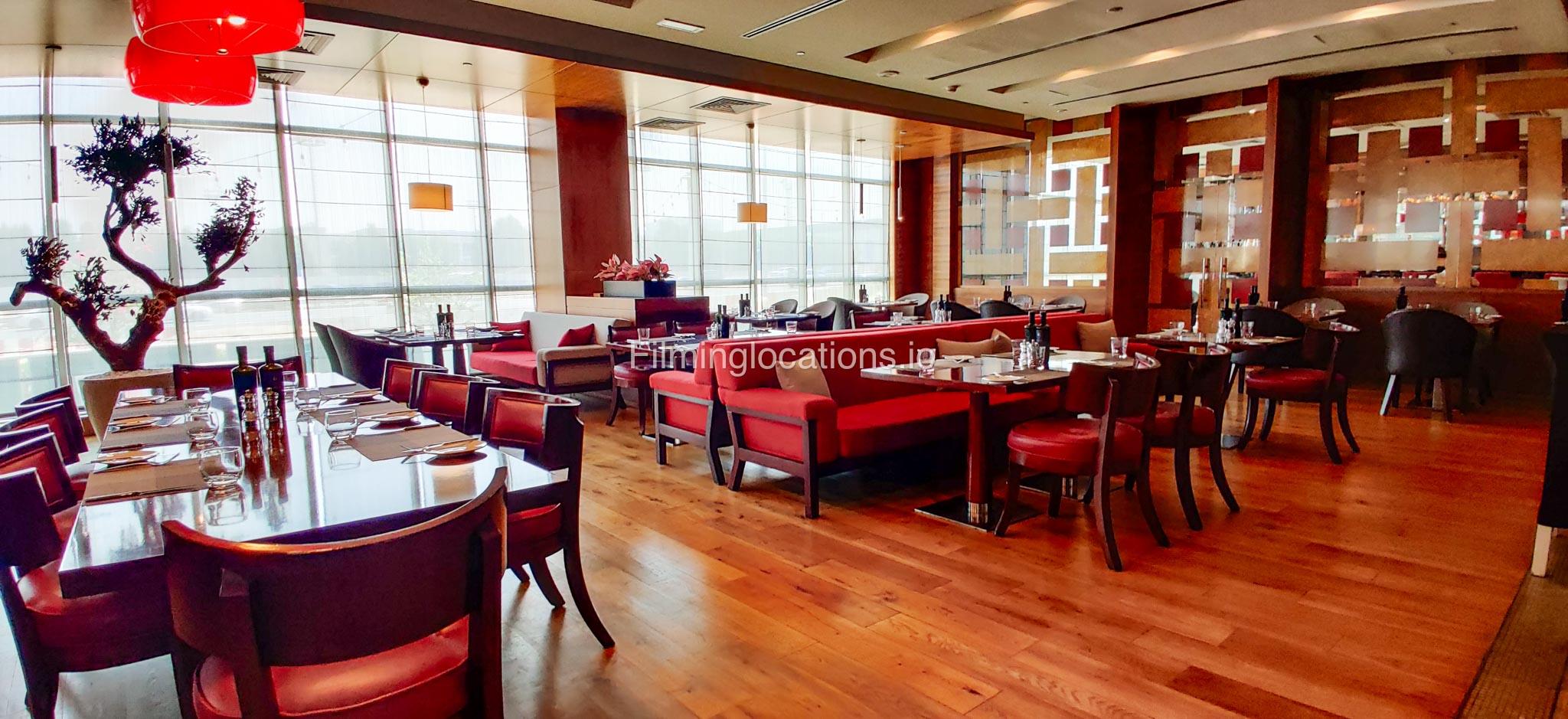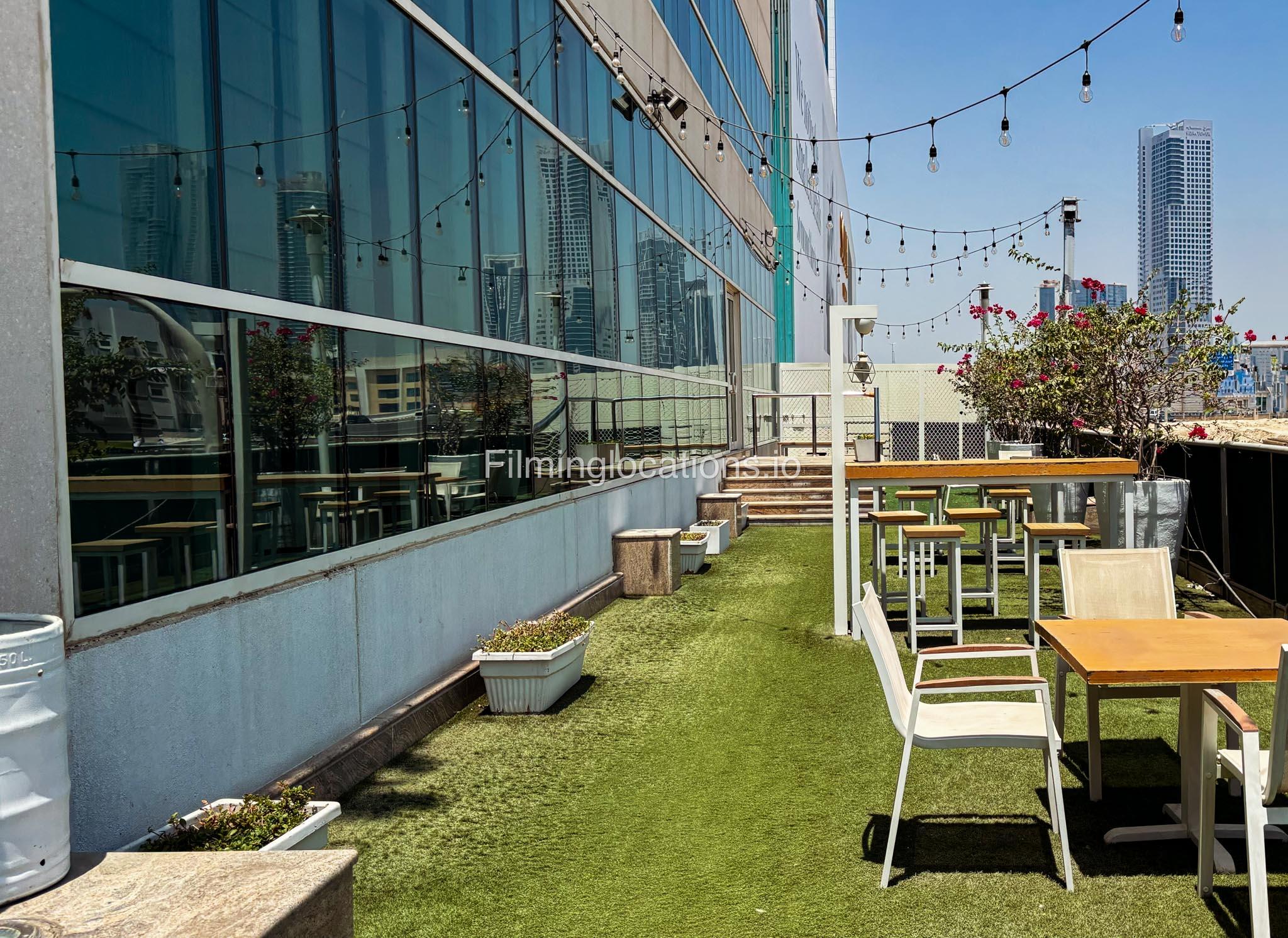 Our classic-style restaurant features an expansive, elegant seating area framed by floor-to-ceiling window walls, allowing for beautiful natural light—ideal for filming. The space includes a sleek modern bar and comfortable booth seating. Outdoors, the venue extends into a charming open-terrace area adorned with lush greenery and vibrant floral accents.