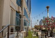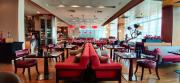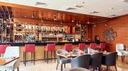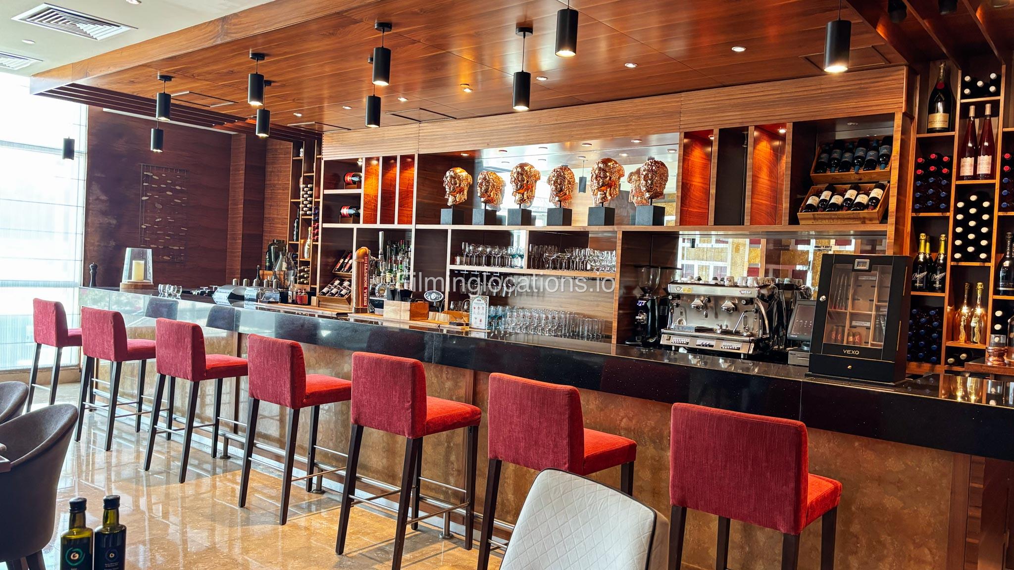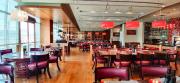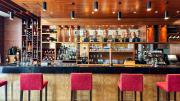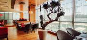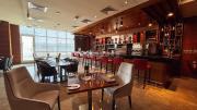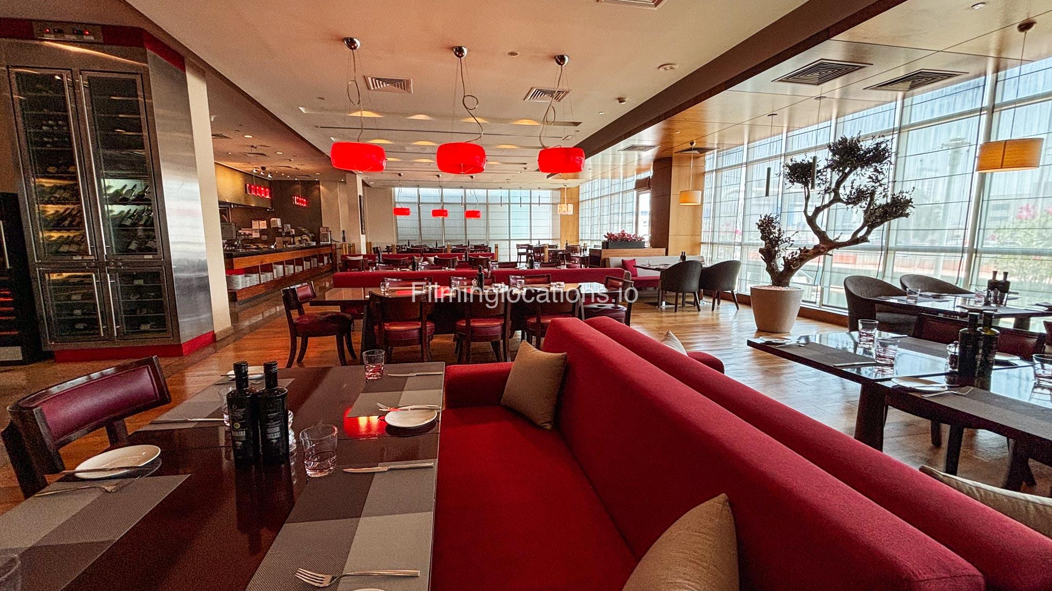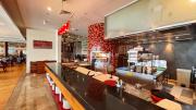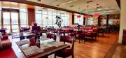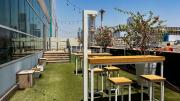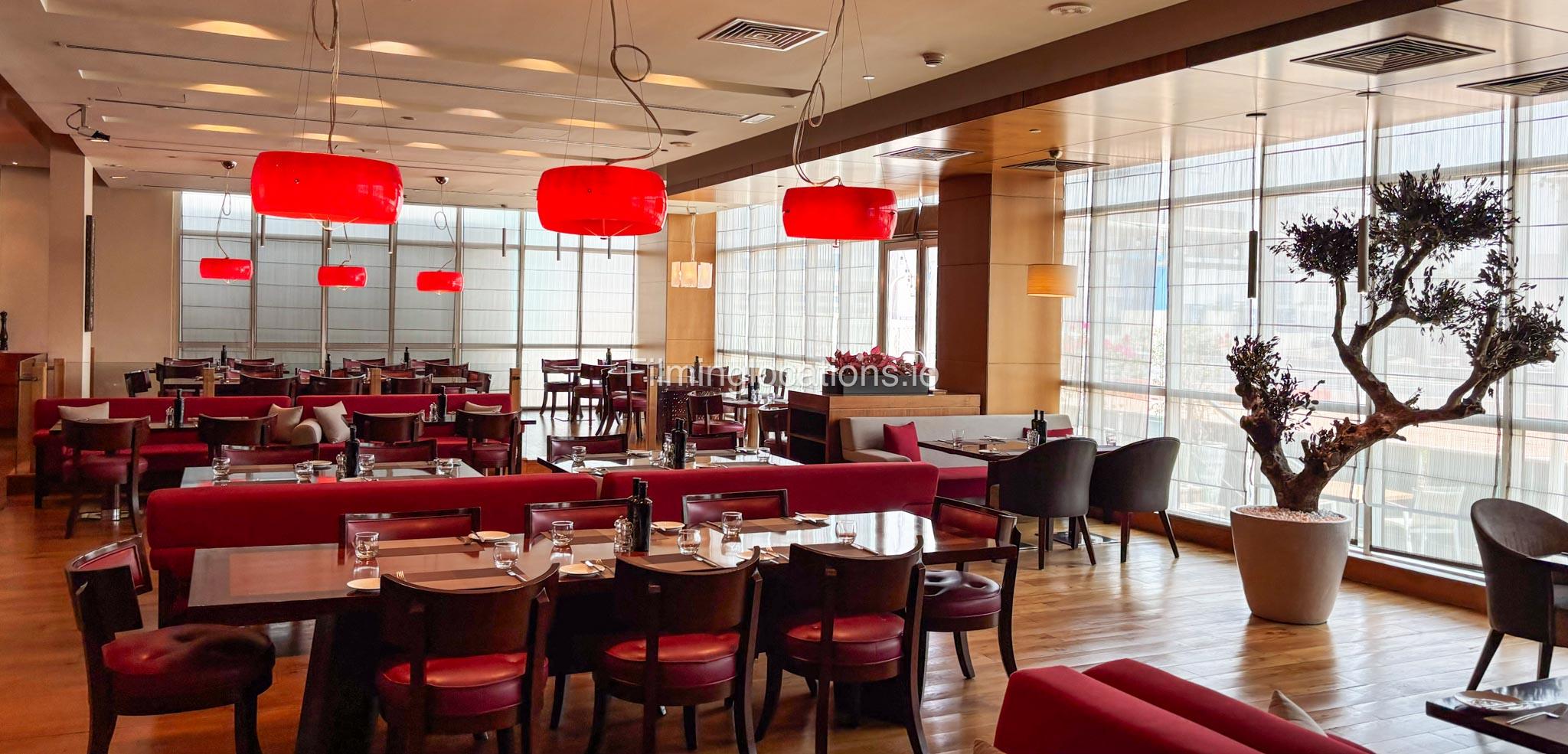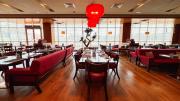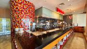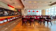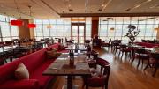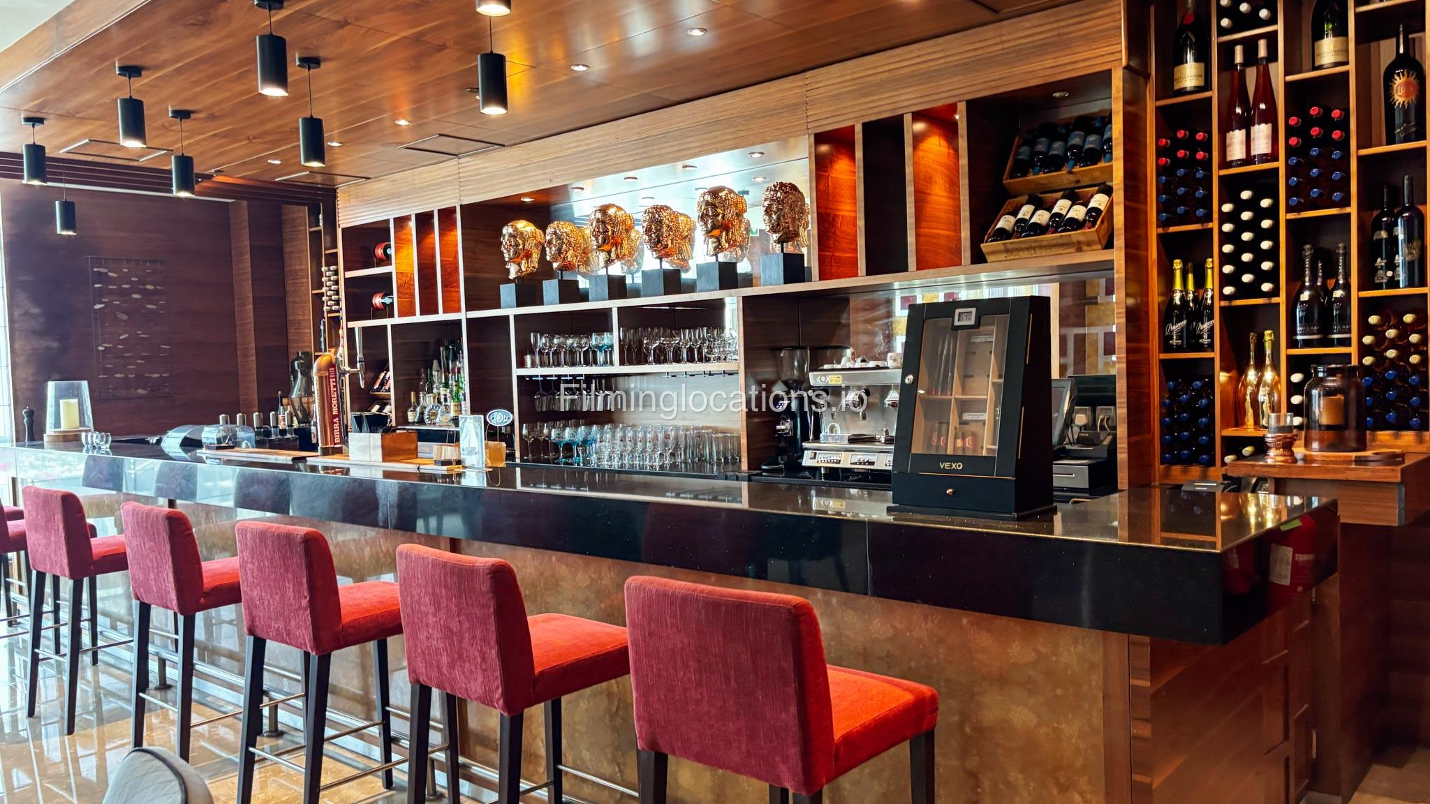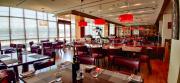 Our classic-style restaurant features an expansive, elegant seating area framed by floor-to-ceiling window walls, allowing for beautiful natural light—ideal for filming. The space includes a sleek modern bar and comfortable booth seating. Outdoors, the venue extends into a charming open-terrace area adorned with lush greenery and vibrant floral accents.
