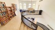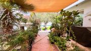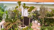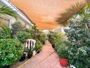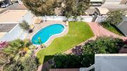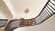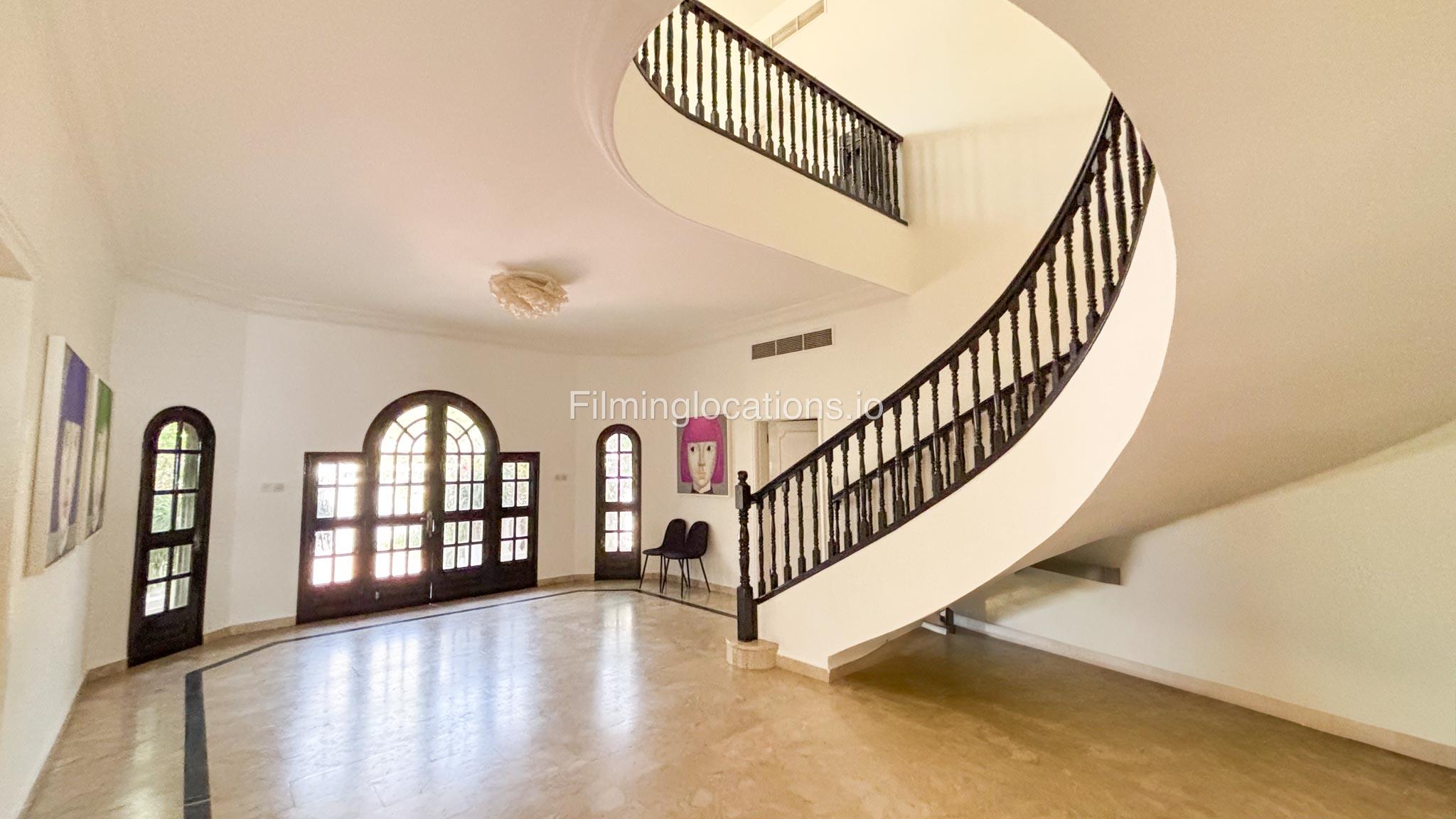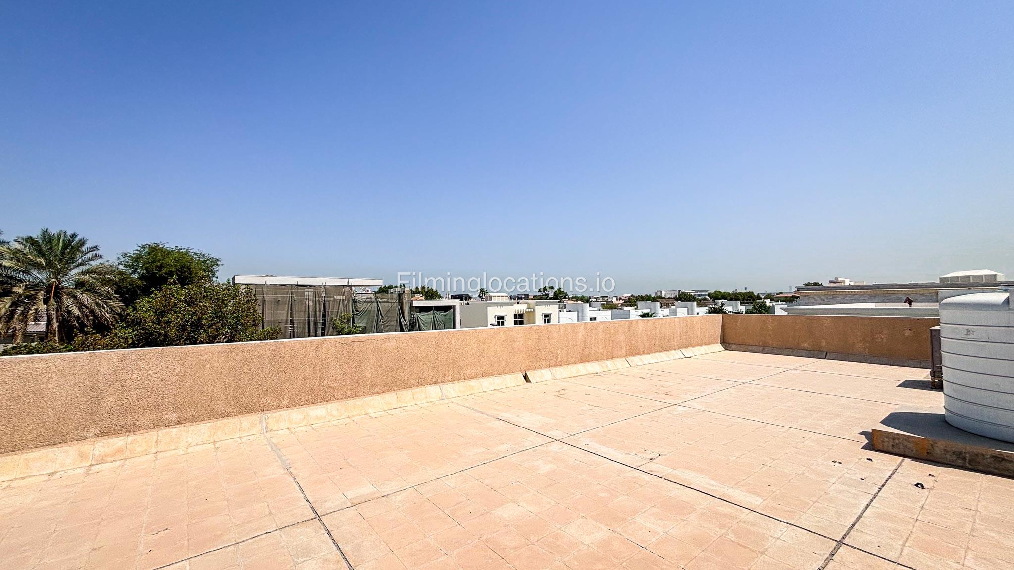 Our Contemporary 1-Bedroom Villa features a vibrant garden with a swimming pool and artistic pottery décor. A staircase lined with potted plants leads to the villa entrance. Inside, you'll find a spacious living room seamlessly connected to the dining area, adorned with unique wall art. The villa includes a fully enclosed kitchen, one large empty hall with artistic walls, and 1 ground-floor bedroom. A grand staircase takes you upstairs to a 2nd living area and a rooftop offering stunning skyline views, including the Burj Khalifa.