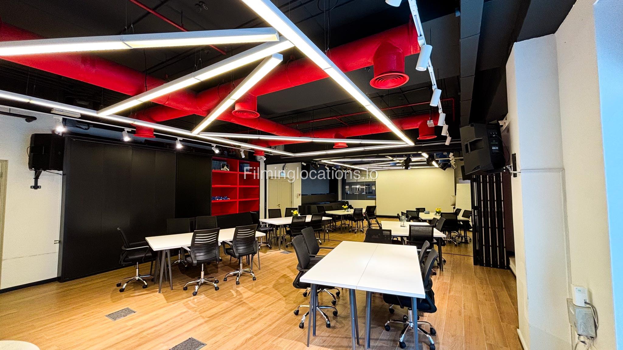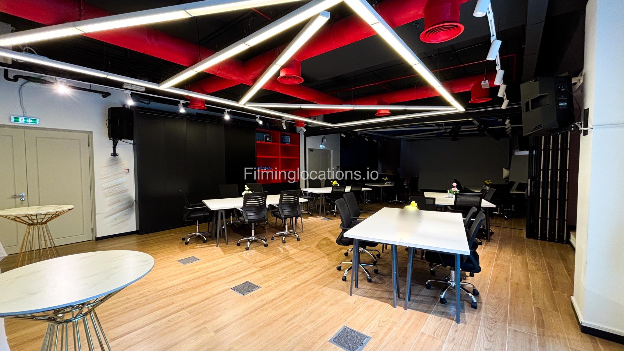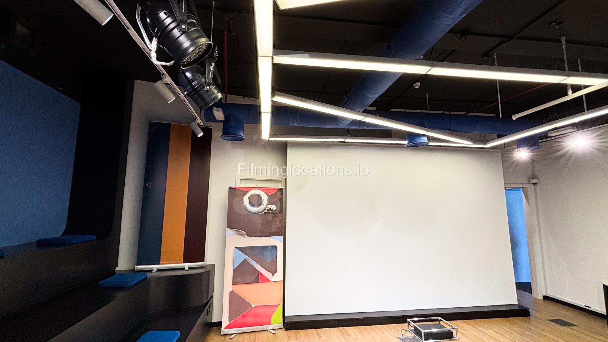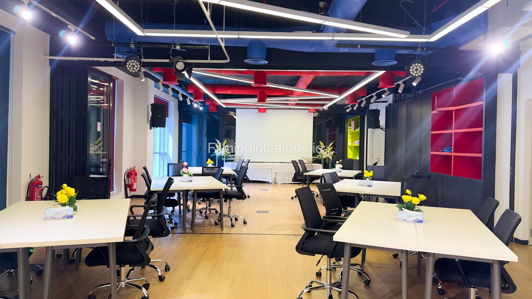 Our multipurpose event space features a spacious, vibrant seating area with modern ceiling décor, built-in screens, and projectors. A movable partition separates the area, allowing it to be transformed into one large open space, making it perfect for versatile filming needs.