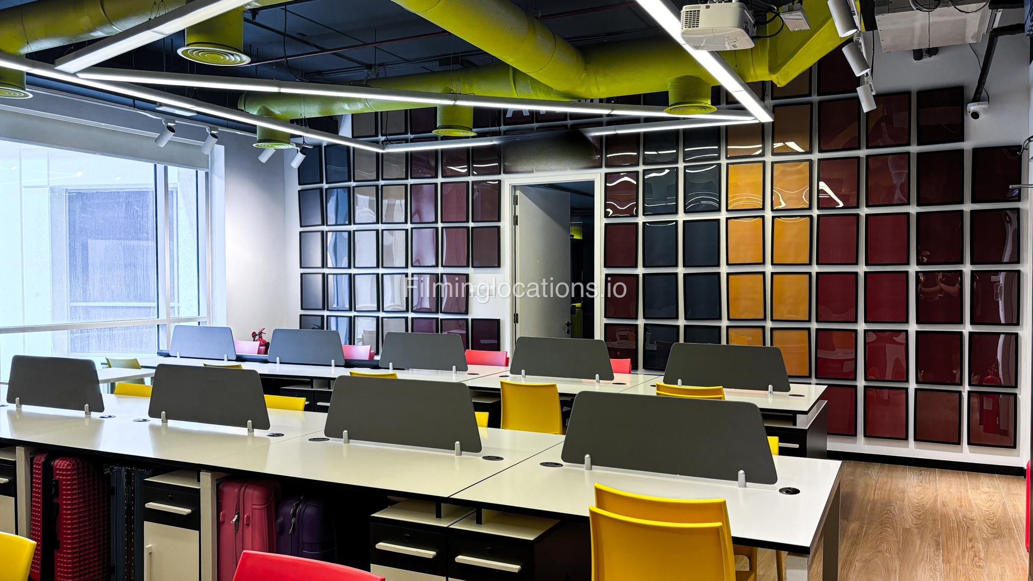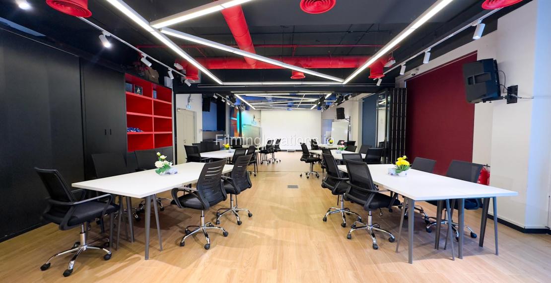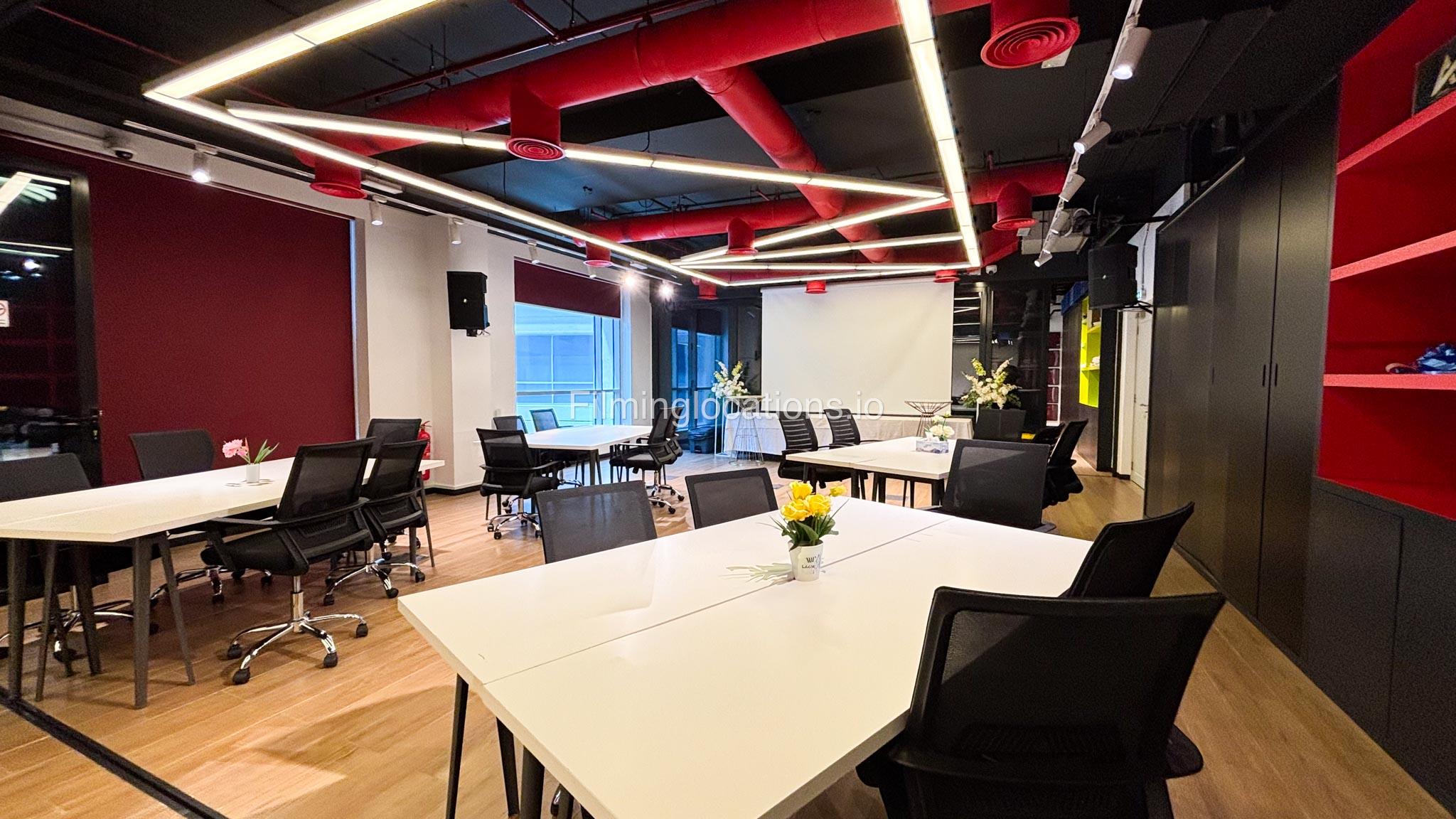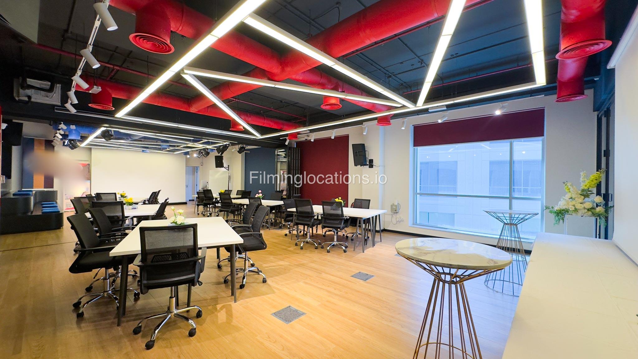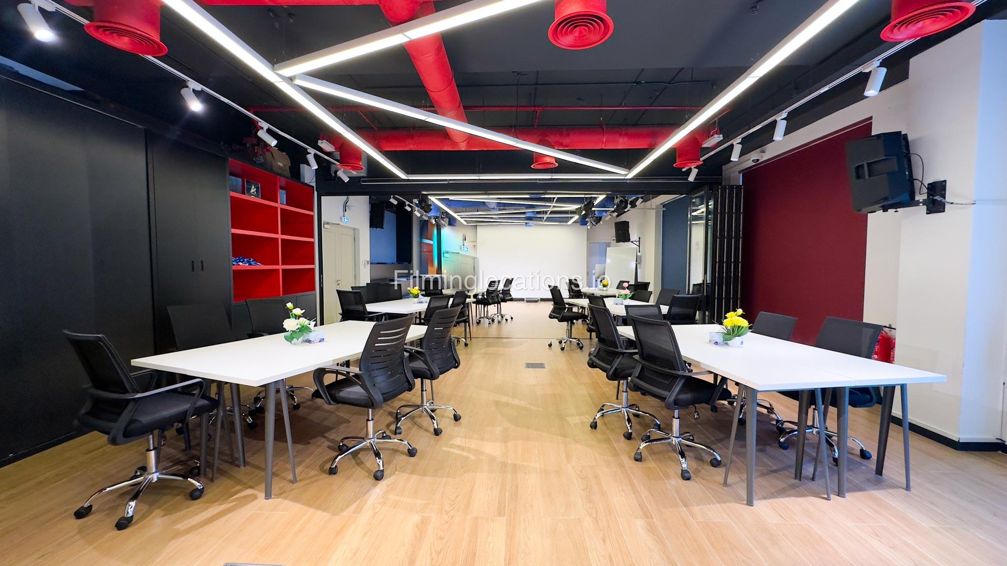 Our multipurpose event space features a spacious, vibrant seating area with modern ceiling décor, built-in screens, and projectors. A movable partition separates the area, allowing it to be transformed into one large open space, making it perfect for versatile filming needs.