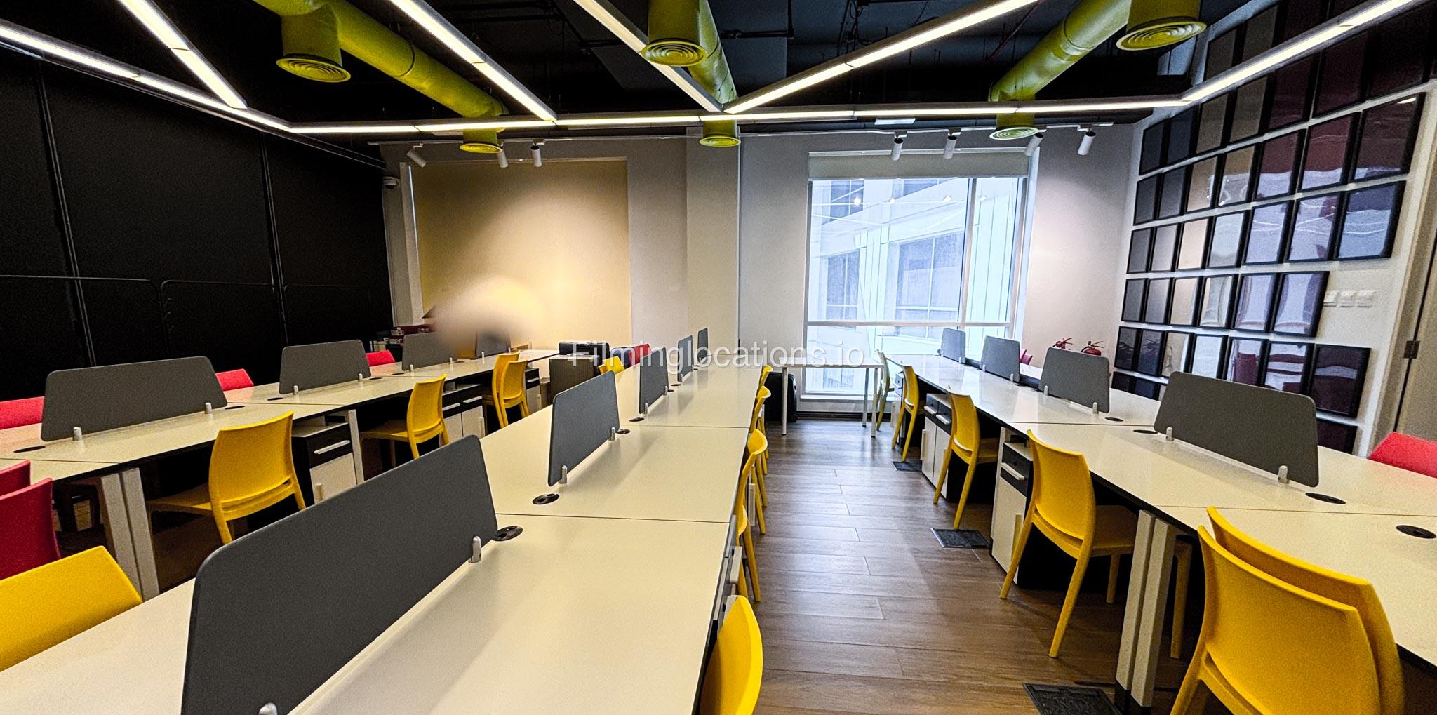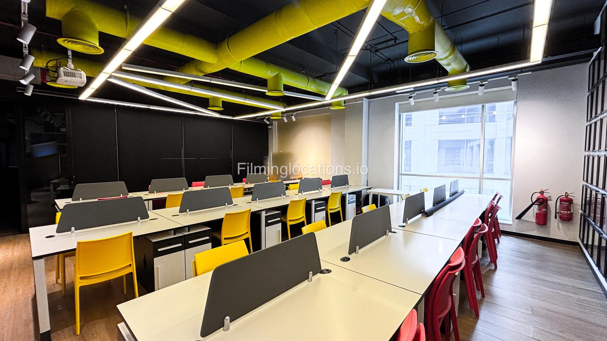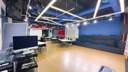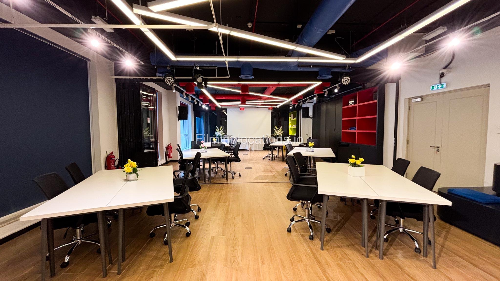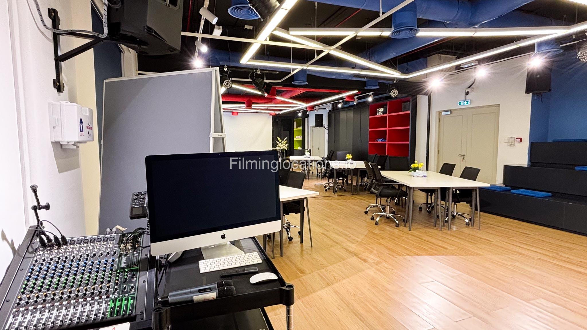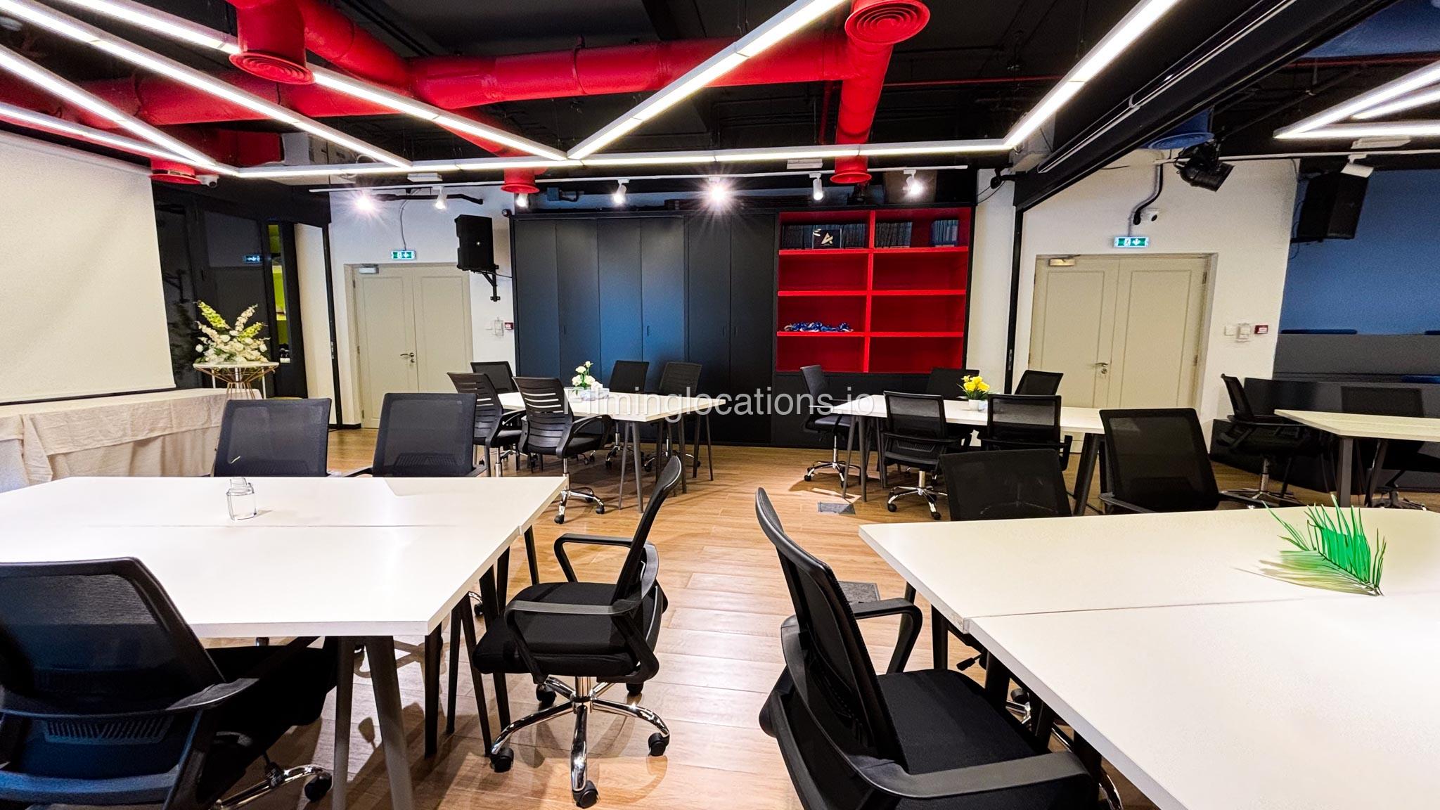Our multipurpose event space features a spacious, vibrant seating area with modern ceiling décor, built-in screens, and projectors. A movable partition separates the area, allowing it to be transformed into one large open space, making it perfect for versatile filming needs.