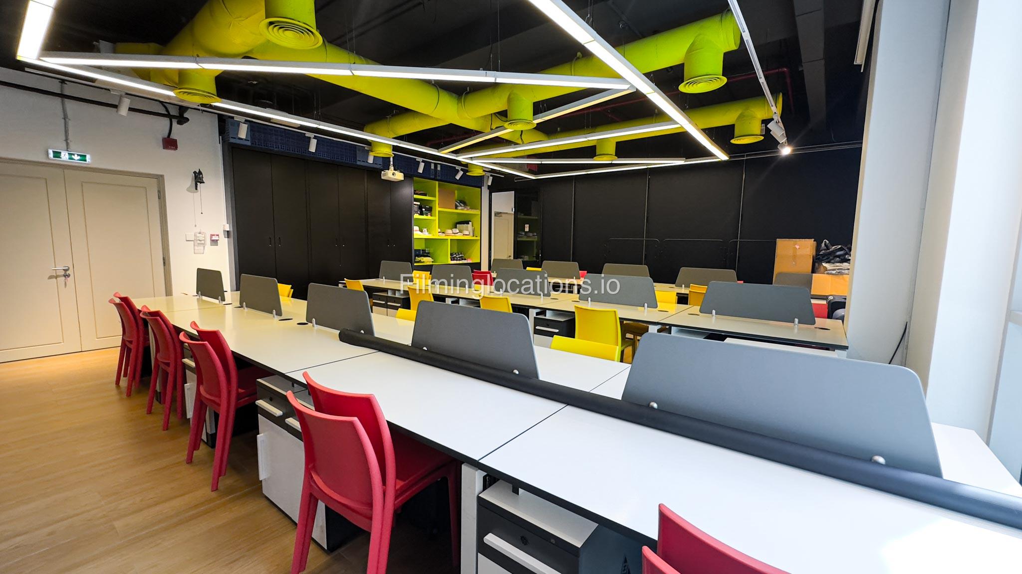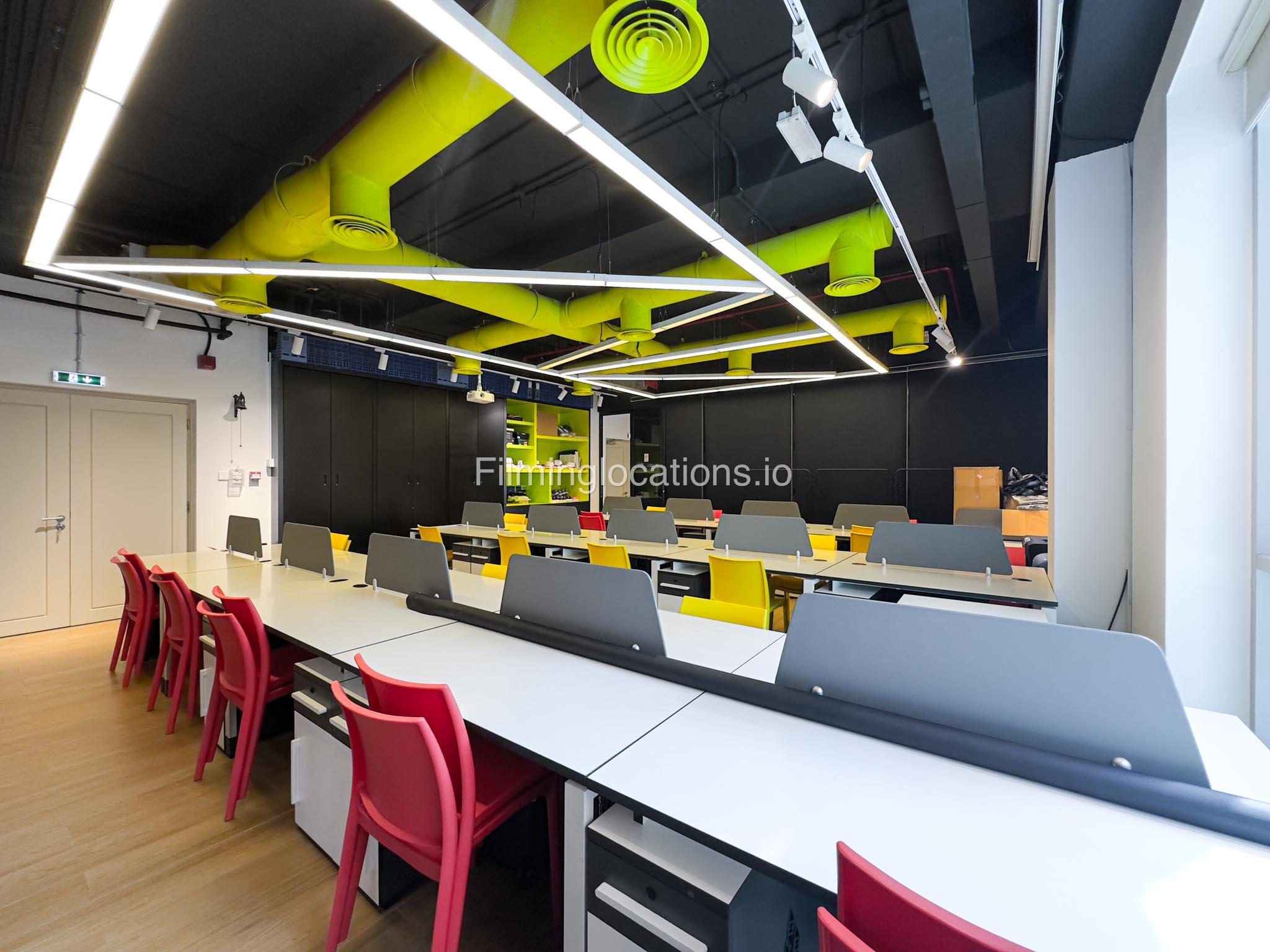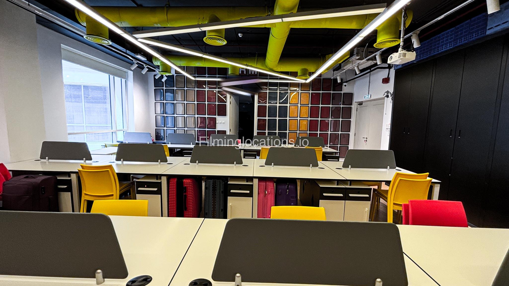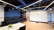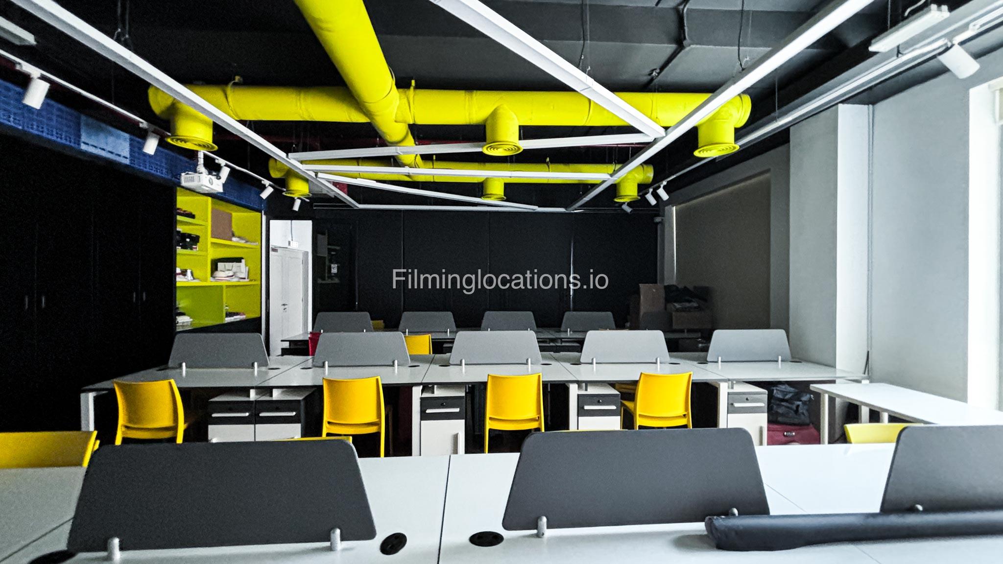 Our multipurpose event space features a spacious, vibrant seating area with modern ceiling décor, built-in screens, and projectors. A movable partition separates the area, allowing it to be transformed into one large open space, making it perfect for versatile filming needs.