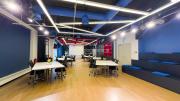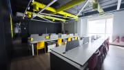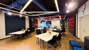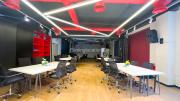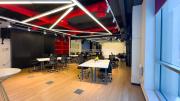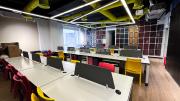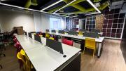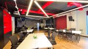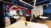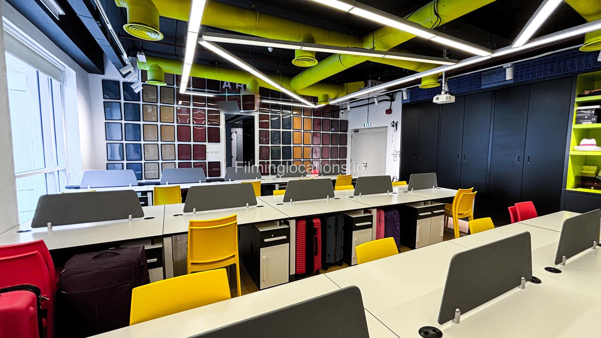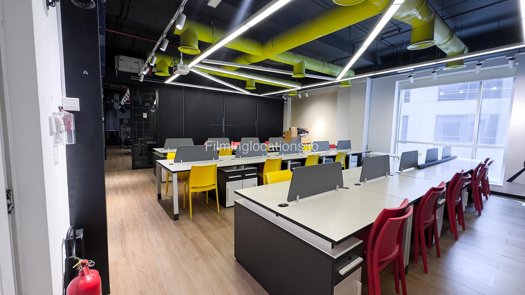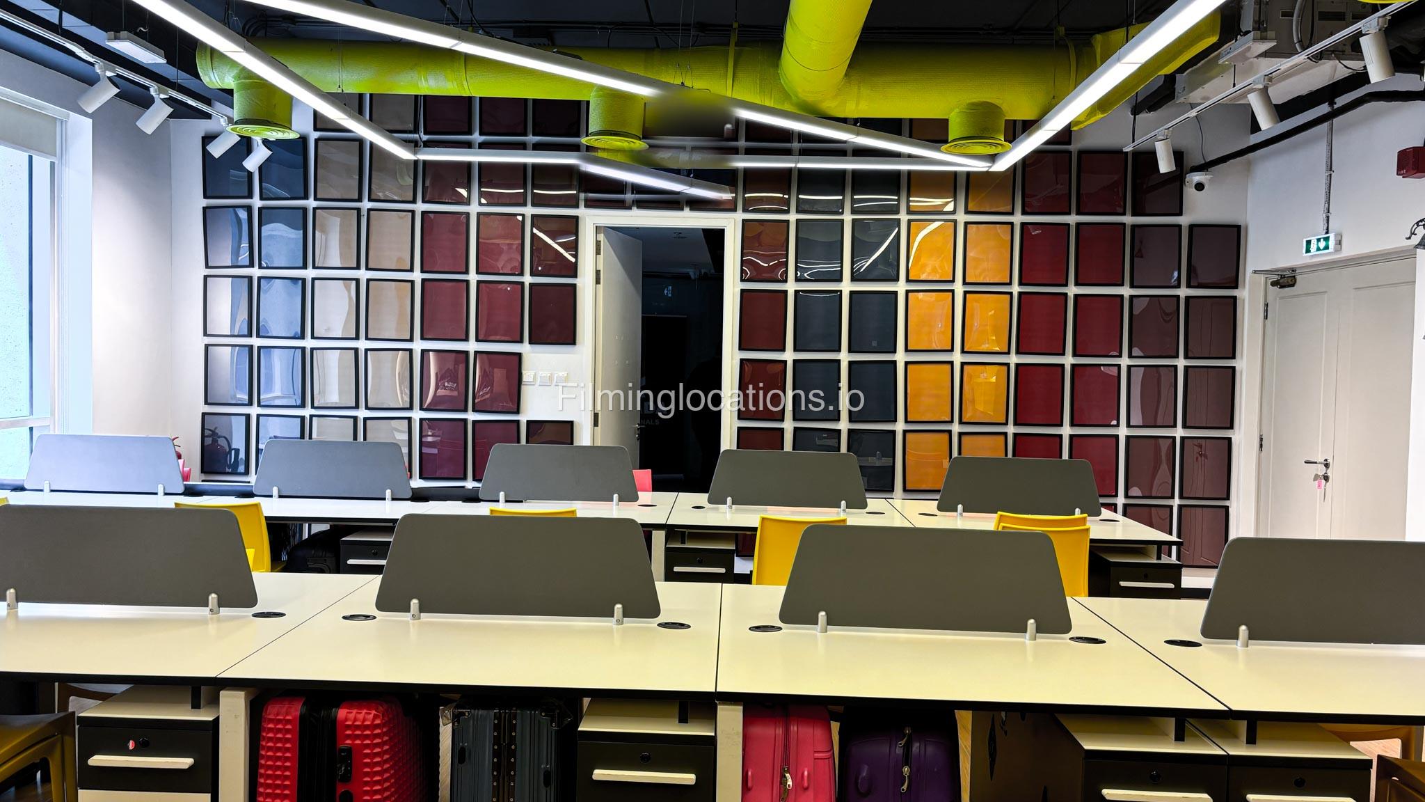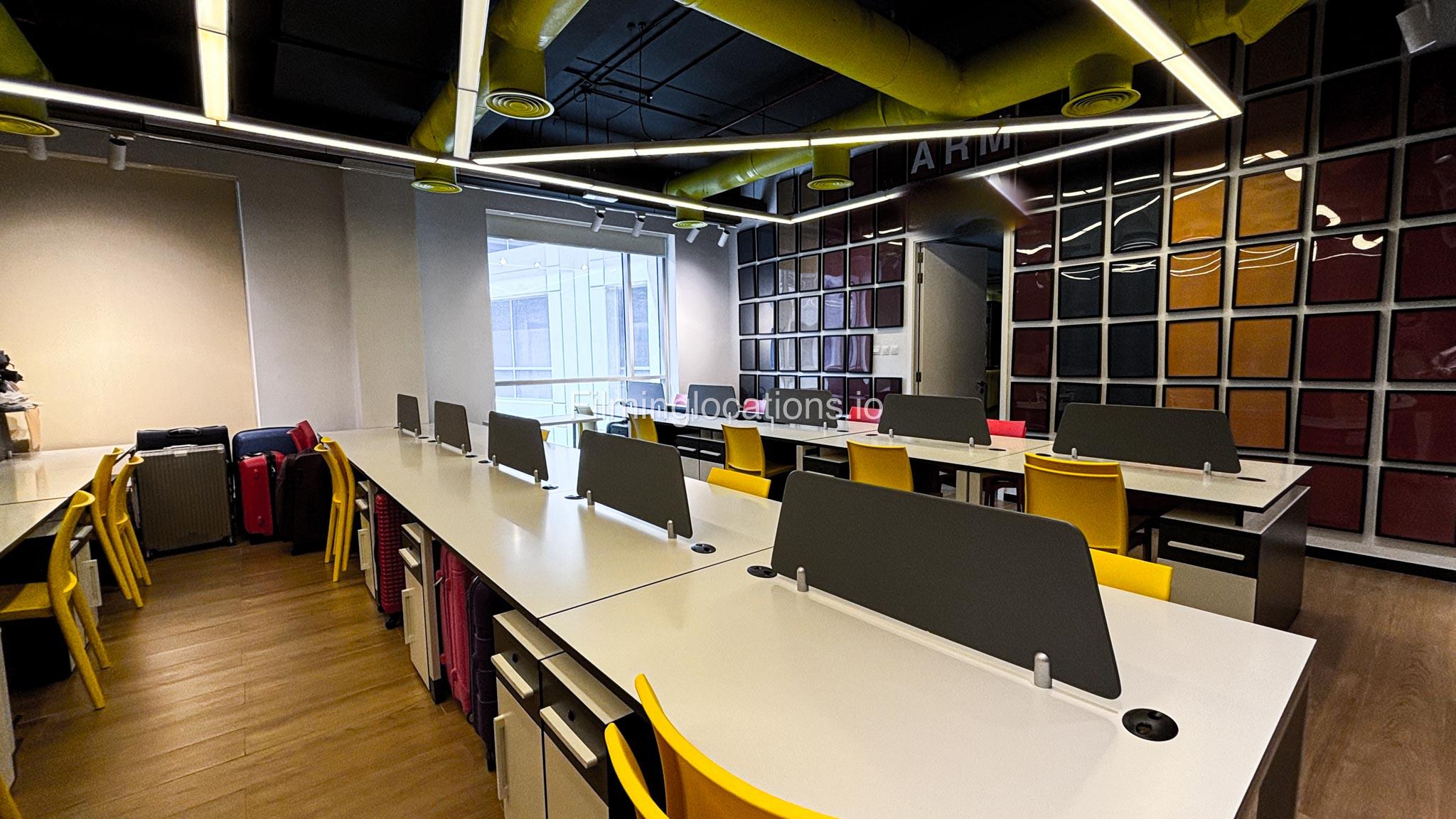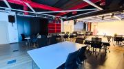 Our multipurpose event space features a spacious, vibrant seating area with modern ceiling décor, built-in screens, and projectors. A movable partition separates the area, allowing it to be transformed into one large open space, making it perfect for versatile filming needs.