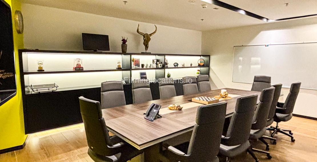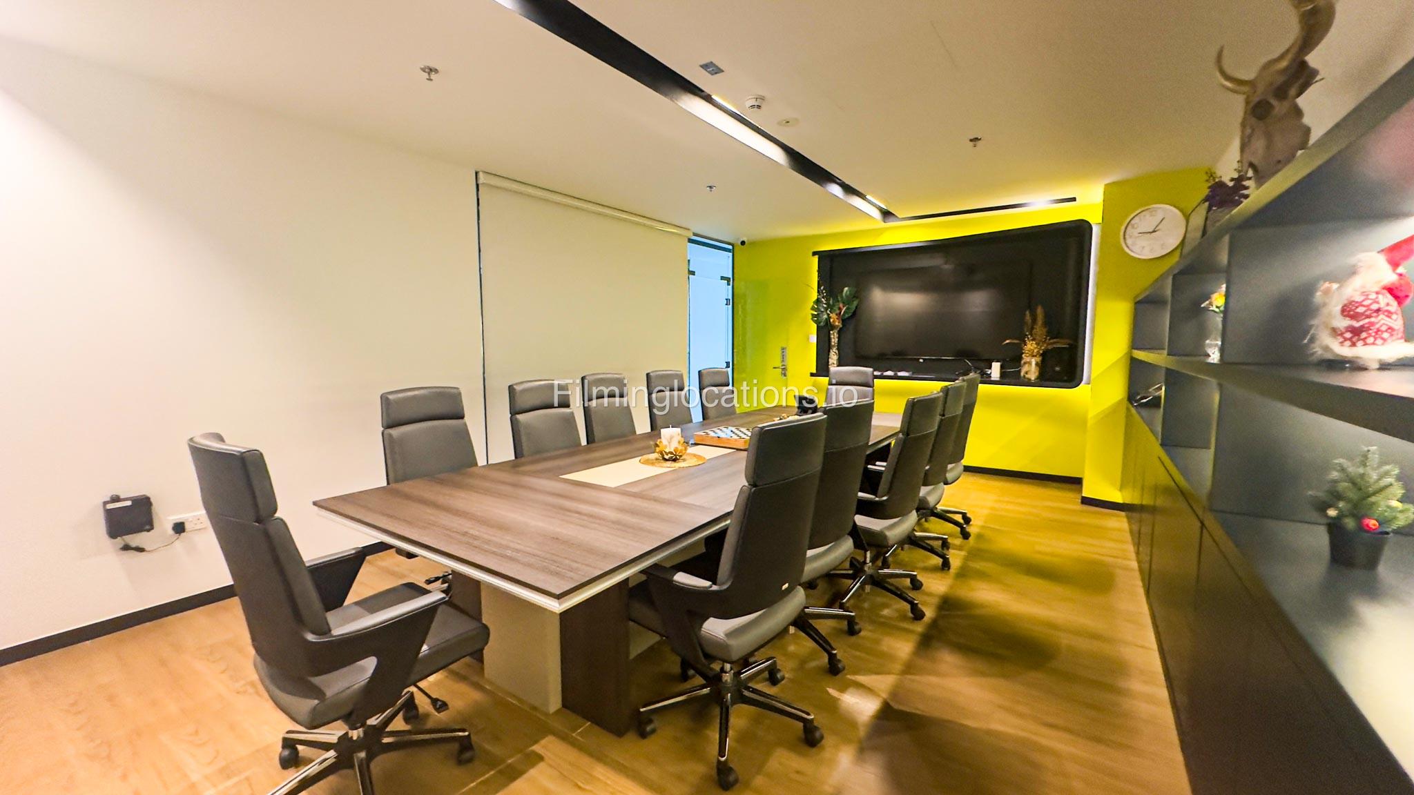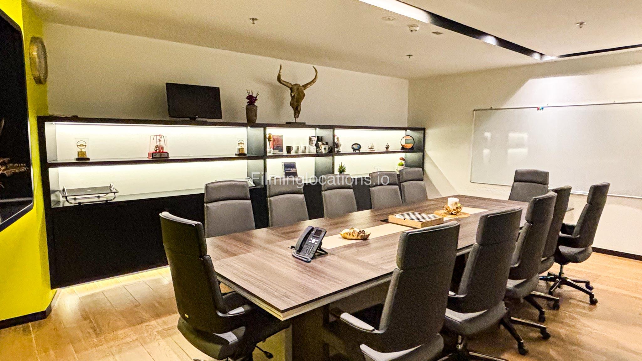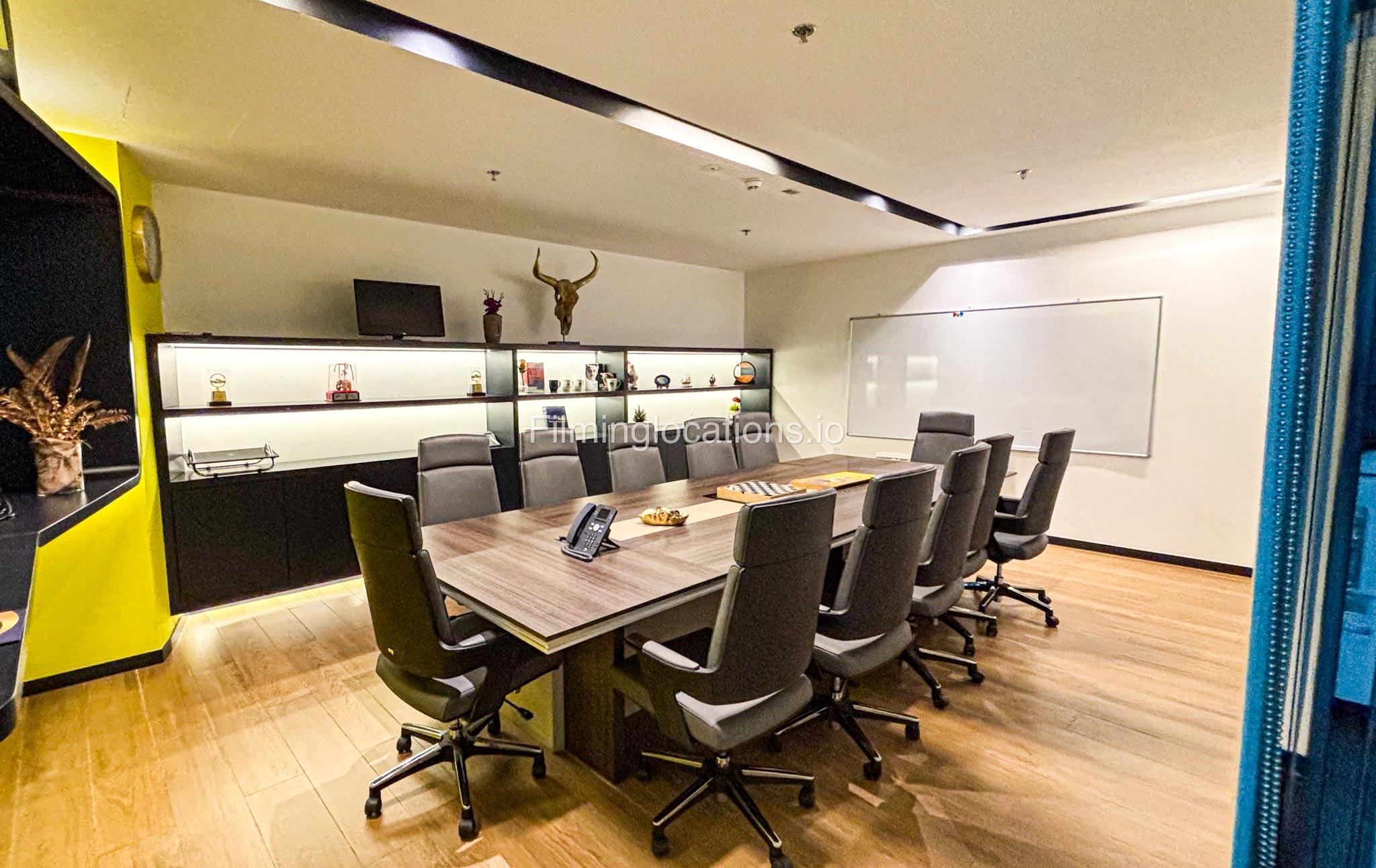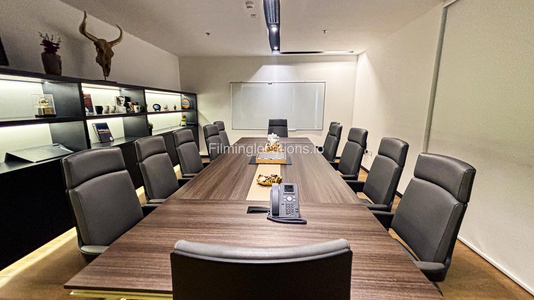 Our spacious and modern conference room with a sleek and modern design, audio visual set up, equipped with a Large TV and a wooden minimalistic table surrounded with 12 chairs.