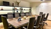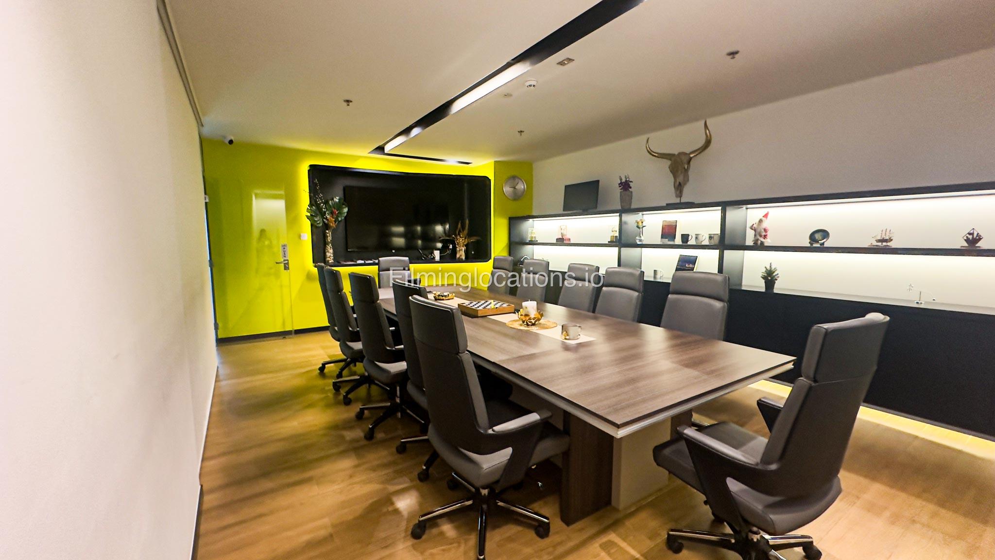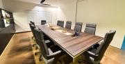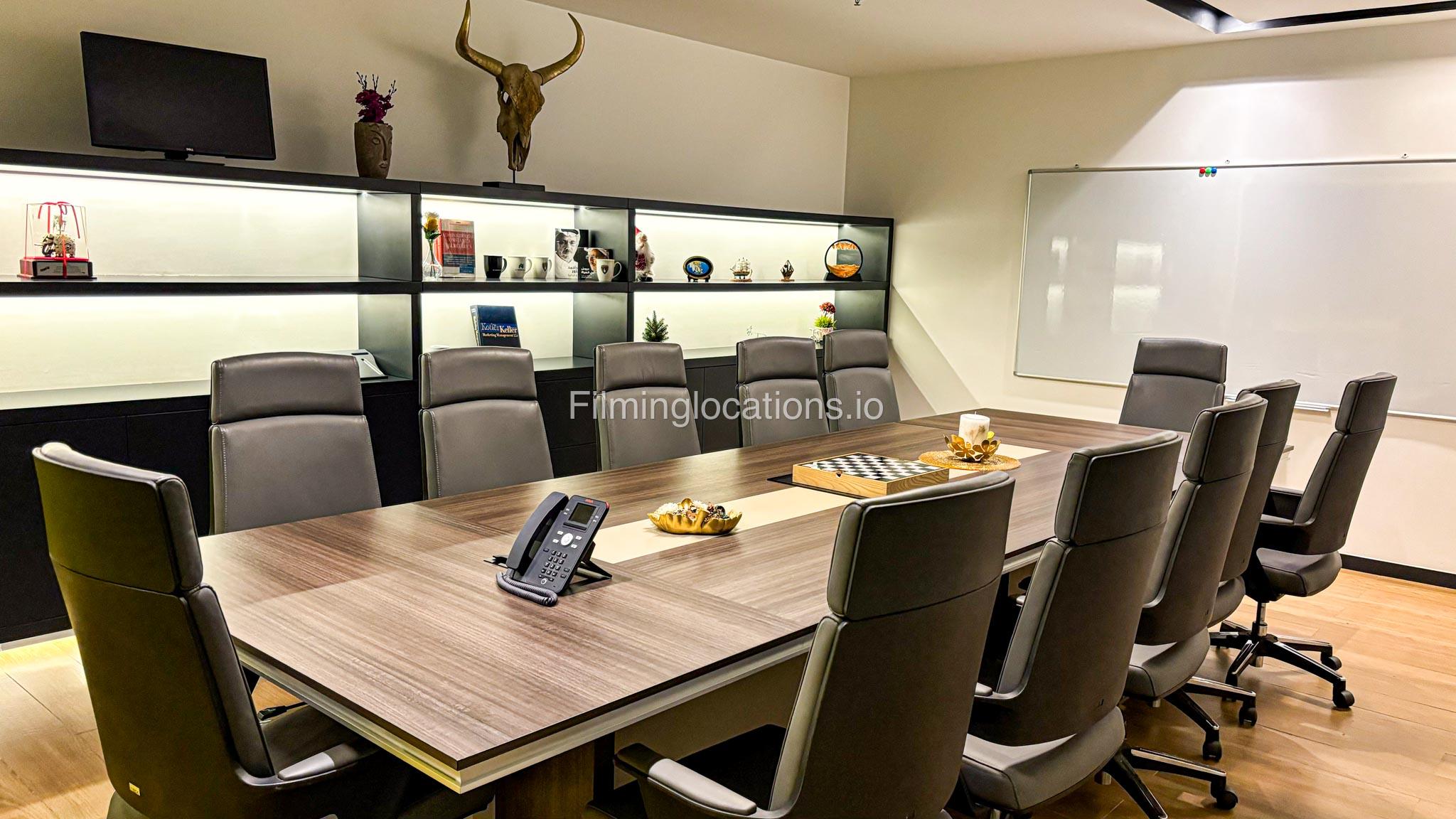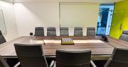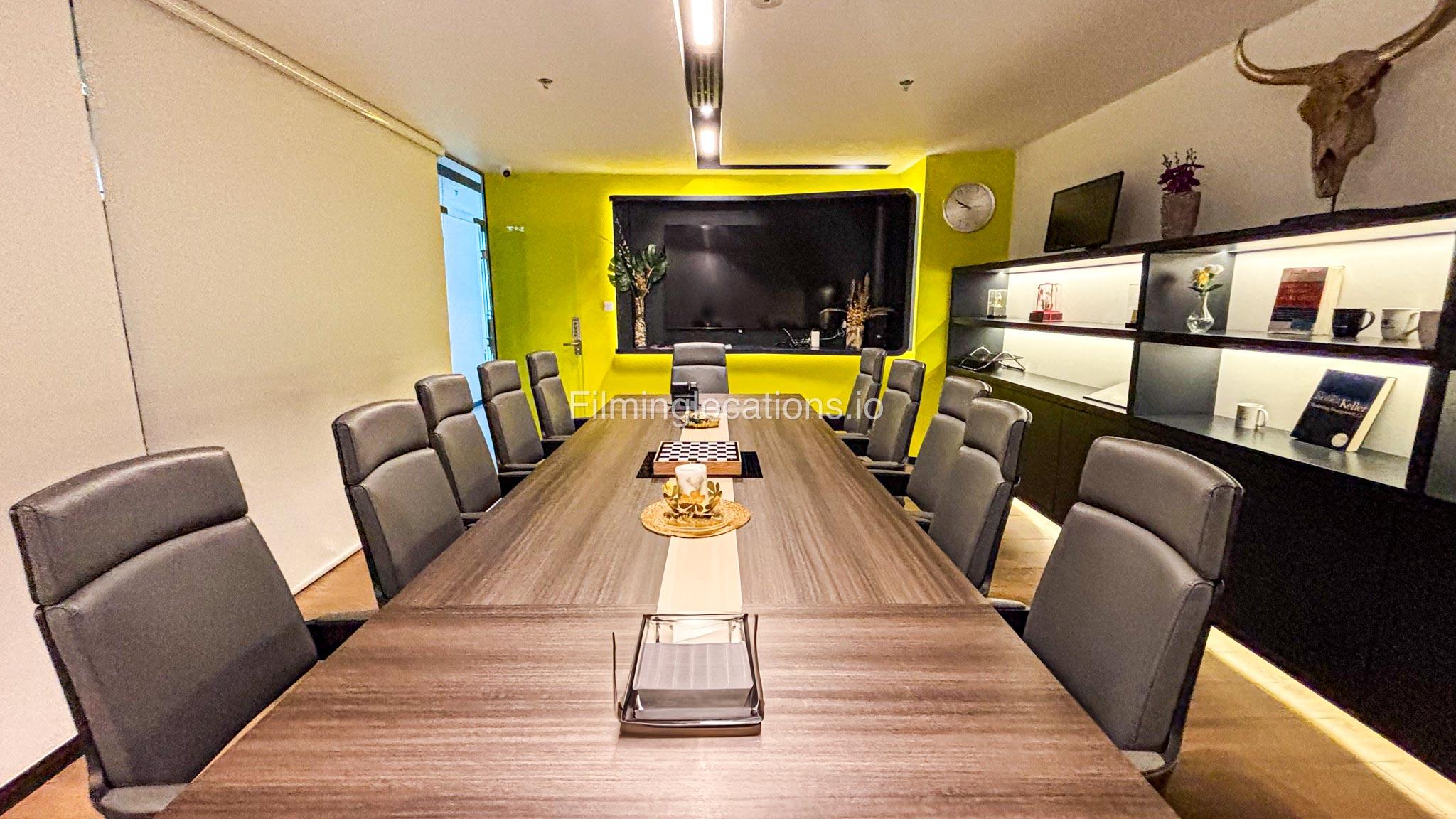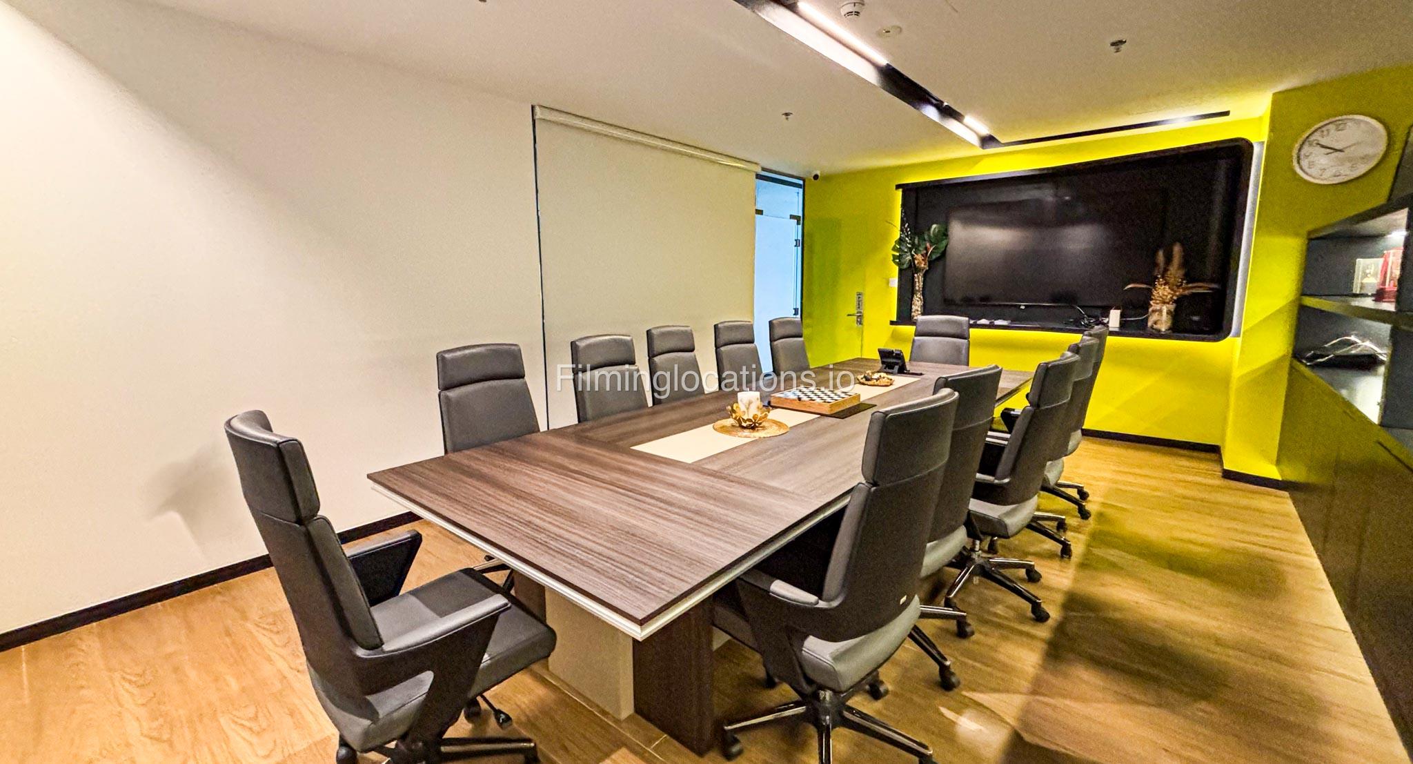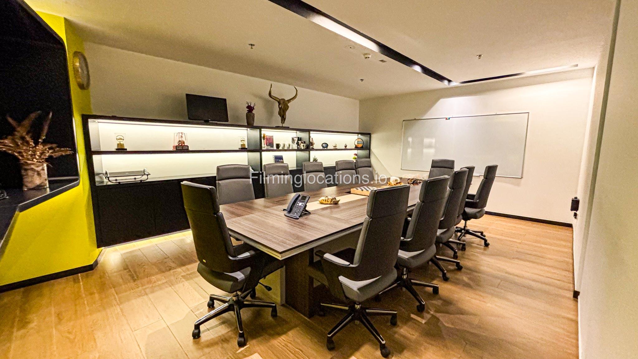Our spacious and modern conference room with a sleek and modern design, audio visual set up, equipped with a Large TV and a wooden minimalistic table surrounded with 12 chairs.