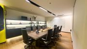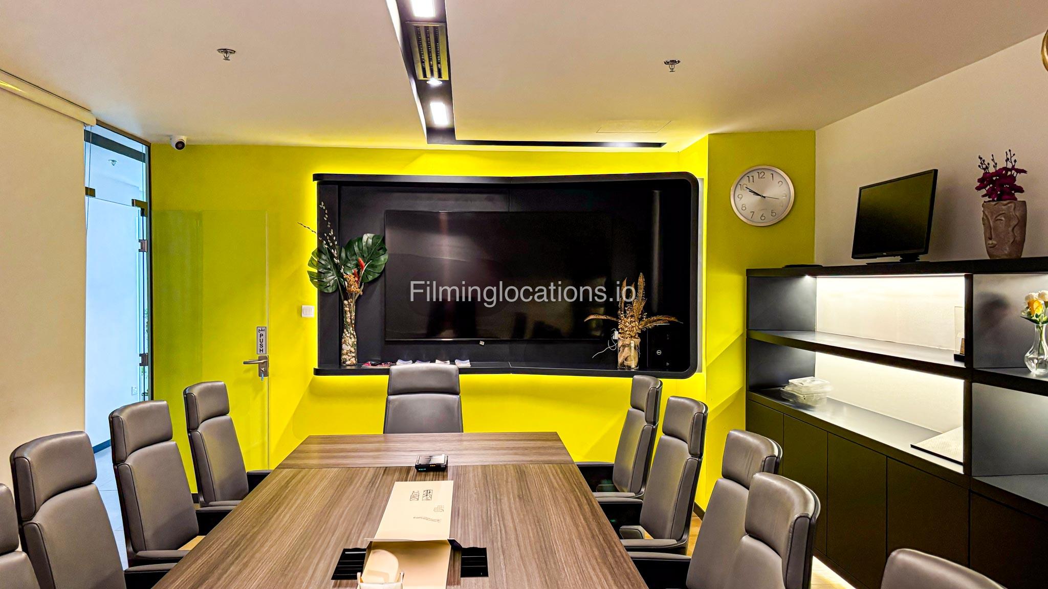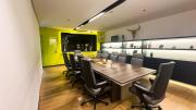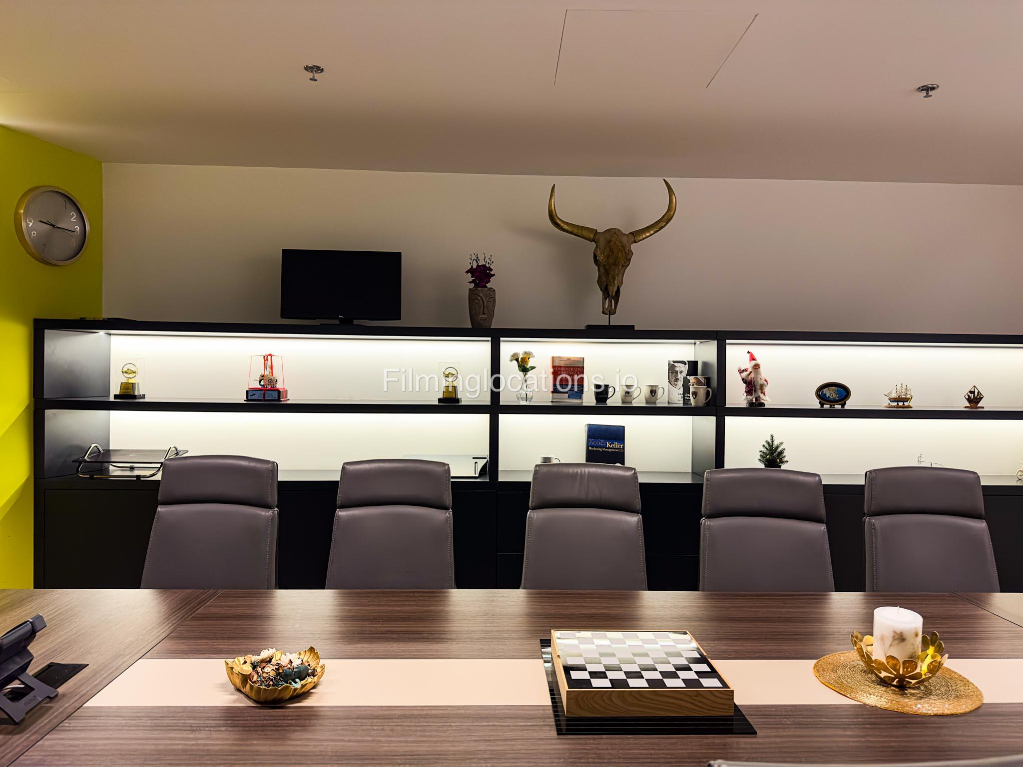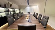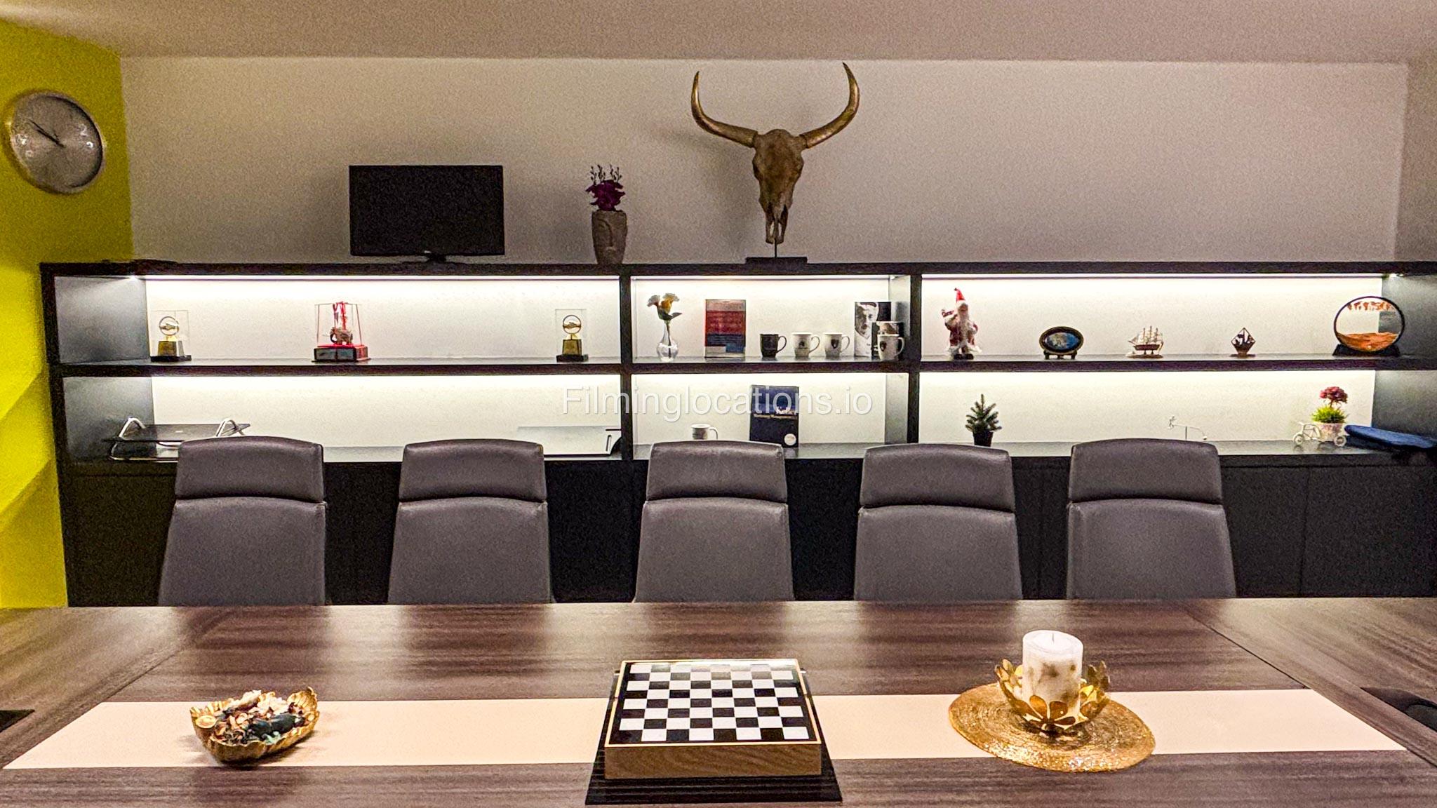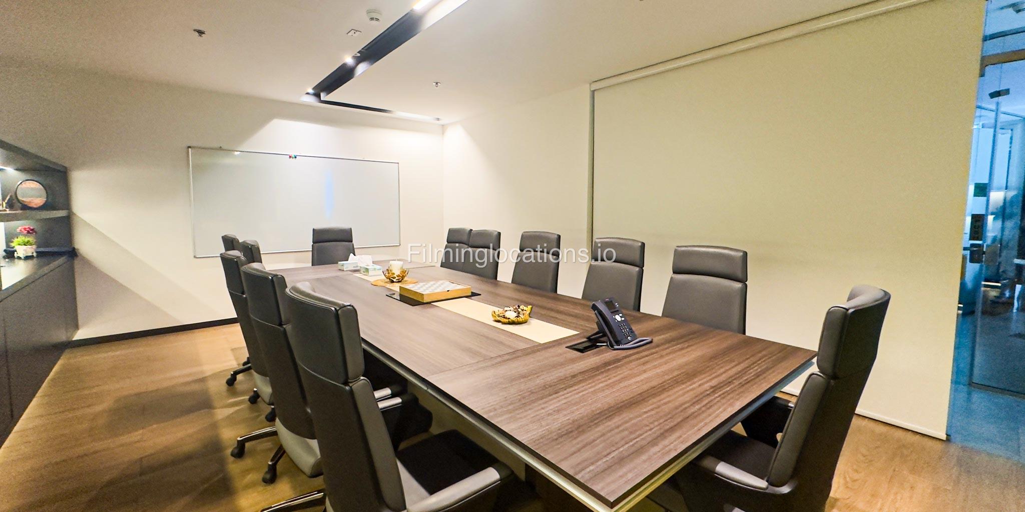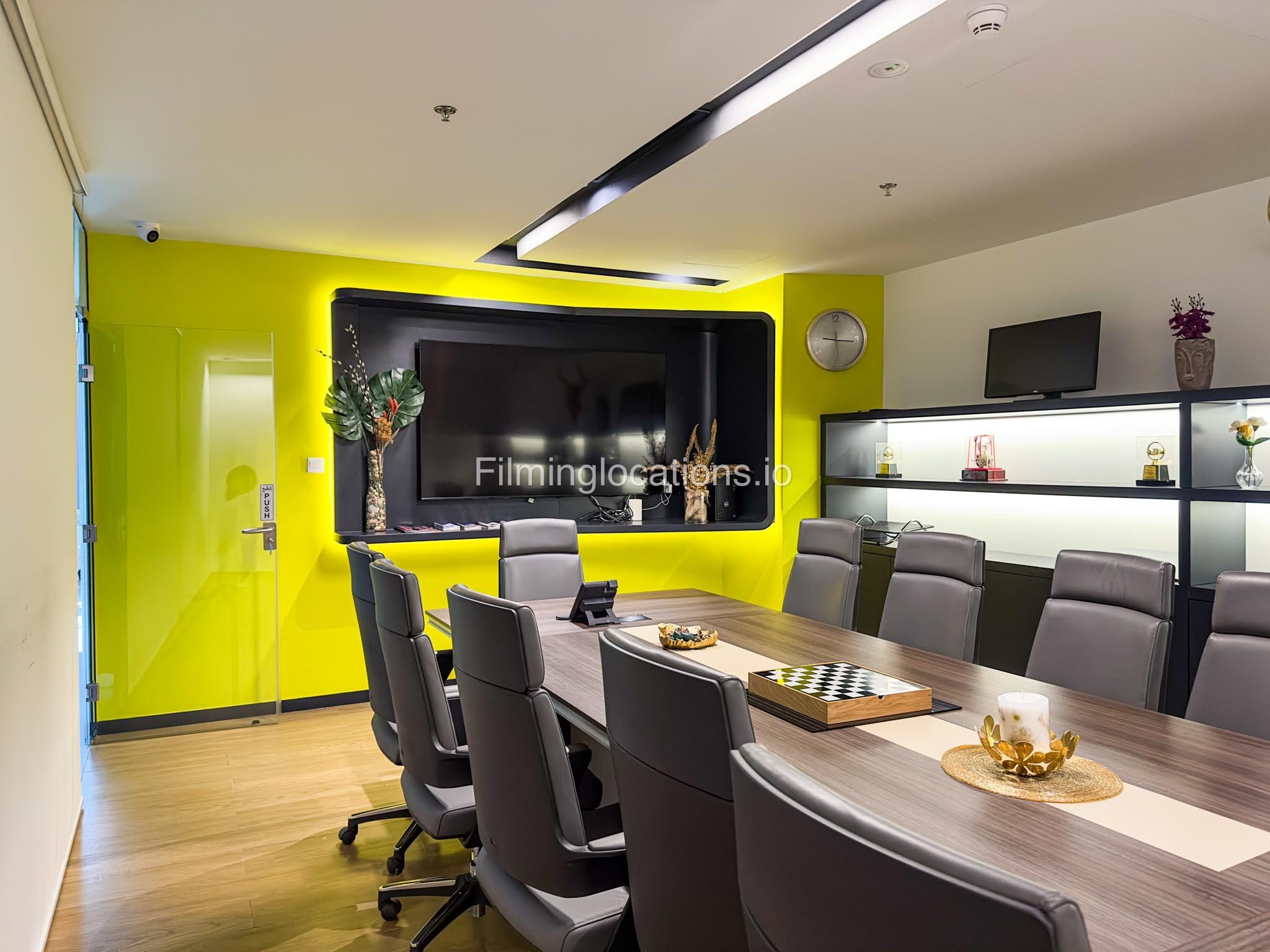 Our spacious and modern conference room with a sleek and modern design, audio visual set up, equipped with a Large TV and a wooden minimalistic table surrounded with 12 chairs.