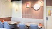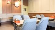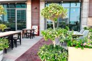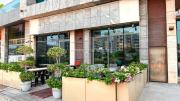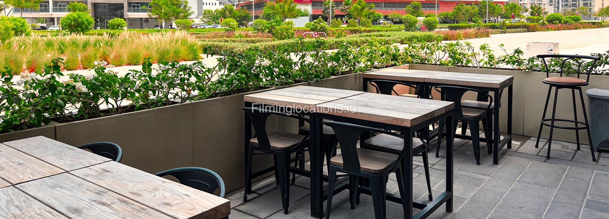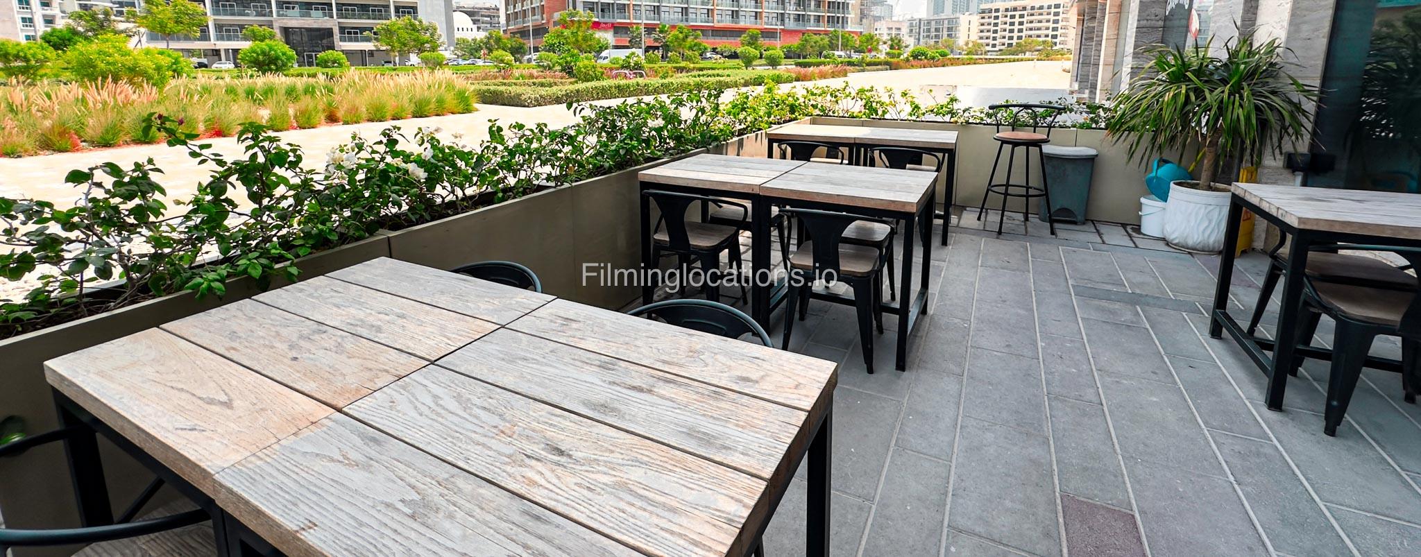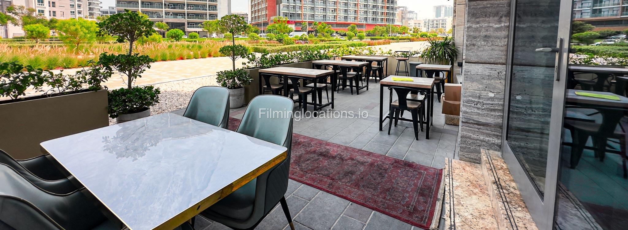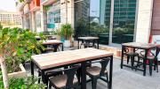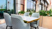 Our elegant restaurant features an inviting interior with pastel-toned quilted chairs, marble-top tables, and warm wall paneling. The space includes a sleek coffee bar, modern lighting, and stylish ceiling decor with exposed wooden beams. The outdoor seating area offers a relaxed urban vibe with rustic wood-top tables, black metal chairs, and planters lining the space, set against a backdrop of modern architecture and city views.