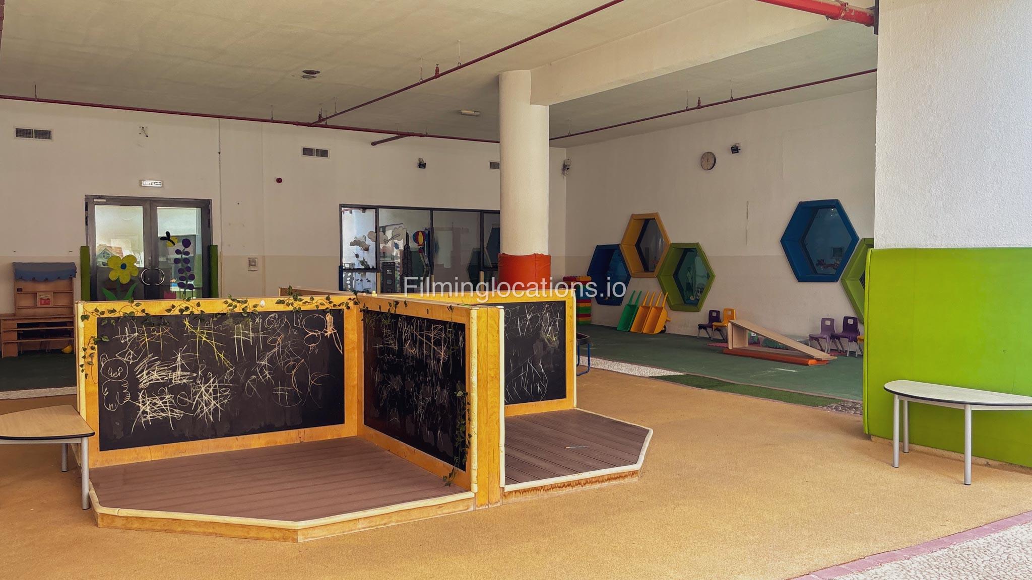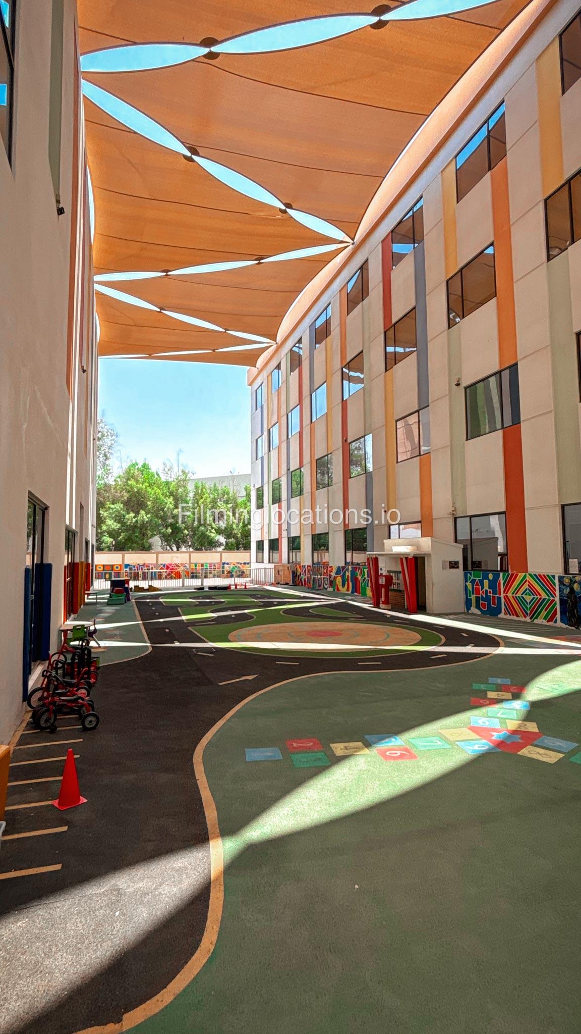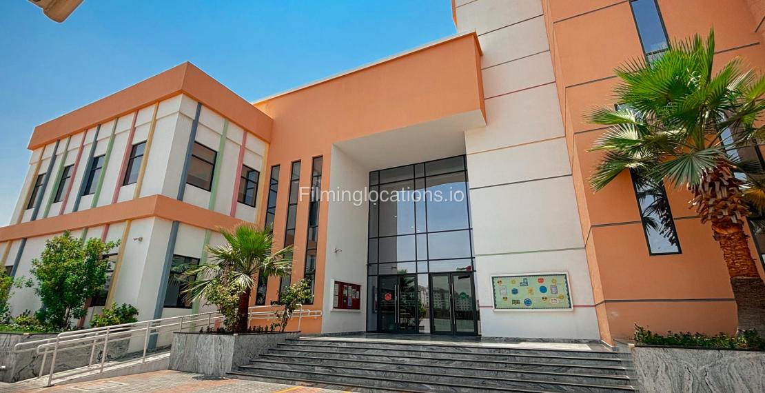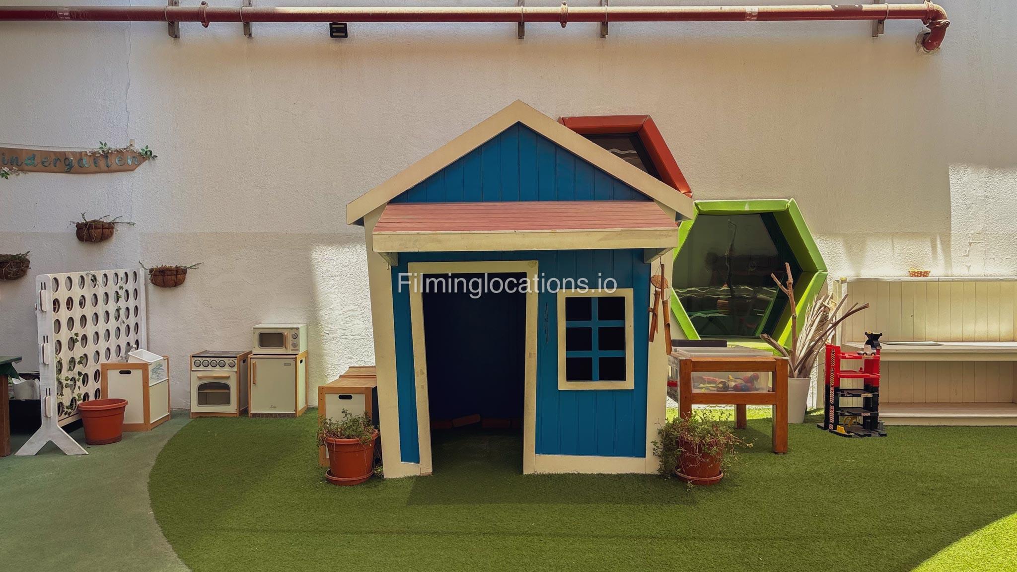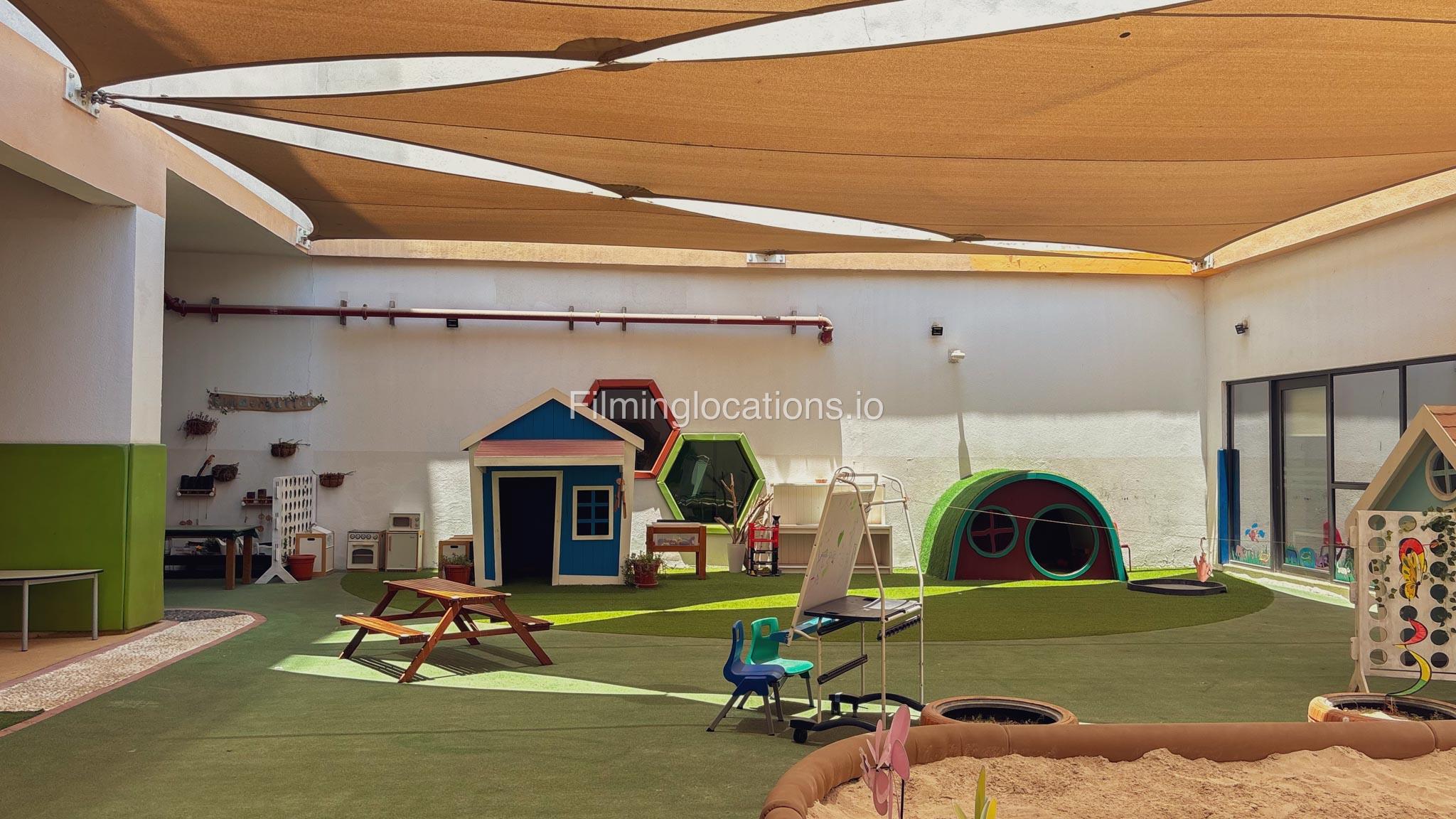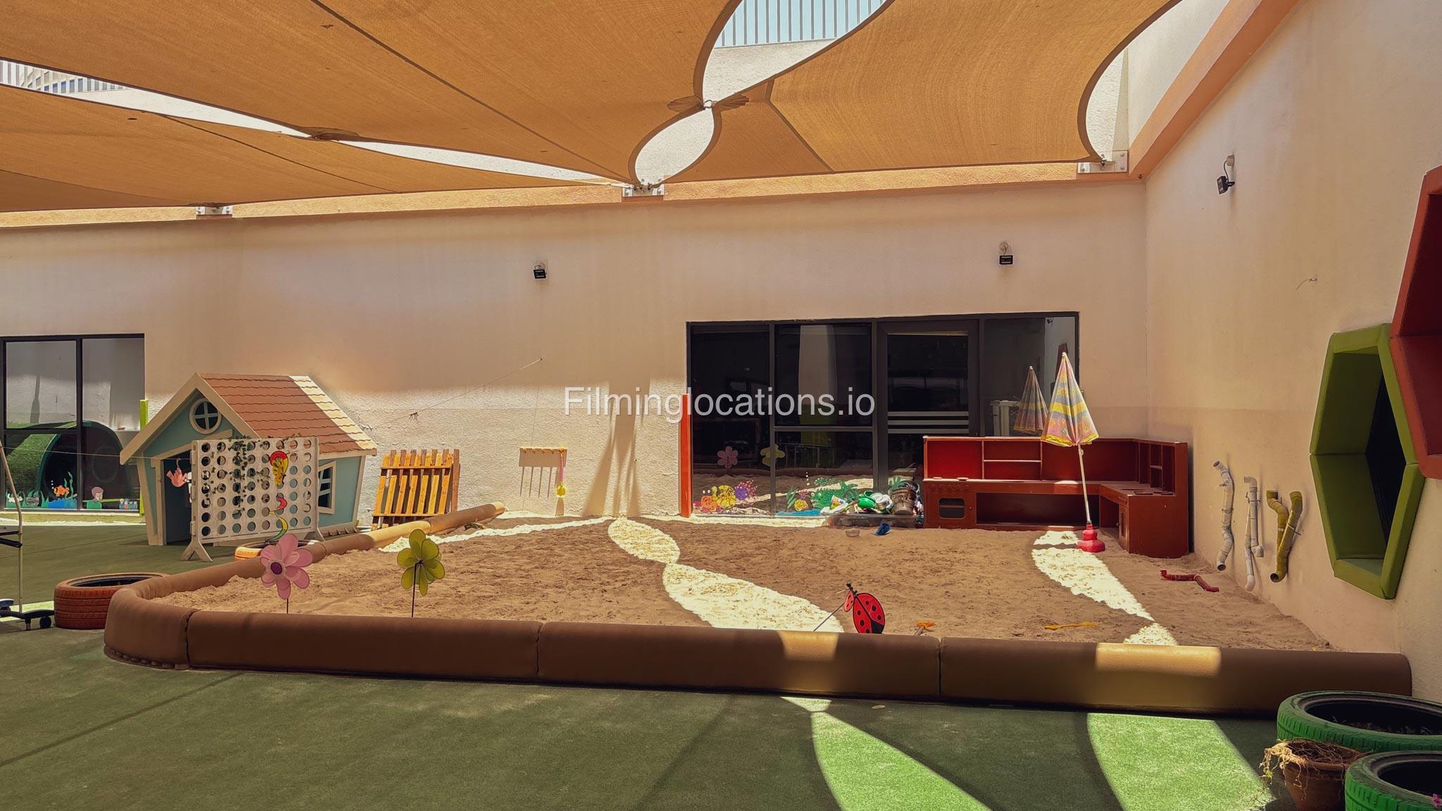 The outdoor areas feature expansive playgrounds, landscaped walkways, and a welcoming entrance with a sitting area that can also be utilized for filming. The reception area is available as well.