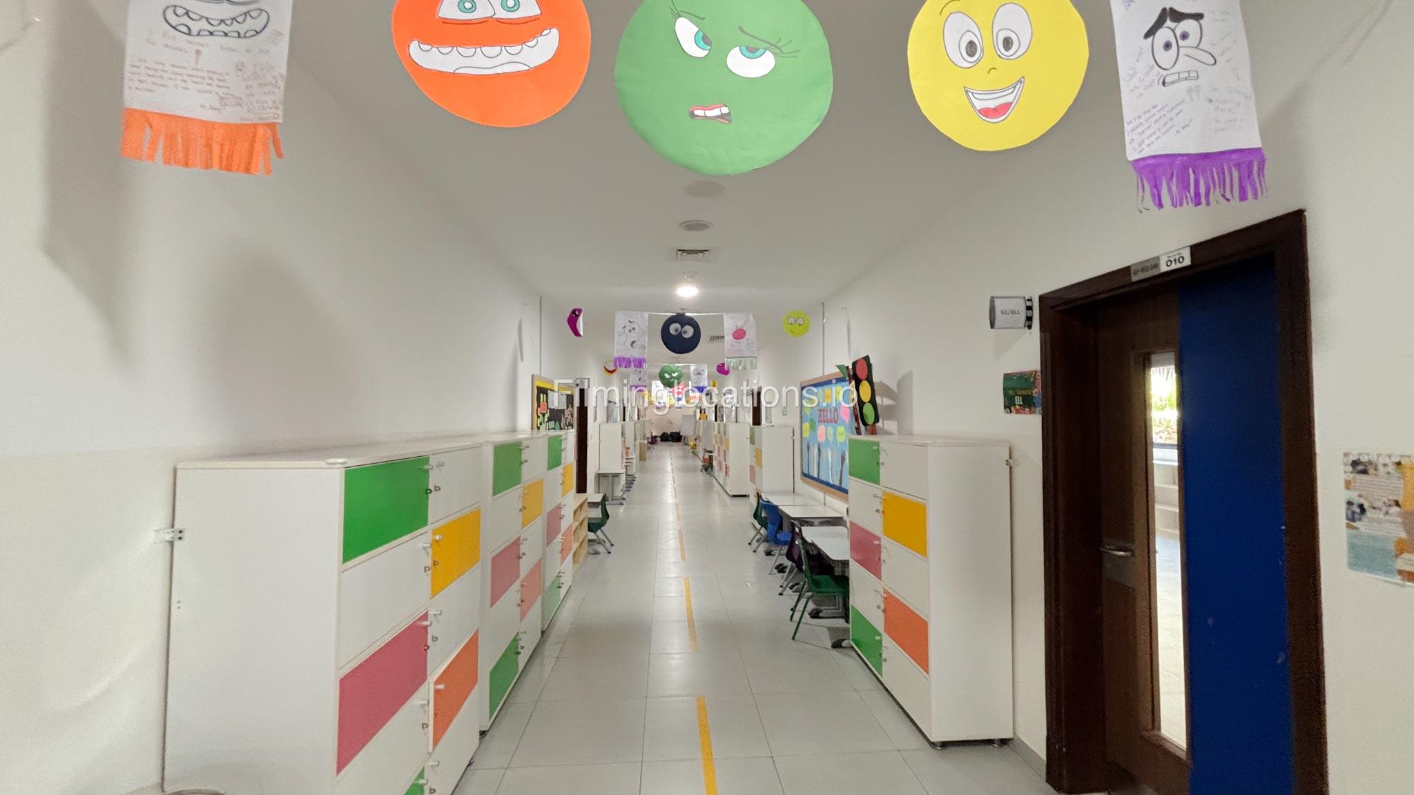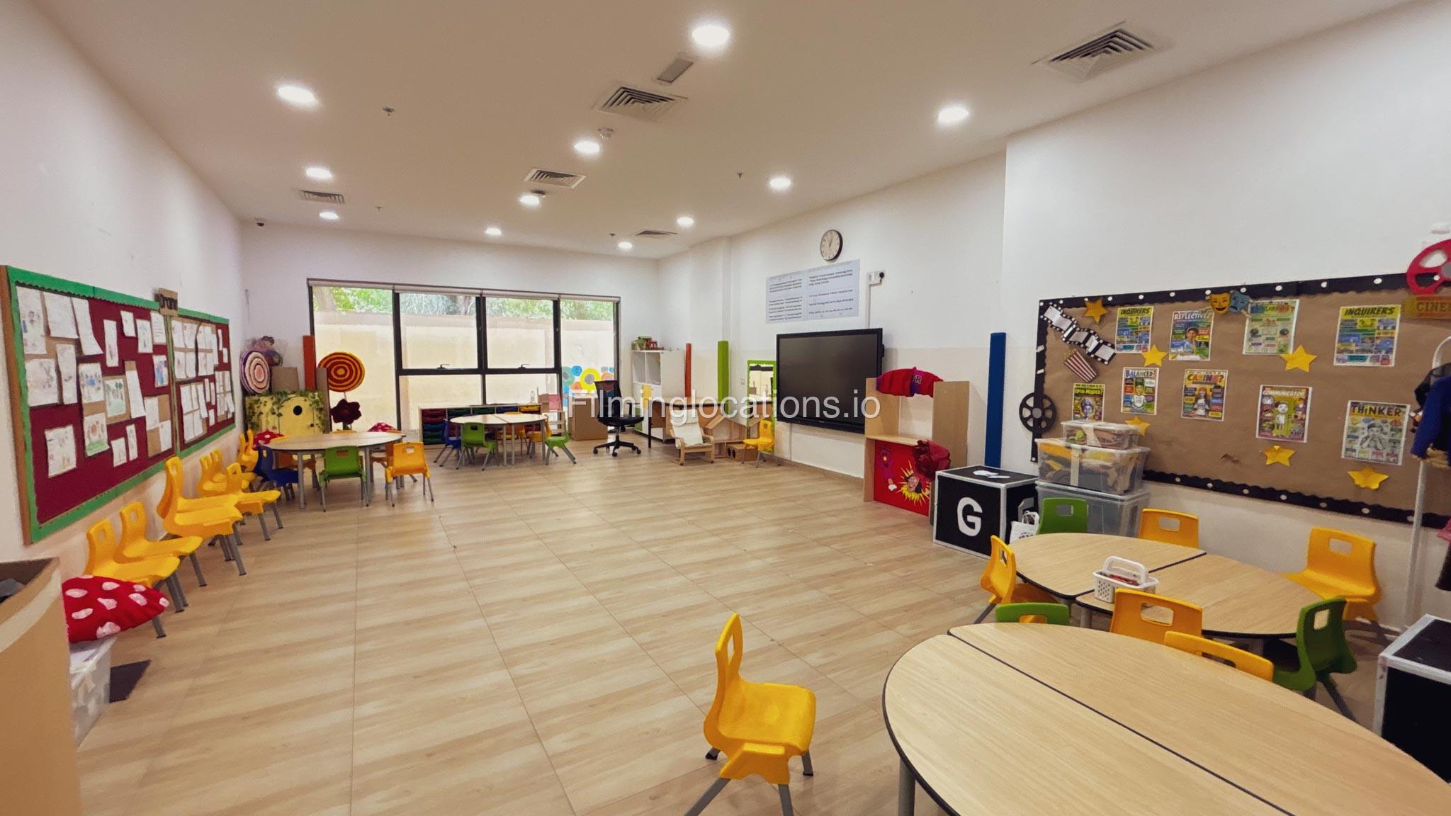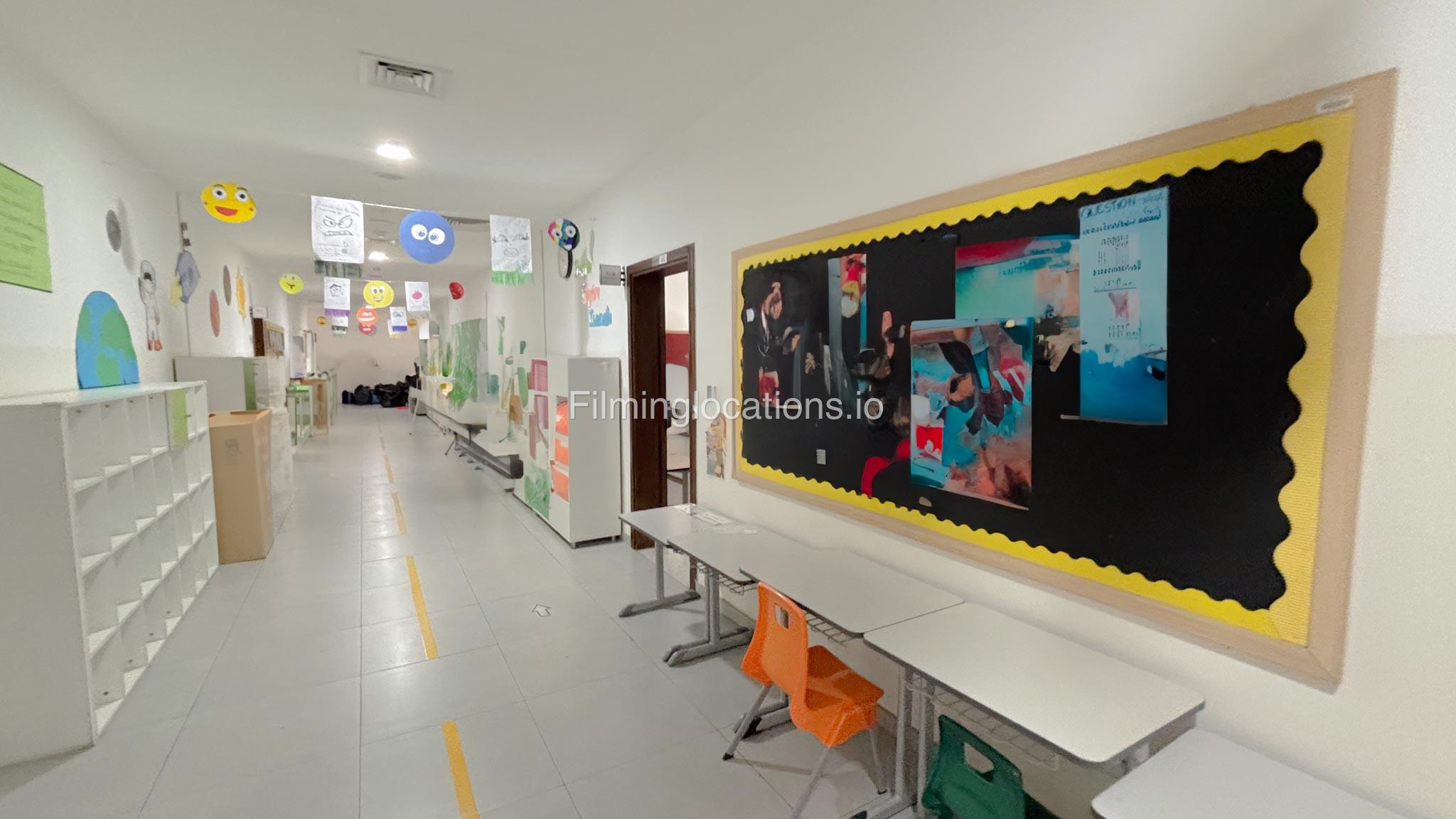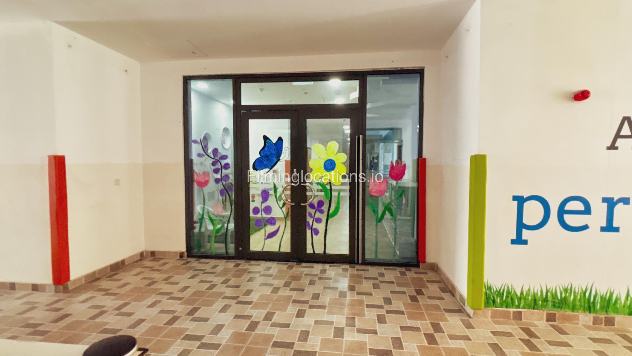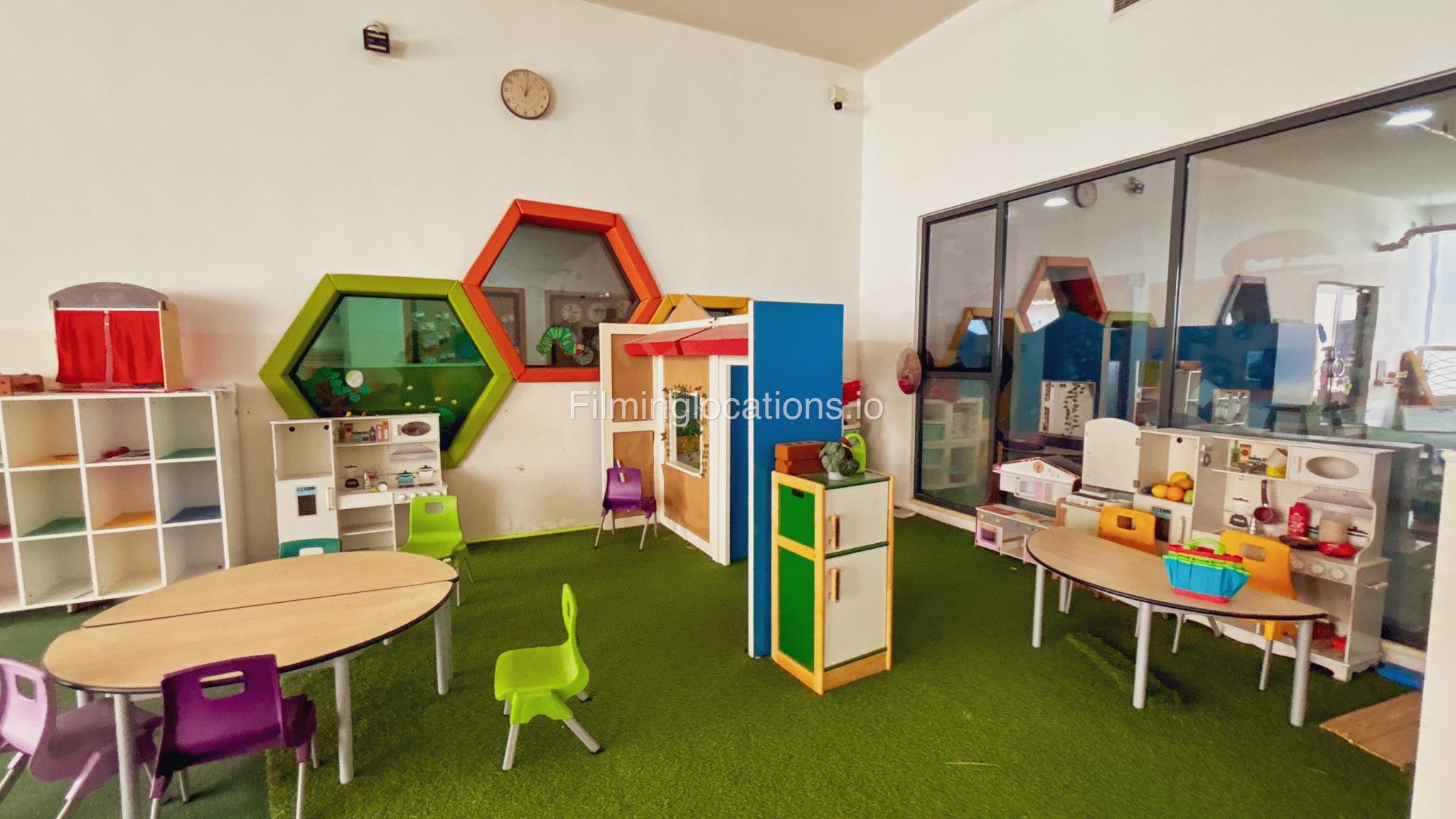 The outdoor areas feature expansive playgrounds, landscaped walkways, and a welcoming entrance with a sitting area that can also be utilized for filming. The reception area is available as well.