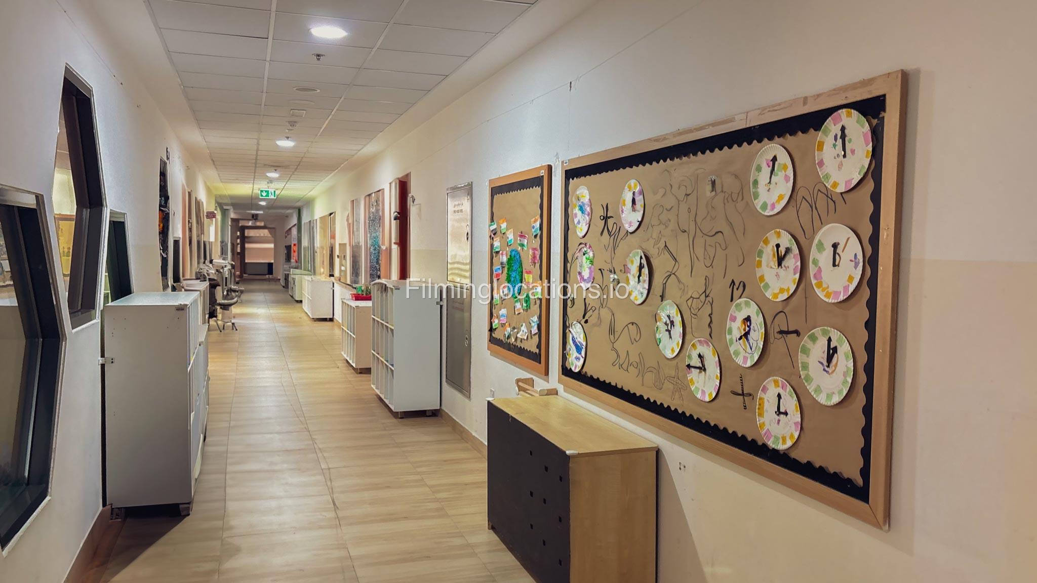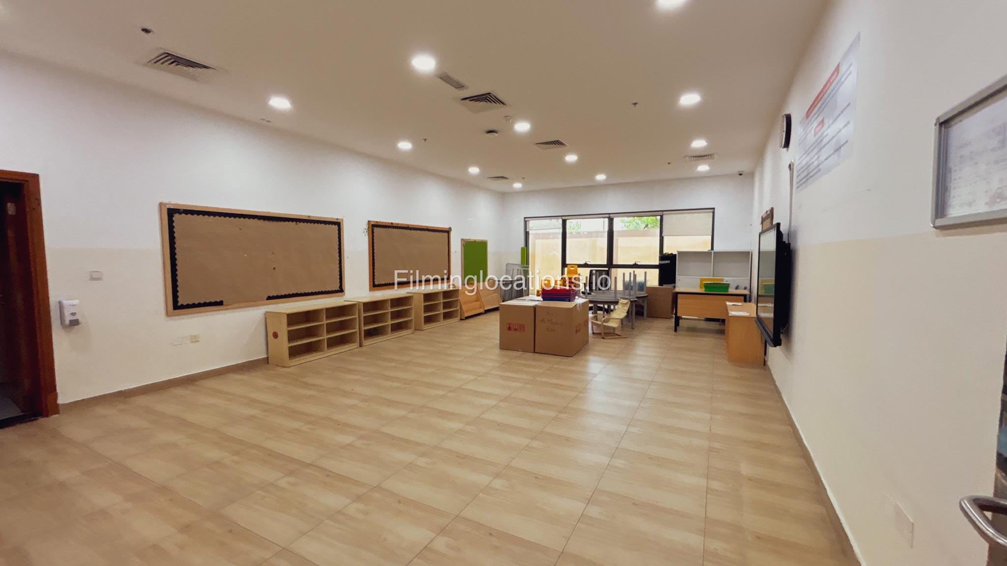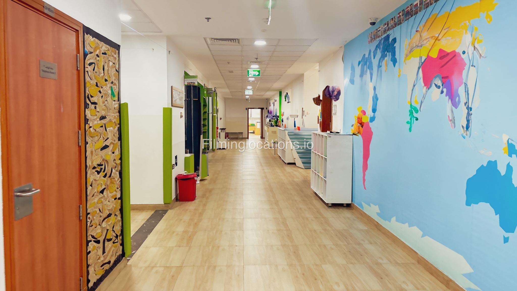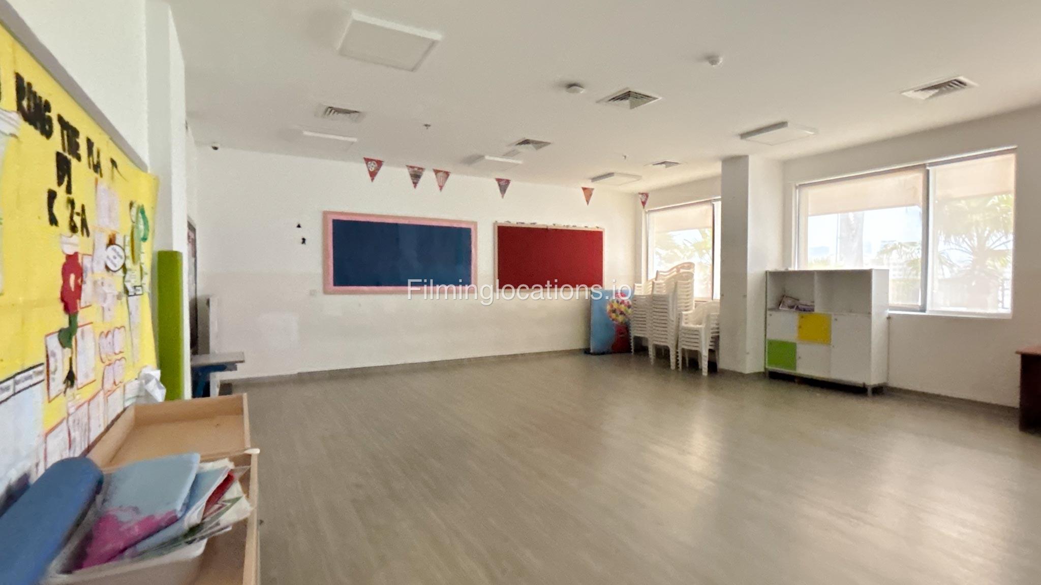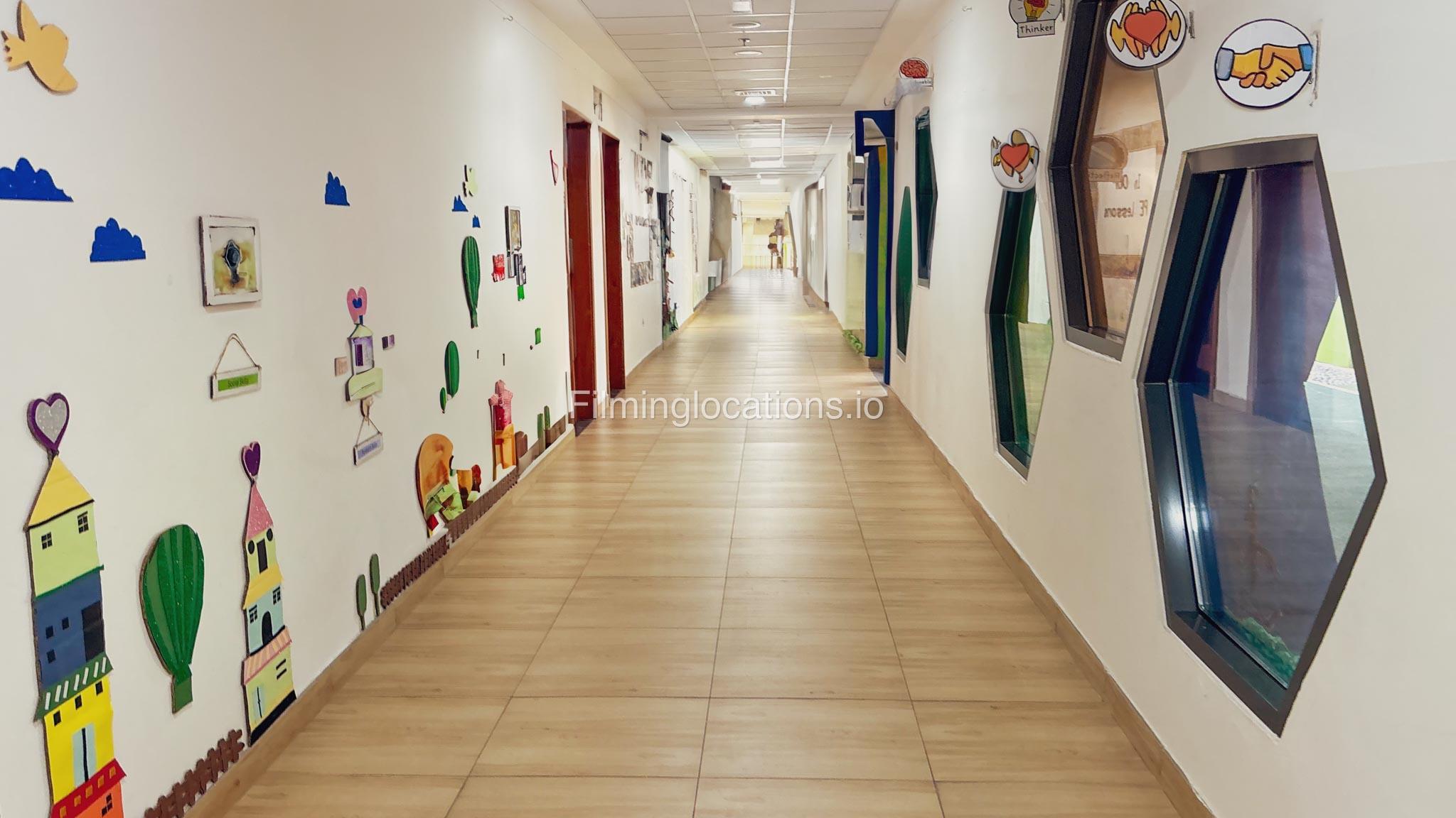 The outdoor areas feature expansive playgrounds, landscaped walkways, and a welcoming entrance with a sitting area that can also be utilized for filming. The reception area is available as well.