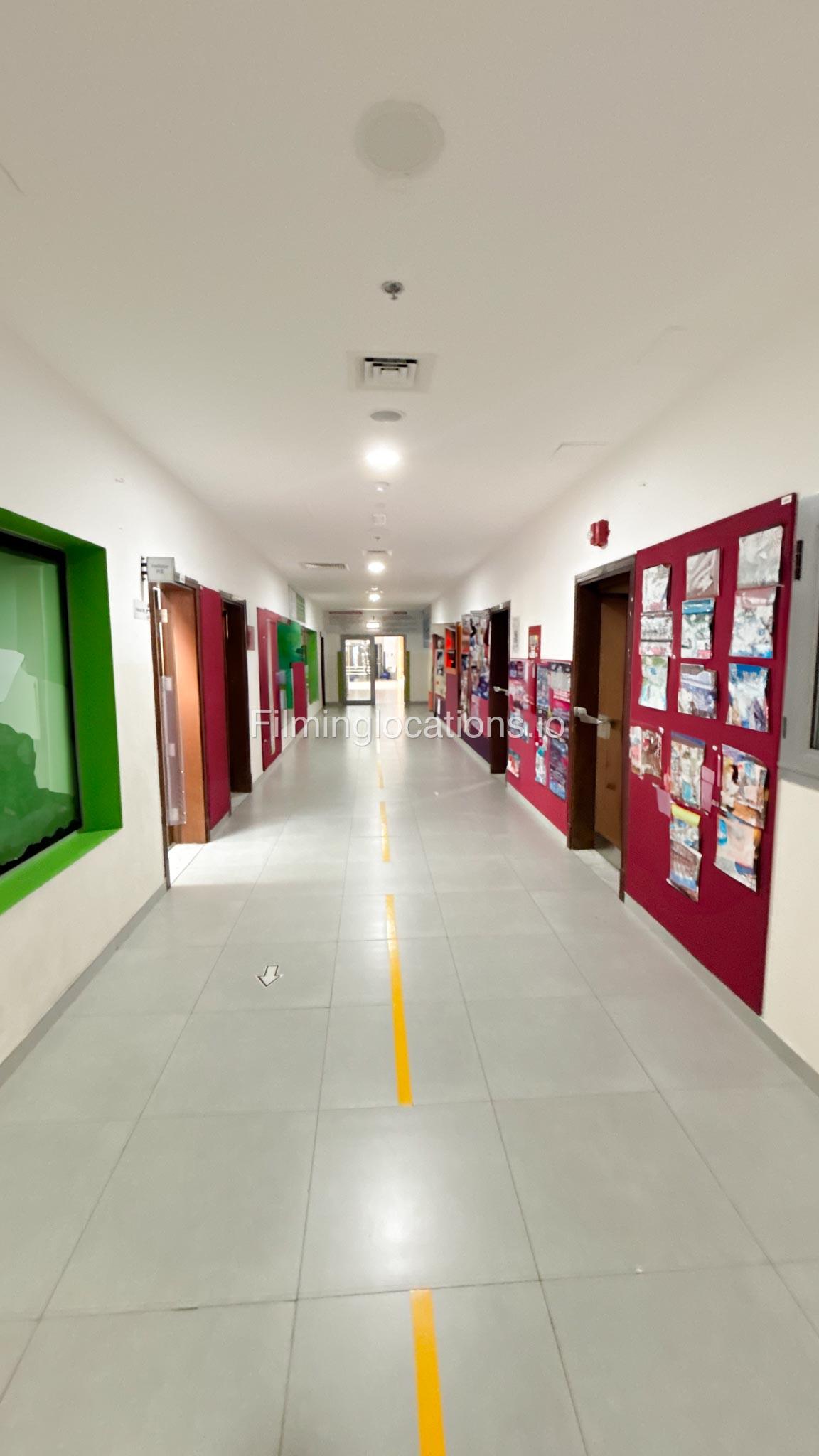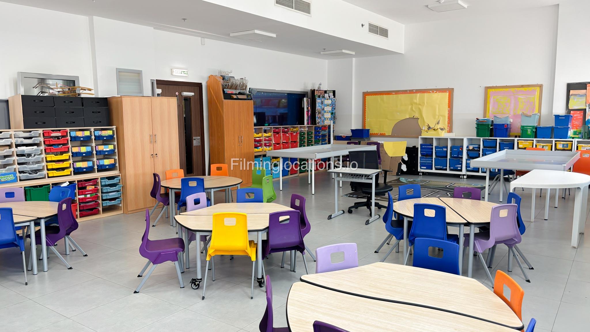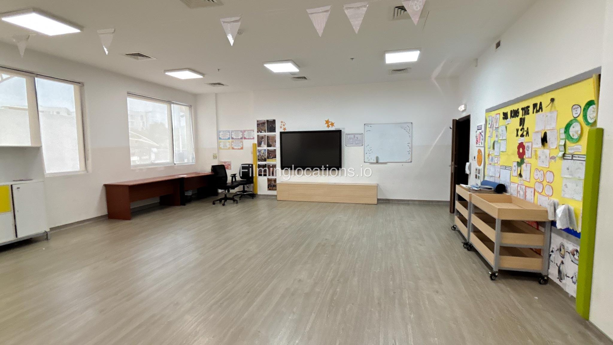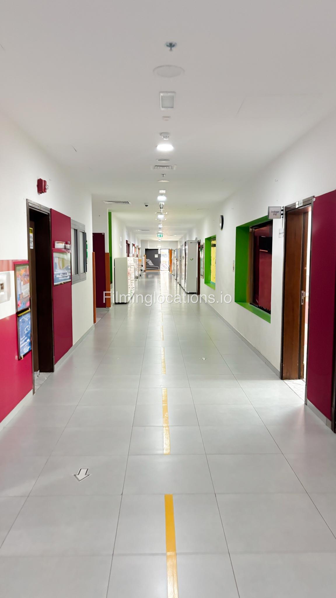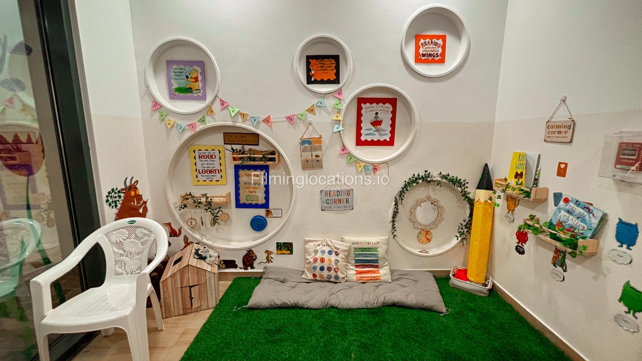 The outdoor areas feature expansive playgrounds, landscaped walkways, and a welcoming entrance with a sitting area that can also be utilized for filming. The reception area is available as well.