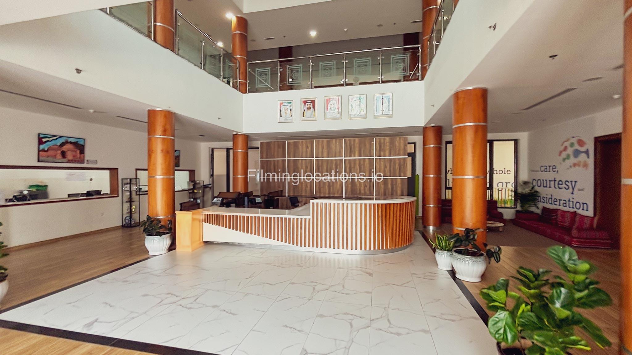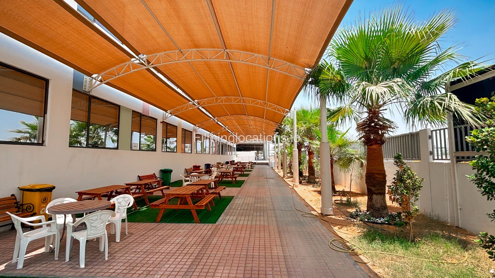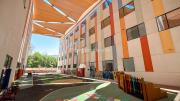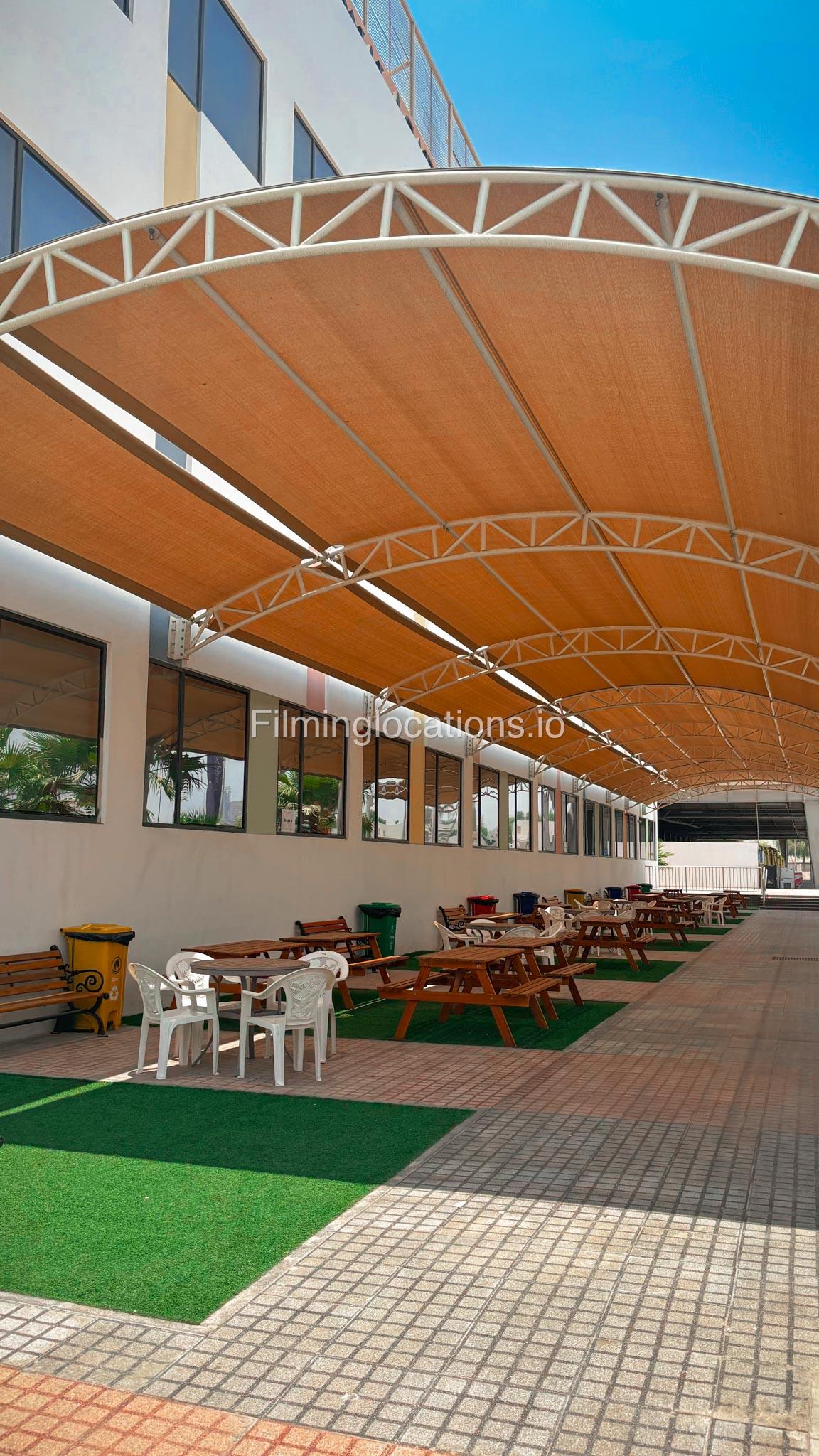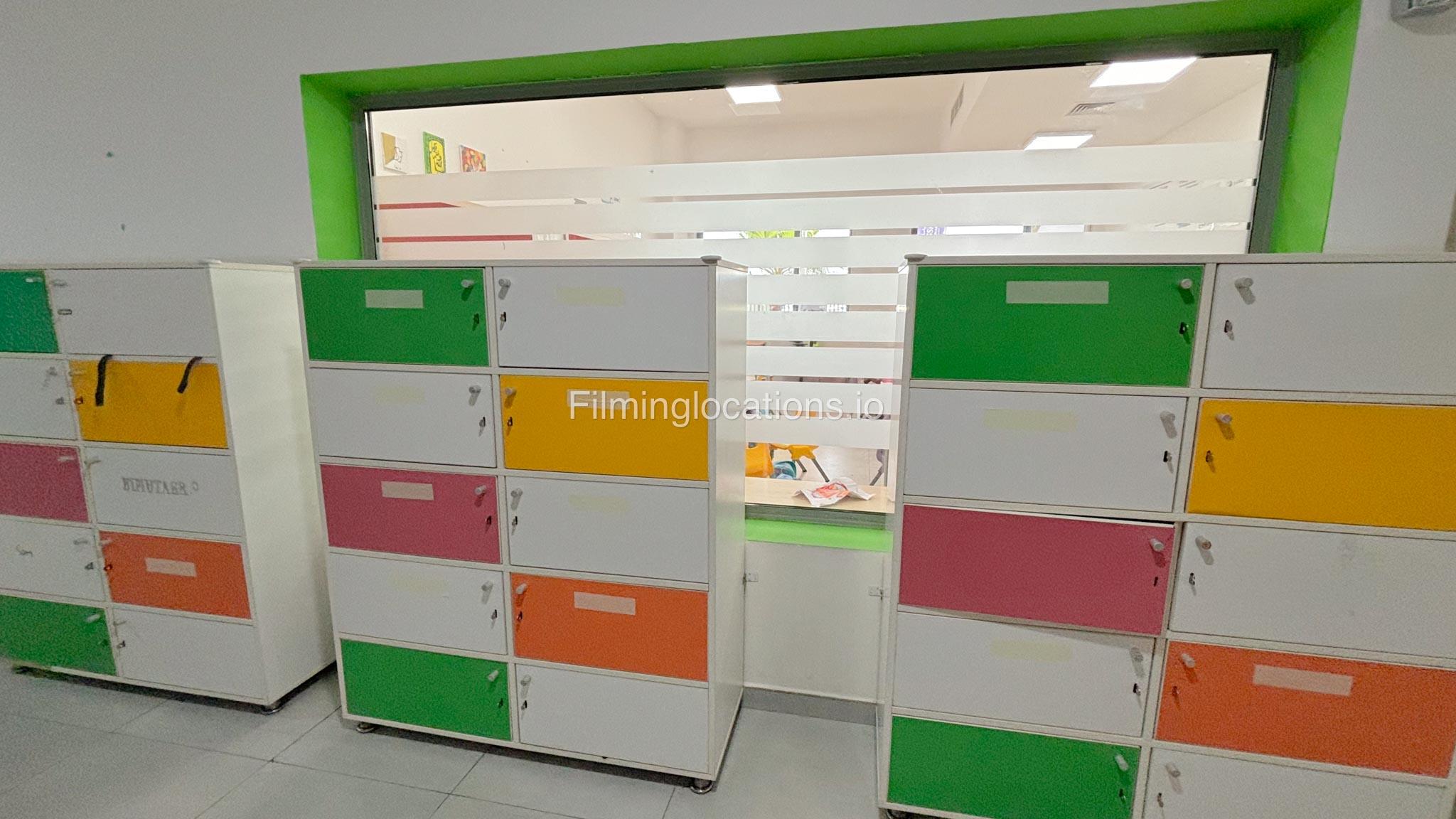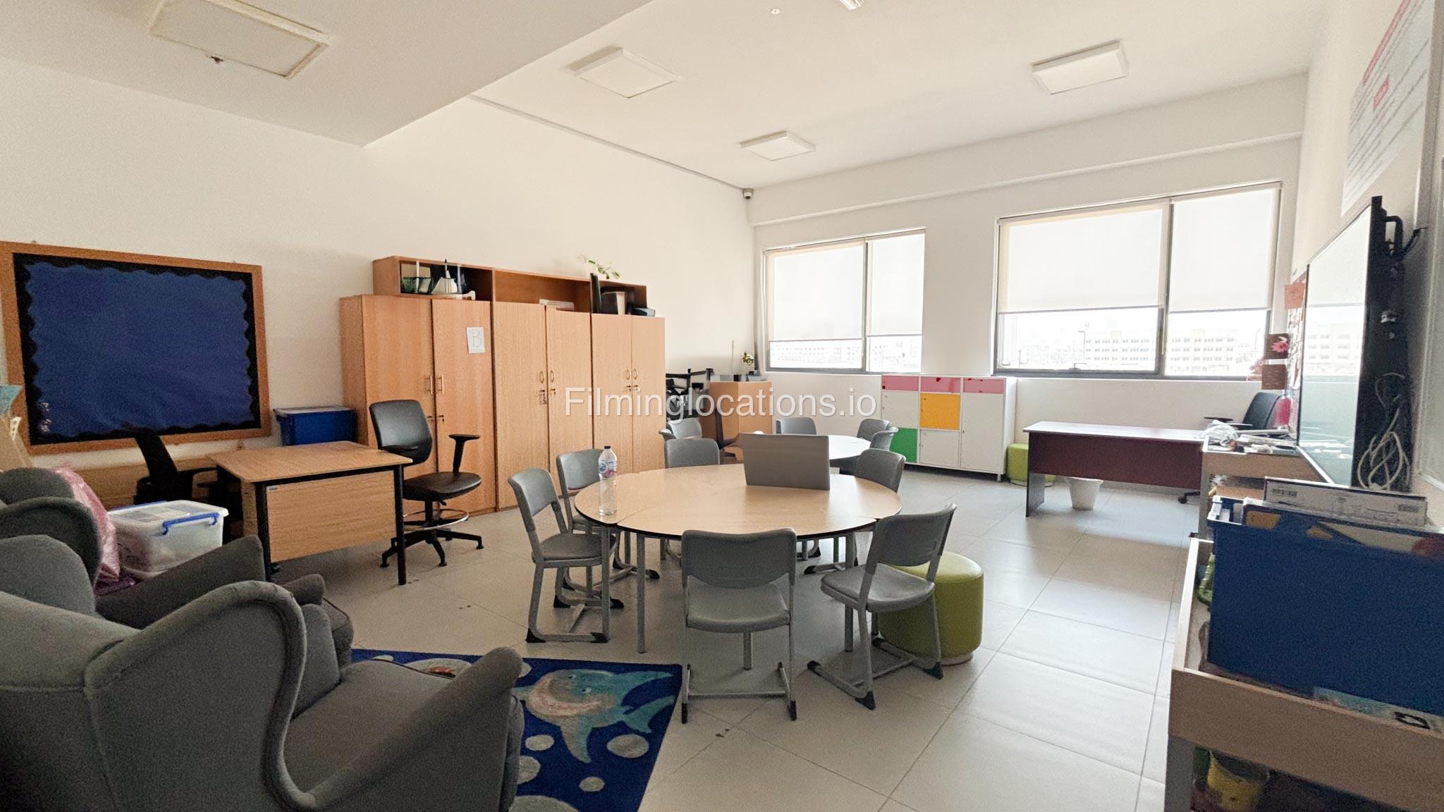 The outdoor areas feature expansive playgrounds, landscaped walkways, and a welcoming entrance with a sitting area that can also be utilized for filming. The reception area is available as well.