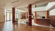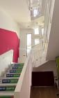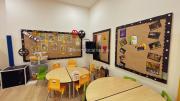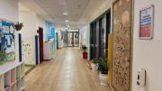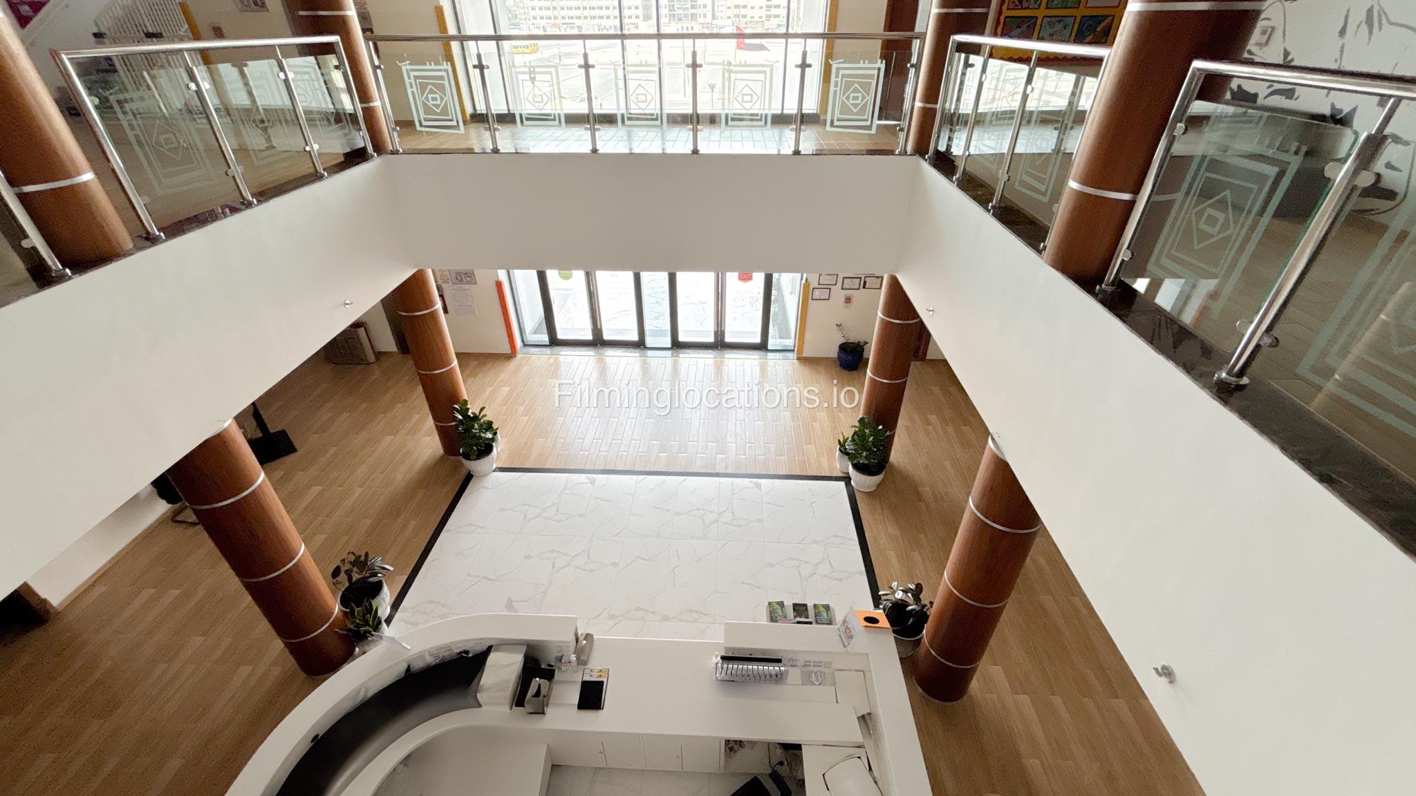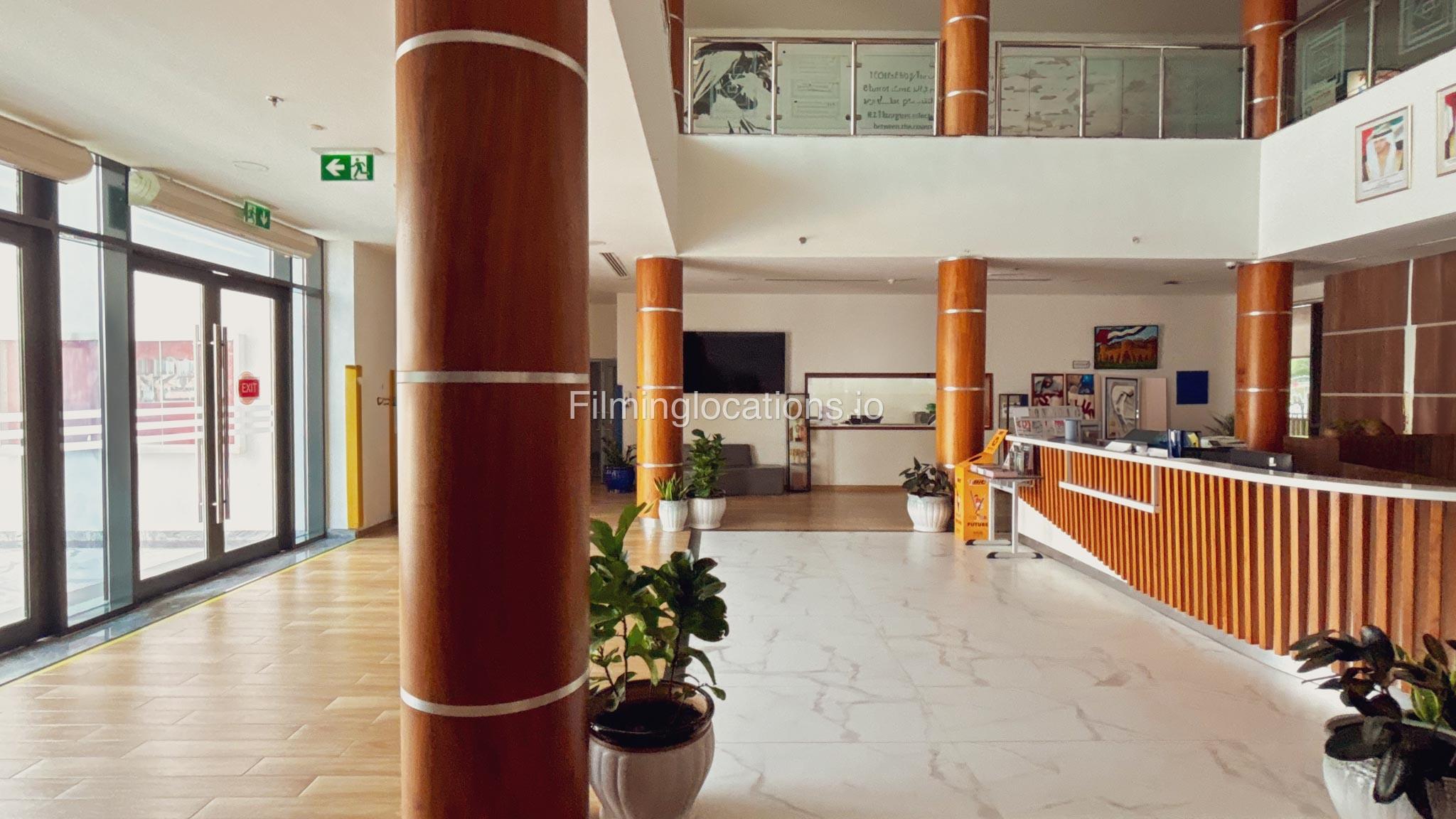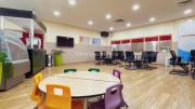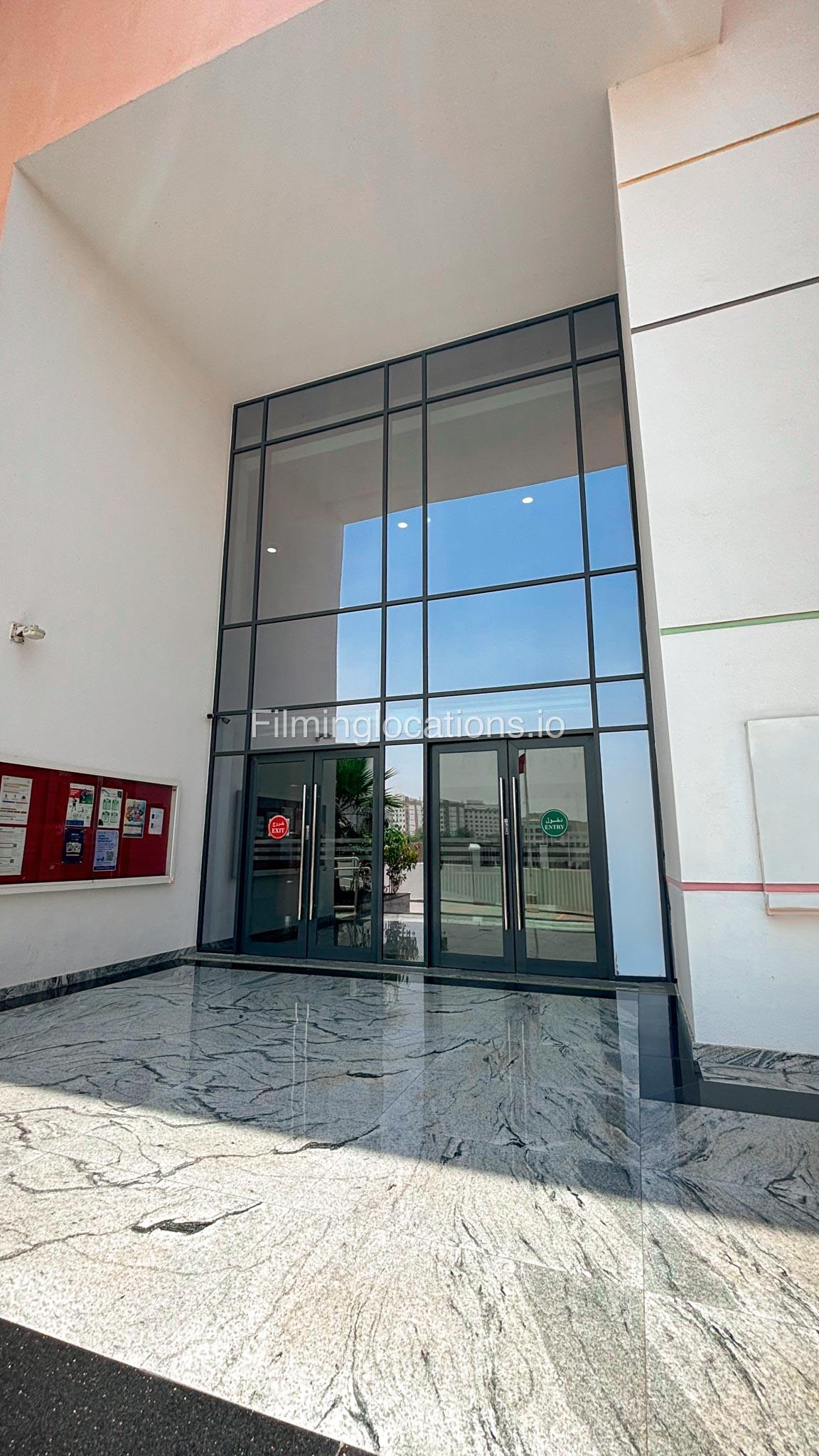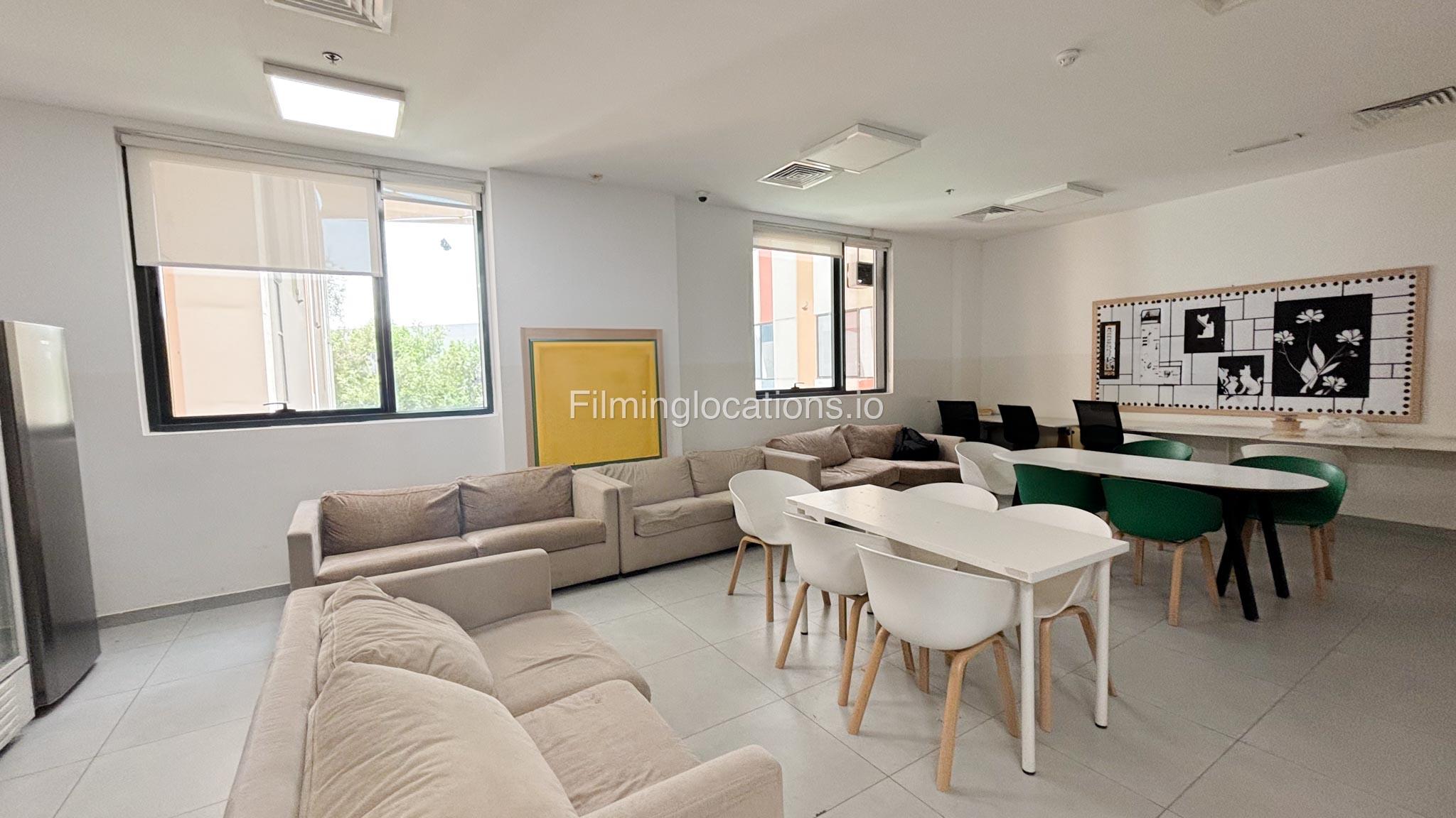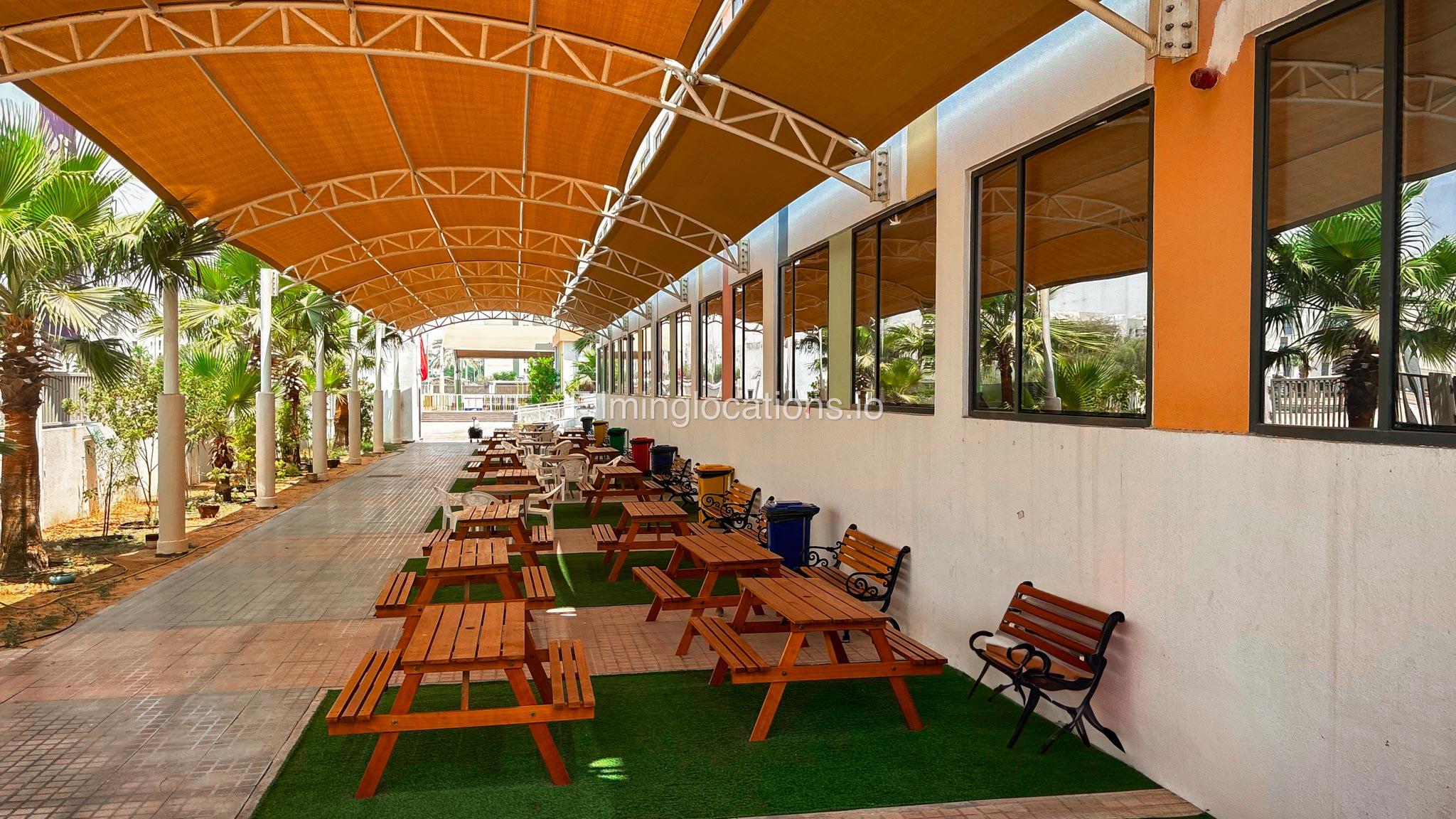 The outdoor areas feature expansive playgrounds, landscaped walkways, and a welcoming entrance with a sitting area that can also be utilized for filming. The reception area is available as well.