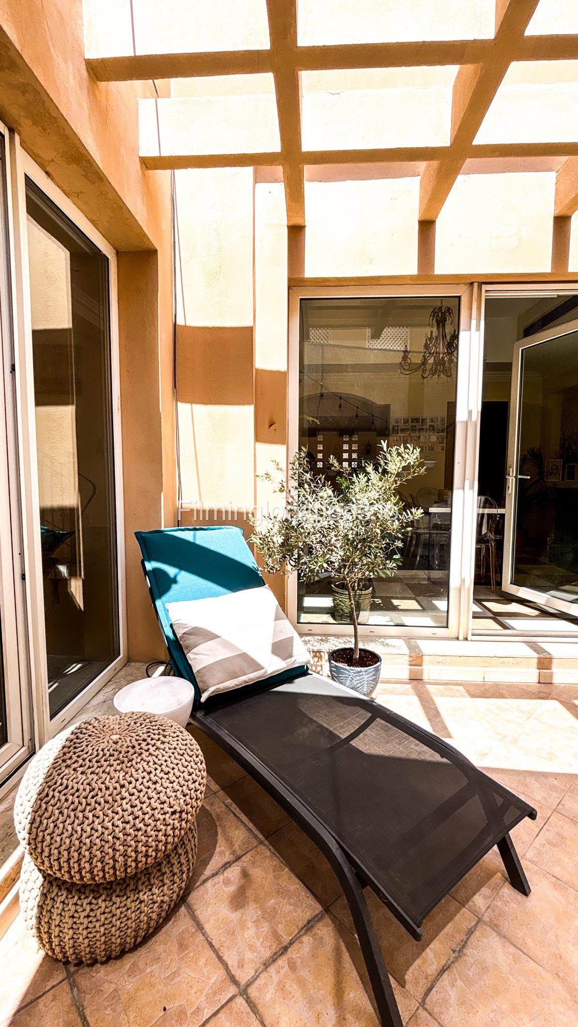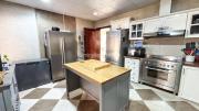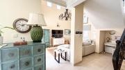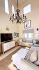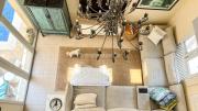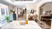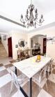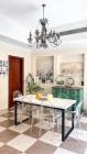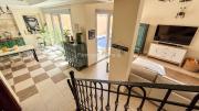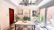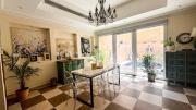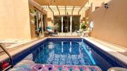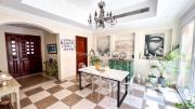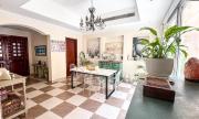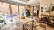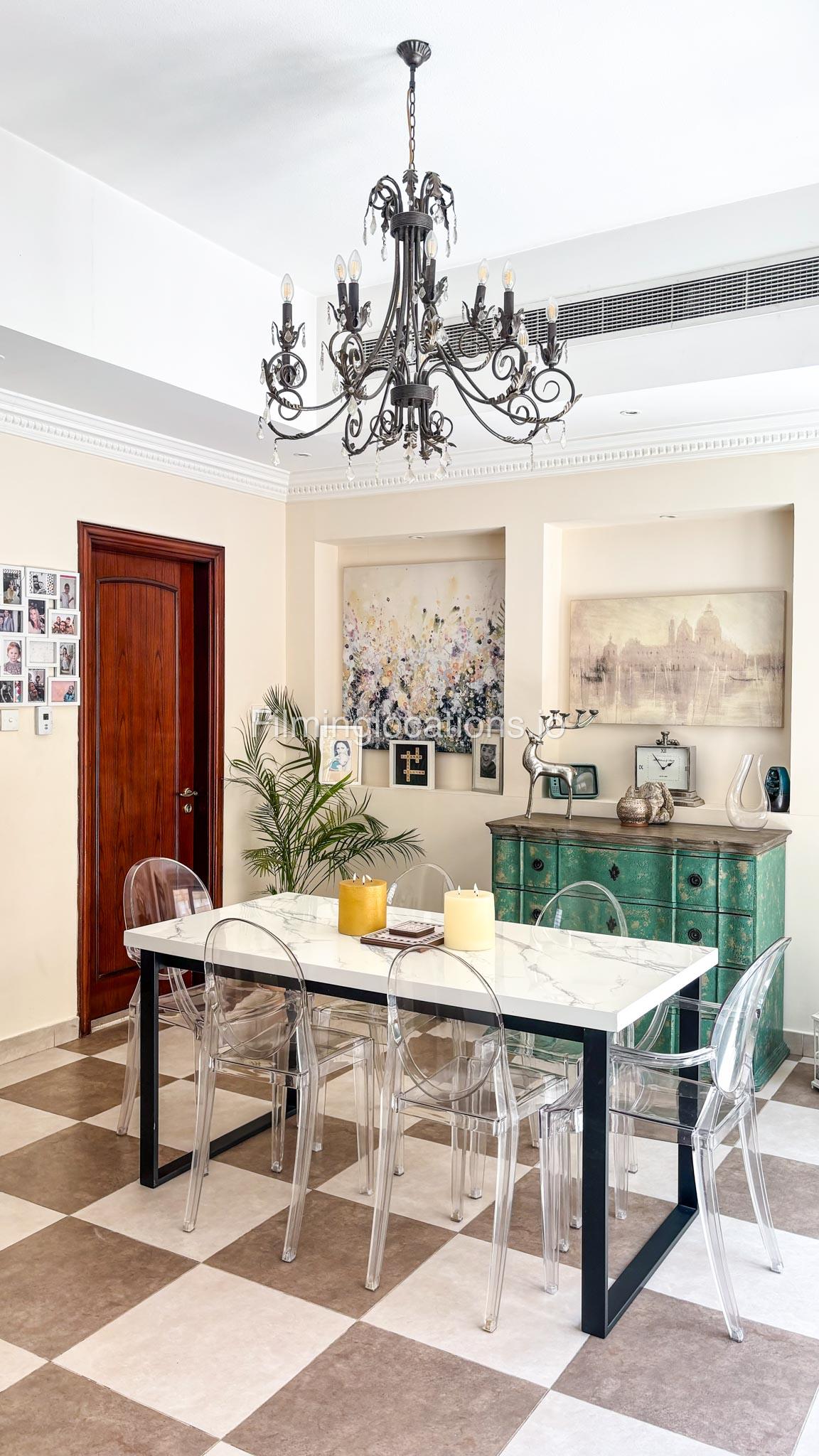 Our 4-bedroom villa features an eclectic living room that flows into a dining area with a statement chandelier and large window walls, filling the space with natural light. The adjoining cozy lounge includes a comfortable couch setup and opens to views of the shaded outdoor pool area with ambient lighting. A staircase behind the living space leads to 4 well-appointed bedrooms and an additional small room upstairs.